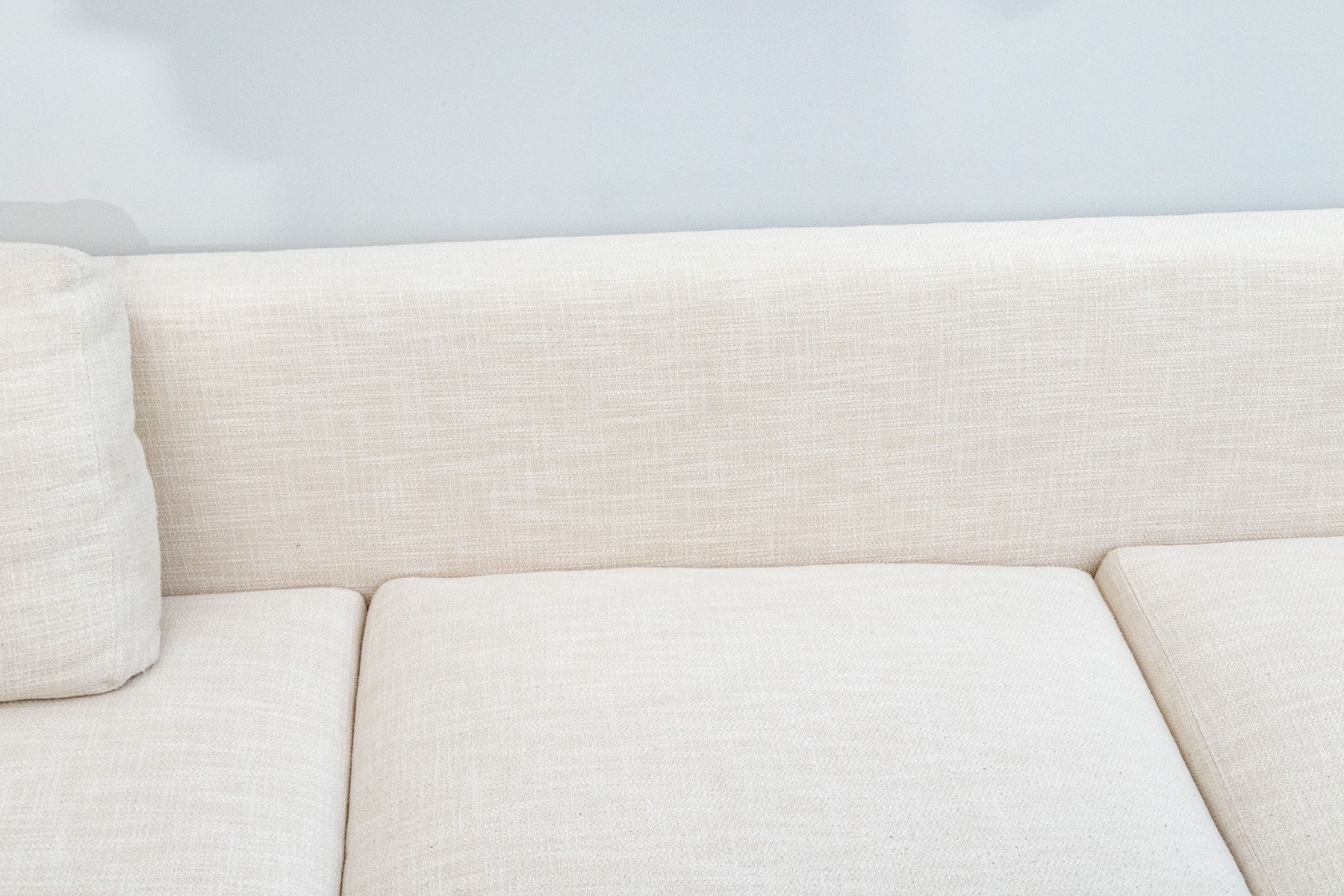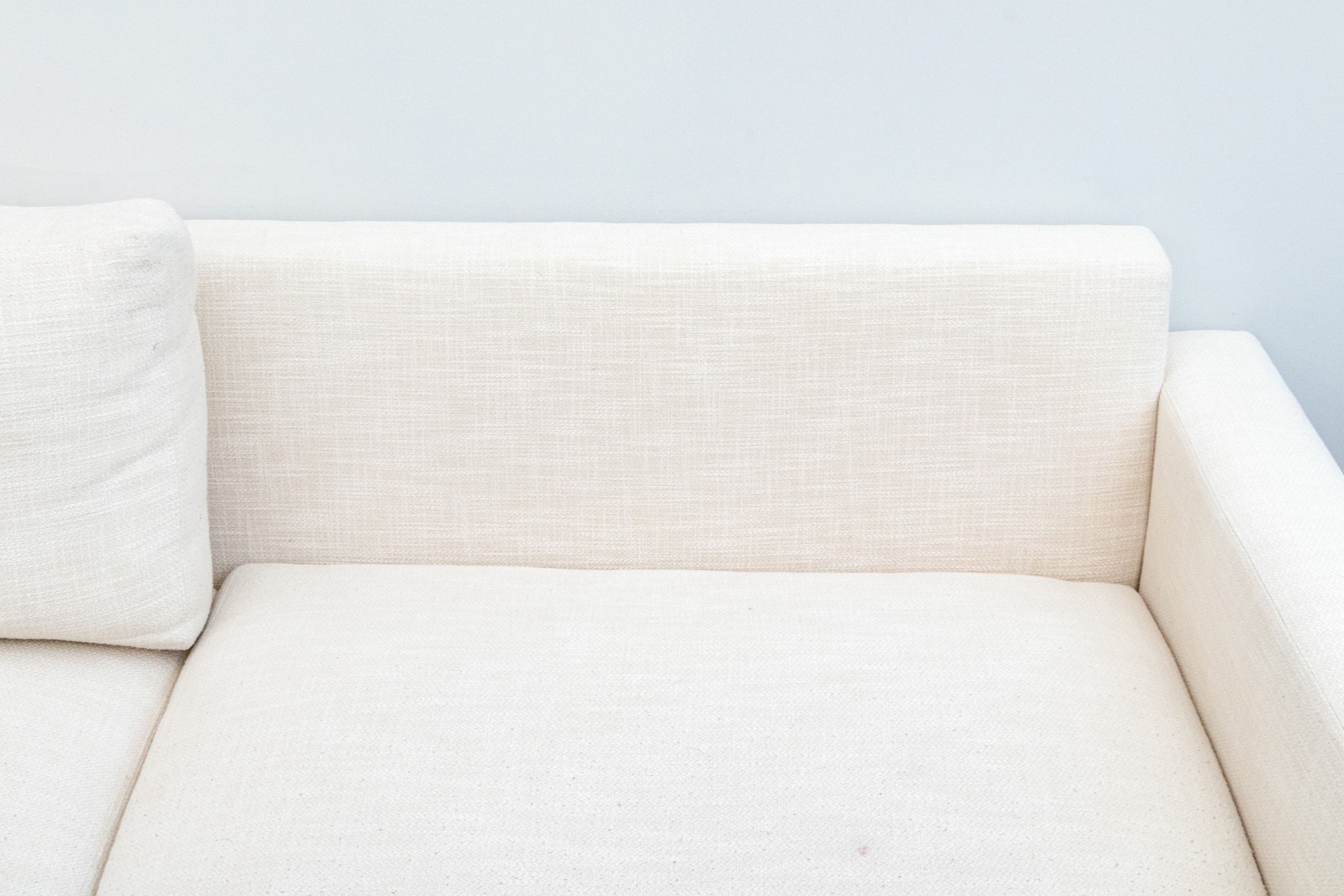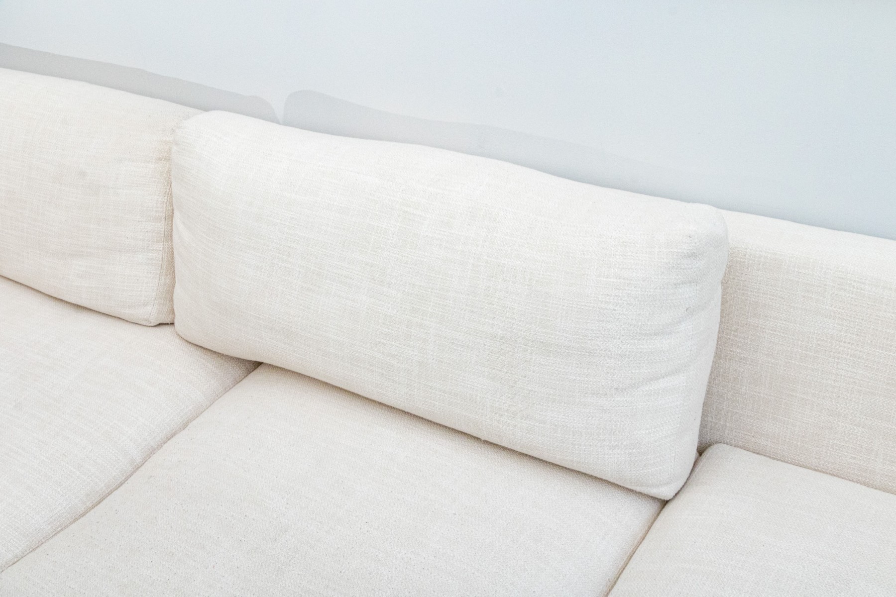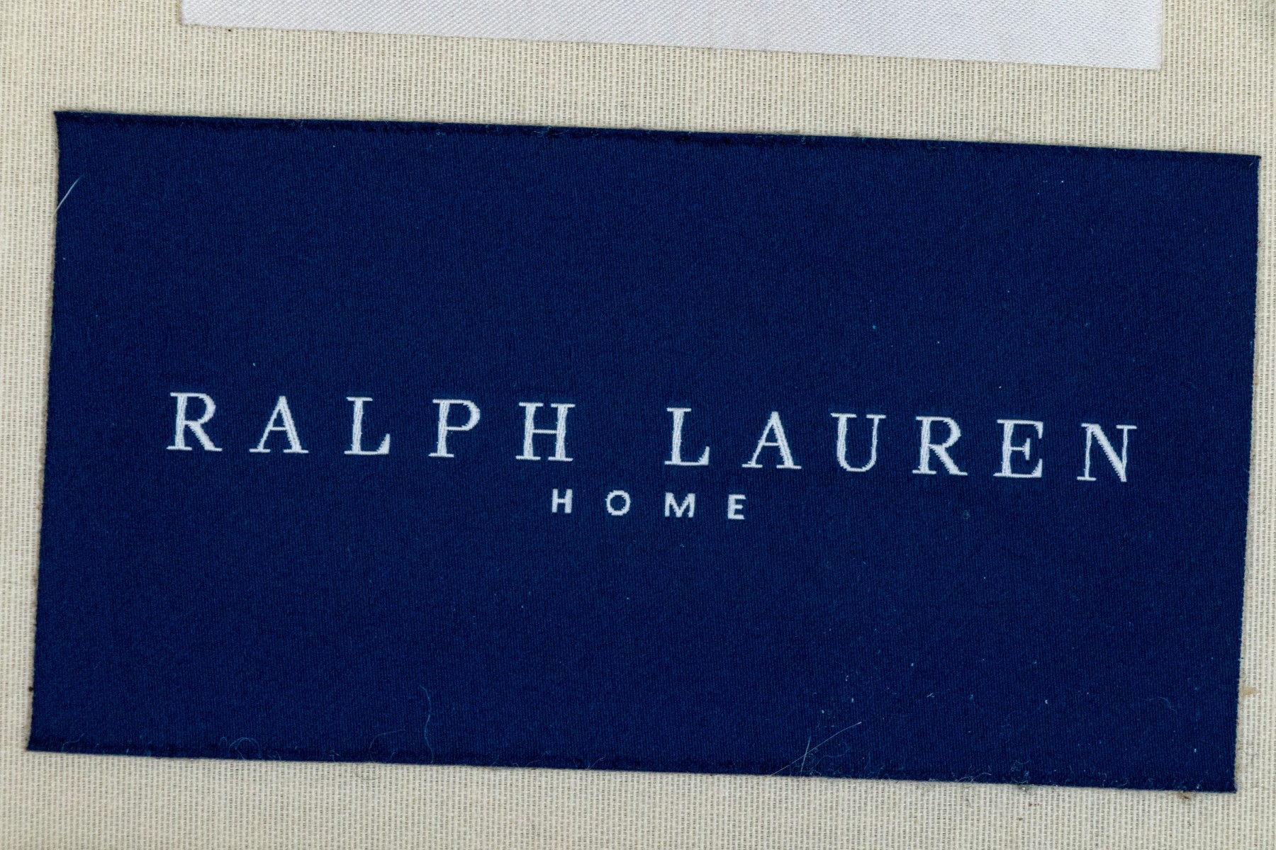 A classic Ralph Lauren sectional sofa coming in two sections, comprised of a three seat sofa together with a love seat sofa with one arm. Fitted with white woven fabric upholstered seat cushions and seat backs for stylish comfort.