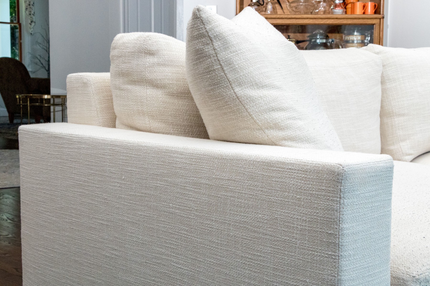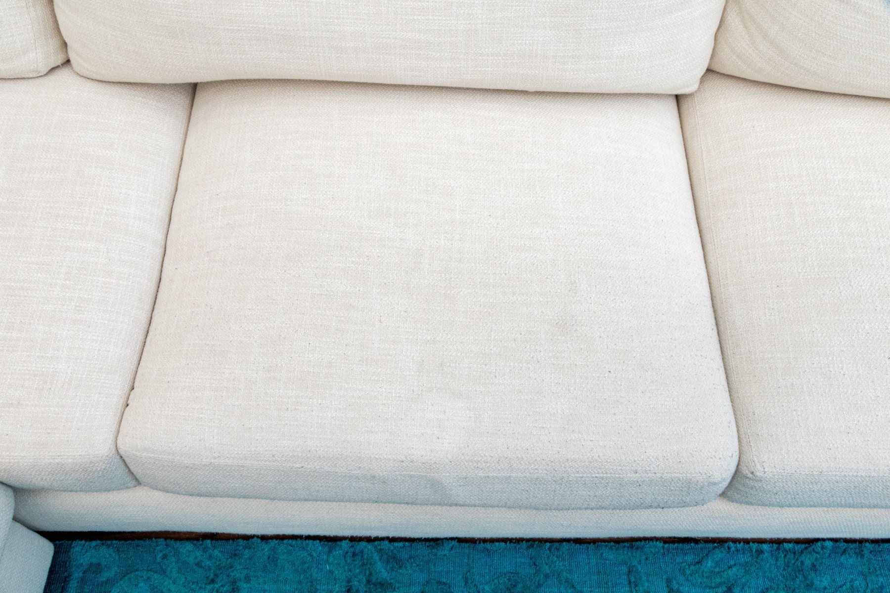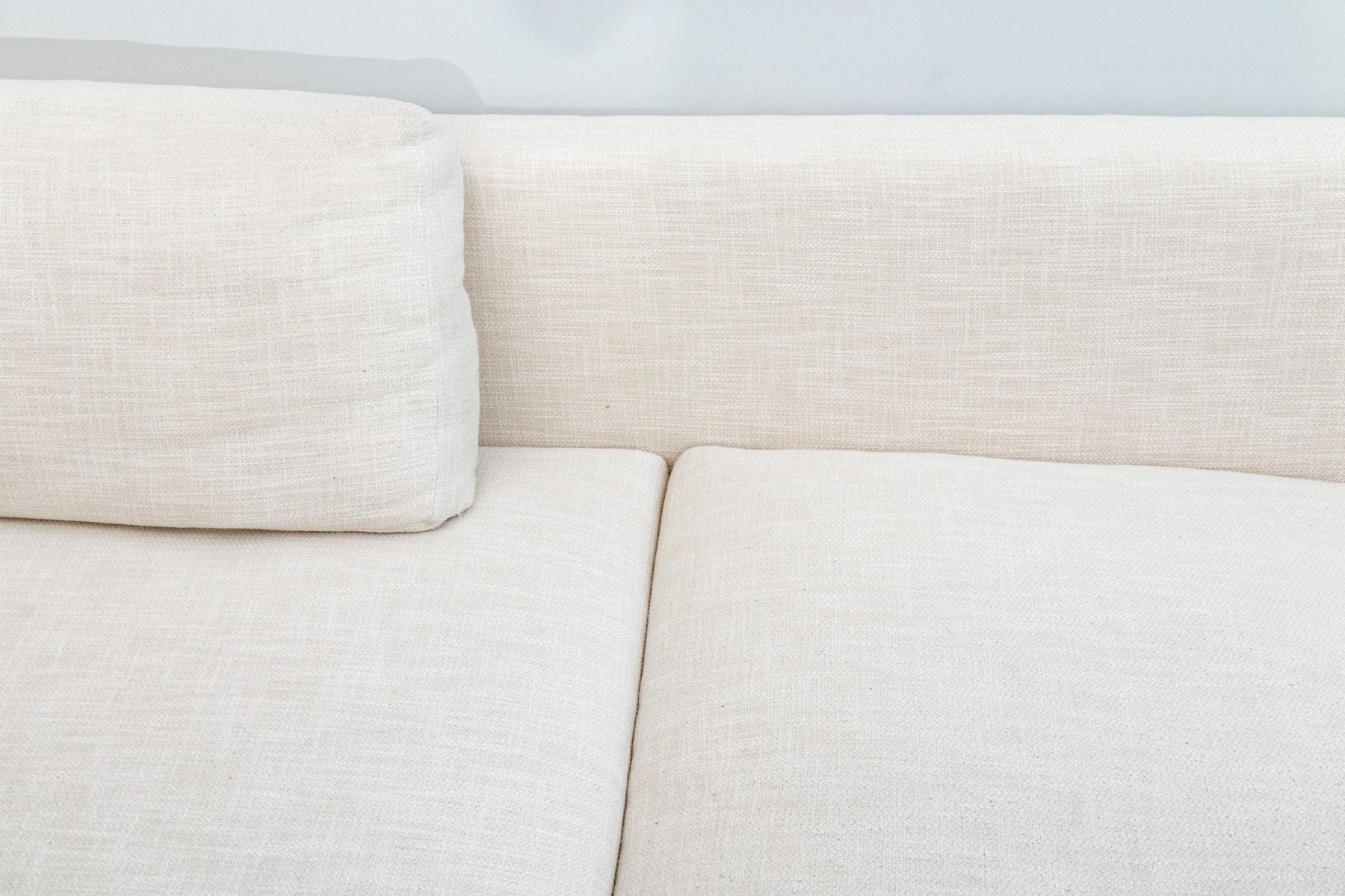 A classic Ralph Lauren sectional sofa coming in two sections, comprised of a three seat sofa together with a love seat sofa with one arm. Fitted with white woven fabric upholstered seat cushions and seat backs for stylish comfort.