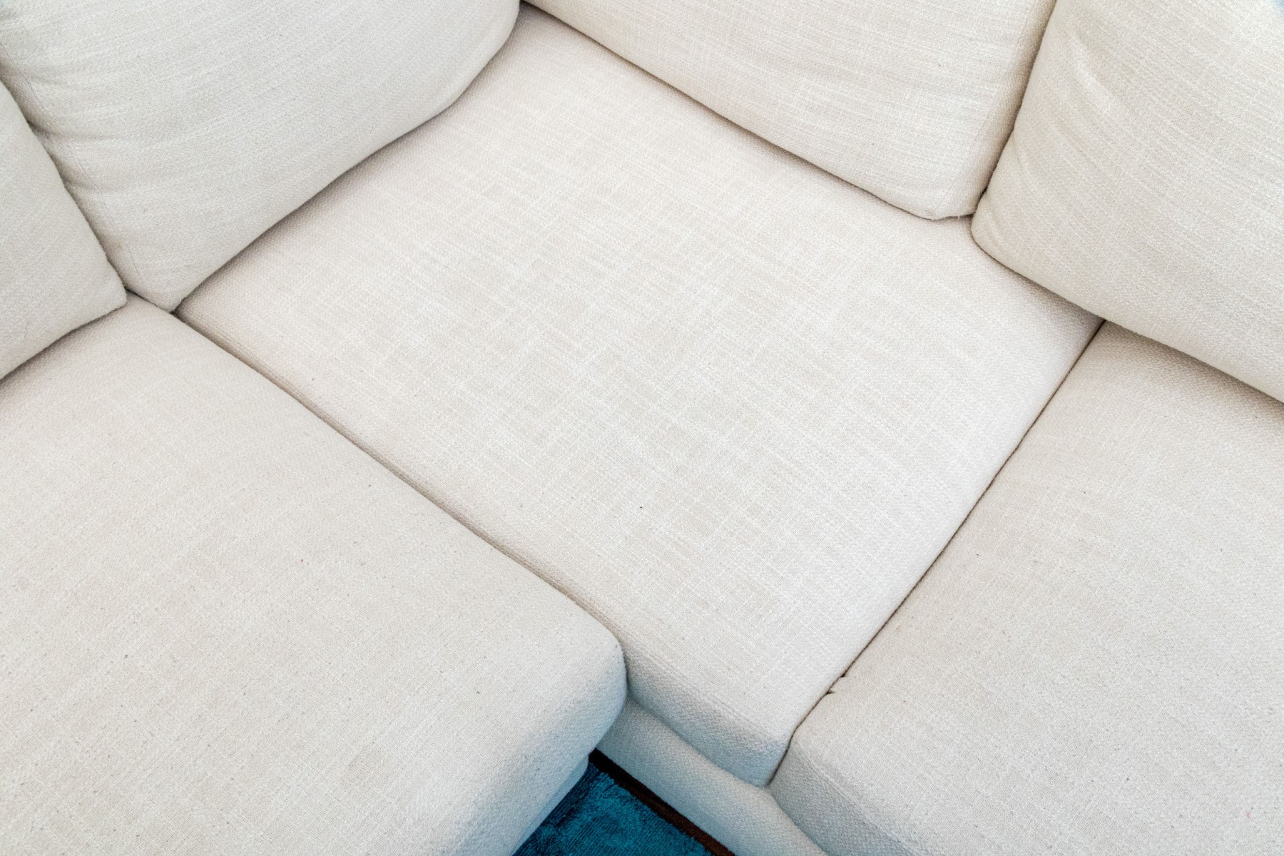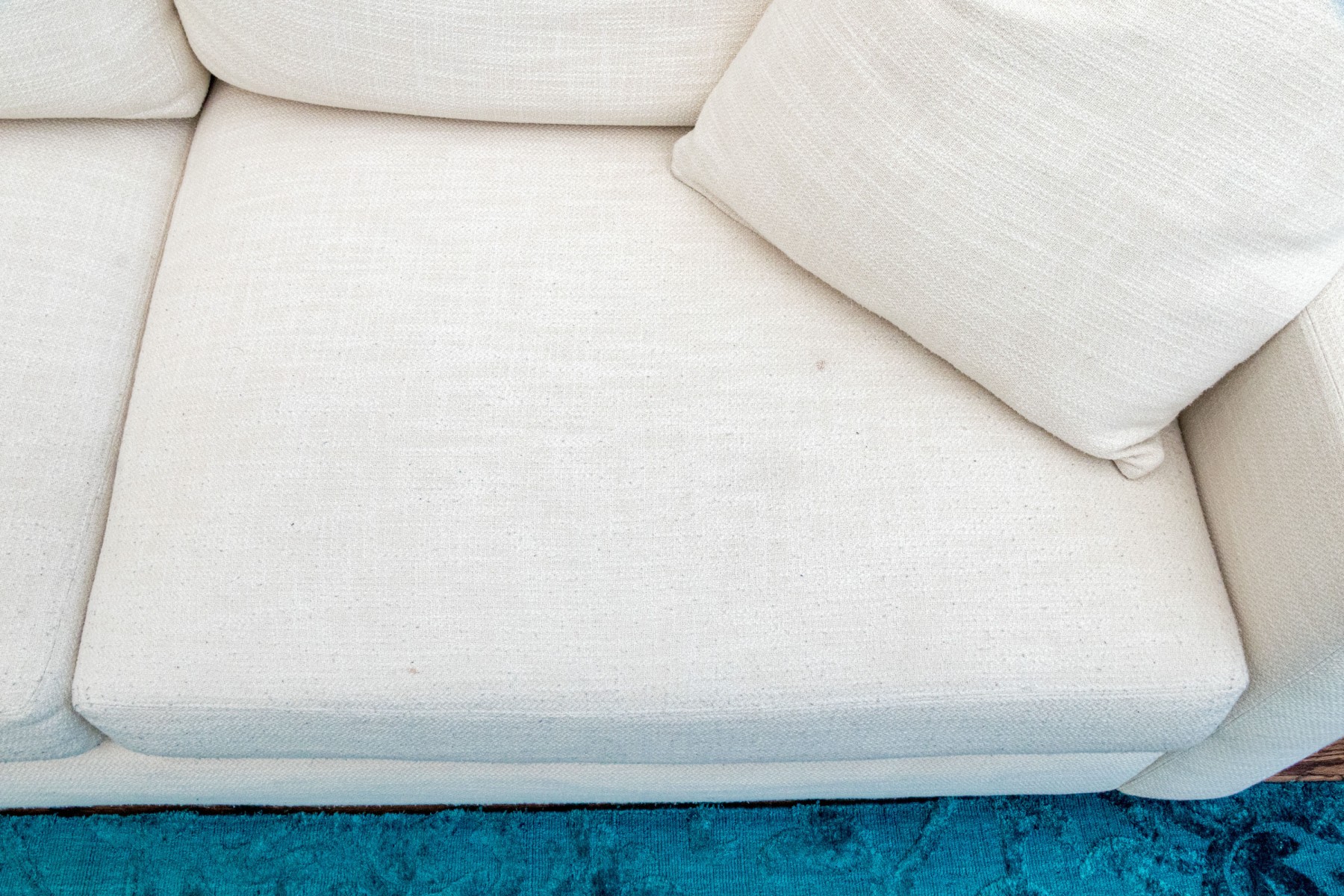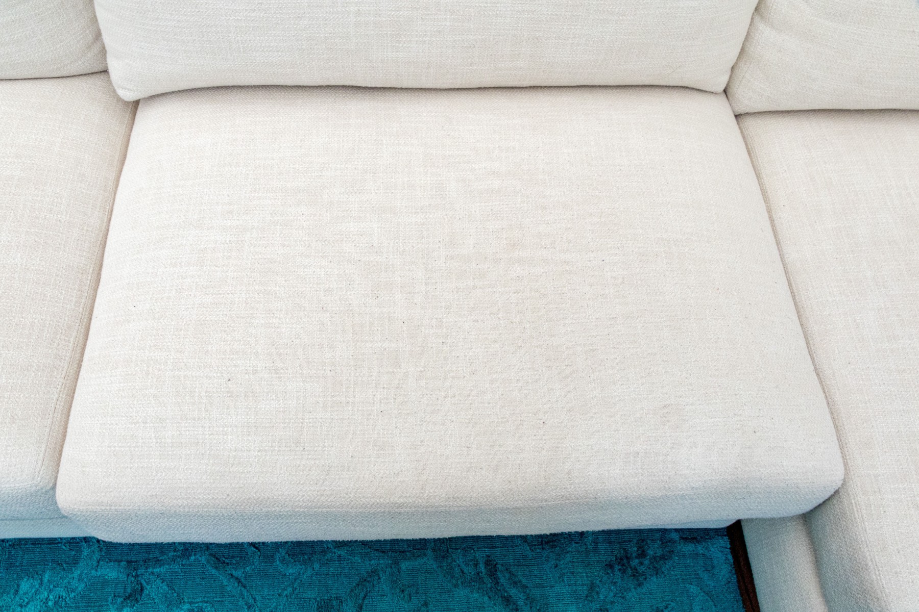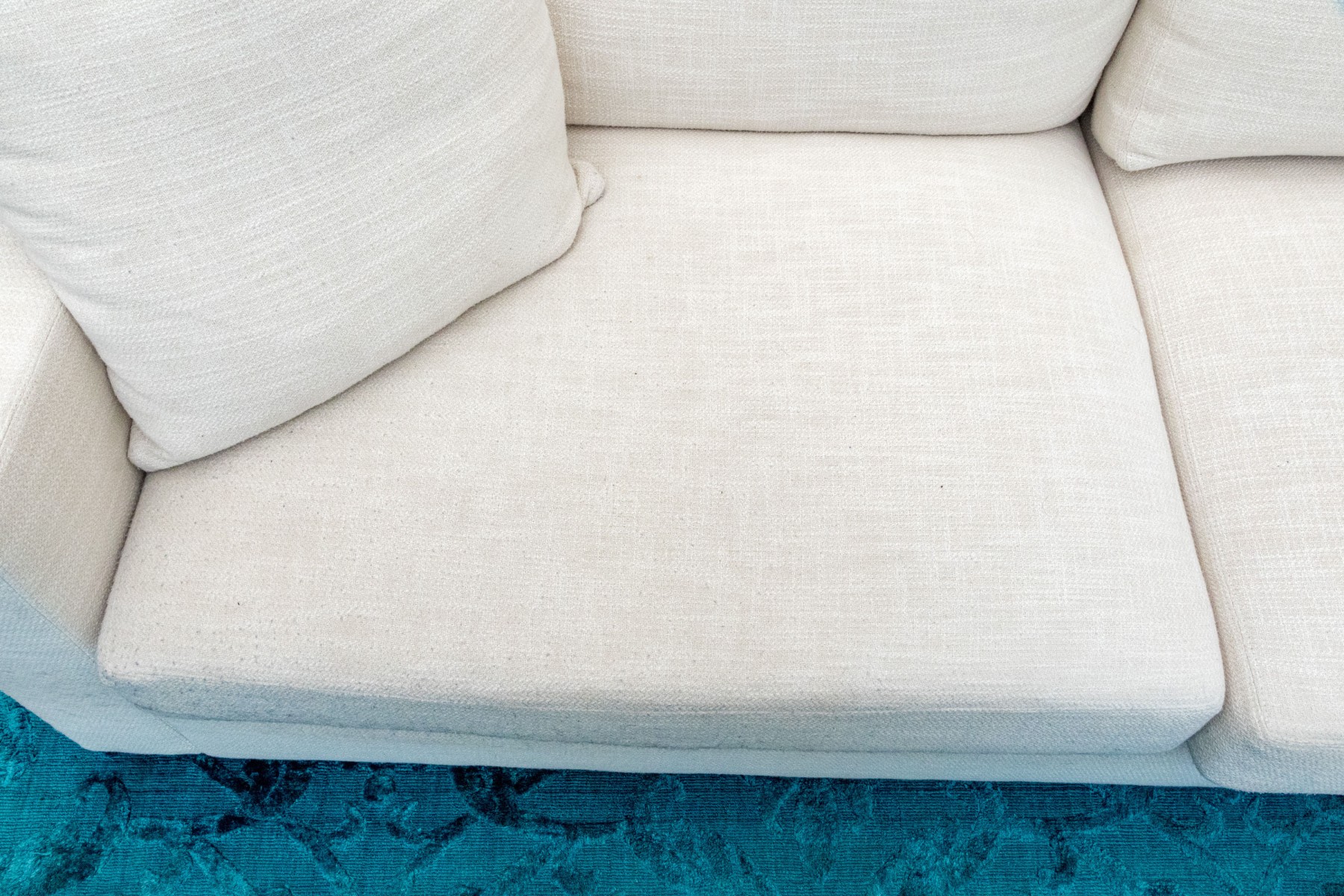 A classic Ralph Lauren sectional sofa coming in two sections, comprised of a three seat sofa together with a love seat sofa with one arm. Fitted with white woven fabric upholstered seat cushions and seat backs for stylish comfort.