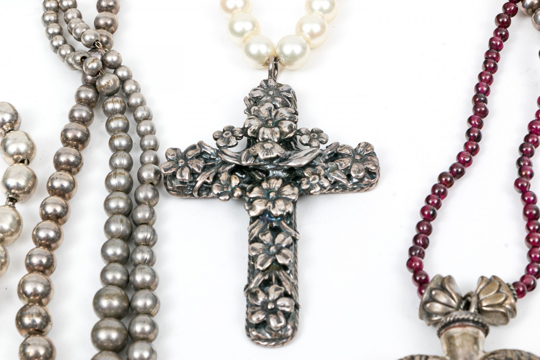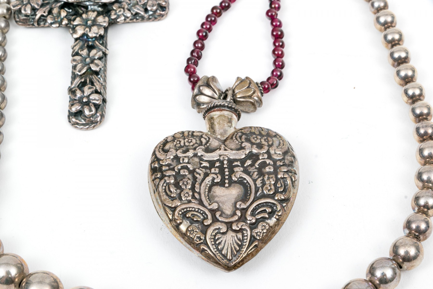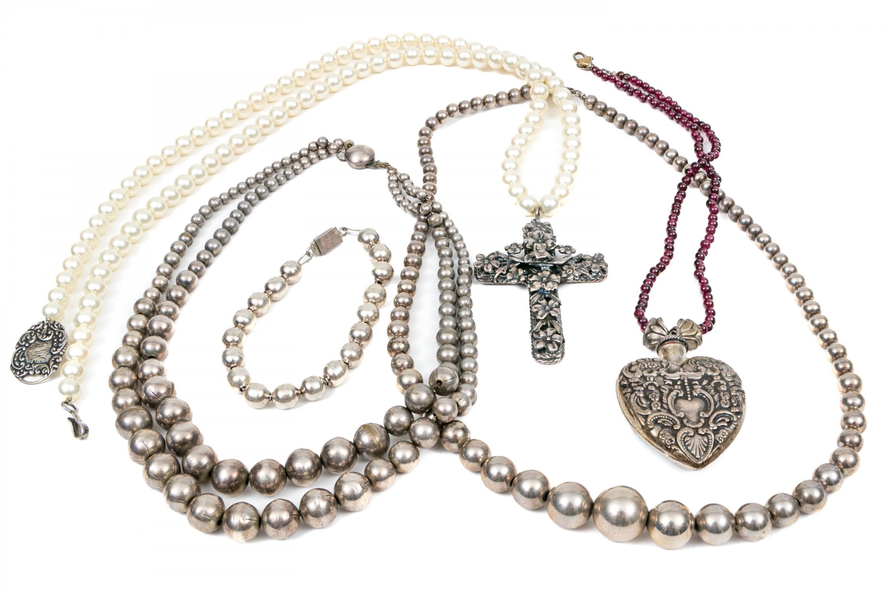 Sterling and beaded necklaces. A faux pearl necklace with large ornate floral cross pendant. Garnet beaded necklace with sterling heart shaped perfume bottle pendant. Two graduated sterling beaded necklaces, 4.5mm to11.5mm double stranded necklace and 6mm to 16mm on single strand. Sterling silver 8mm beaded bracelet with box clasp.