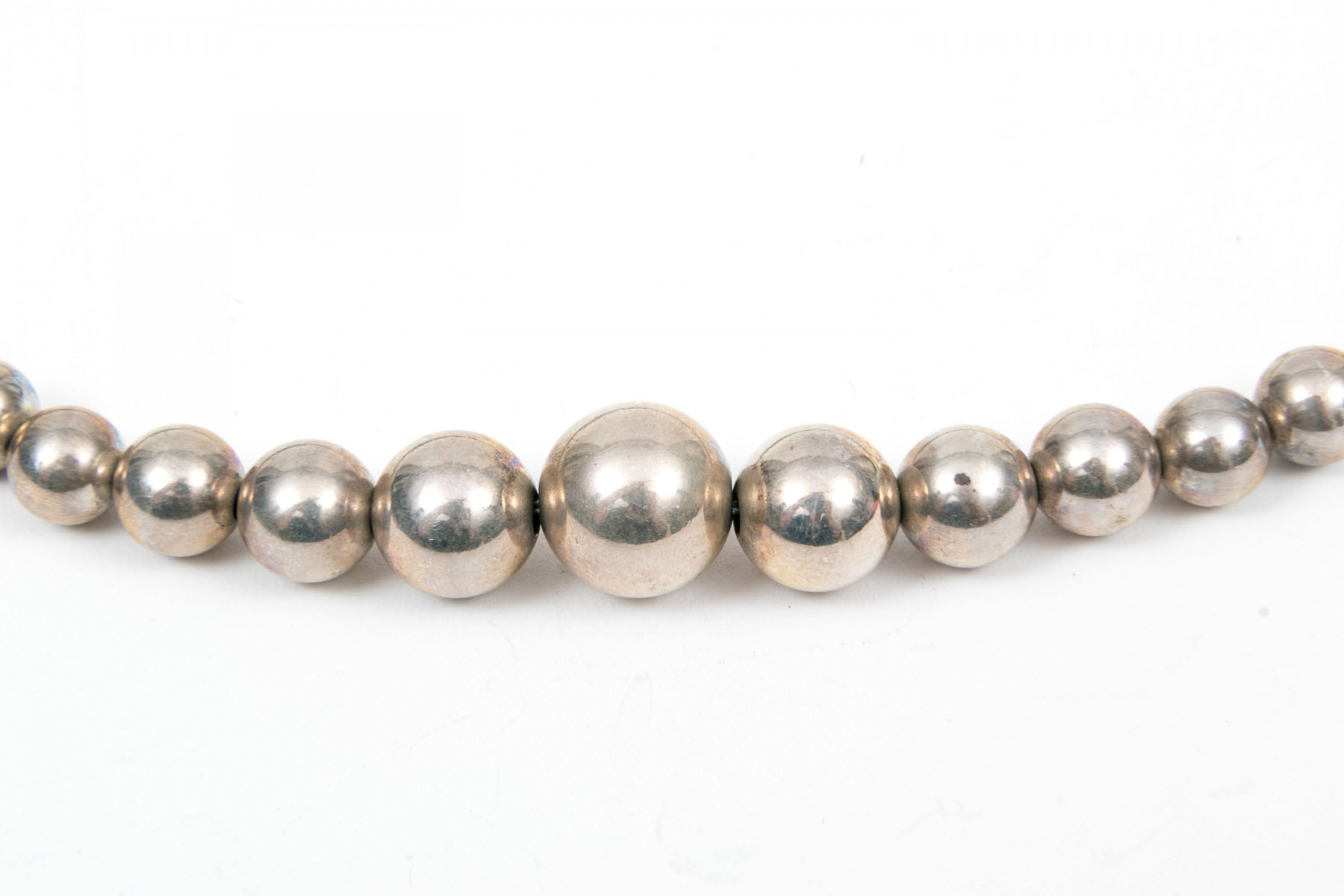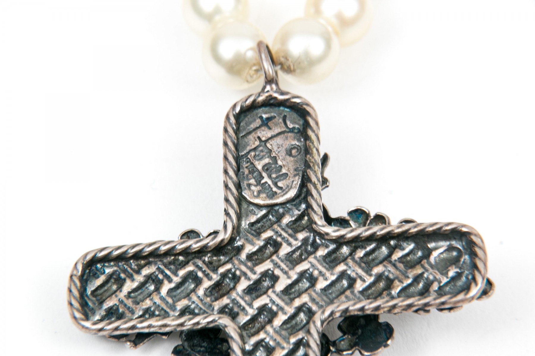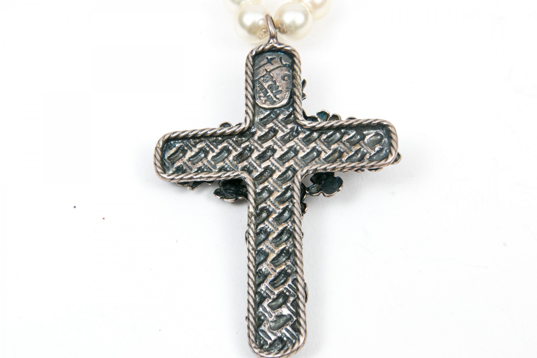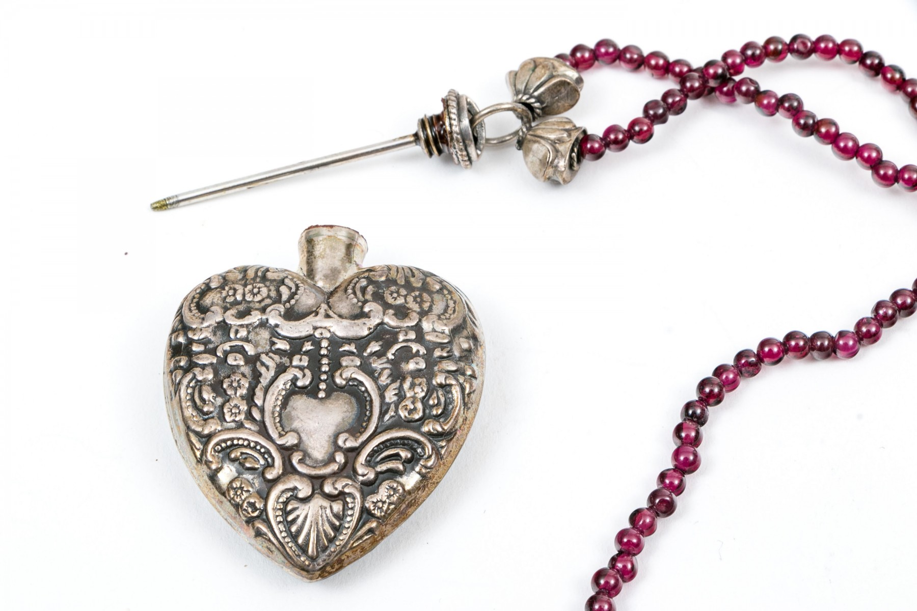 Sterling and beaded necklaces. A faux pearl necklace with large ornate floral cross pendant. Garnet beaded necklace with sterling heart shaped perfume bottle pendant. Two graduated sterling beaded necklaces, 4.5mm to11.5mm double stranded necklace and 6mm to 16mm on single strand. Sterling silver 8mm beaded bracelet with box clasp.