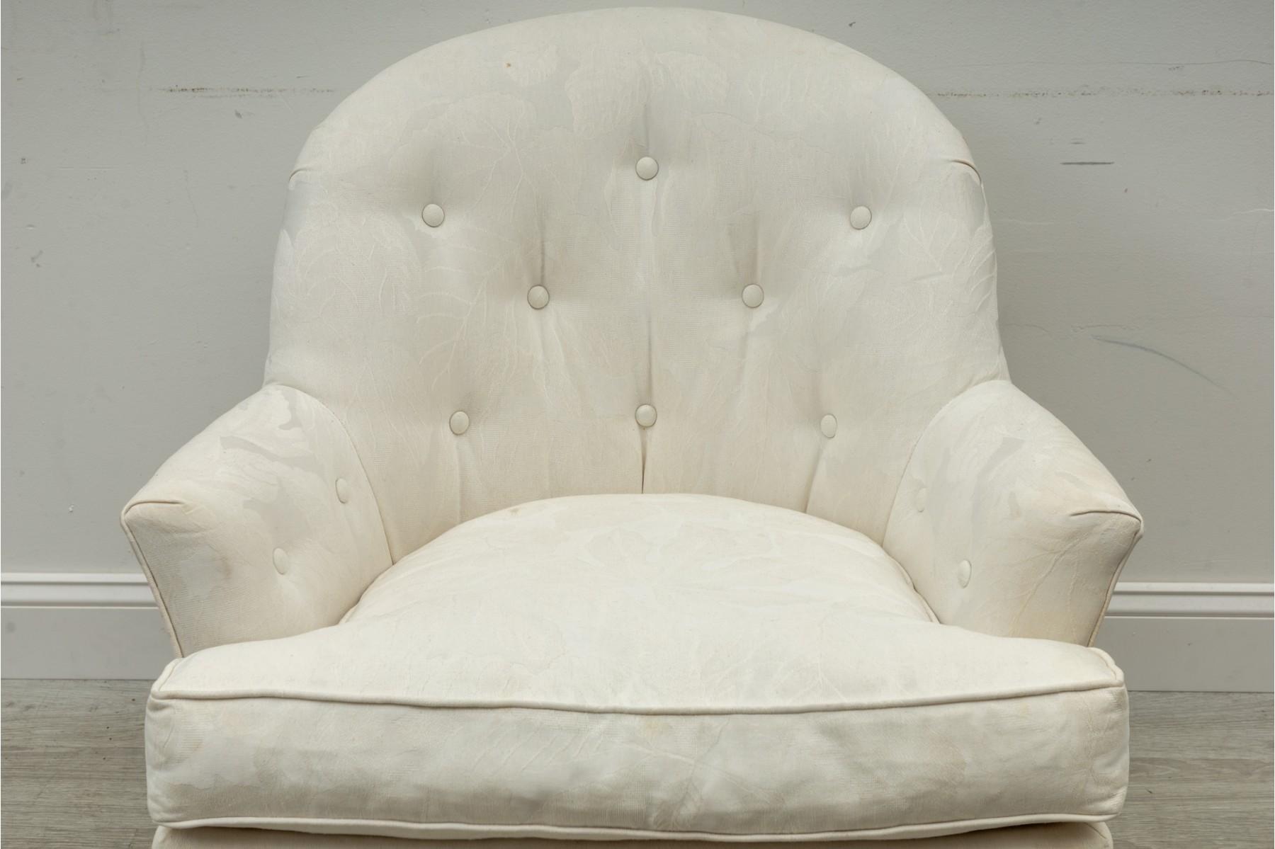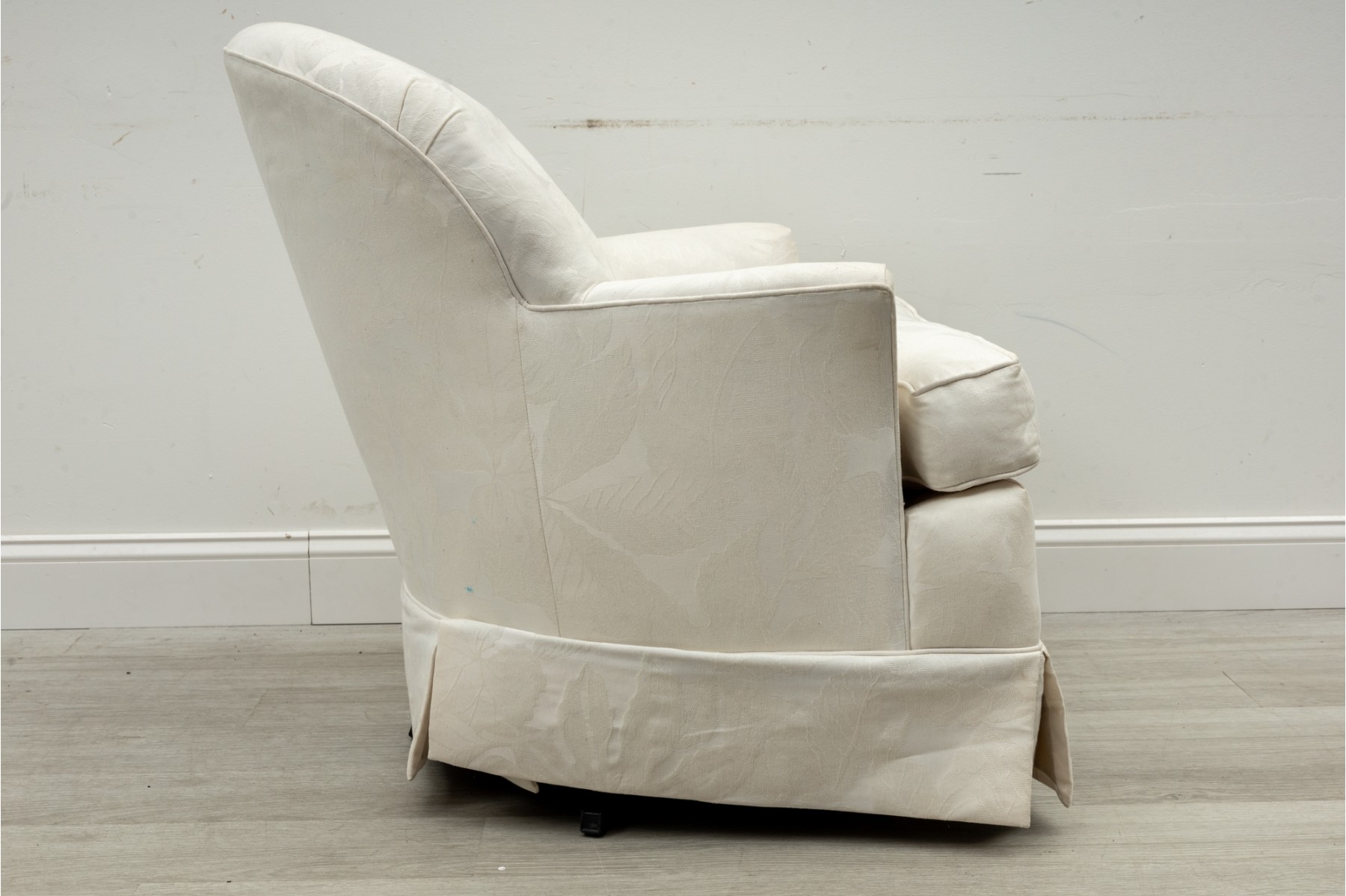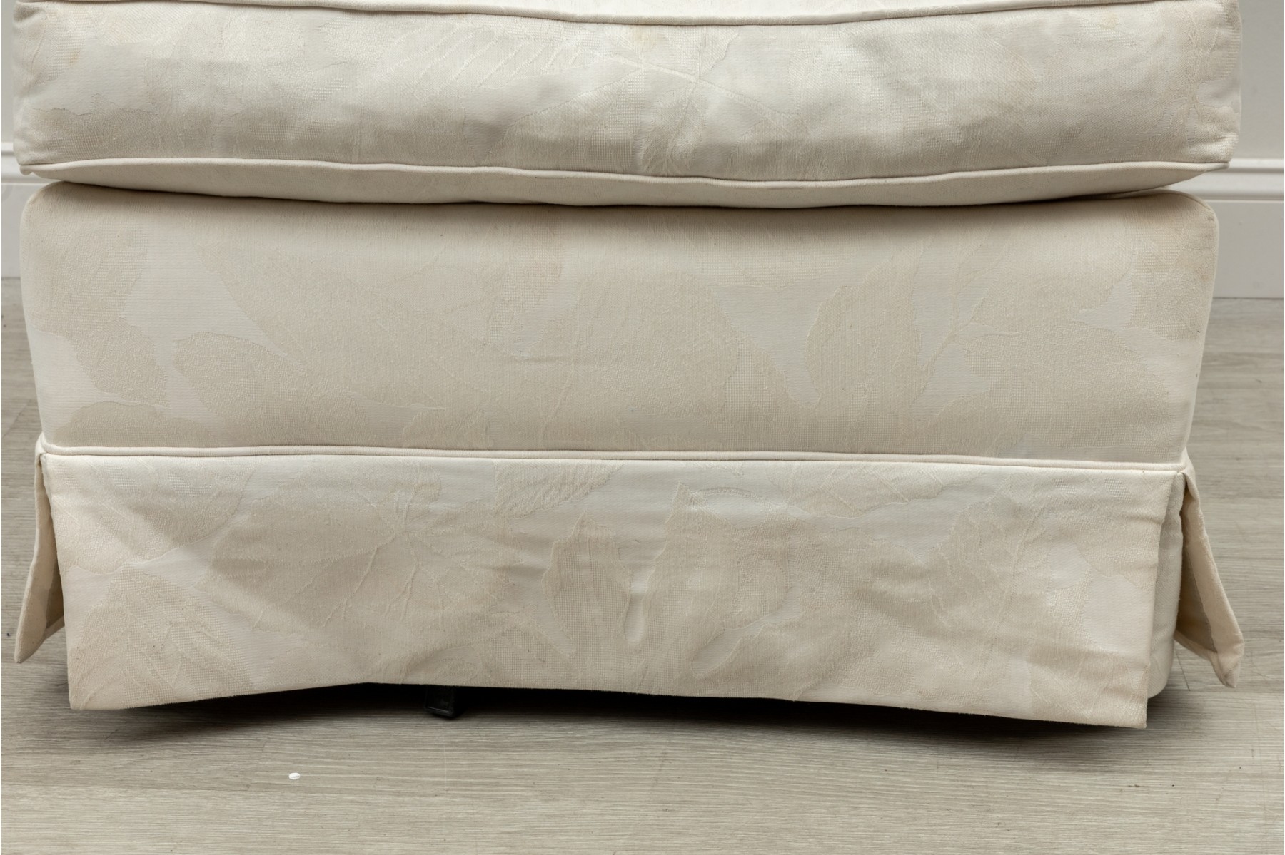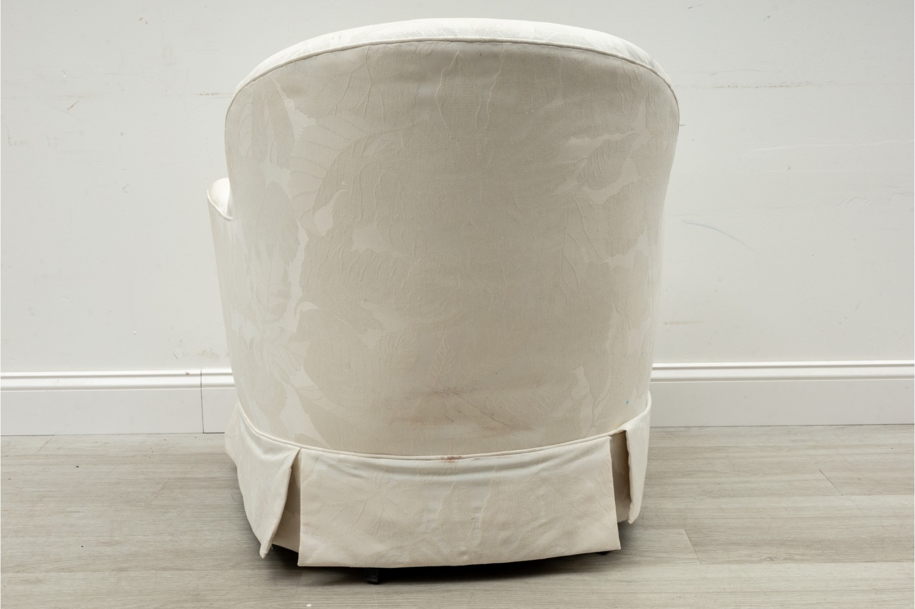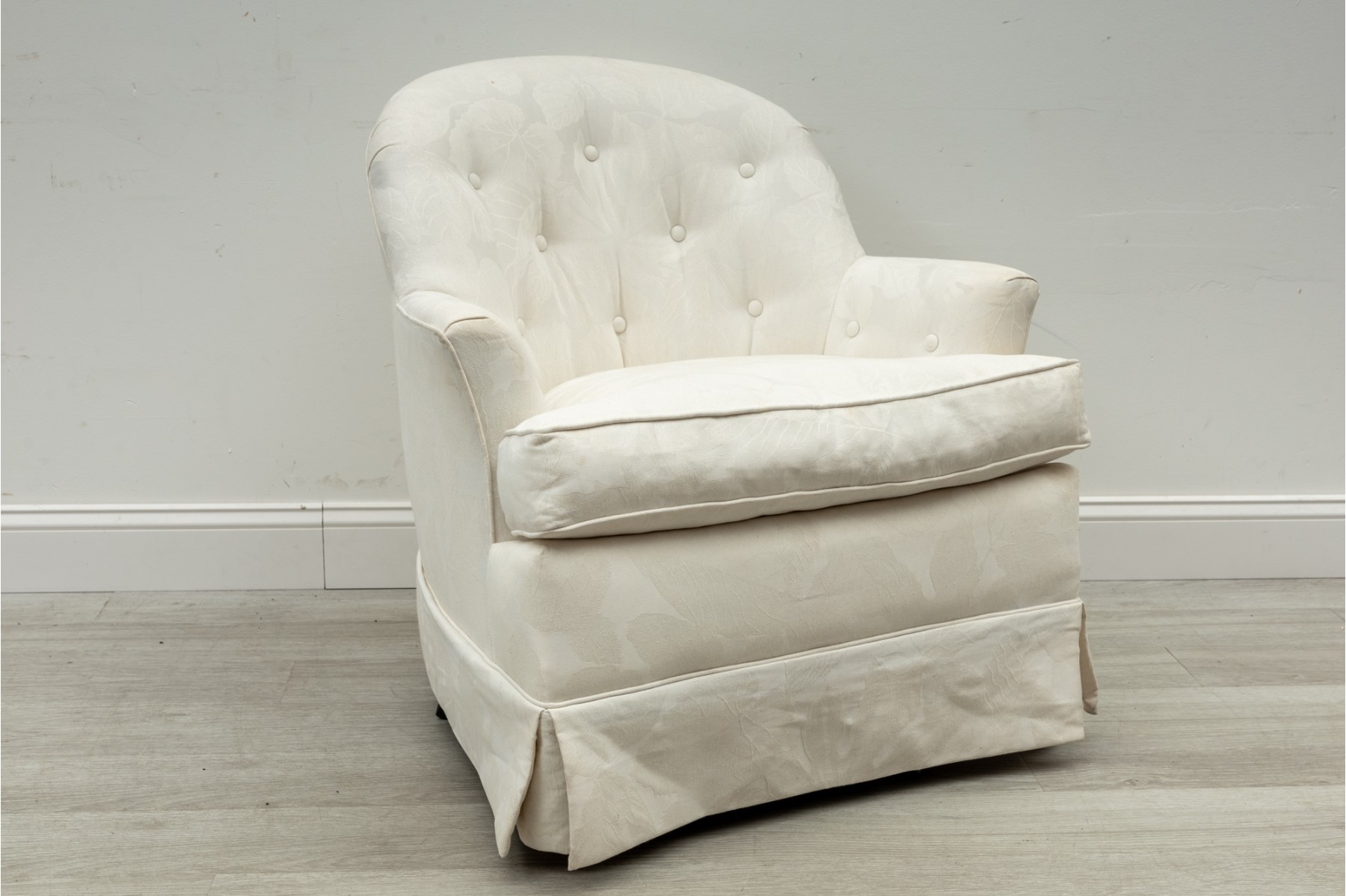 A button tufted club chair with skirt and floral ivory white upholstery by Classic Traditions Furniture.