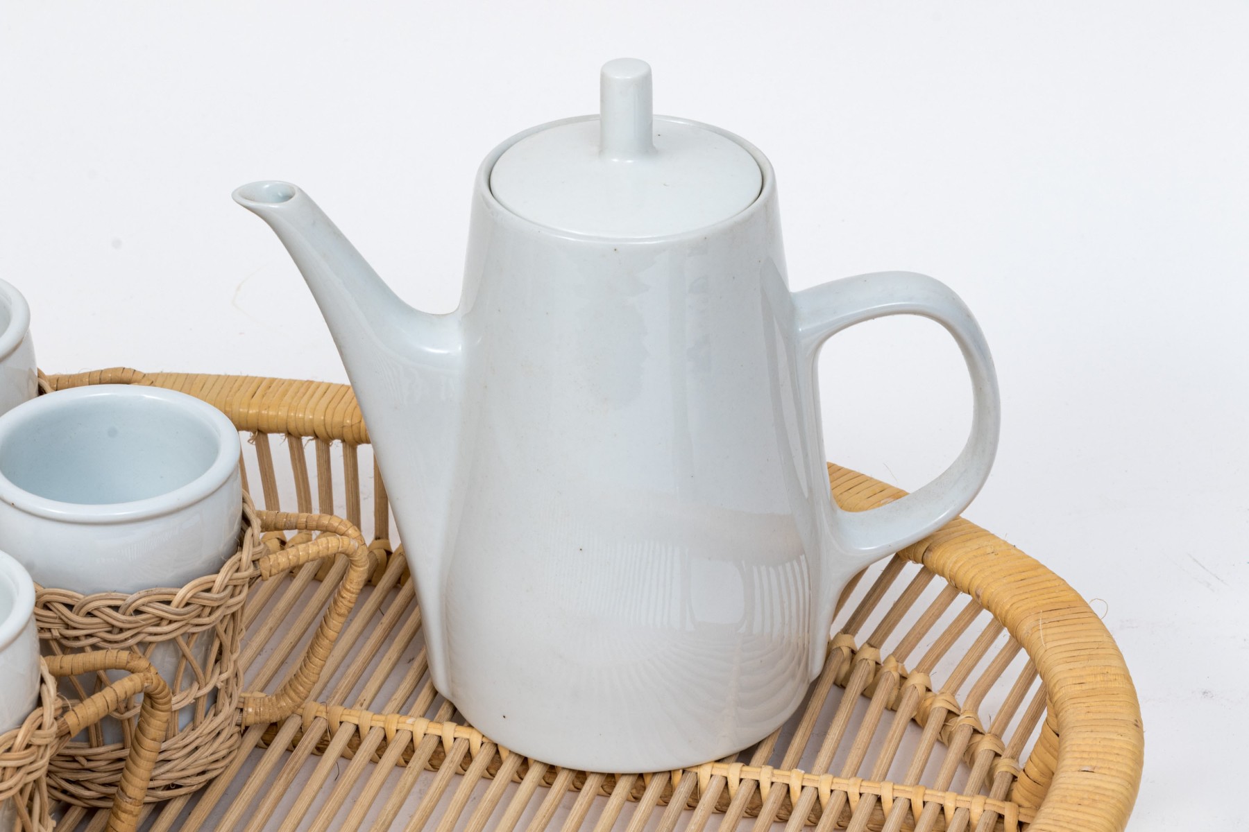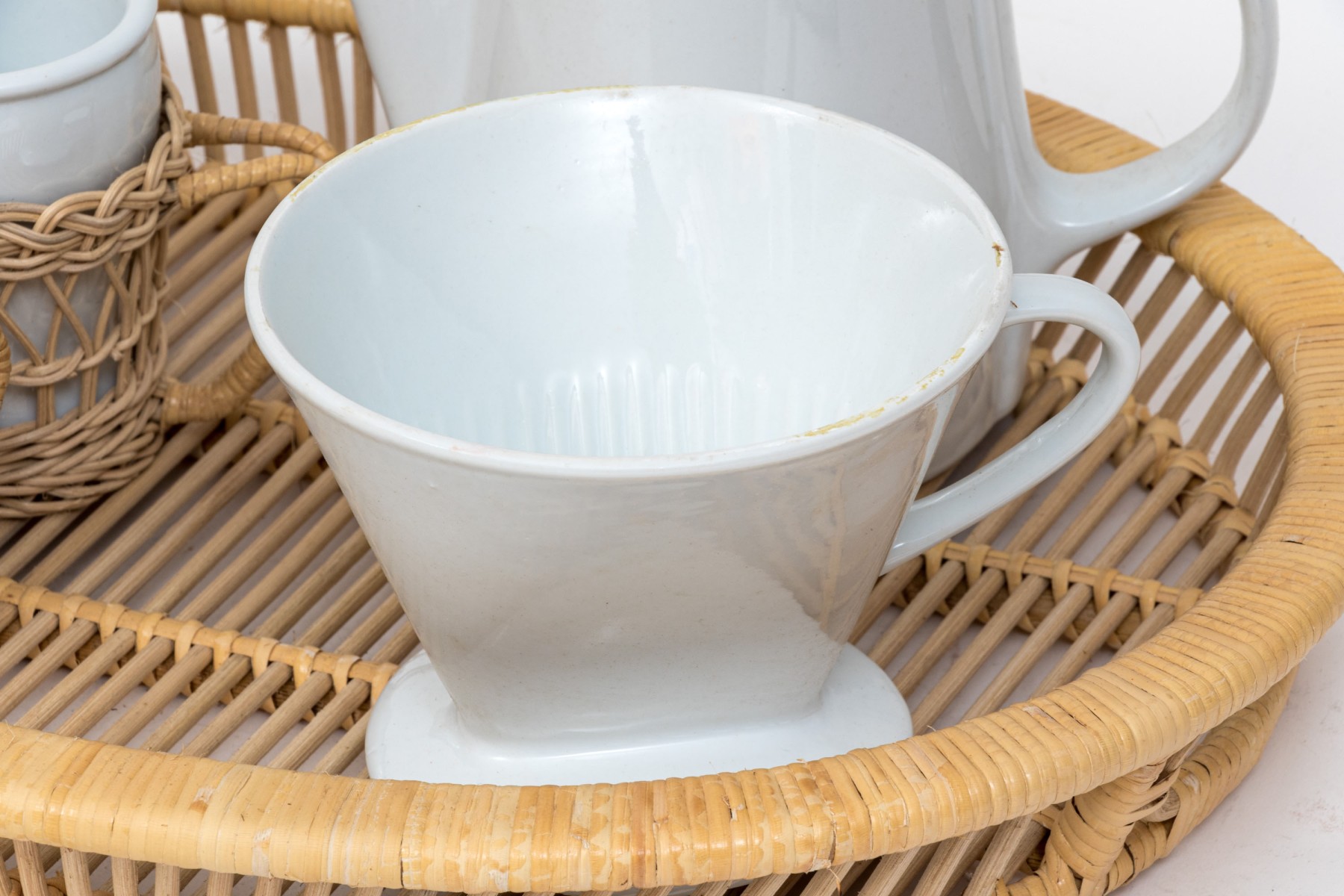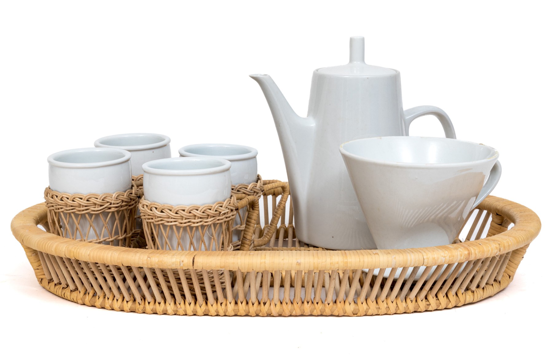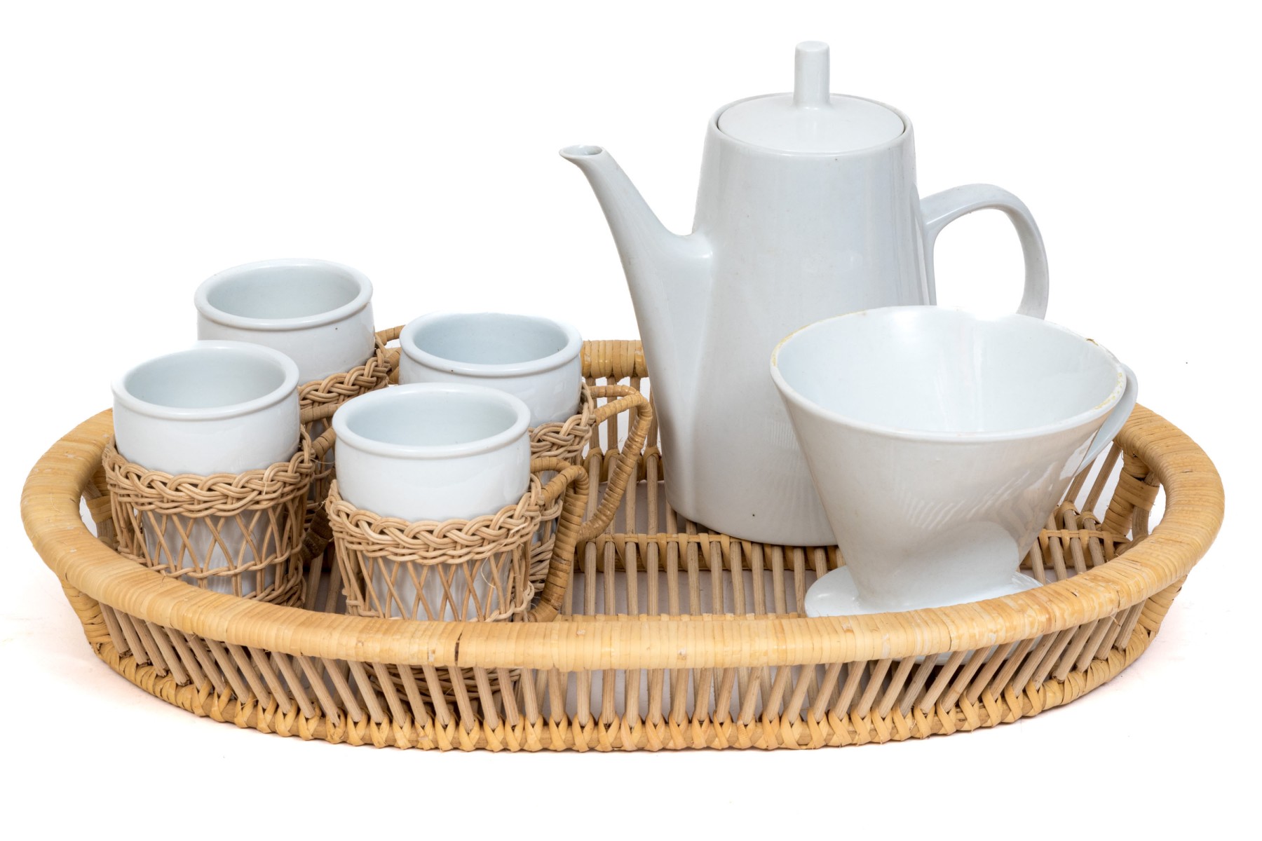 Twelve piece white porcelain coffee service. Includes mugs, wicker holders and tray and filter coffee maker.