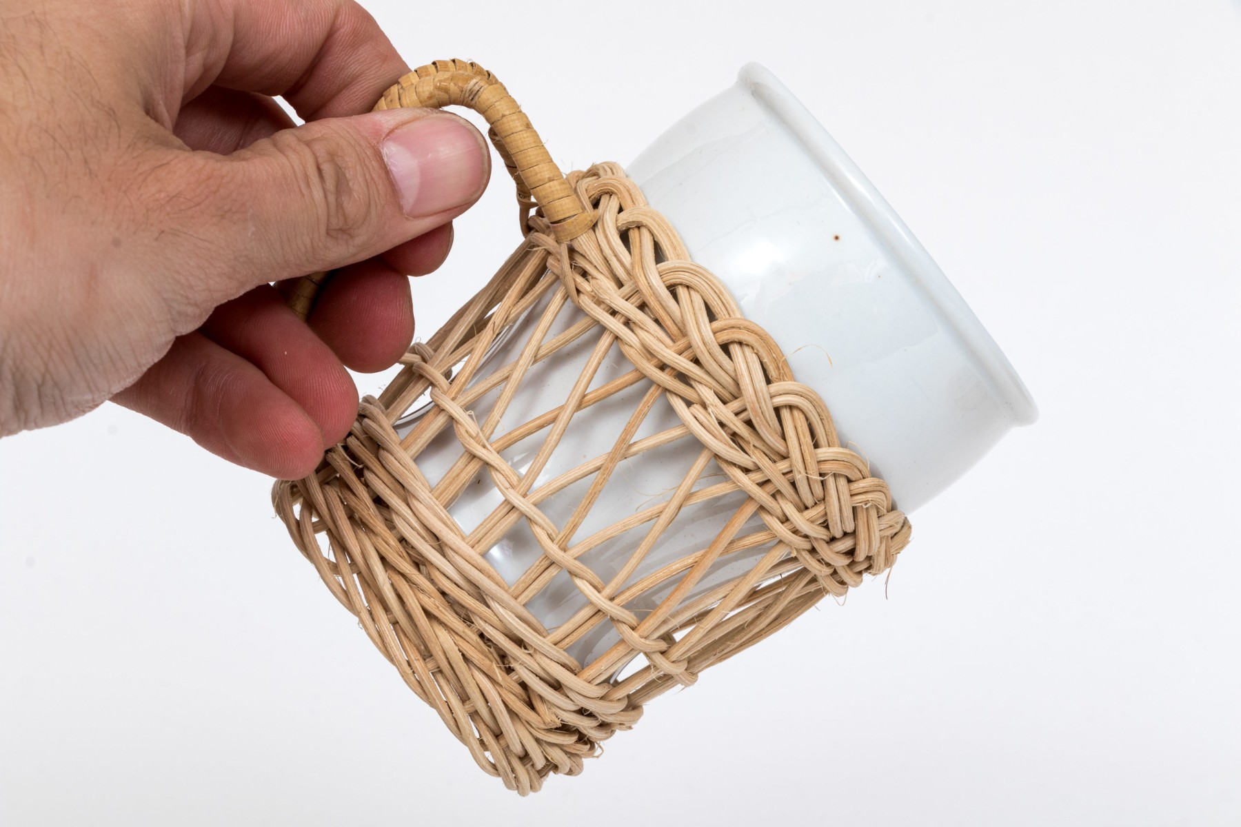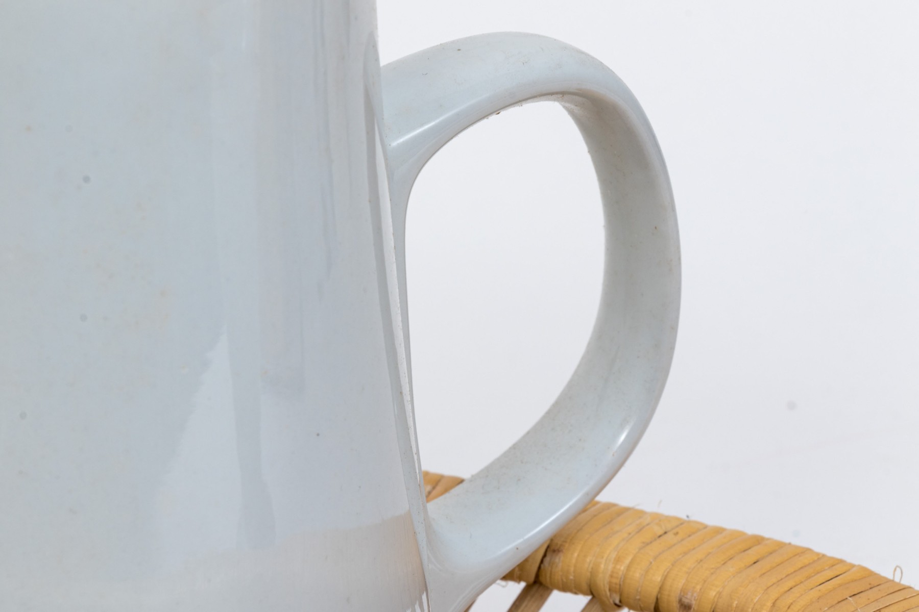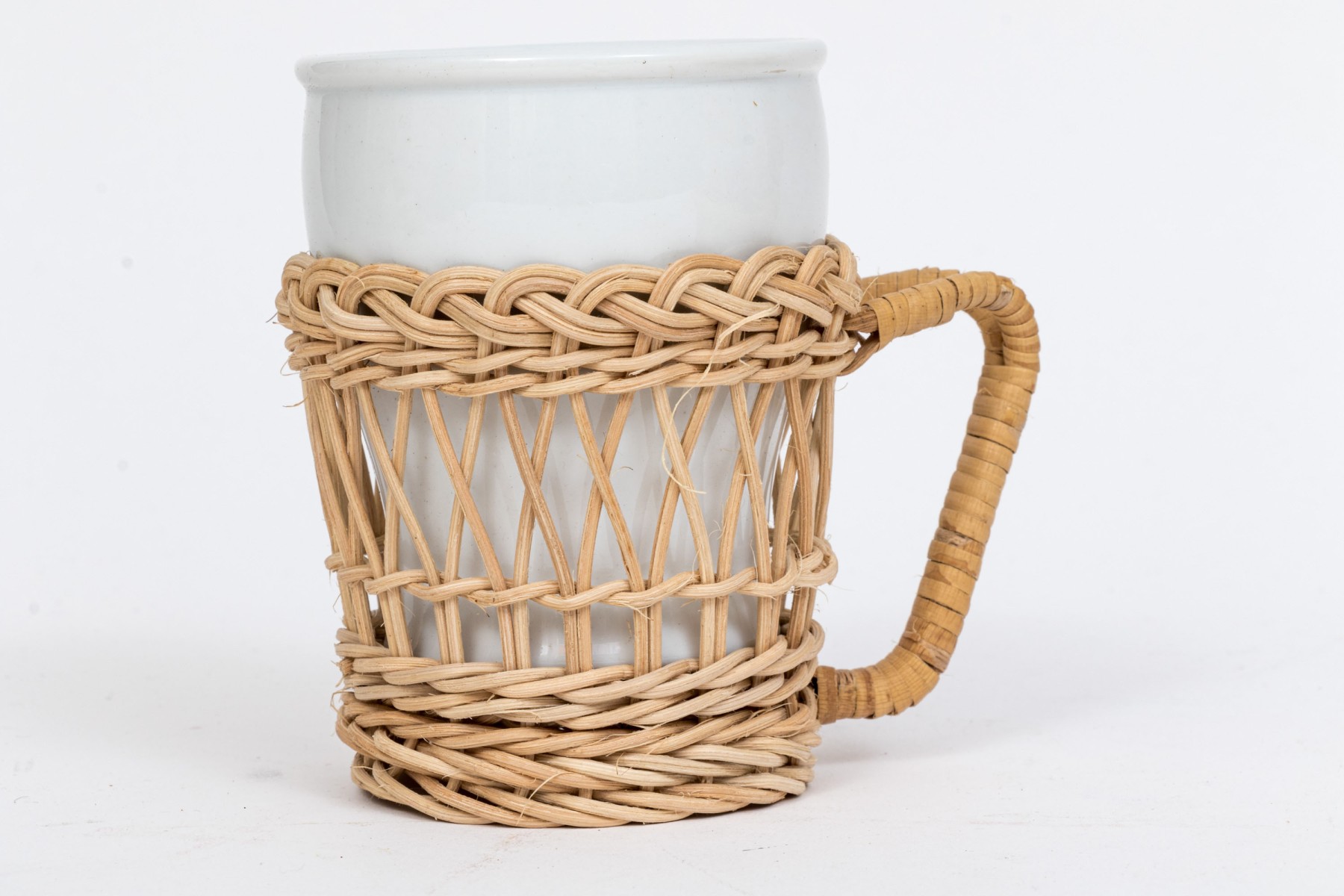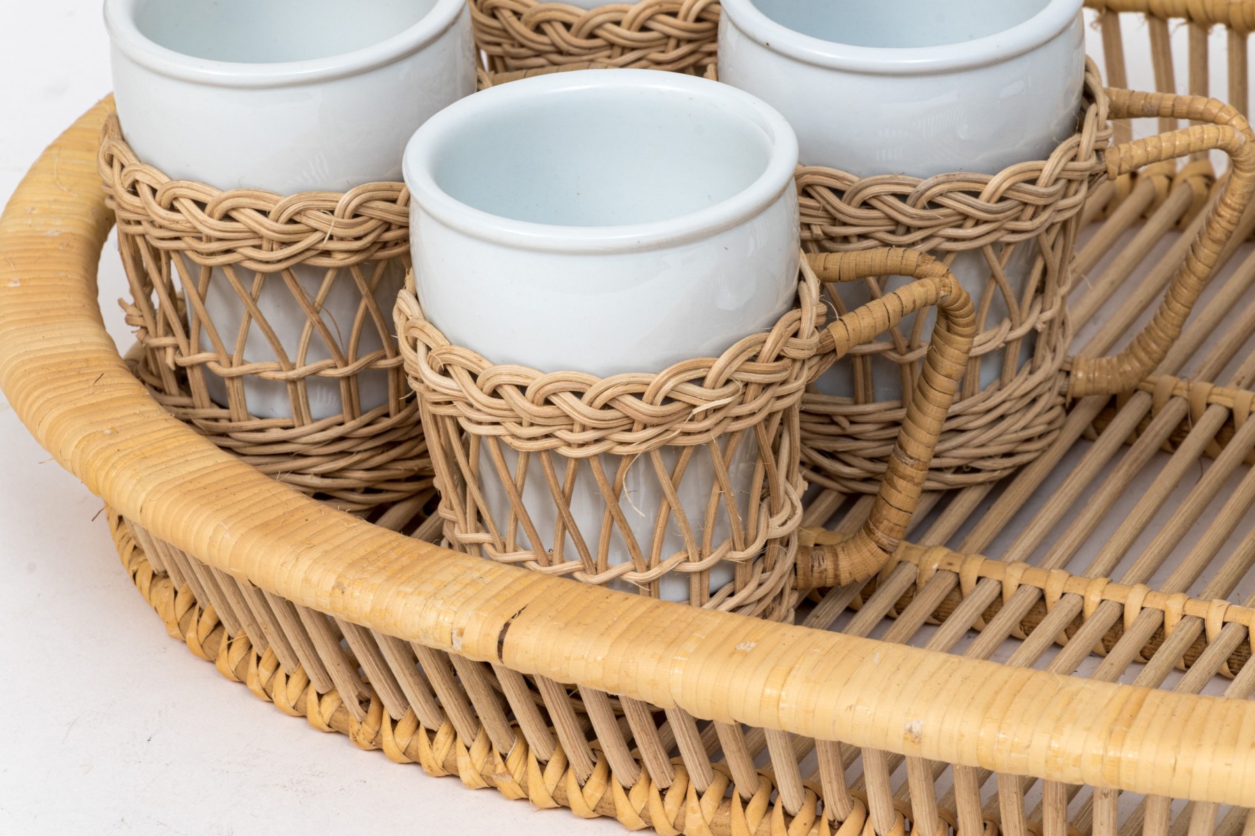 Twelve piece white porcelain coffee service. Includes mugs, wicker holders and tray and filter coffee maker.