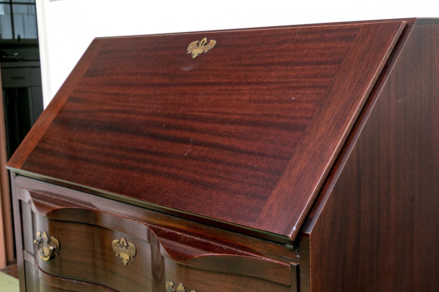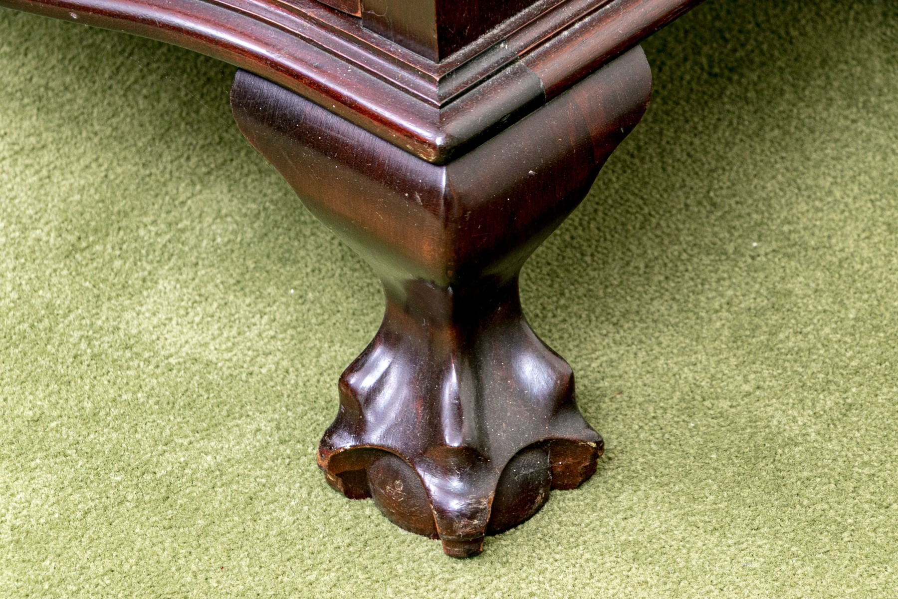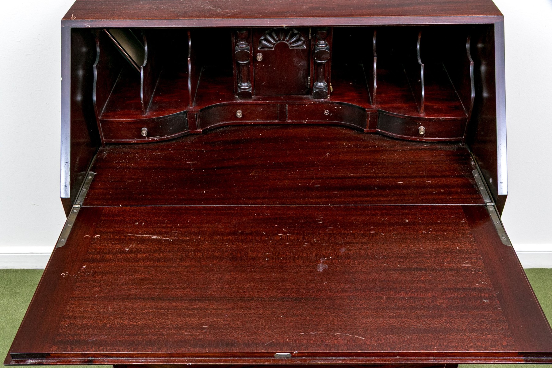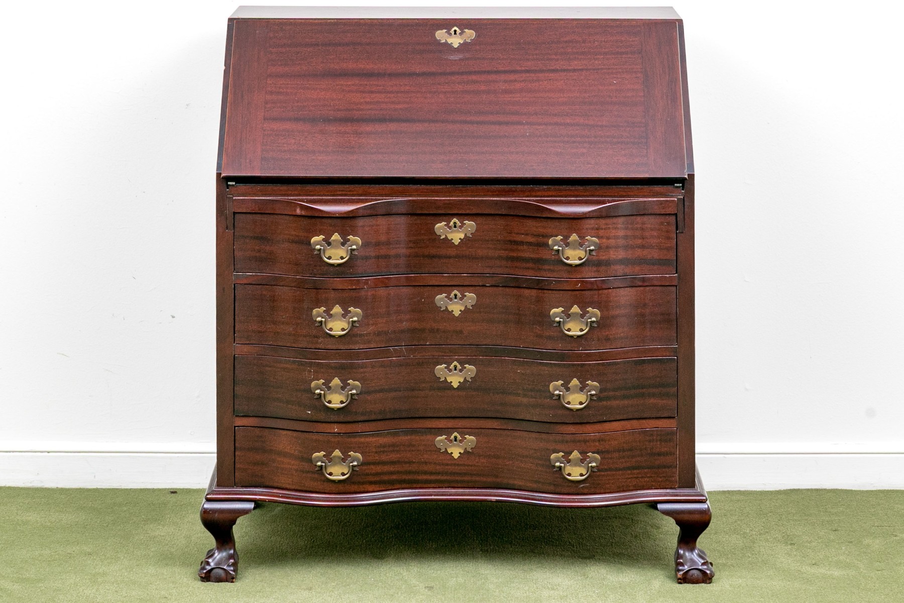 On ball and claw carved feet with four drawers with brass batwing handles and batwing key escutcheons, slant front with batwing day escutcheon.