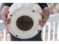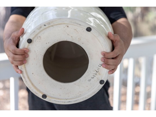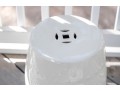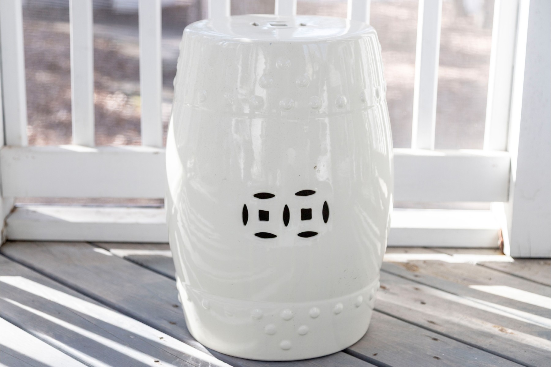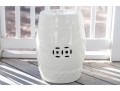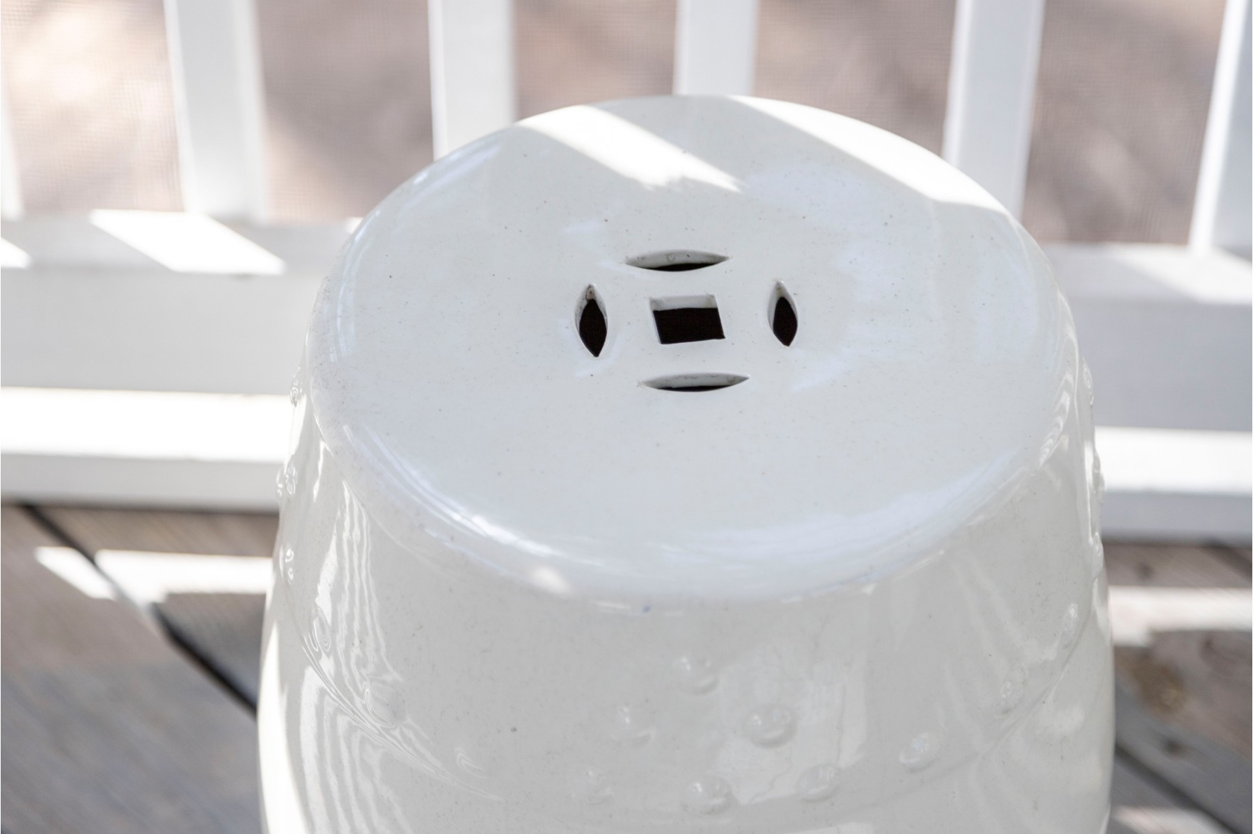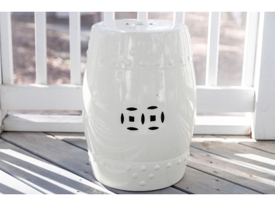 A modern Ming-style garden stool -- White glaze over ceramic. The perfect accent to any patio ensemble, or as a decorative indoor accent.