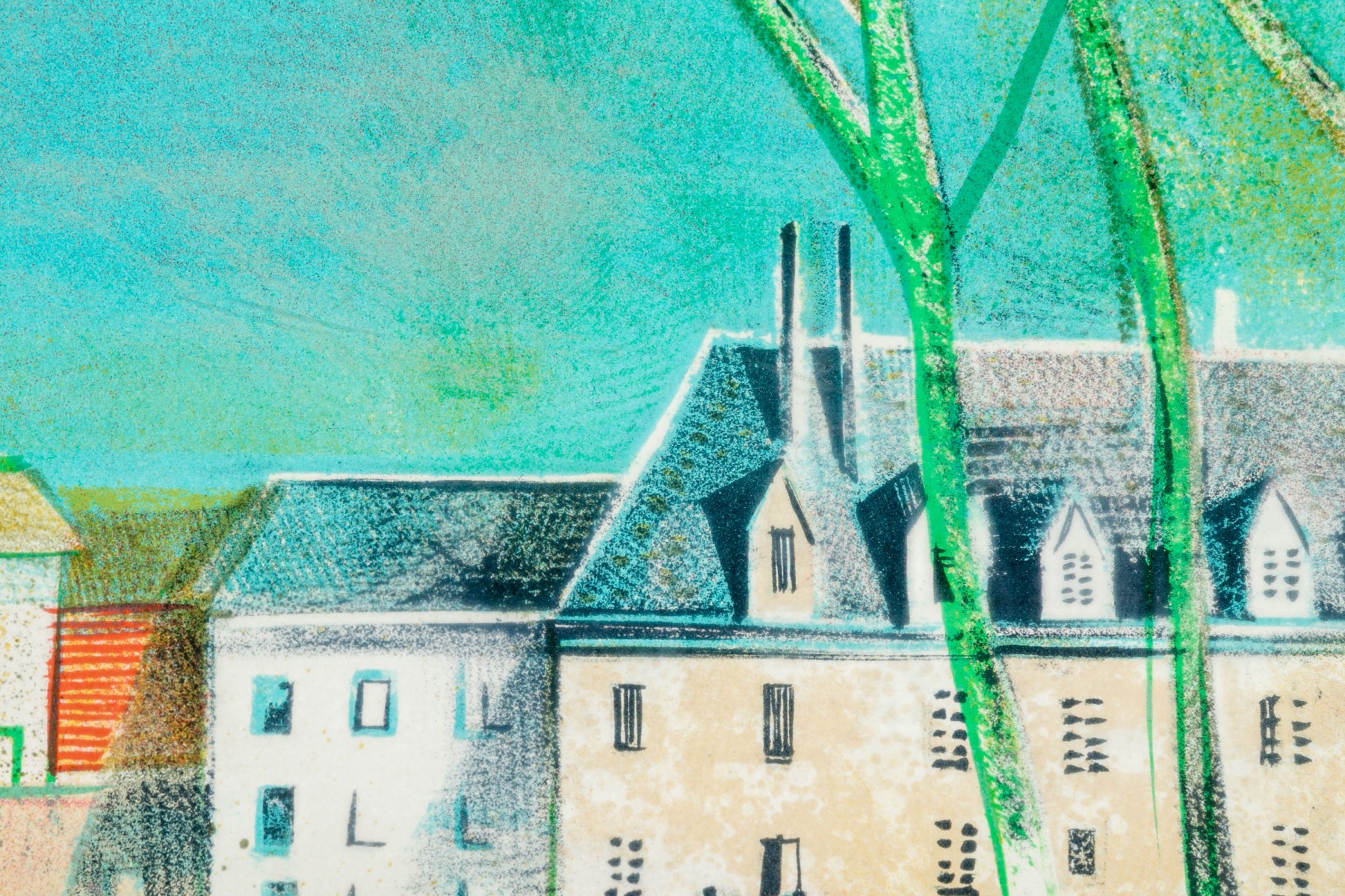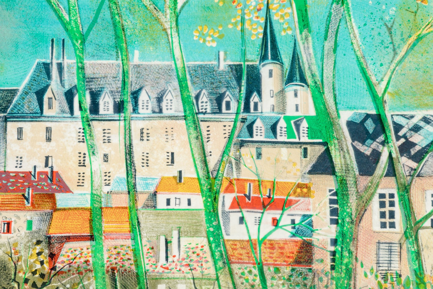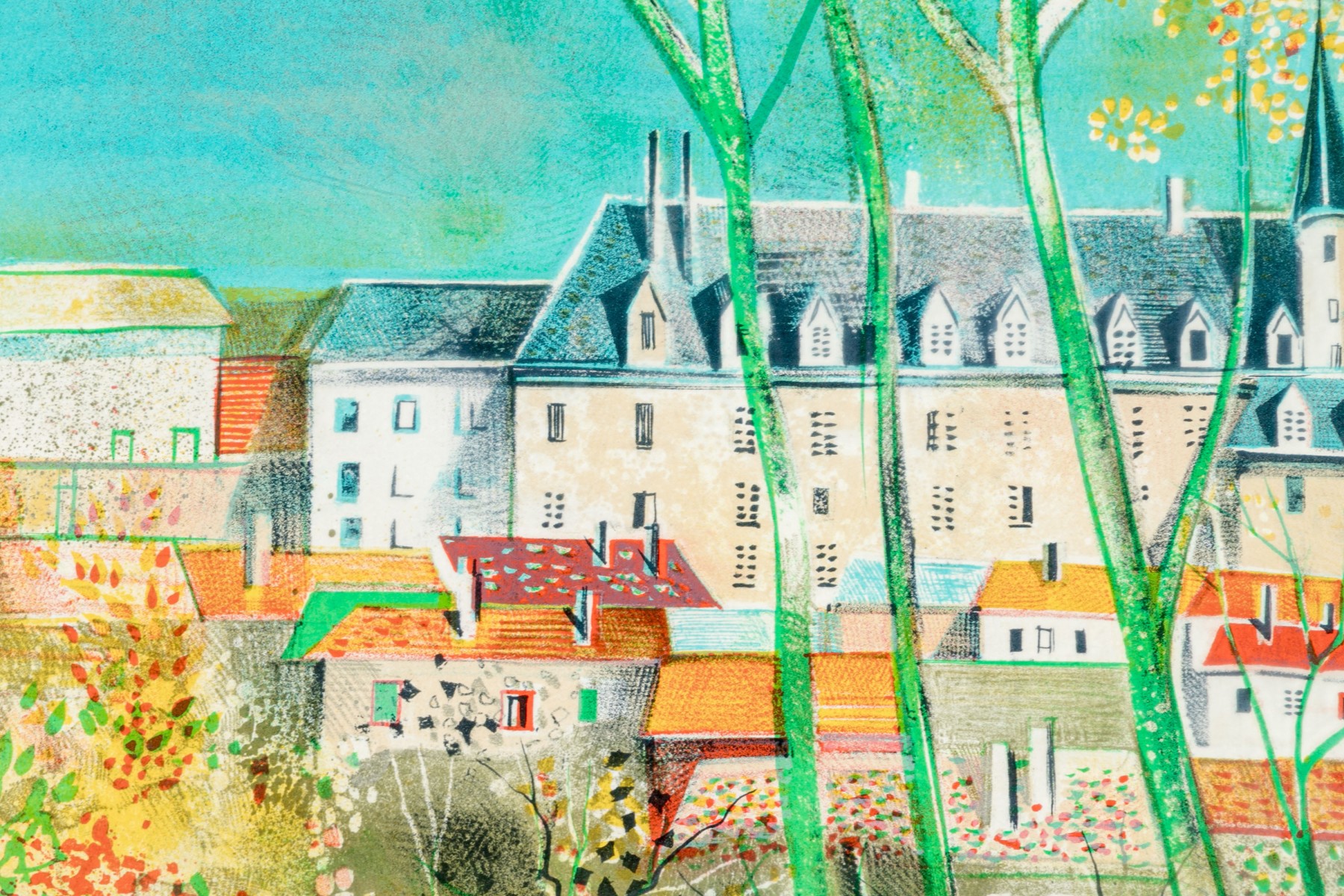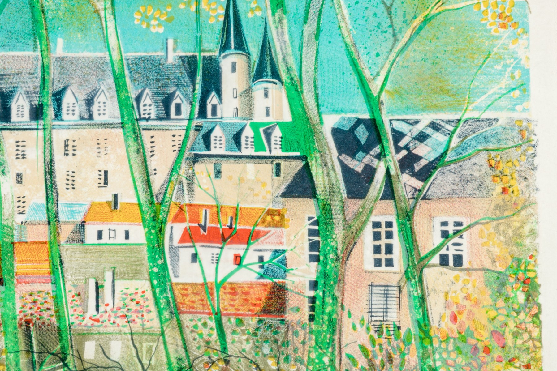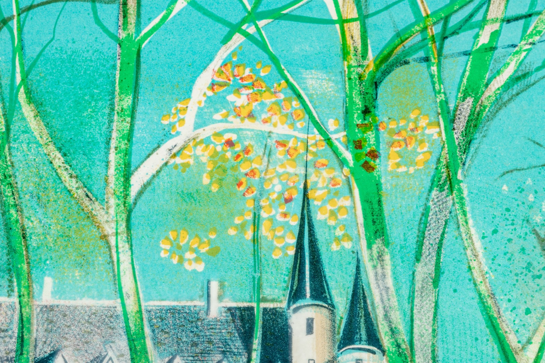Lithograph depicting colorful structures partially hidden behind the barren trees and set against a vivid blue/green sky.