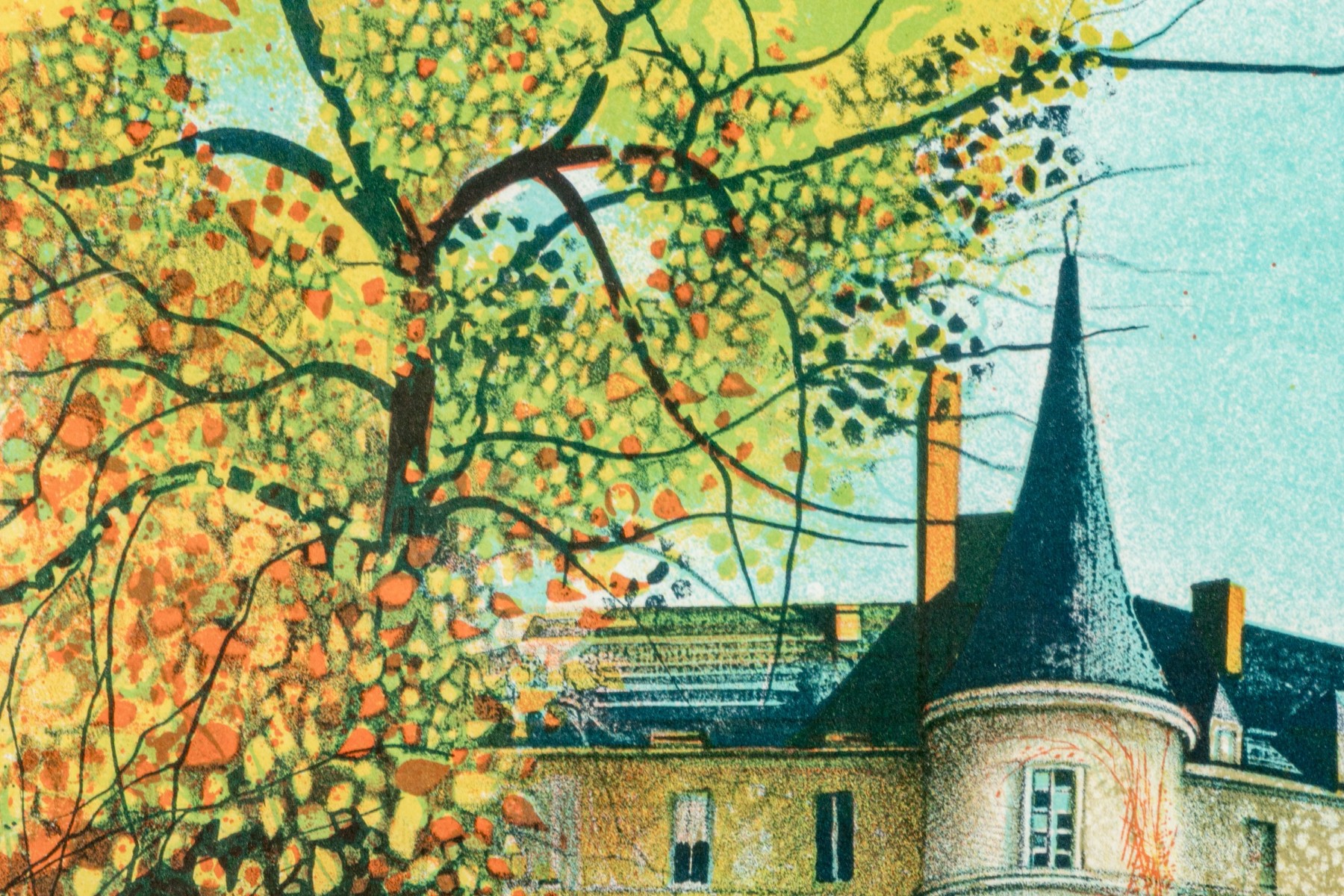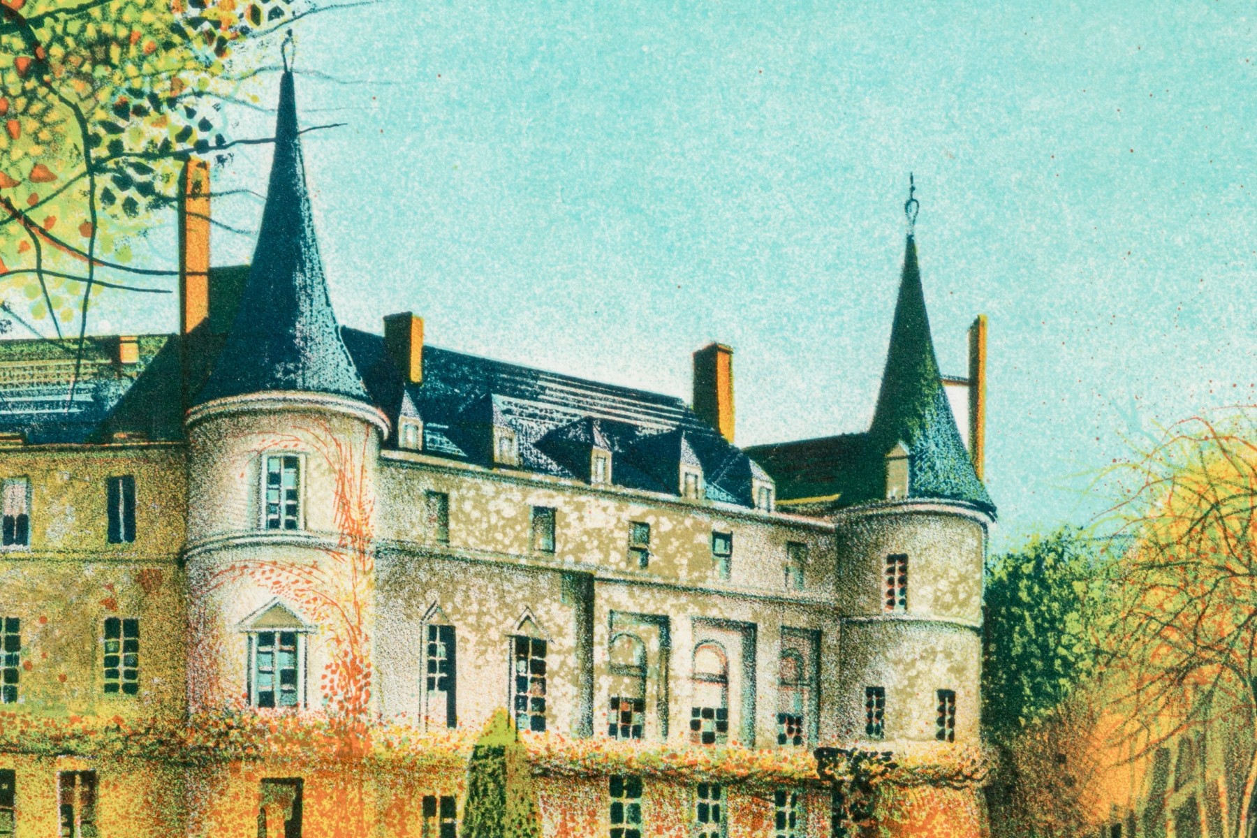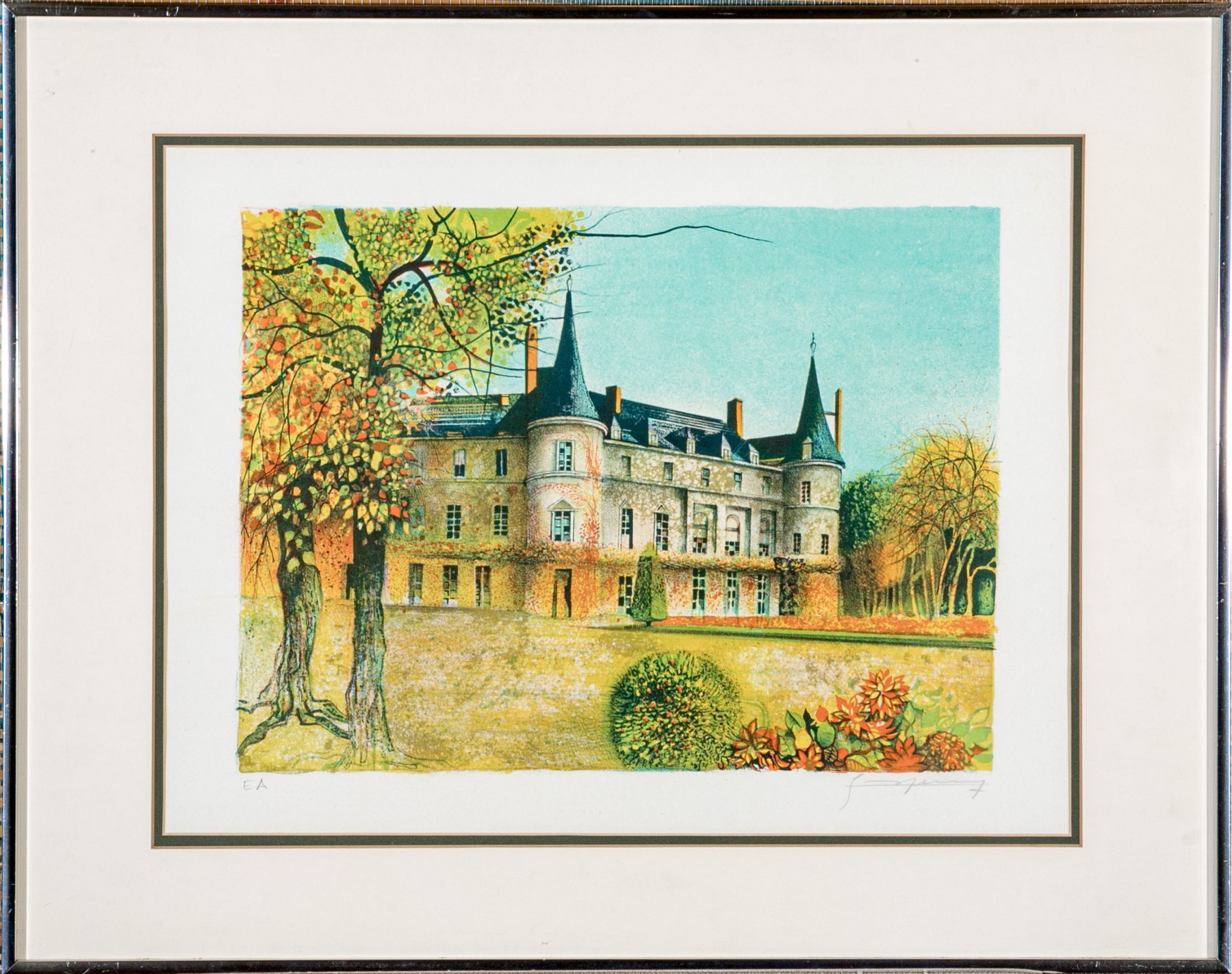 Artist proof depicting a chateau in an autumnal setting with colorful trees and a vivid blue sky.