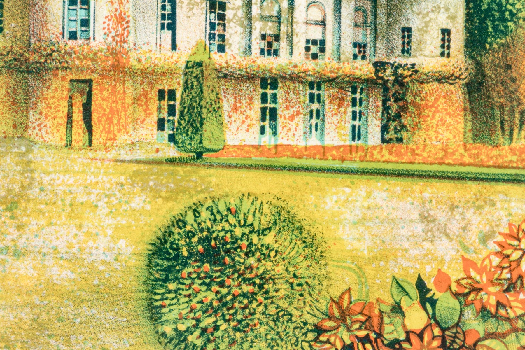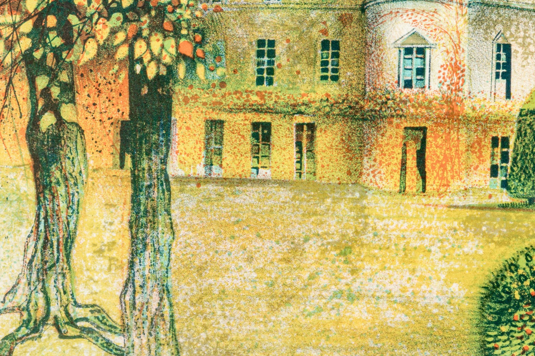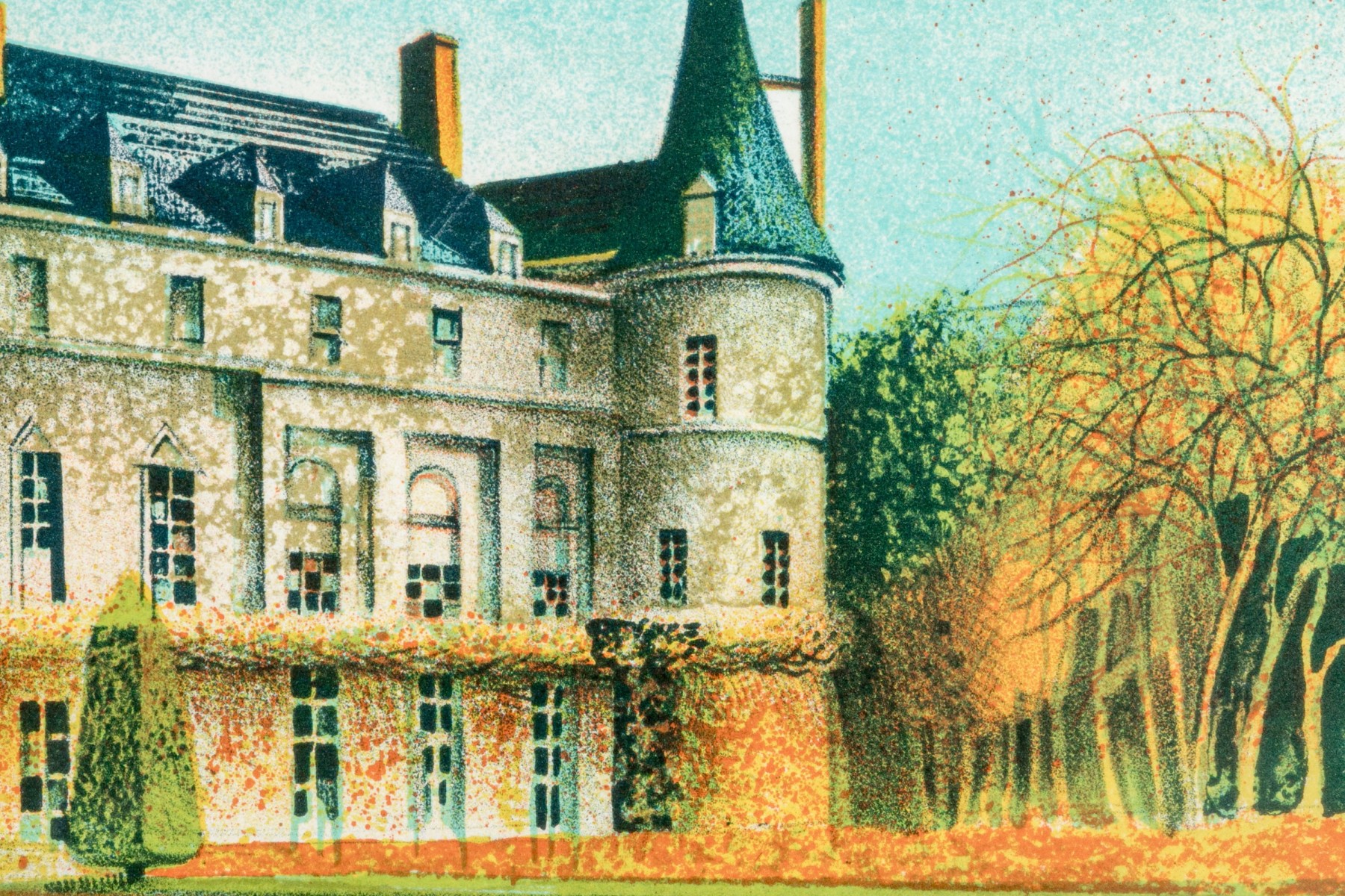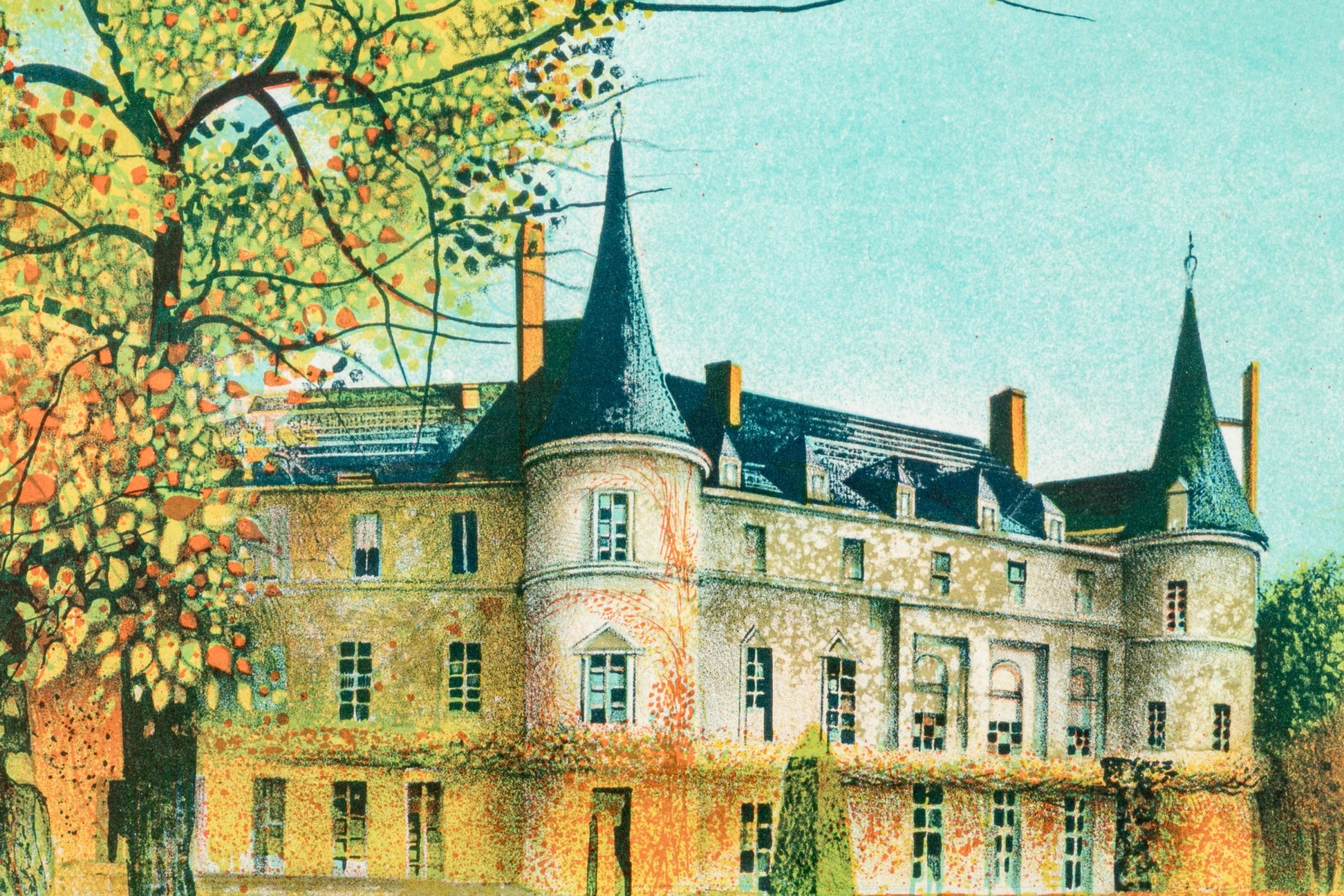 Artist proof depicting a chateau in an autumnal setting with colorful trees and a vivid blue sky.