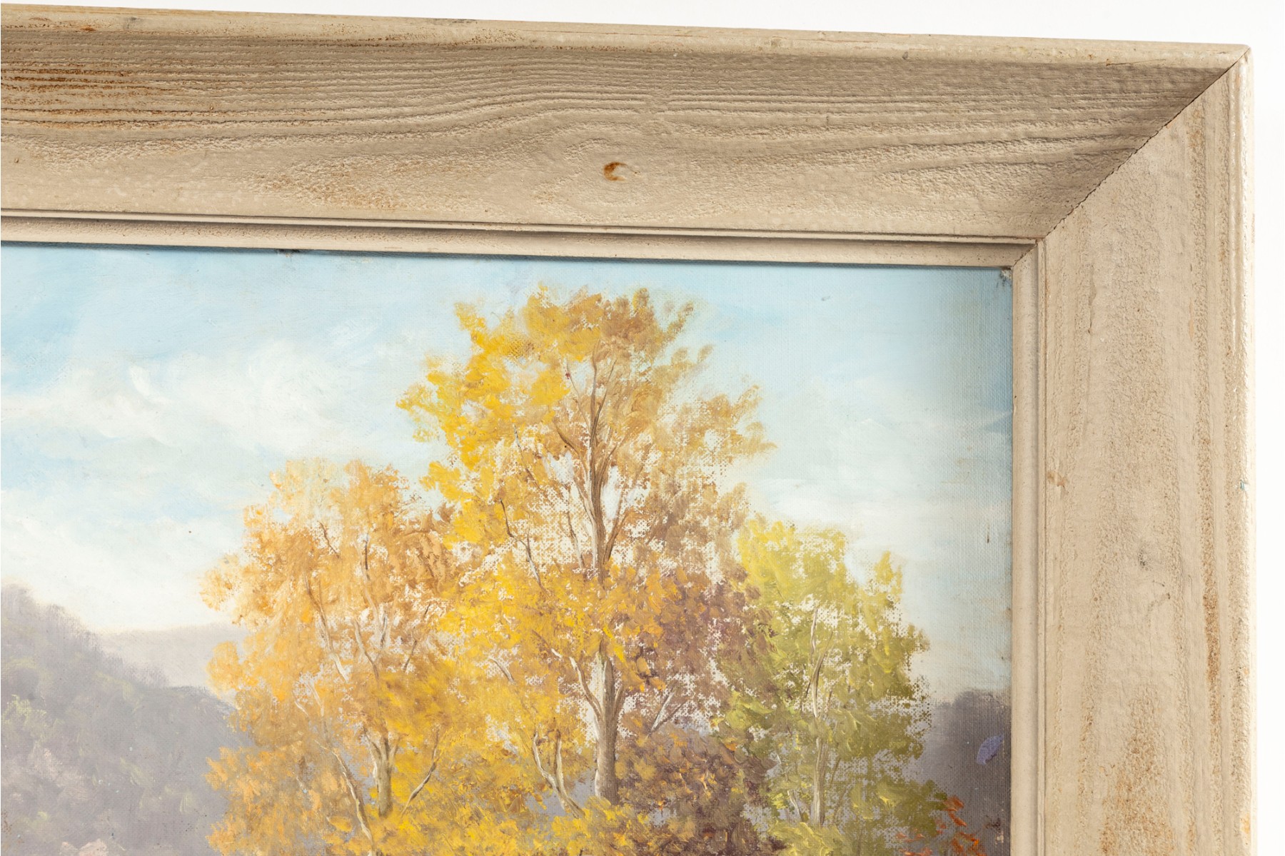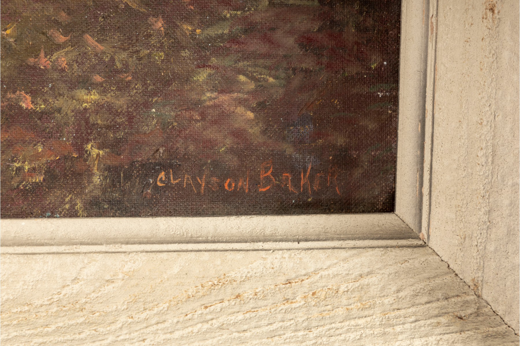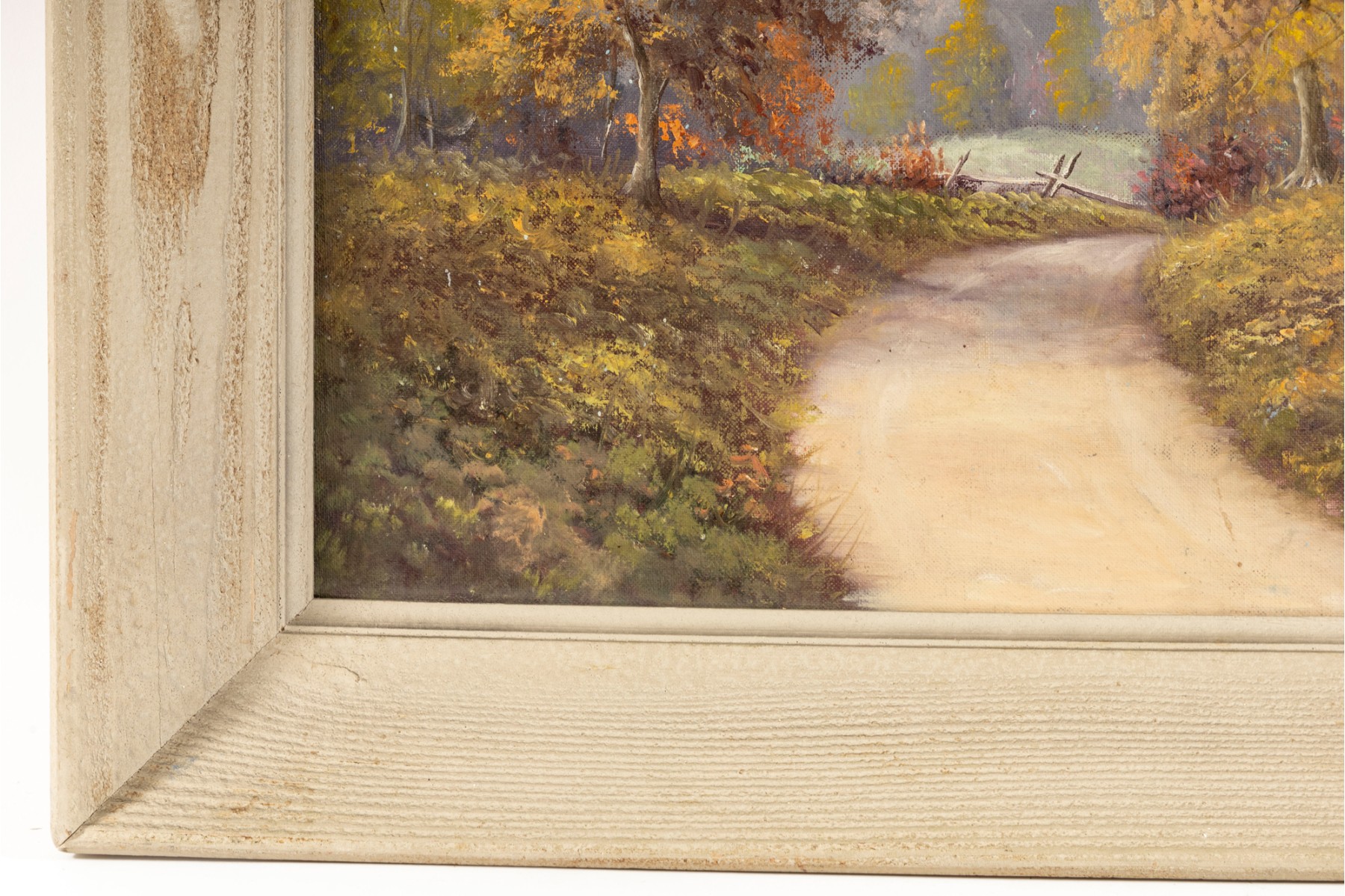 Clayson Baker (1908 - 1975). Oil medium on canvas -- Autumn landscape depicting a valley trail. The artwork is presented openly within a distressed wood frame, ready to hang.
