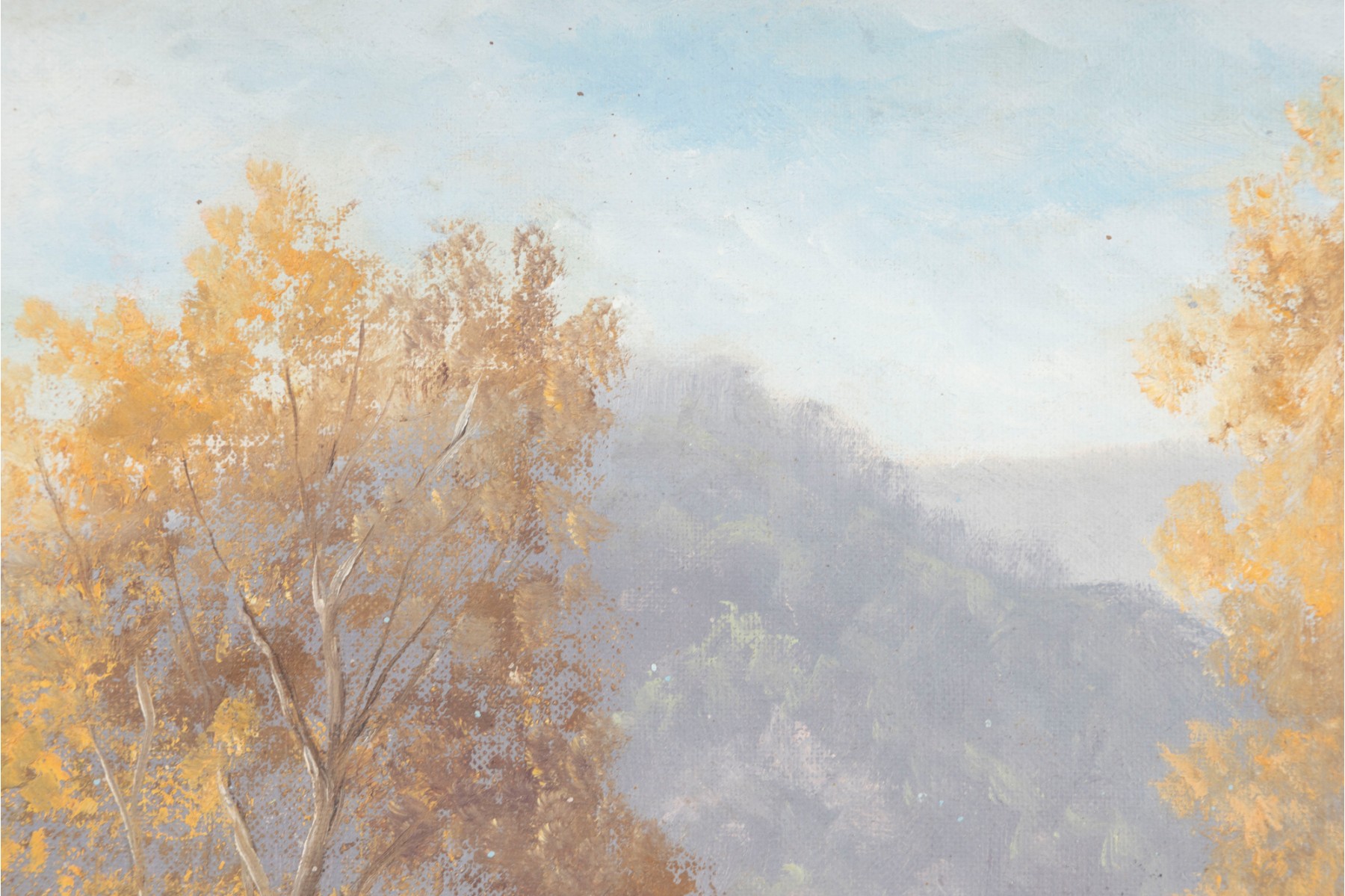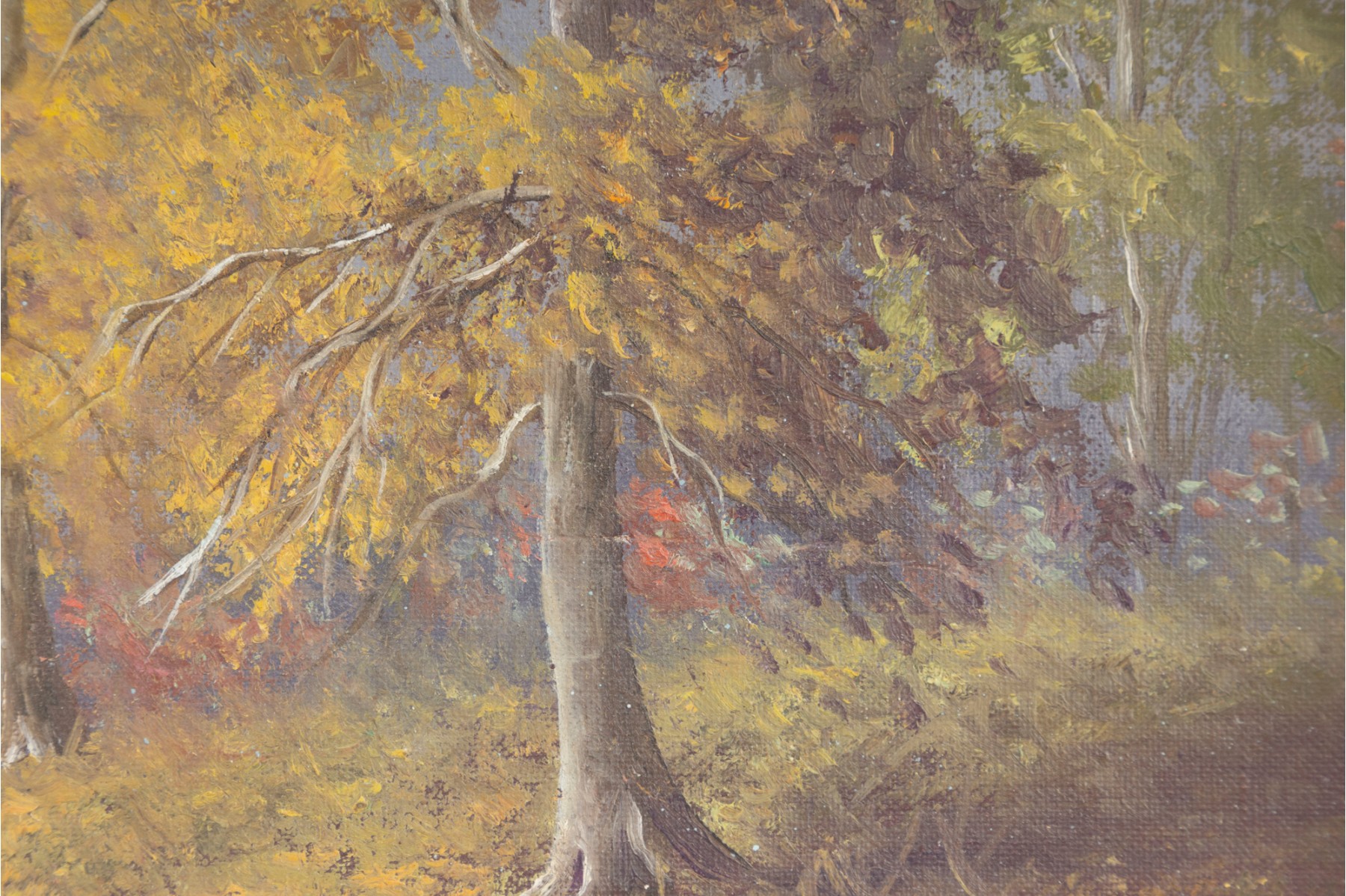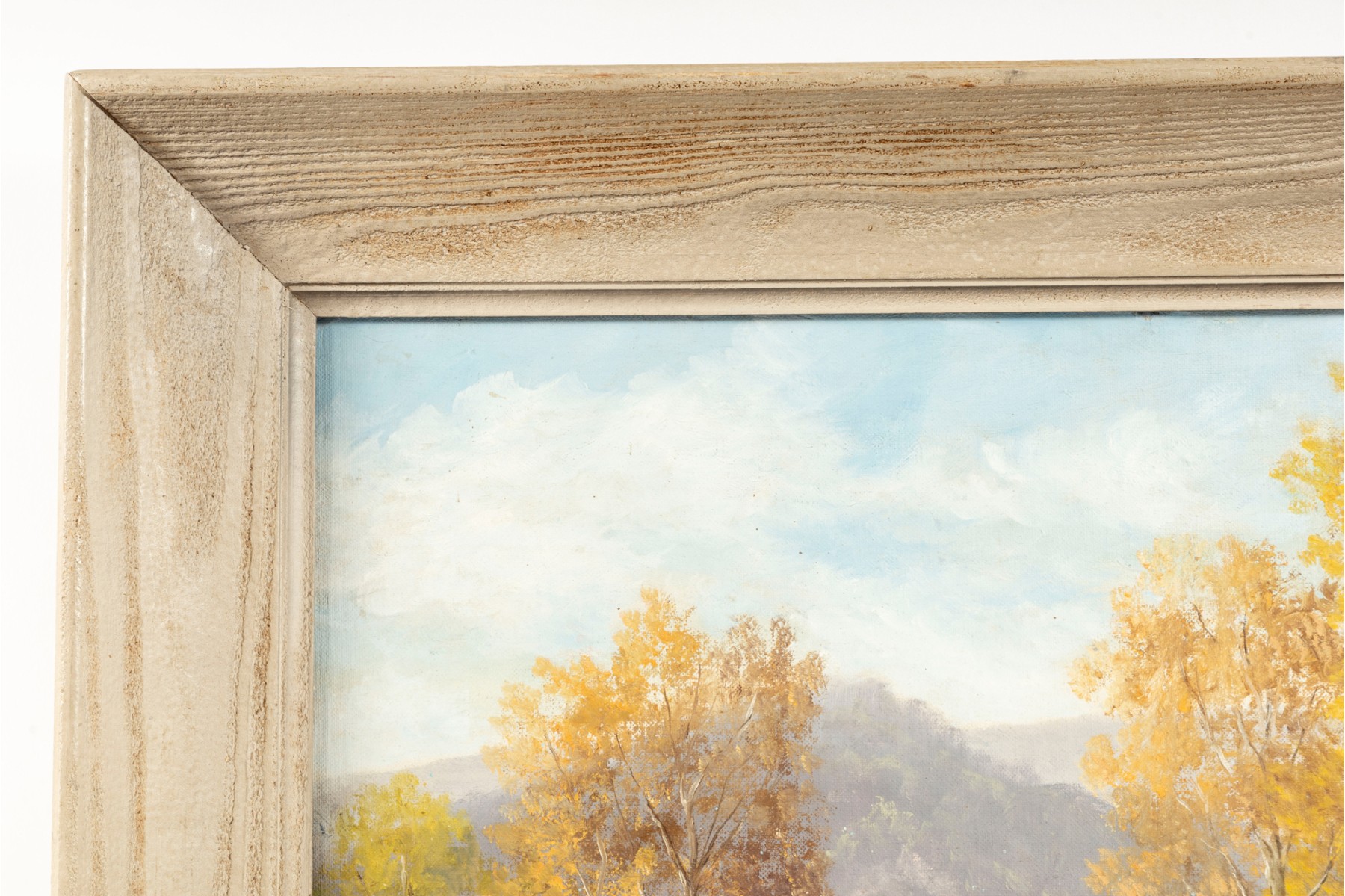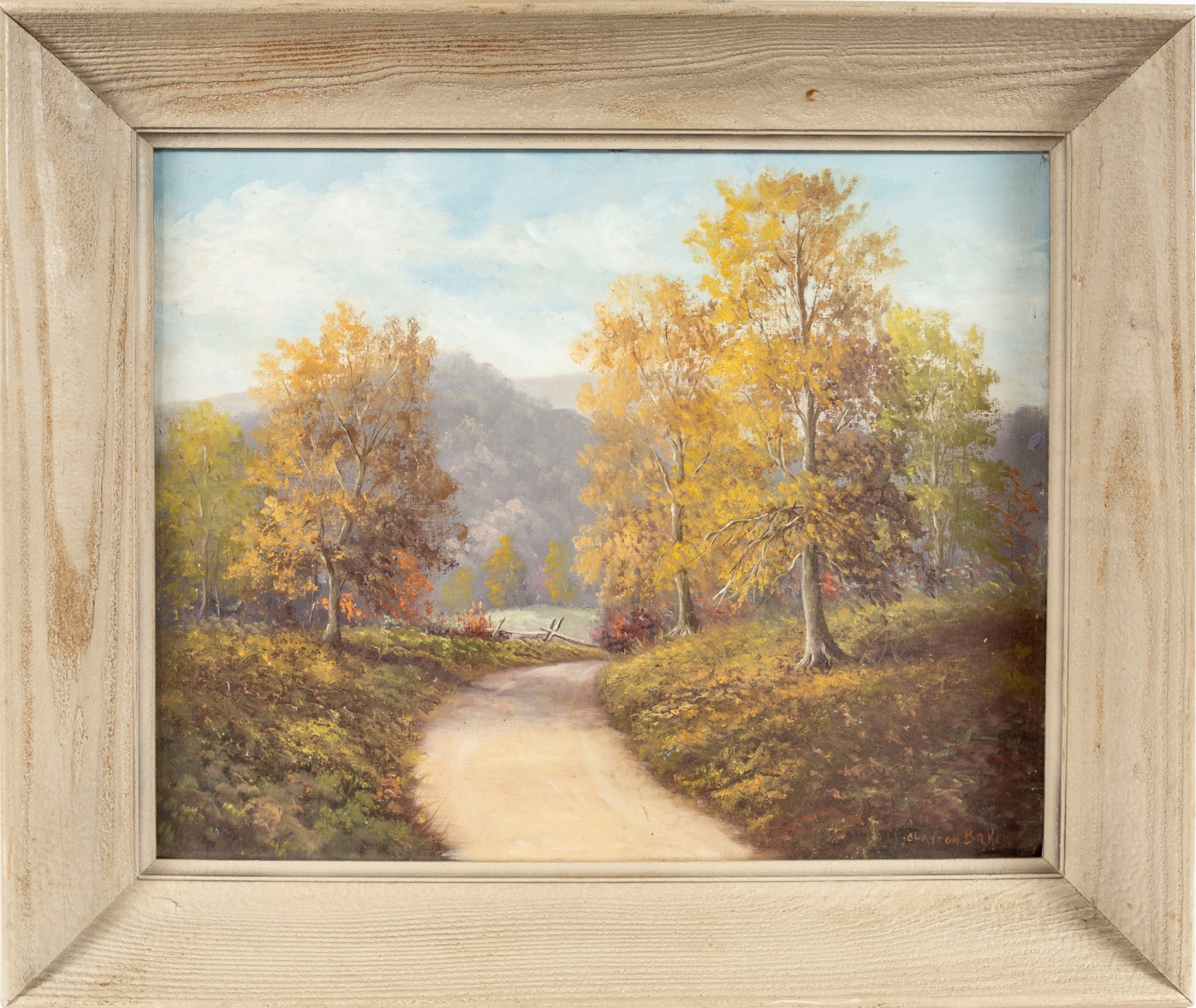 Clayson Baker (1908 - 1975). Oil medium on canvas -- Autumn landscape depicting a valley trail. The artwork is presented openly within a distressed wood frame, ready to hang.
