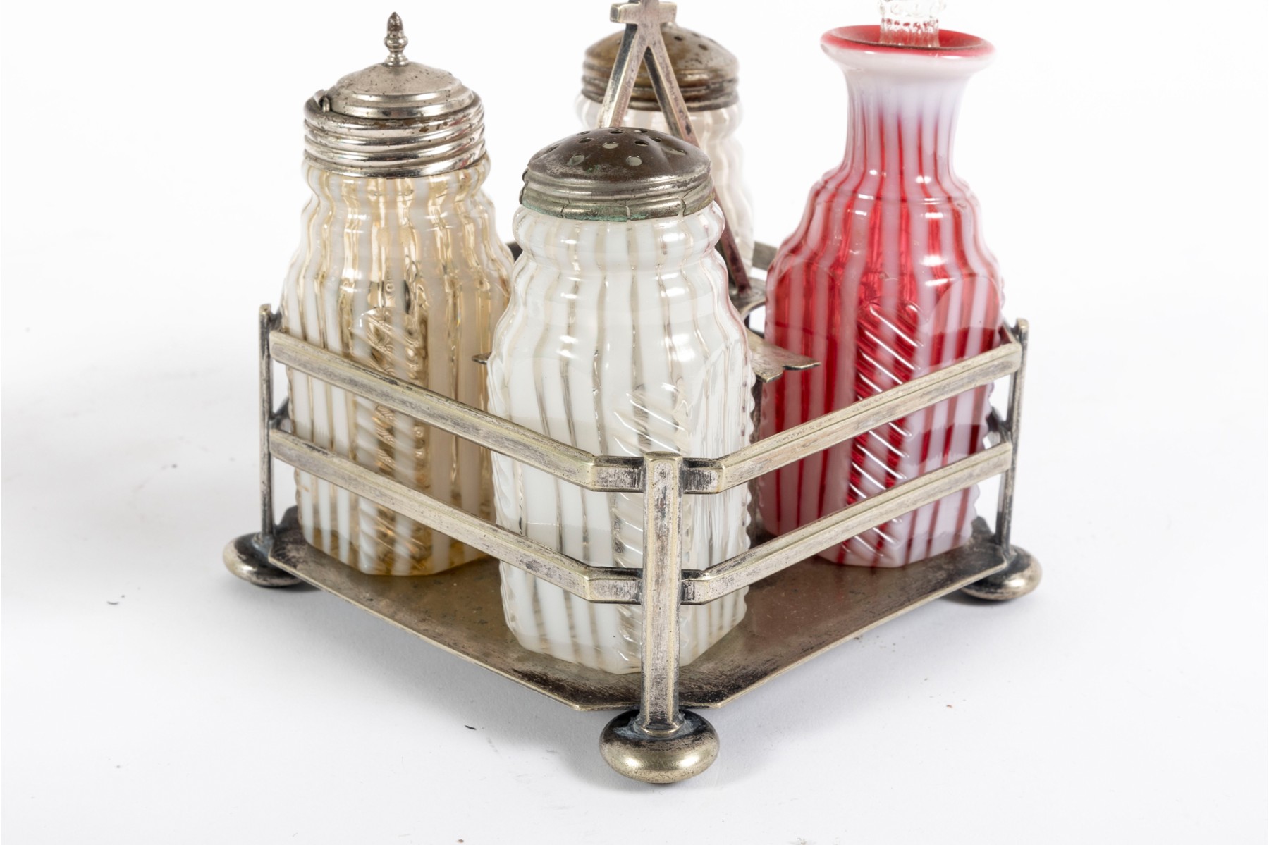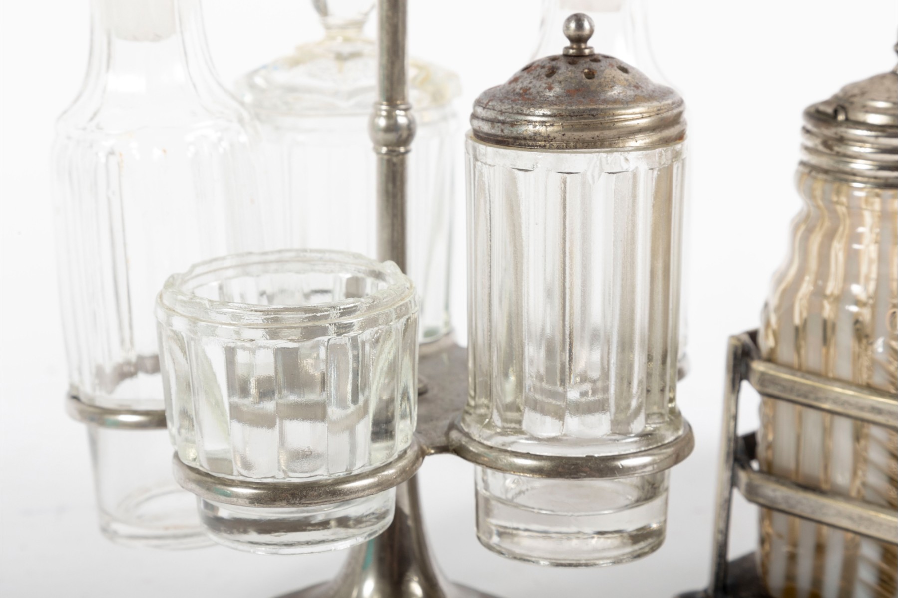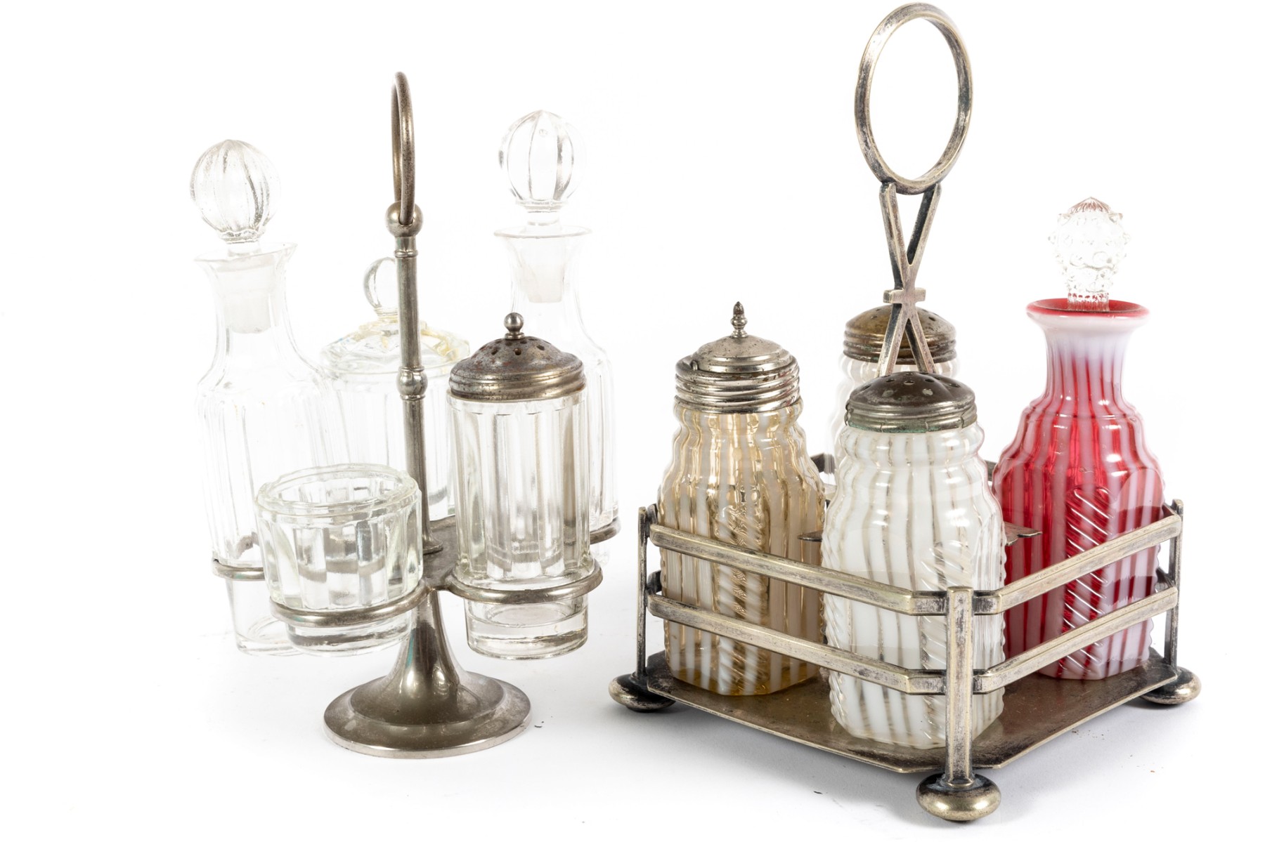 A lovely duo of depression glass cruet sets on silver plated stands including bottles in clear, white, and red striped glass.