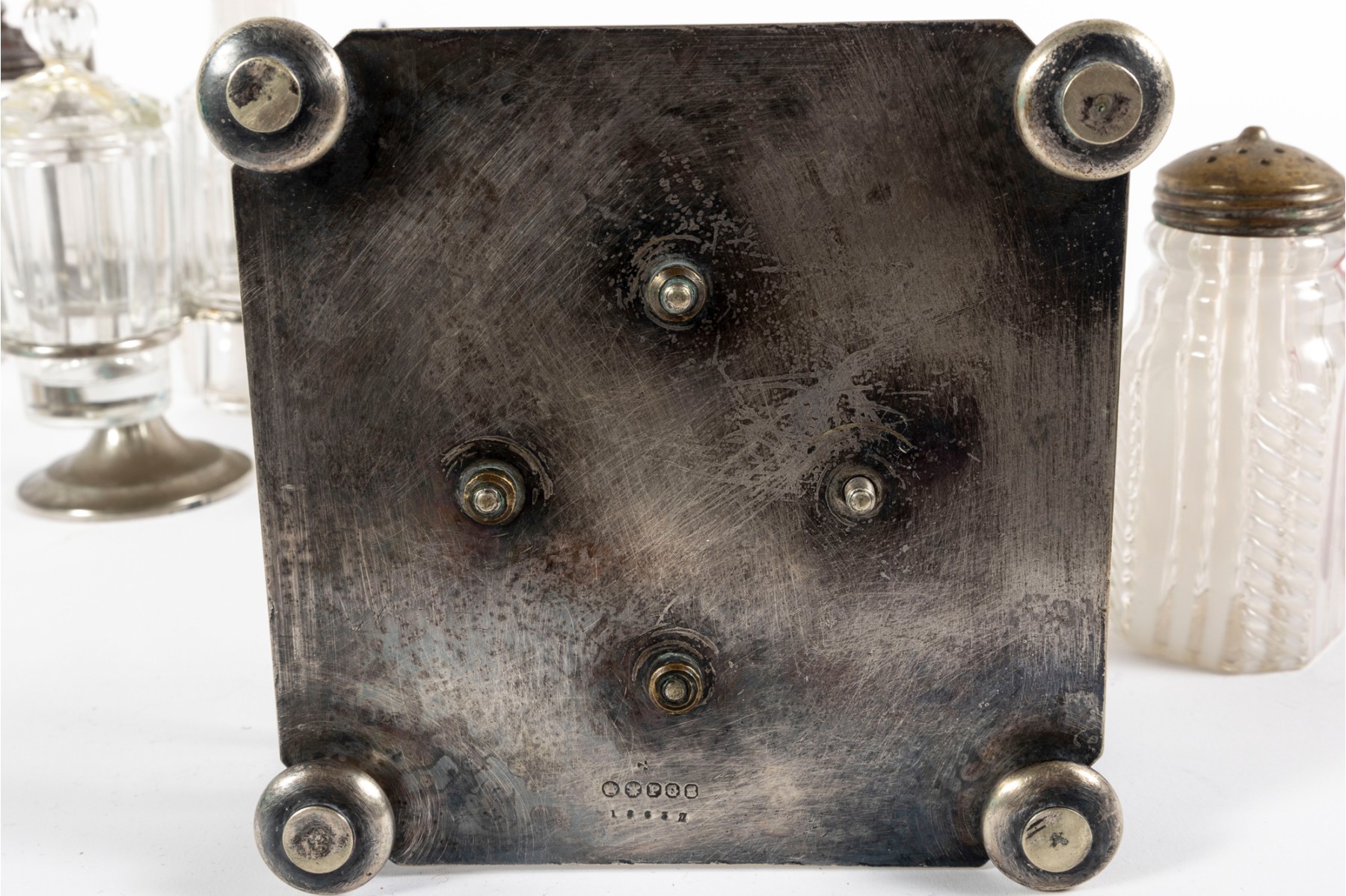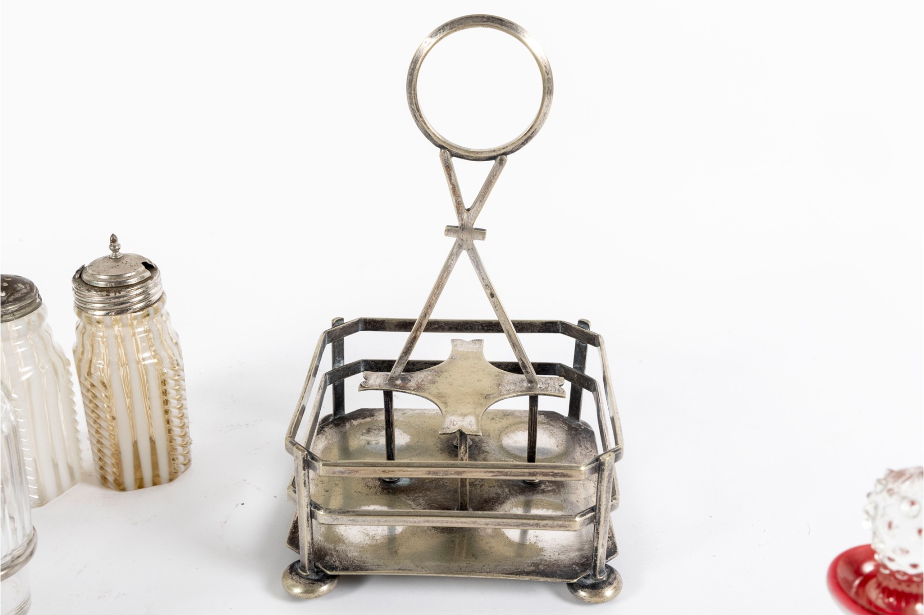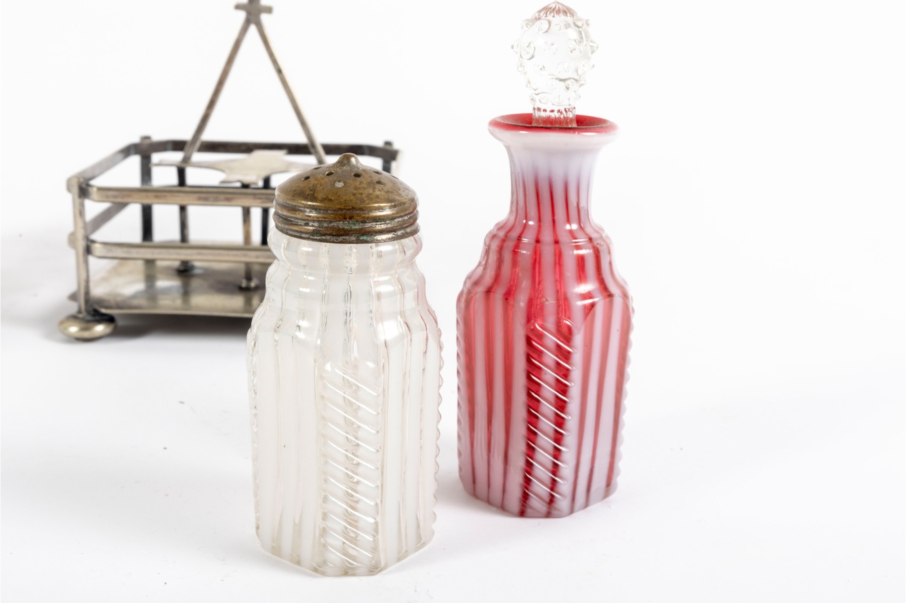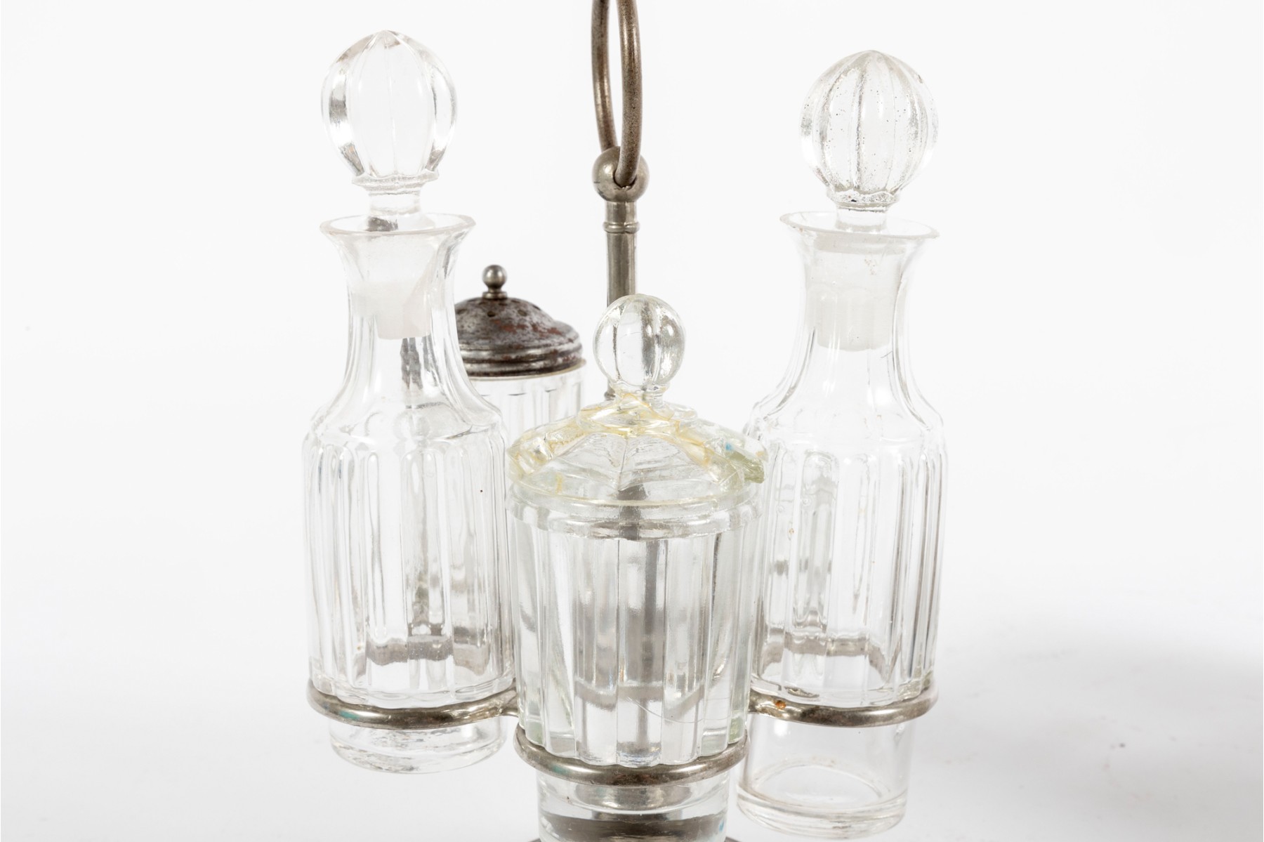 A lovely duo of depression glass cruet sets on silver plated stands including bottles in clear, white, and red striped glass.