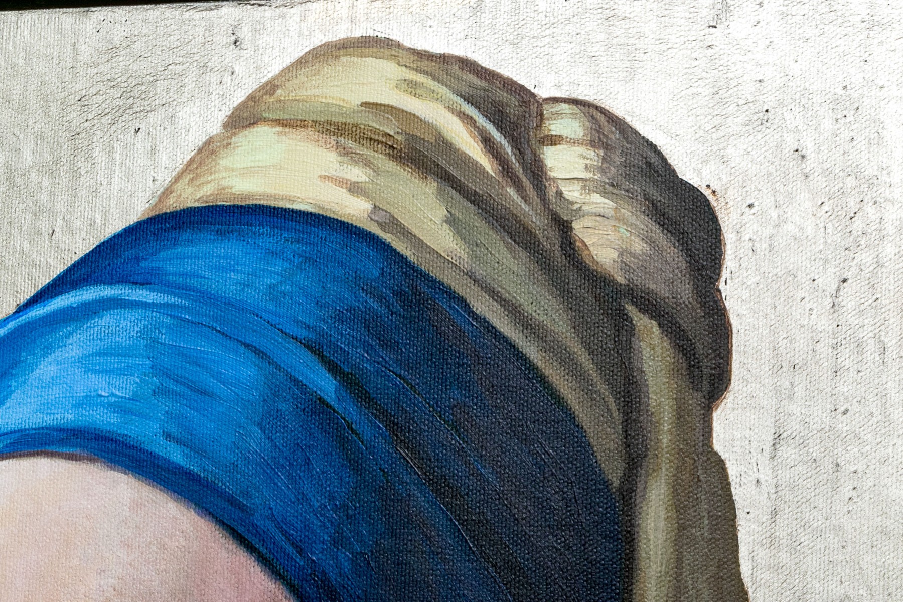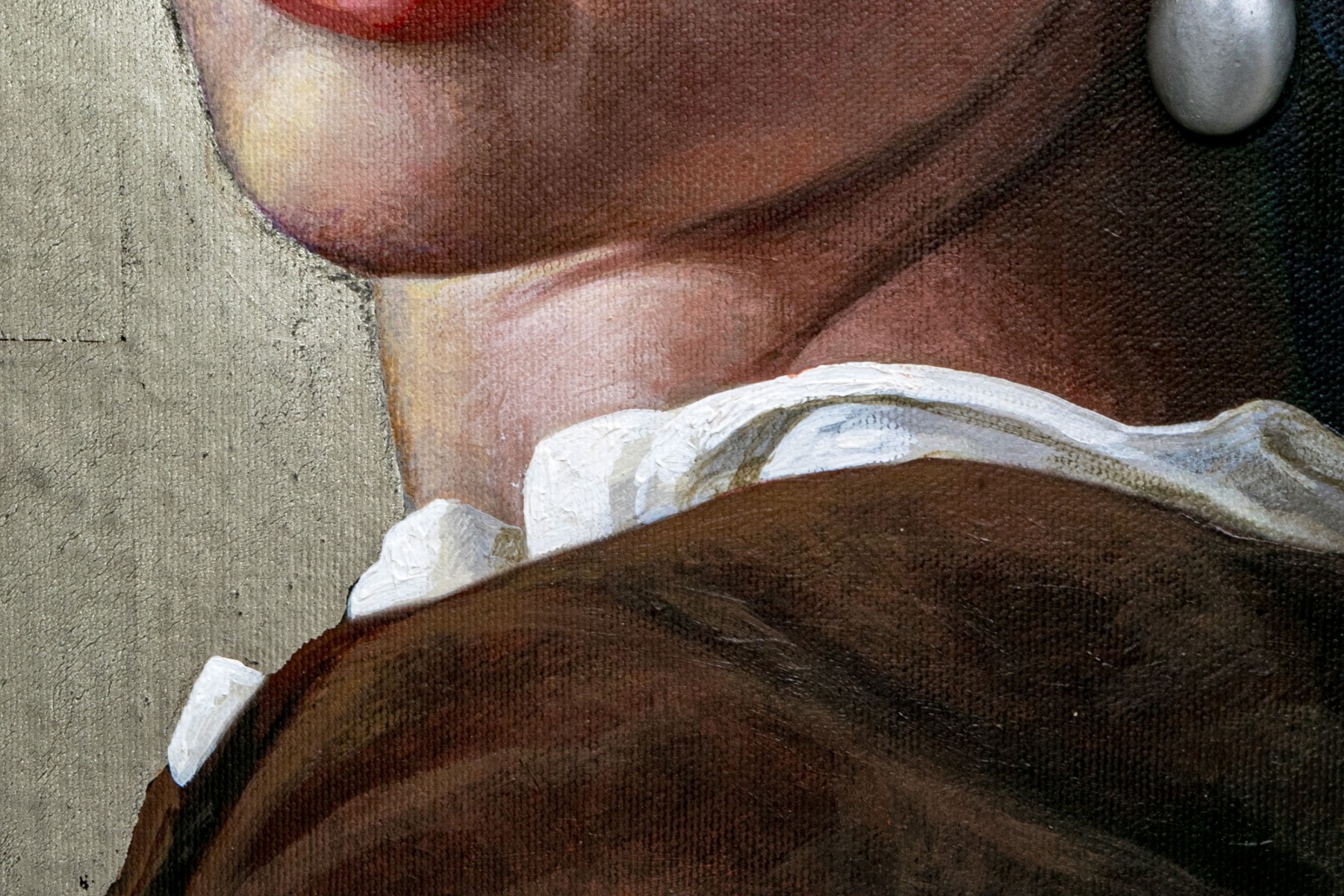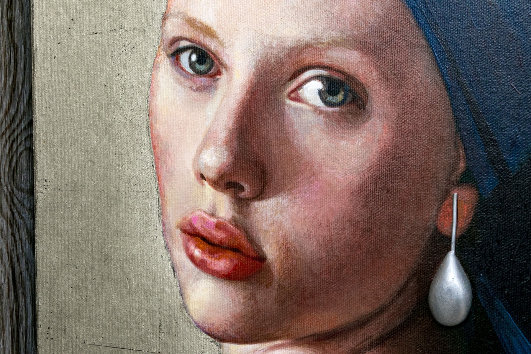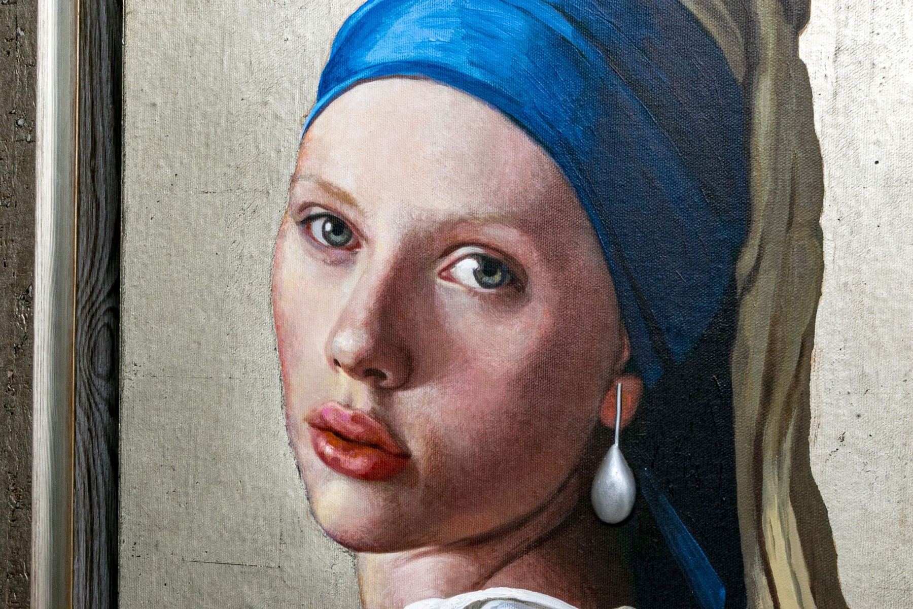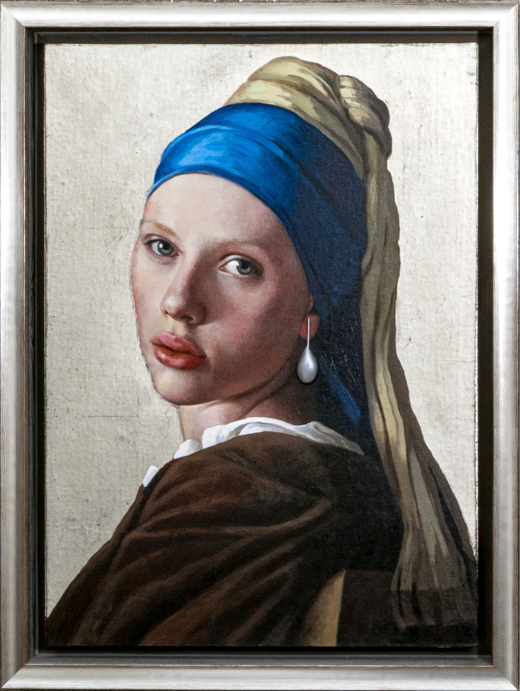 Clement Kamena aka Serge Clement and Marina Kamena (French, 20th C.) mixed media on panel painting after Johanes Vermeer's "Girl with a Pearl", the current work is a contemporary take on the work using the actress Scarlett Johansson as their model. The painting is painted in a hyper realist manner incorporating textural three dimensional aspects including the heavily impastoed pearl to the otherwise flat two dimensional work, lending depth and wonder.
