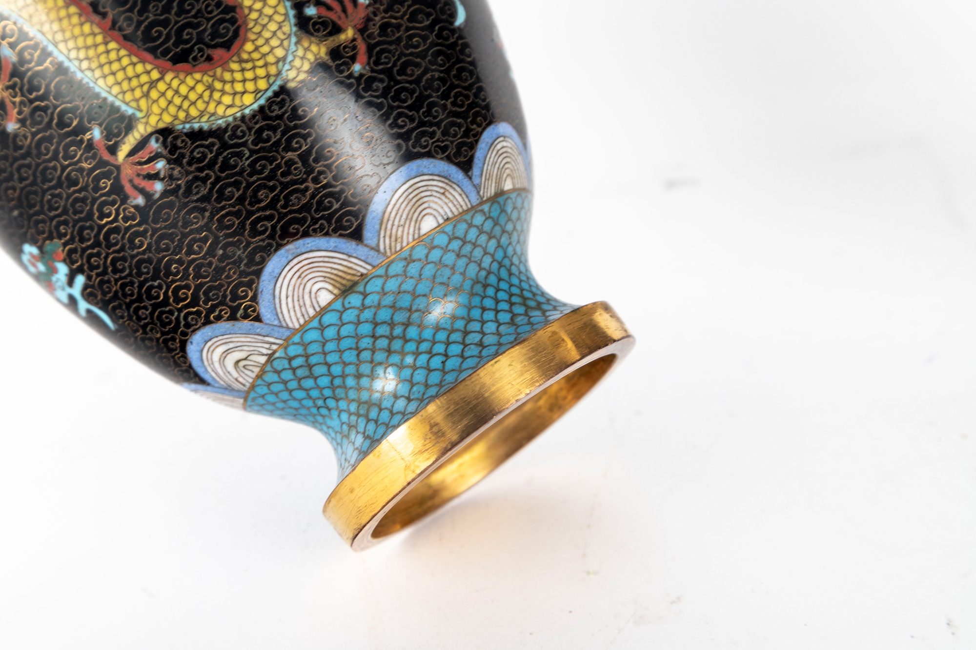 Striking vintage Chinese cloisonné vases crafted from brass, featuring a bold design with a black enamel base, blue trim accents, and vivid yellow dragons in mid-flight. The intricate cloisonné technique showcases traditional Chinese artistry, with fine wirework outlining the dragon’s form and cloud motifs.