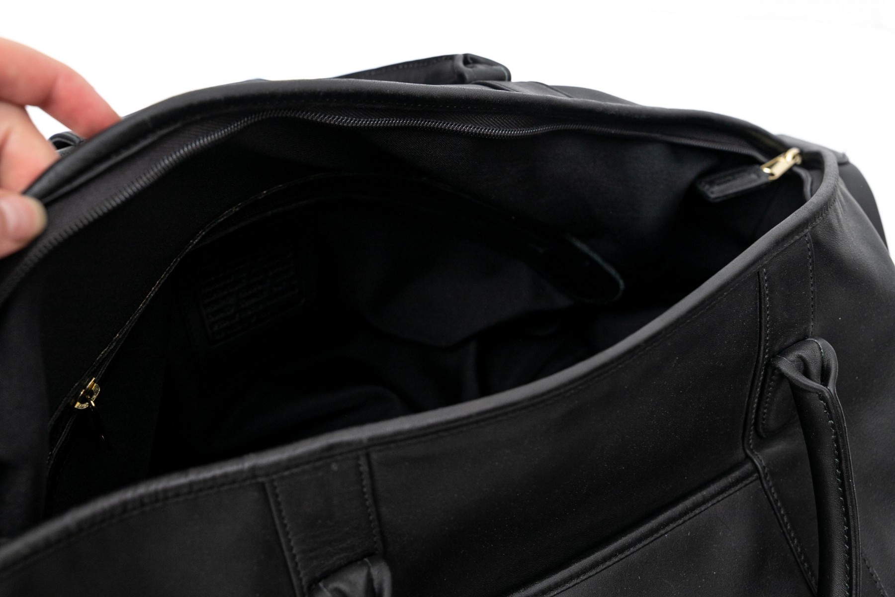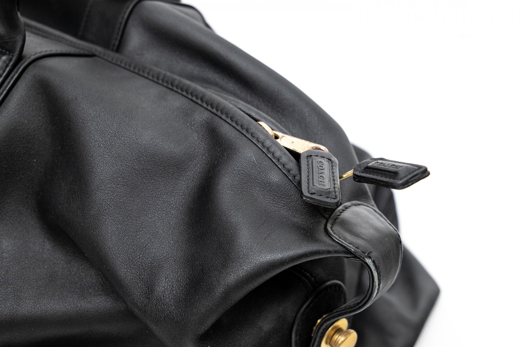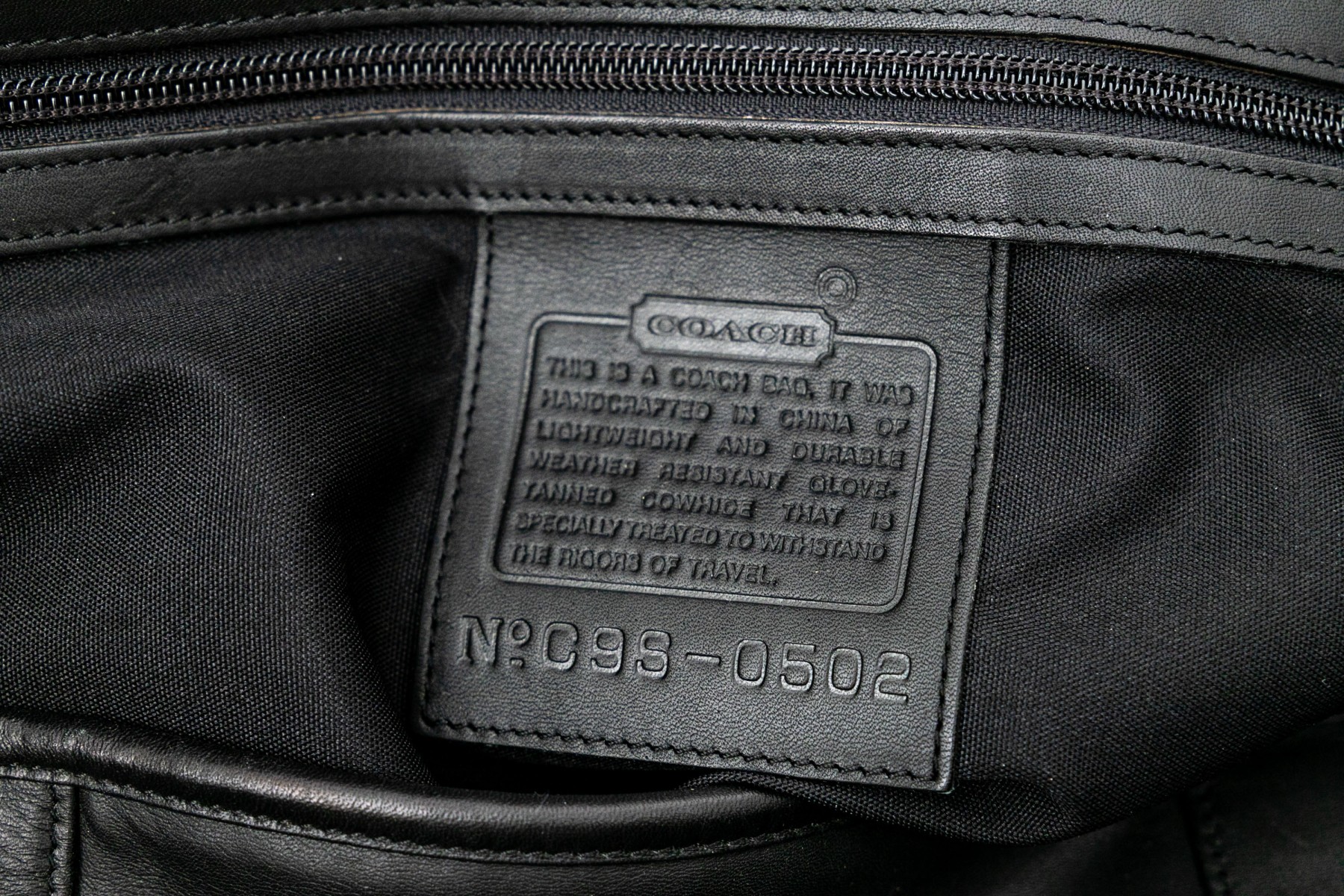 Coach 0502 black leather duffle bag with two interior zipper pockets, one exterior, working zippers, handles. Marked along interior pocket with its trademark and numbered C9S-0502.