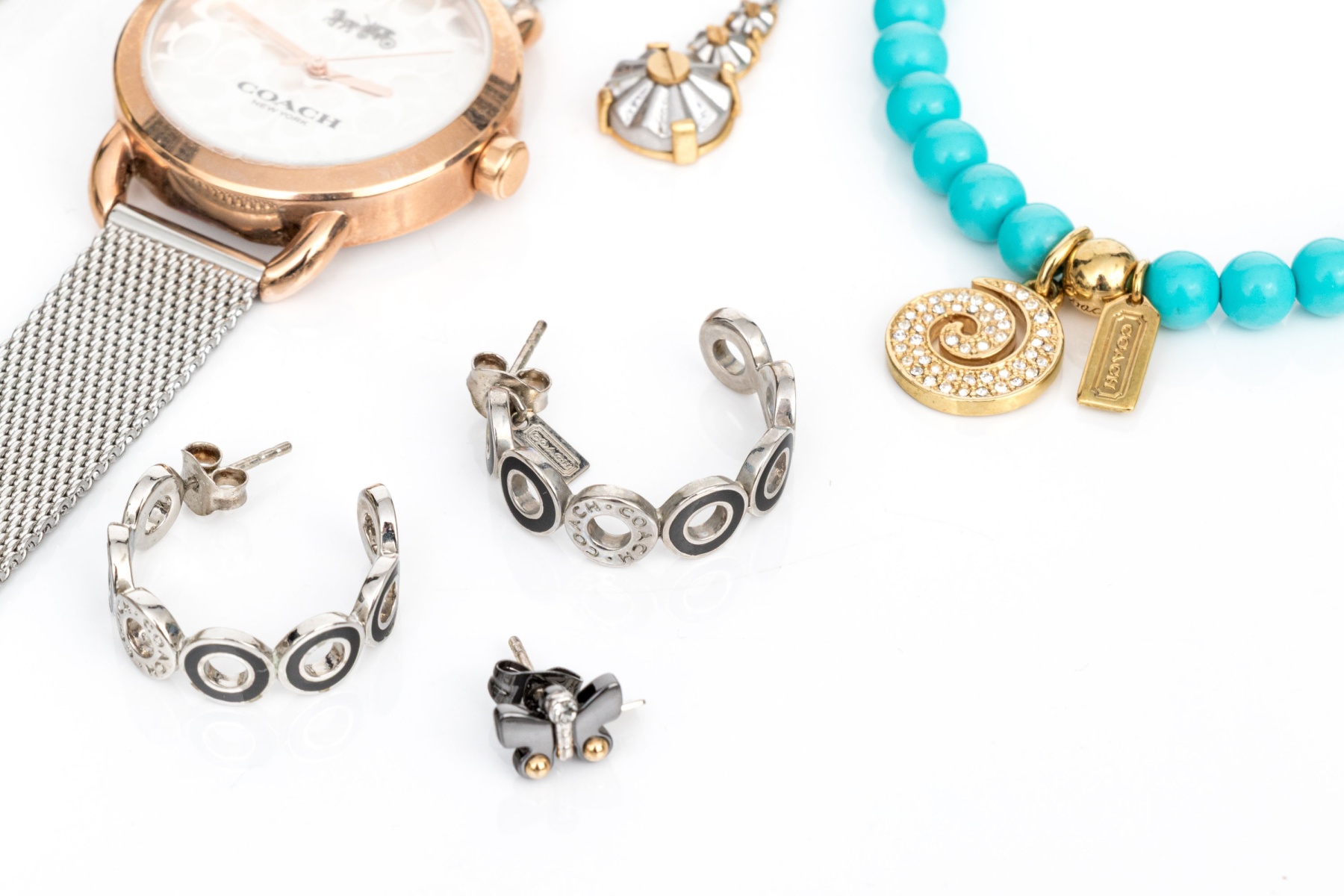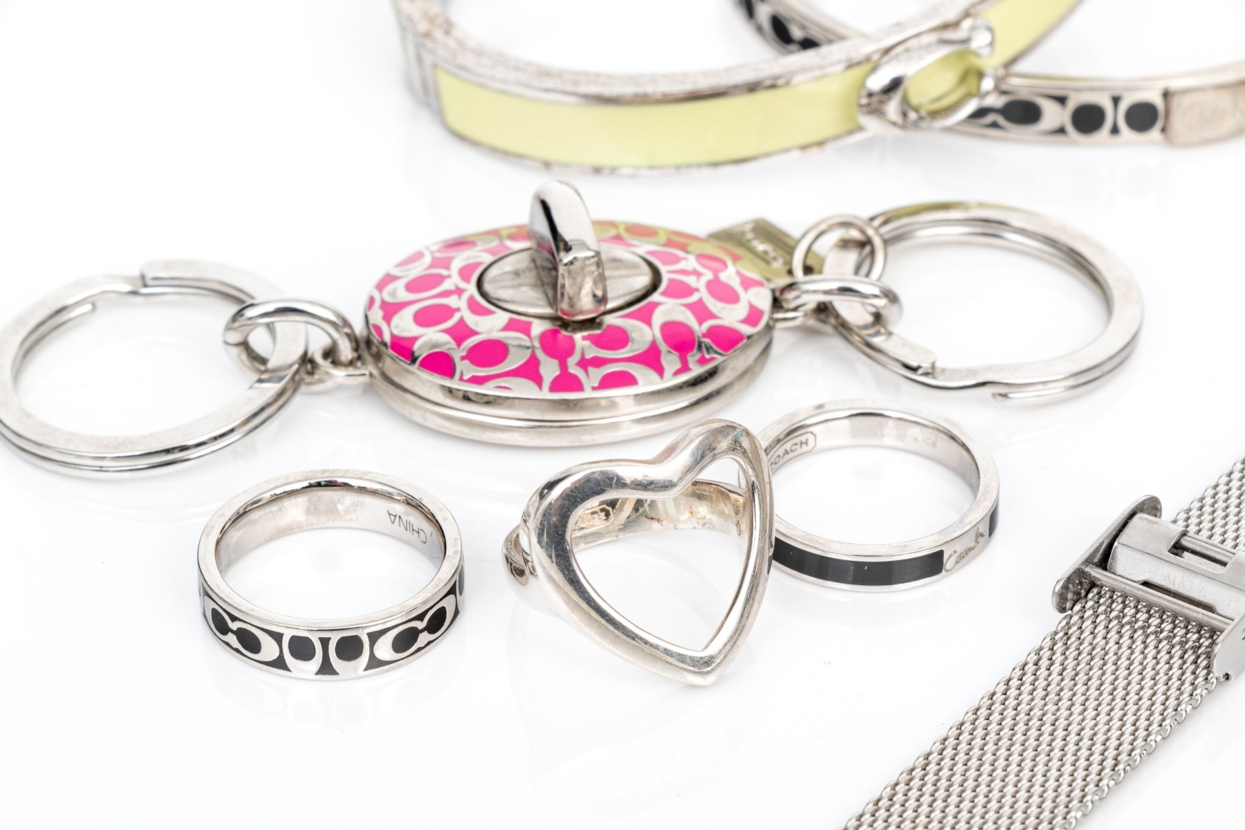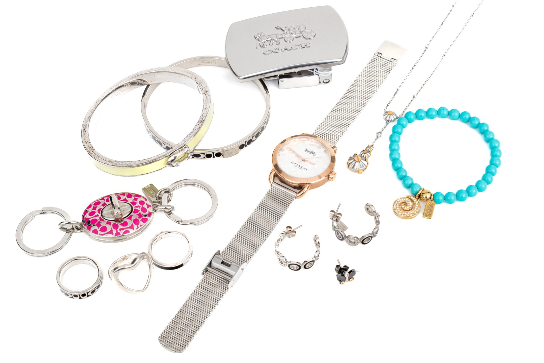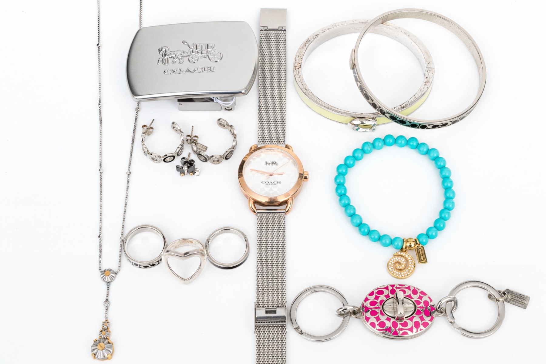 Collection of Coach fashion and jewelry pieces, including a belt buckle (unworn, boxed), key ring, two bangle bracelets, one beaded bracelet, one pair of hoop earrings, one half pair butterfly stud earrings, one watch, one "y" necklace, two enamel stacking rings, sizes 7 and 6.75, and a sterling silver heart ring, size 6.25