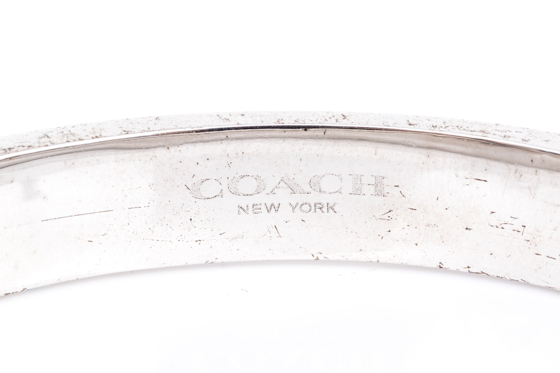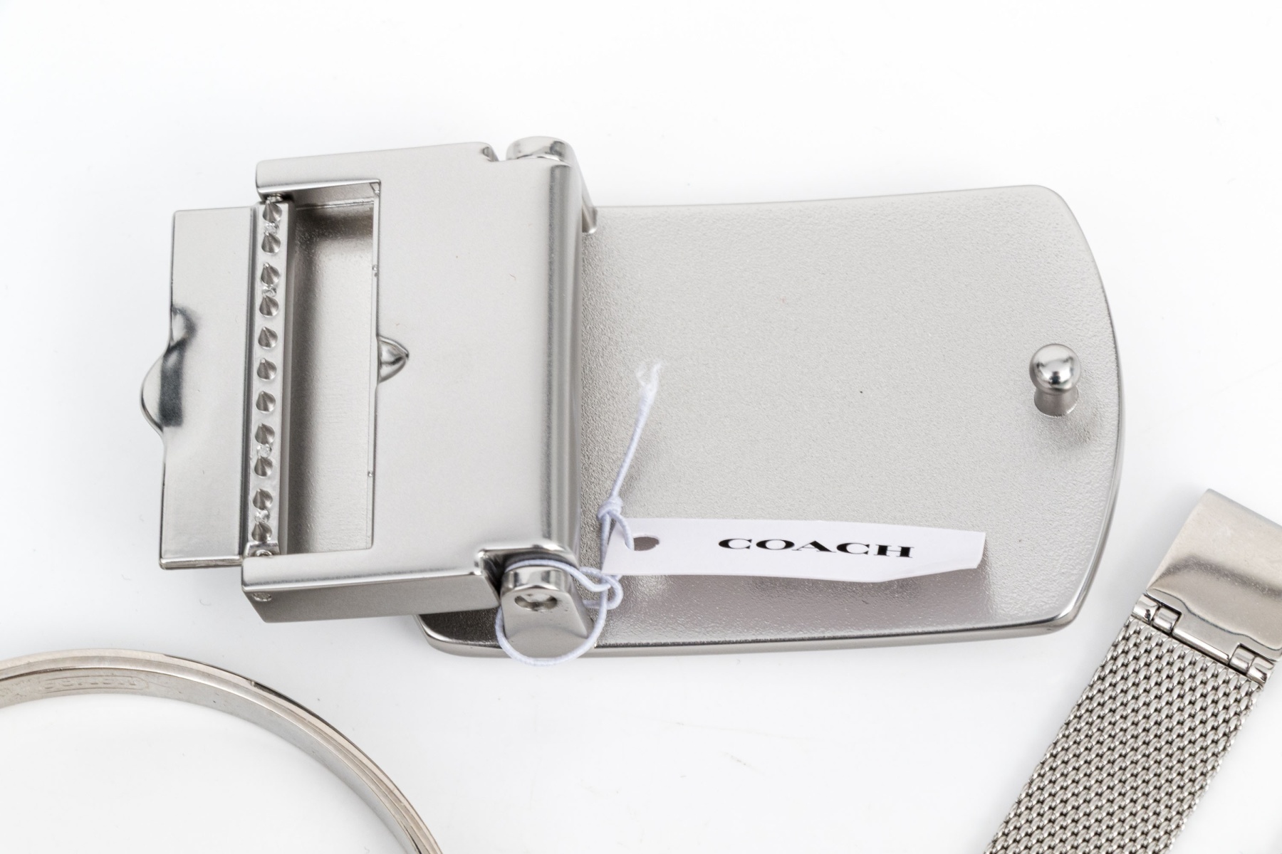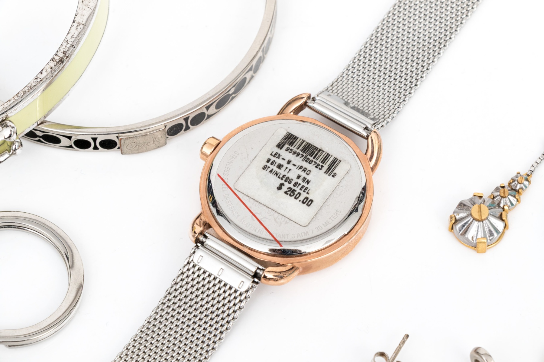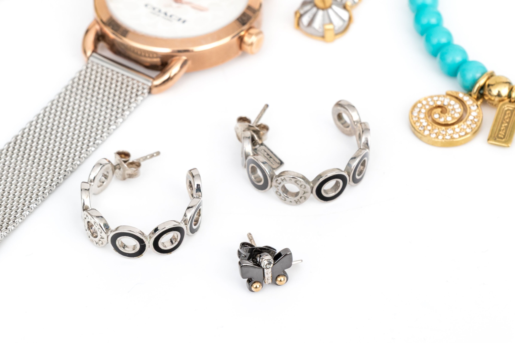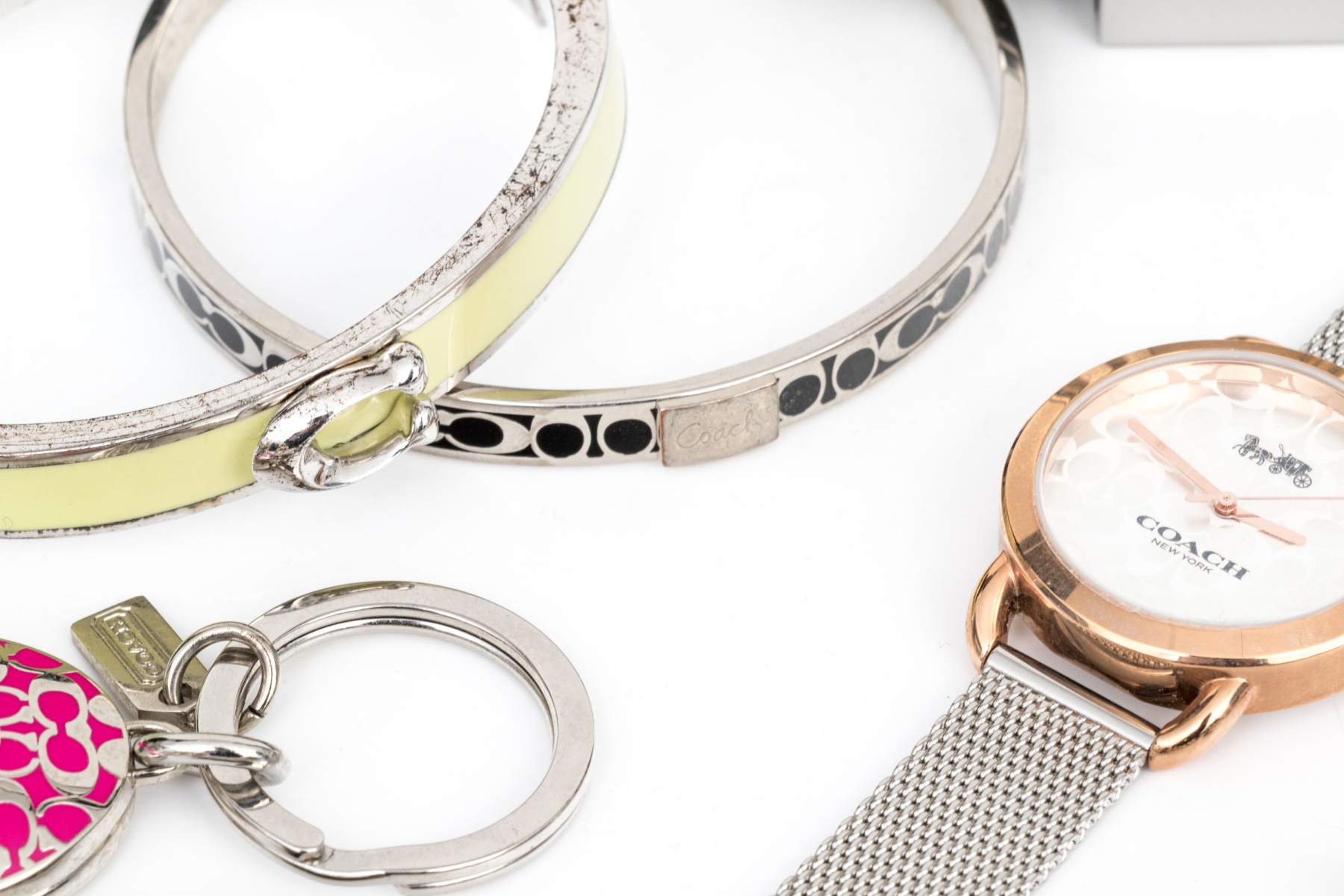 Collection of Coach fashion and jewelry pieces, including a belt buckle (unworn, boxed), key ring, two bangle bracelets, one beaded bracelet, one pair of hoop earrings, one half pair butterfly stud earrings, one watch, one "y" necklace, two enamel stacking rings, sizes 7 and 6.75, and a sterling silver heart ring, size 6.25