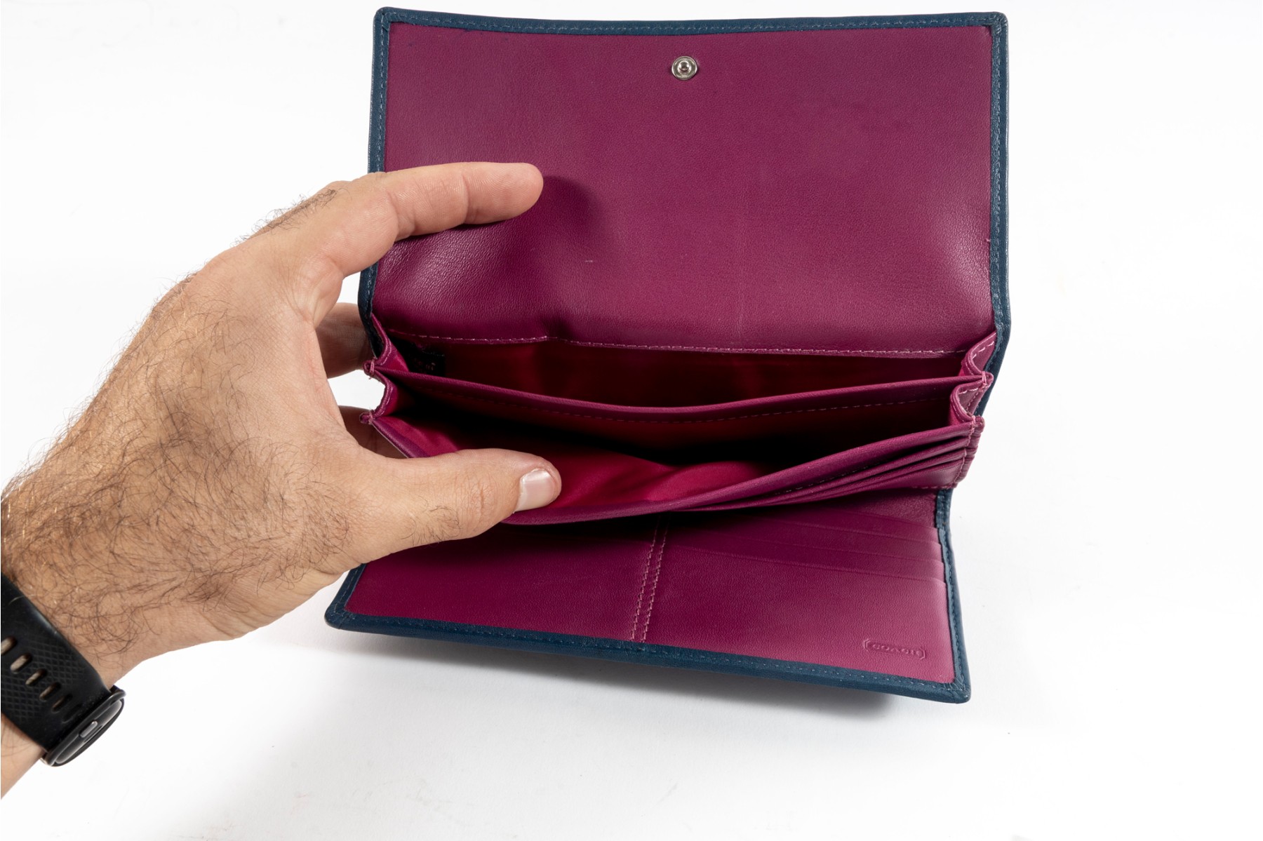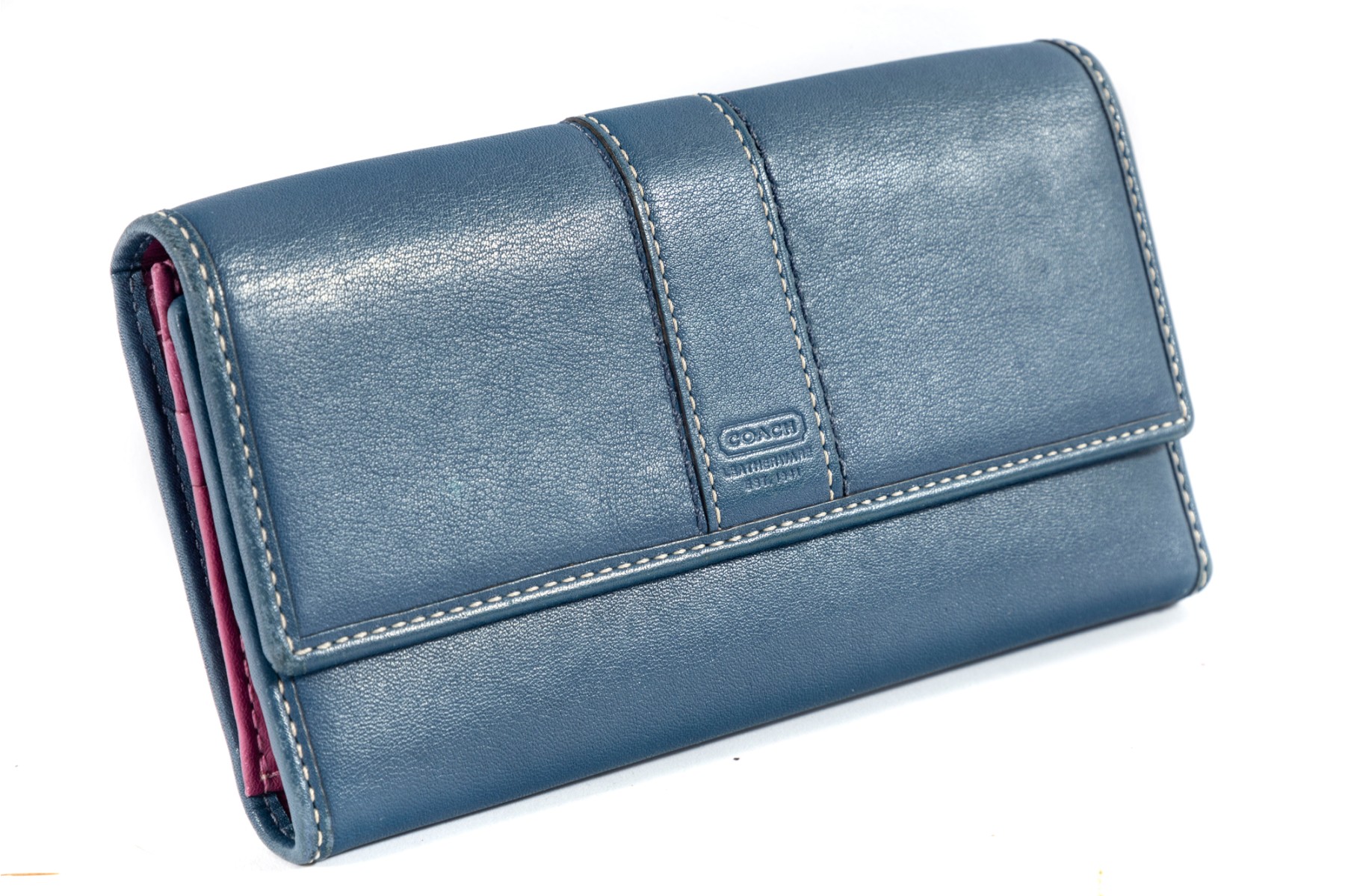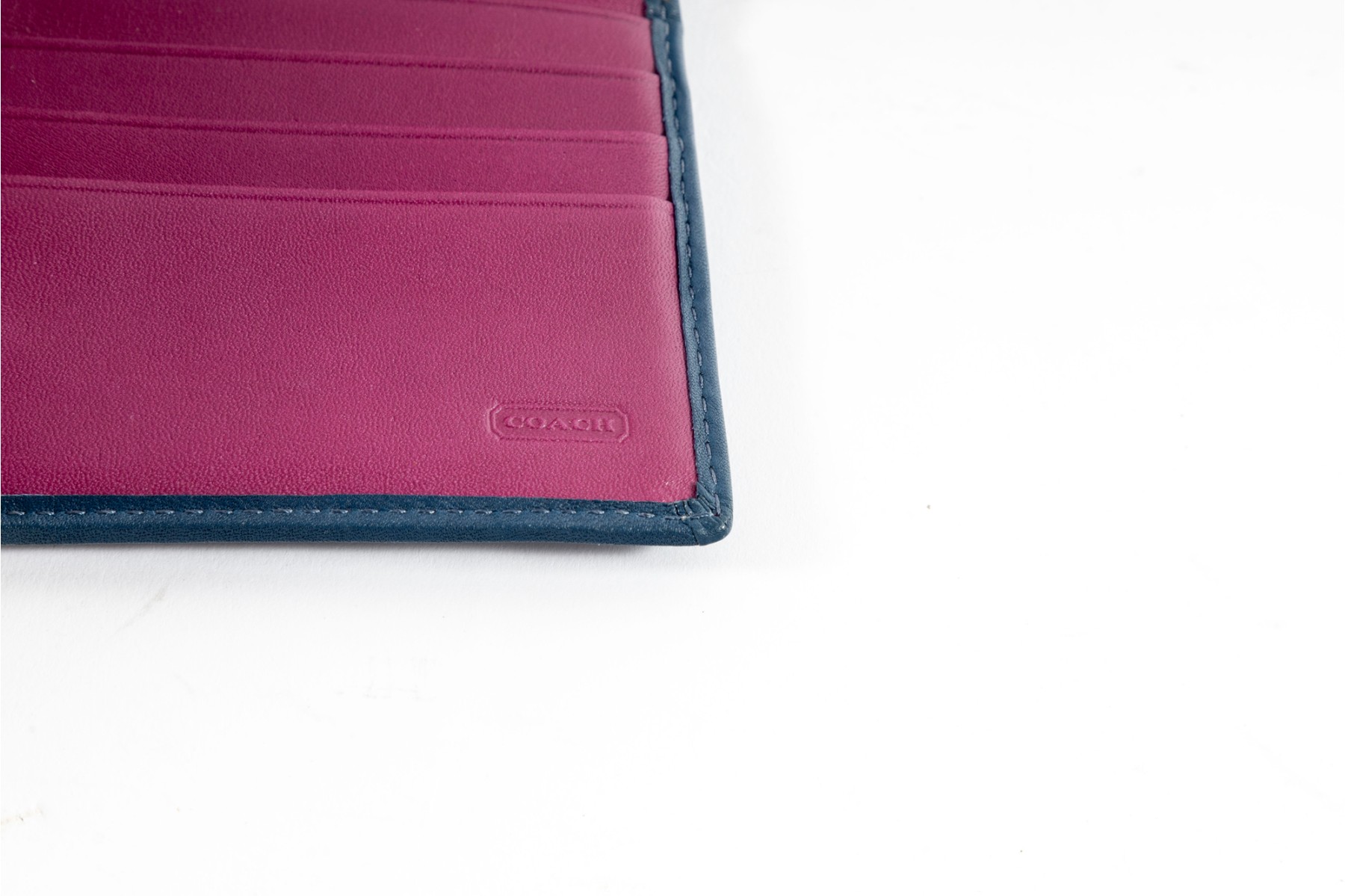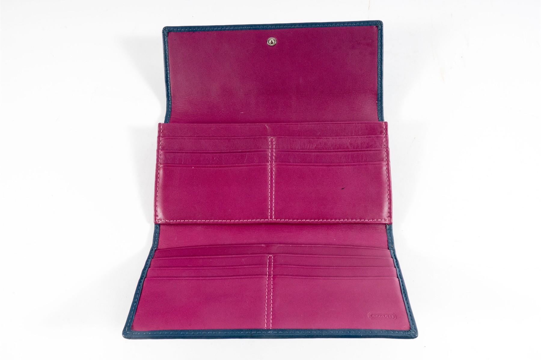 The perfect companion for the business savant, this blue leather stitched tri-fold wallet from coach showcases a contrasting fuchsia-colored interior lined with multiple pockets and card holders.