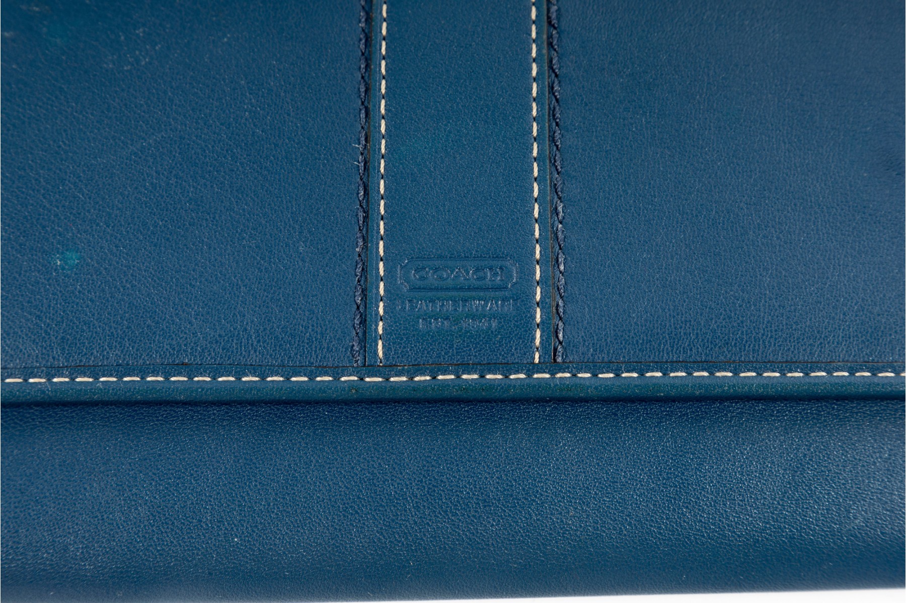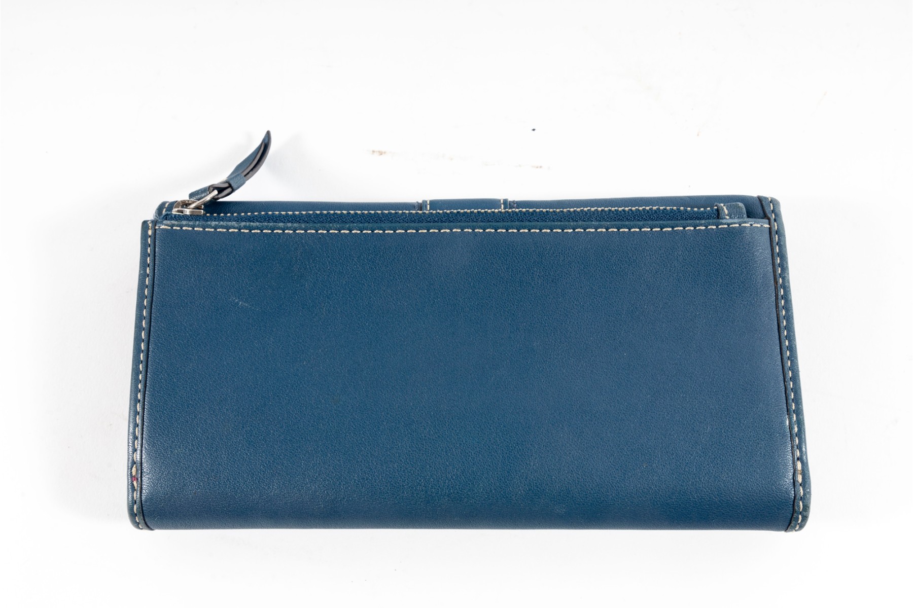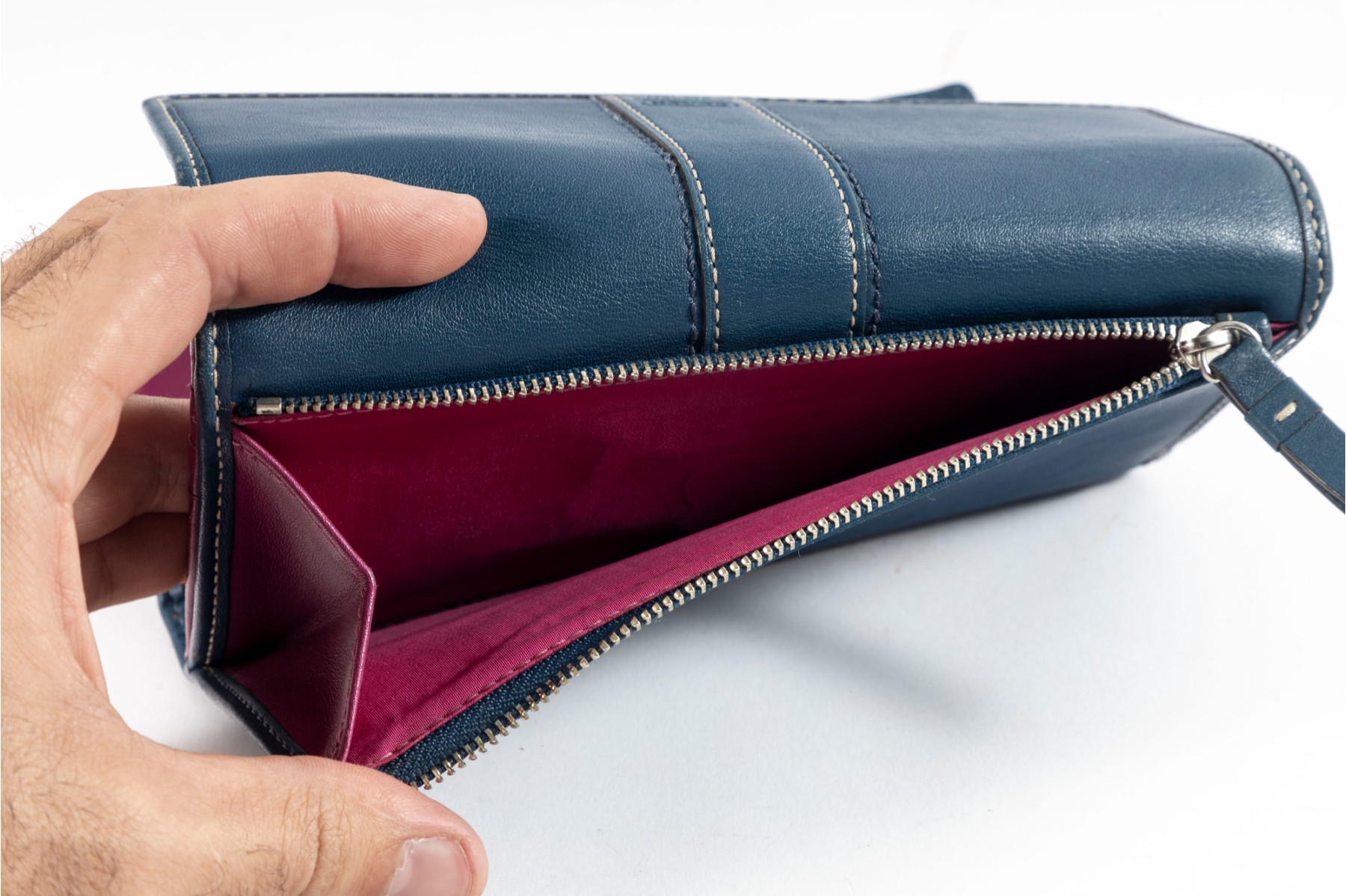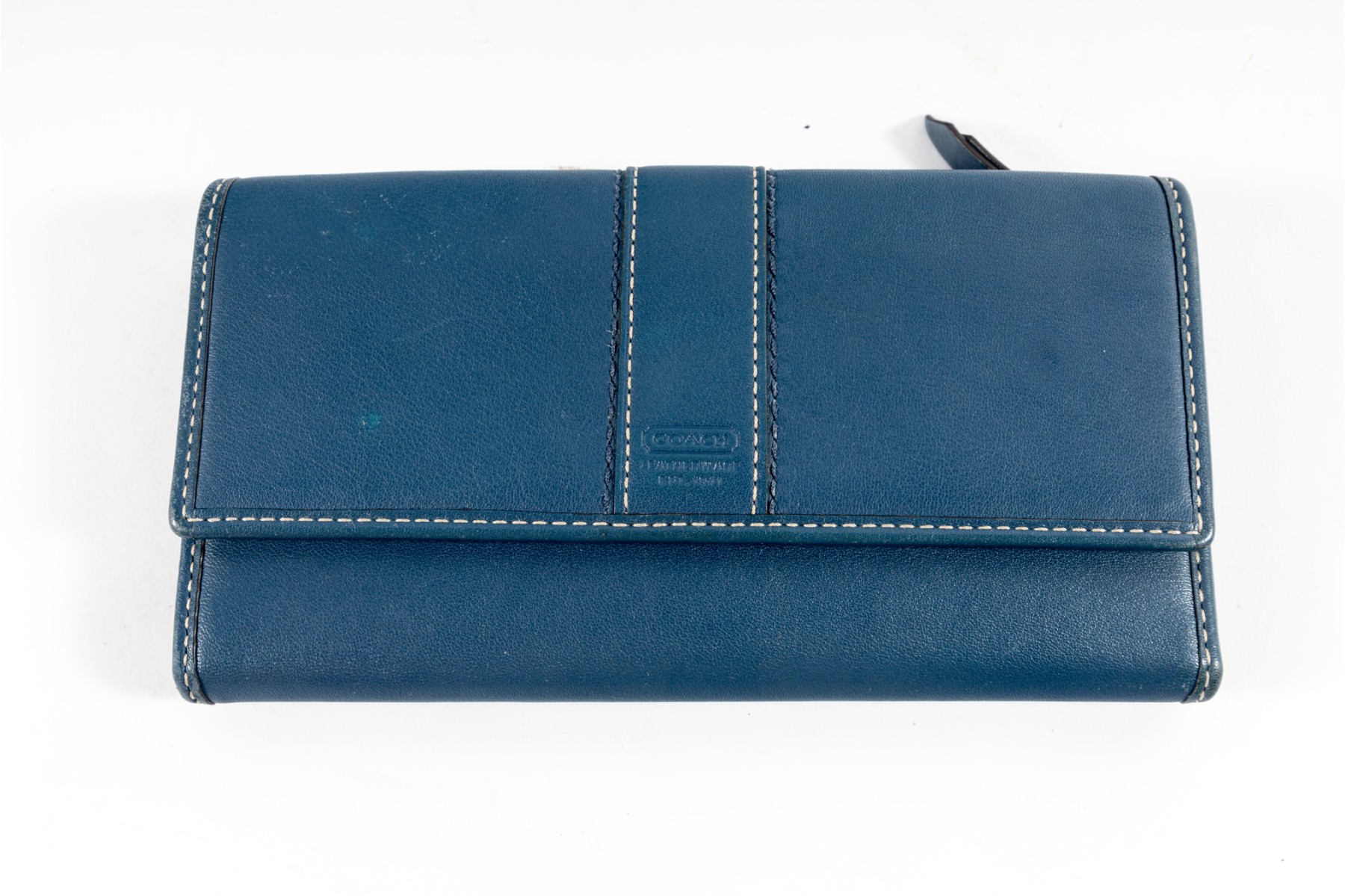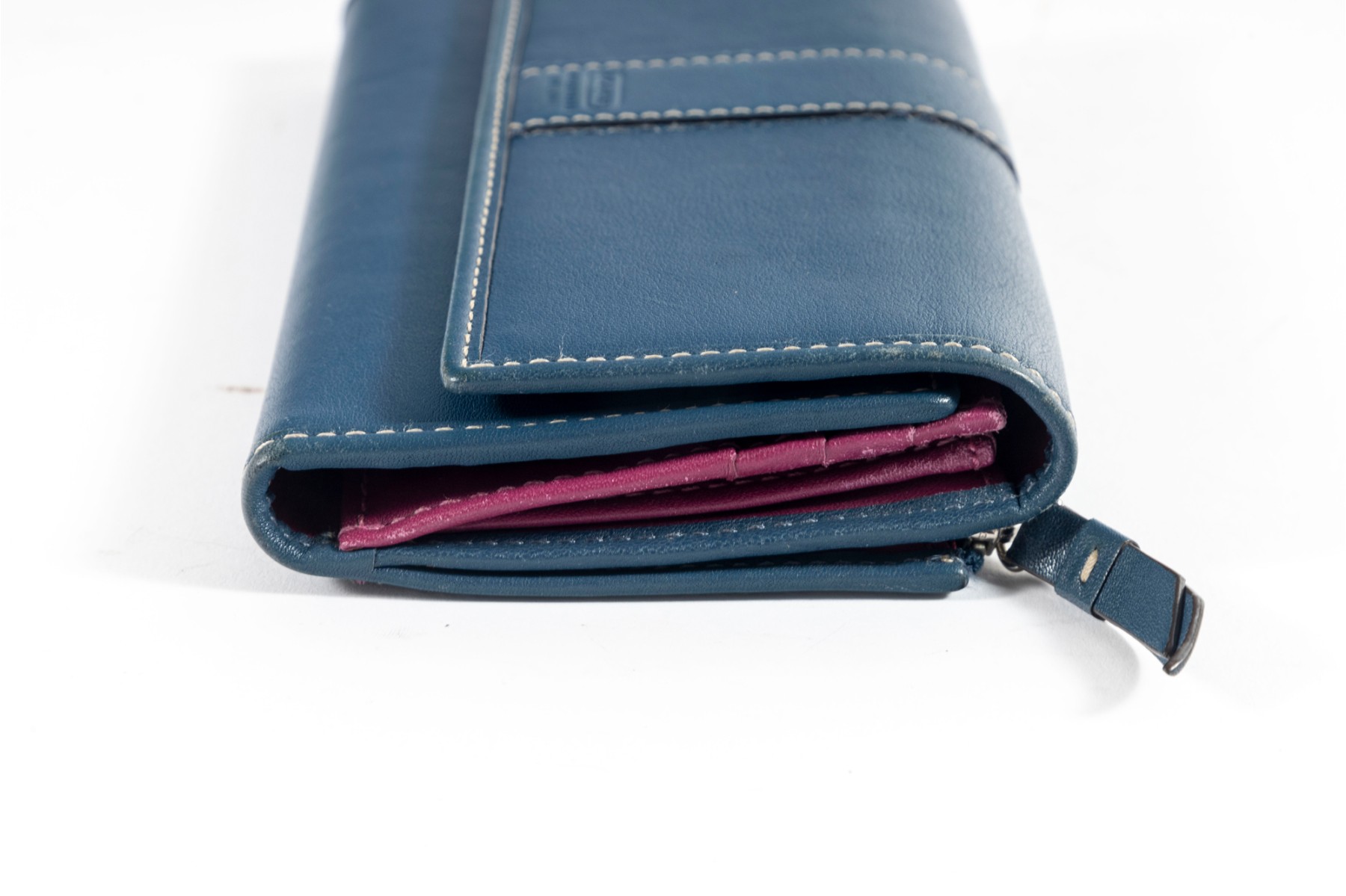 The perfect companion for the business savant, this blue leather stitched tri-fold wallet from coach showcases a contrasting fuchsia-colored interior lined with multiple pockets and card holders.