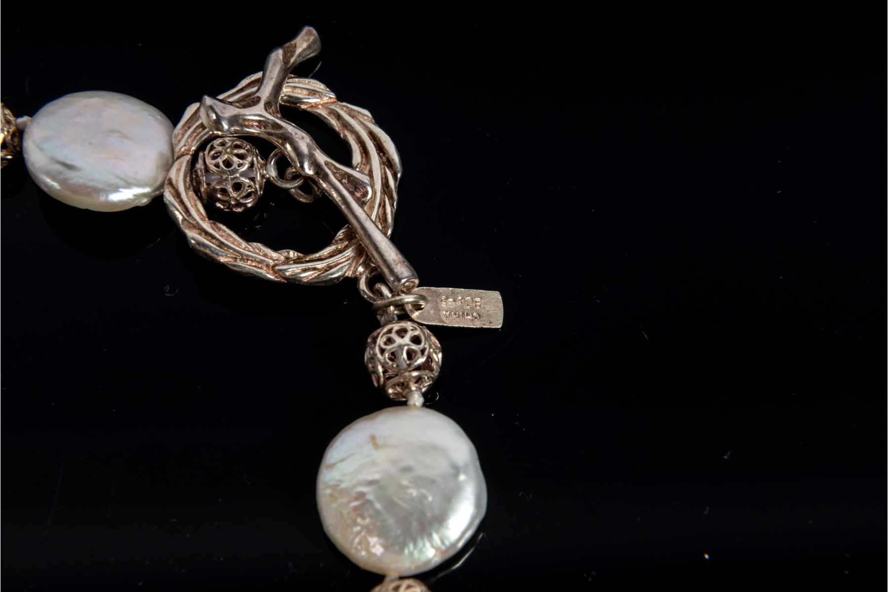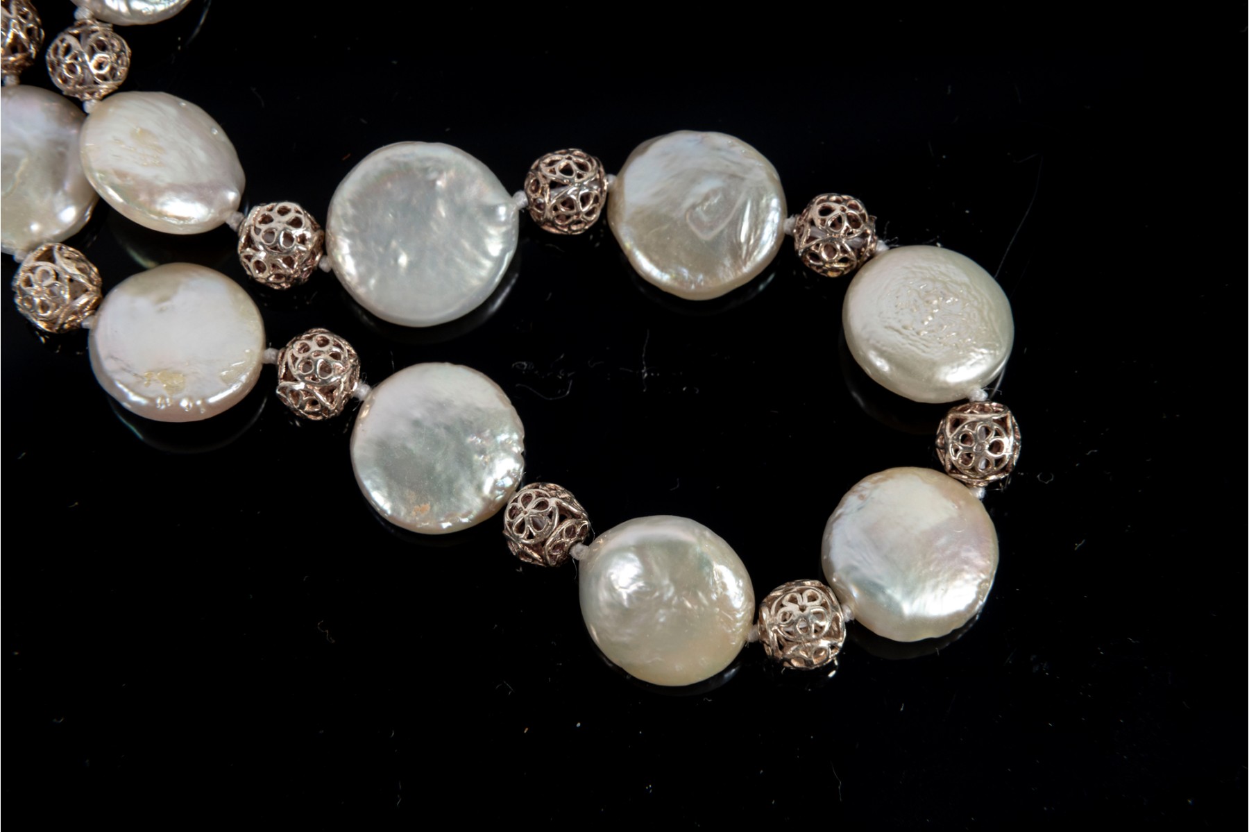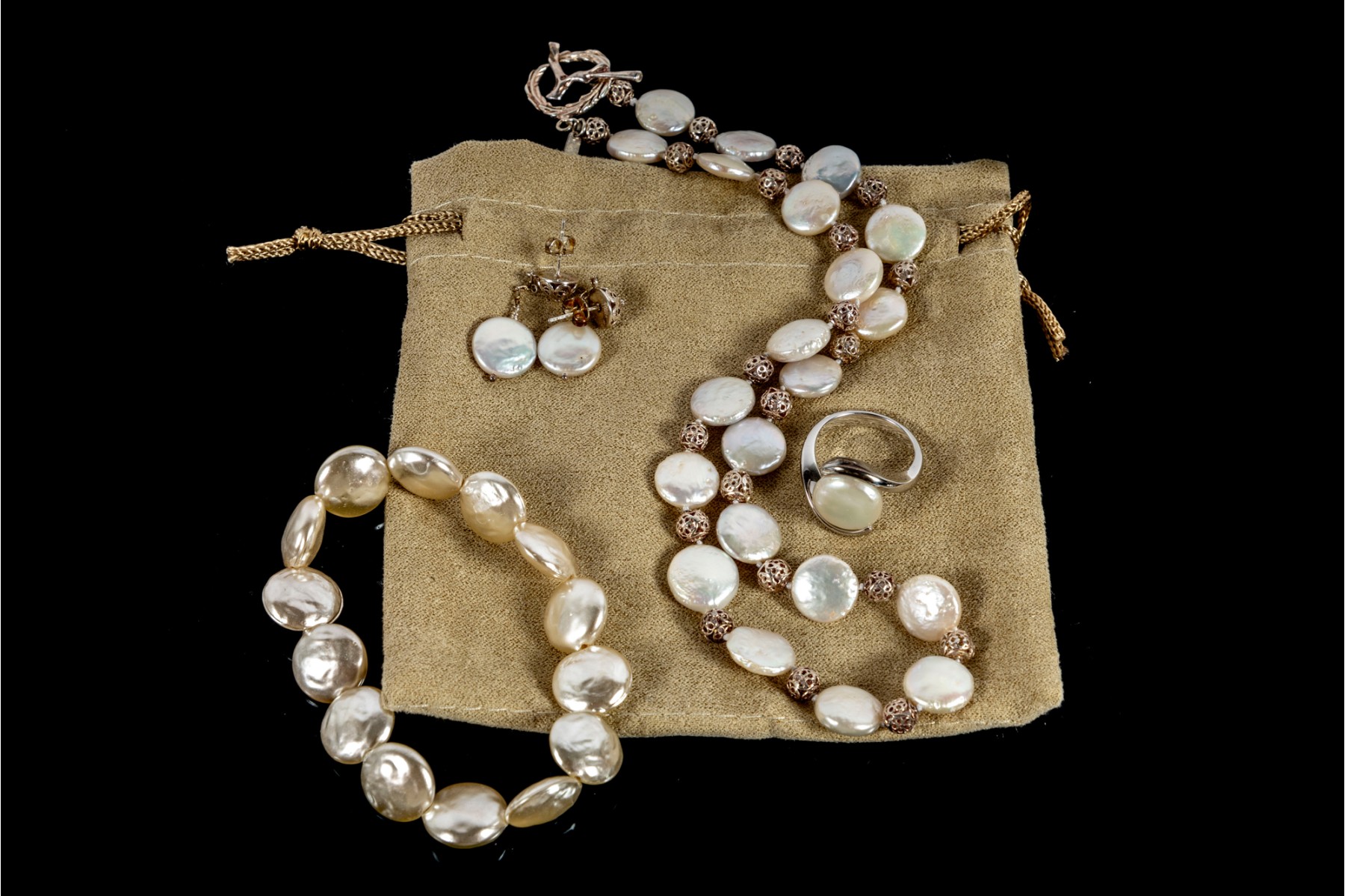 This elegant coin pearl jewelry set features a necklace, bracelet, earrings, and ring, all showcasing the unique beauty of flat, round coin pearls. The ring is marked 925 Sterling silver,