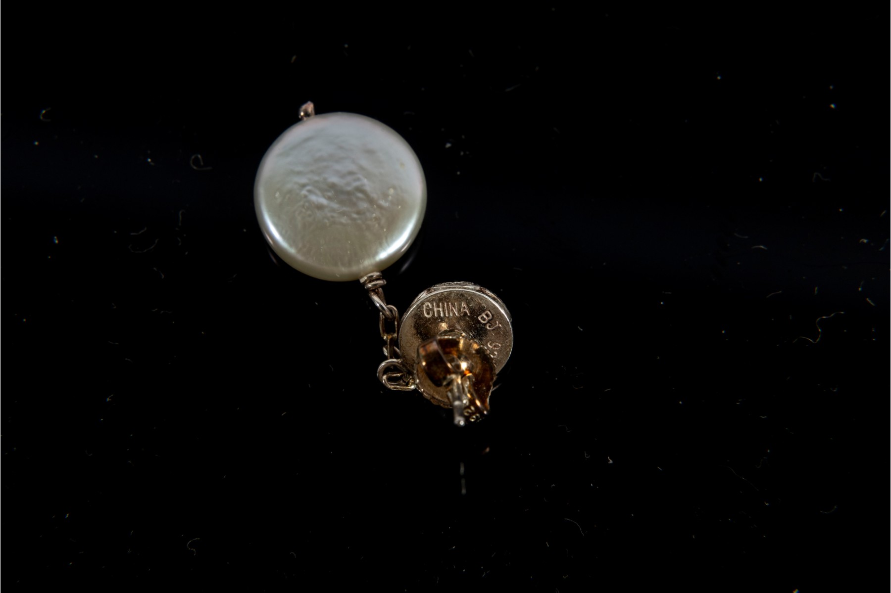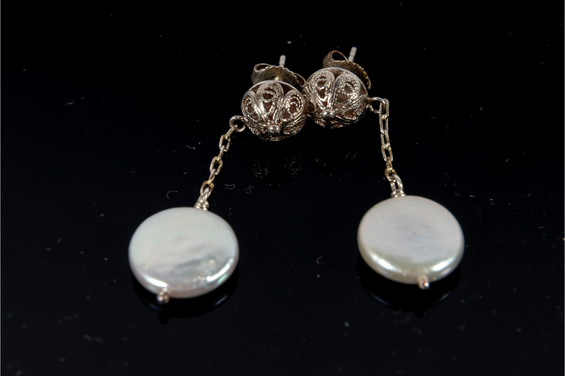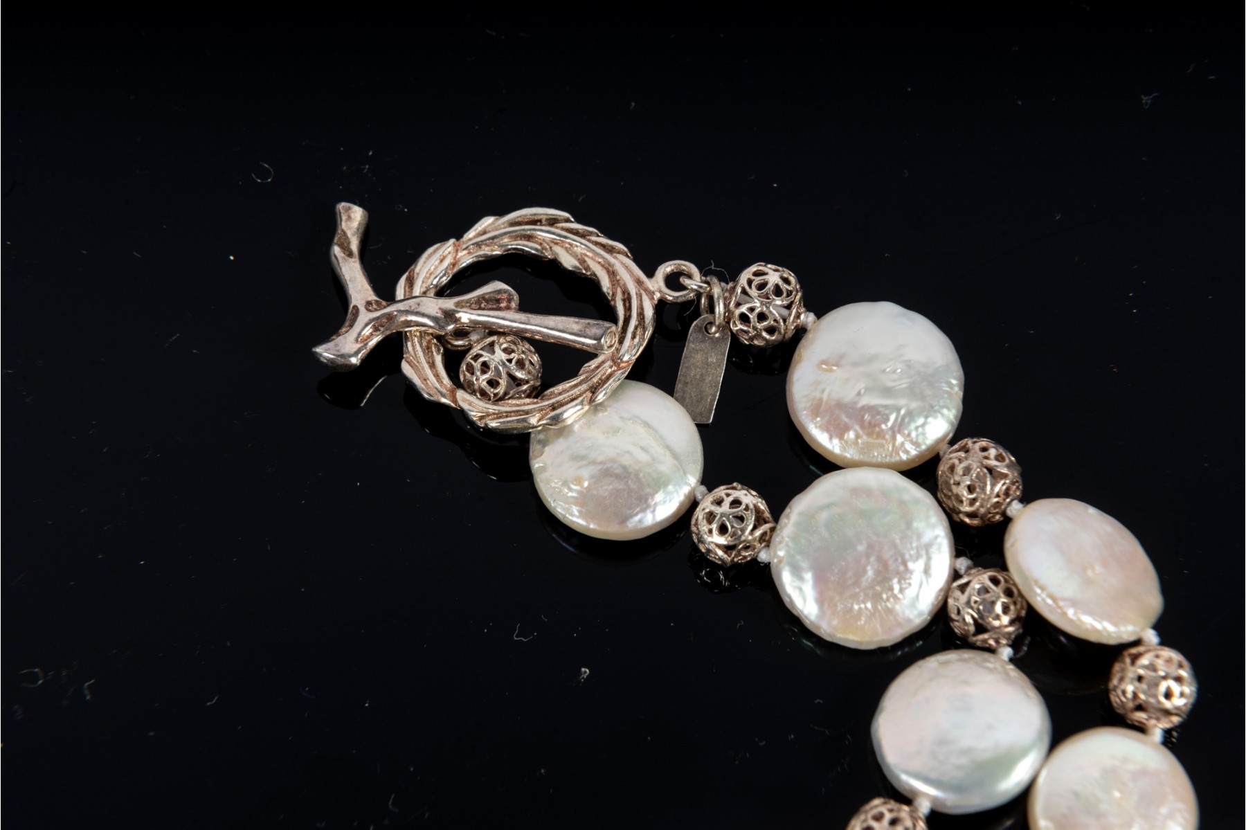 This elegant coin pearl jewelry set features a necklace, bracelet, earrings, and ring, all showcasing the unique beauty of flat, round coin pearls. The ring is marked 925 Sterling silver,