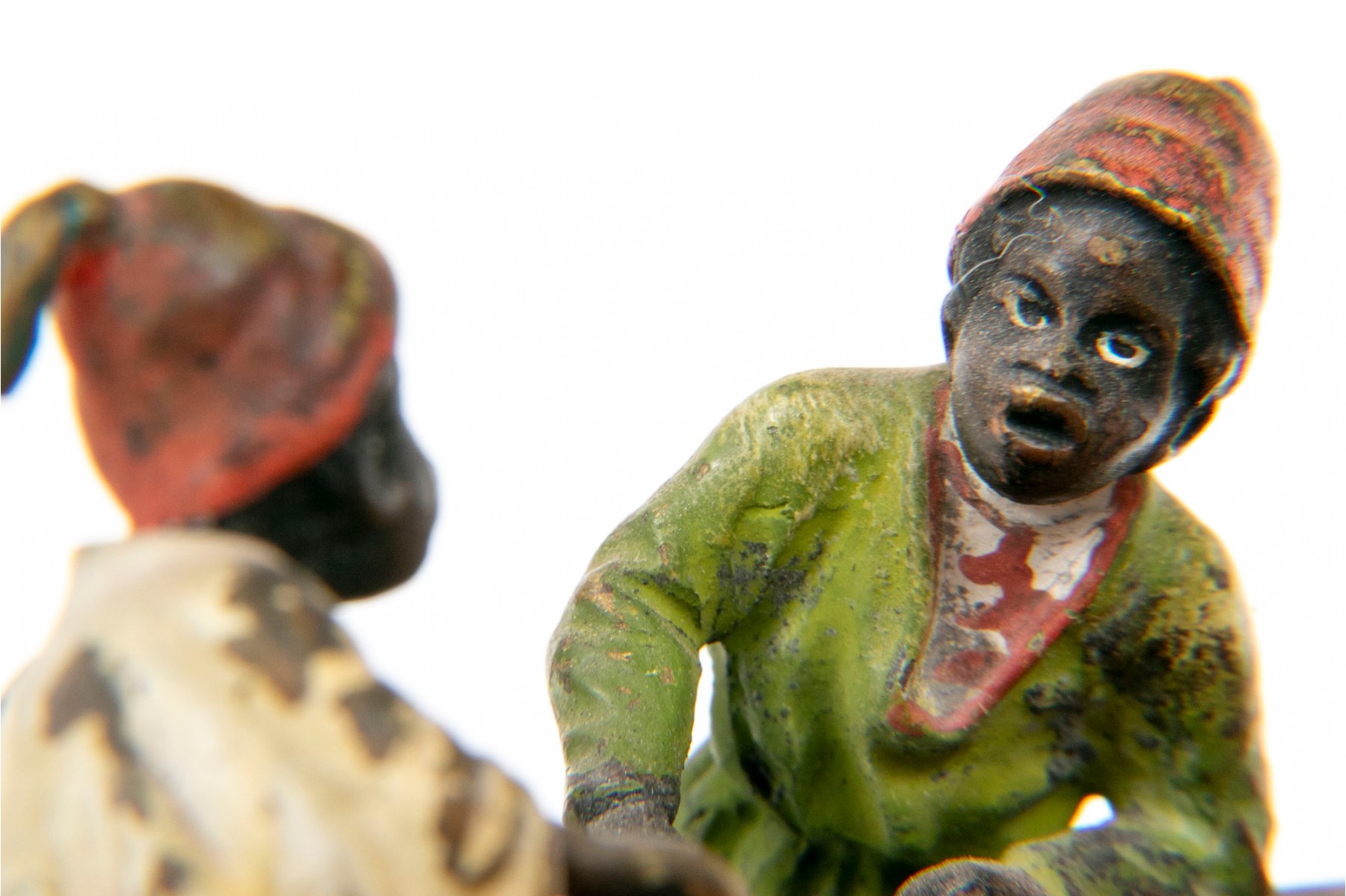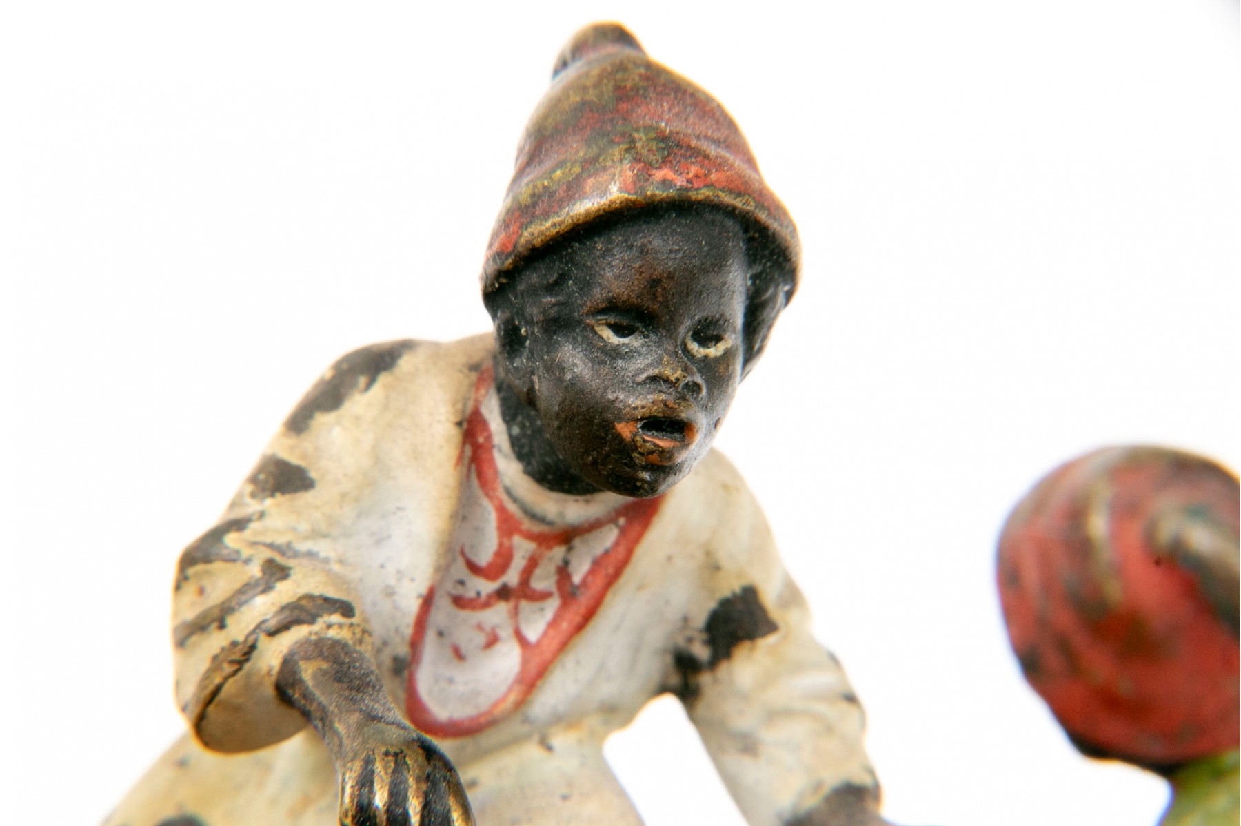 Condition: dents to bowl, chipping and wear to paint, both figures have movement, wear consistent with age.