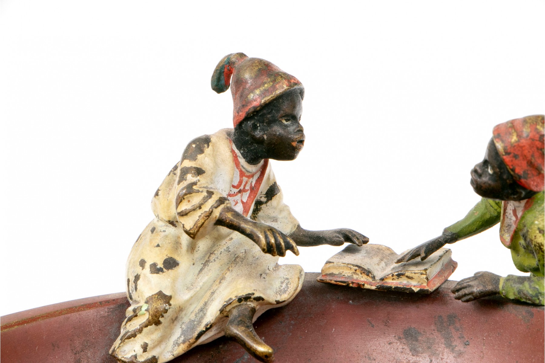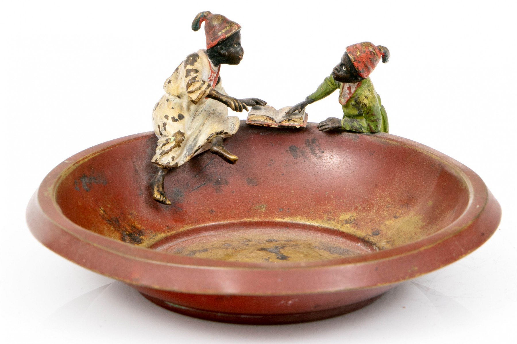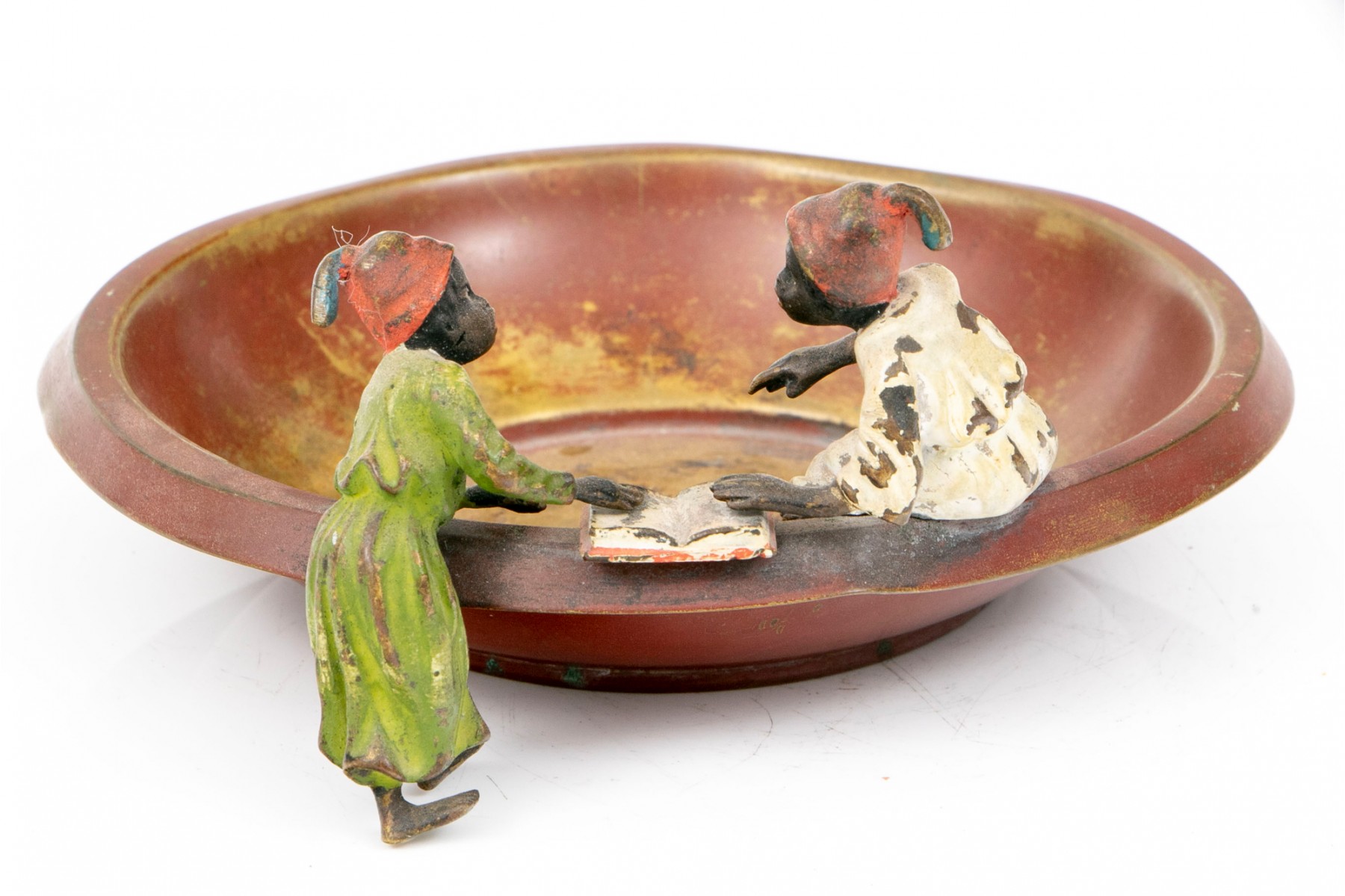 Cold painted bronze figural group with two Arabesque figures with a book sitting atop the rim of the dish.