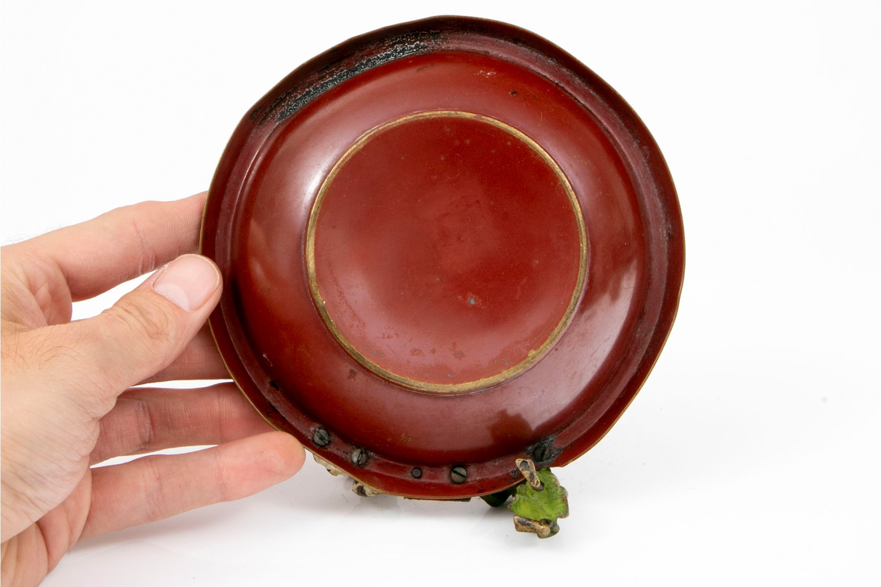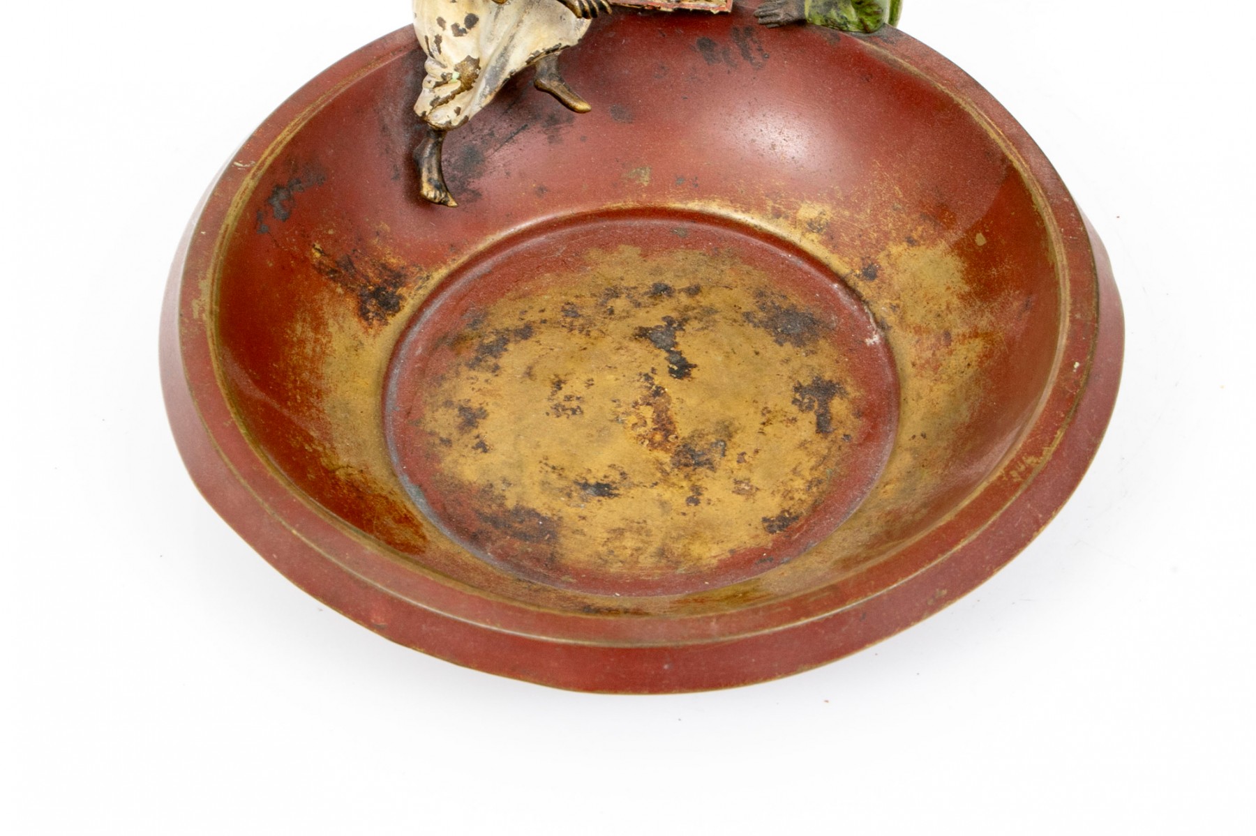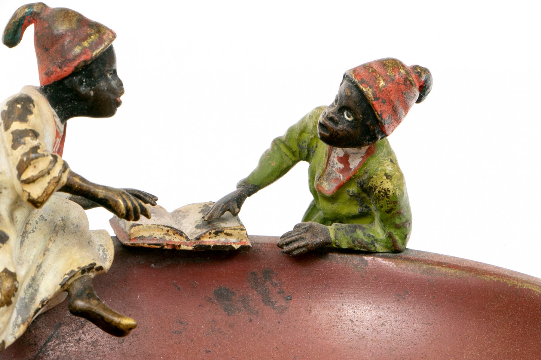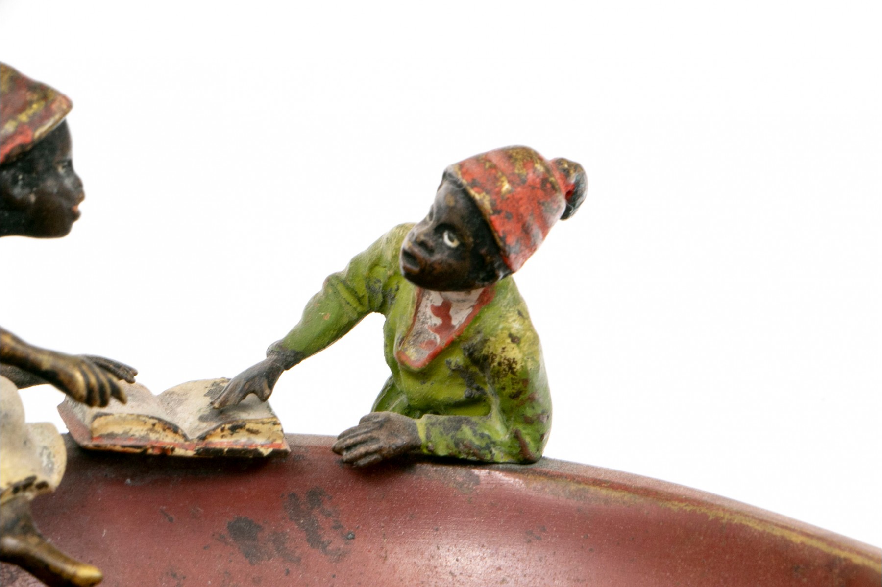 Cold painted bronze figural group with two Arabesque figures with a book sitting atop the rim of the dish.
