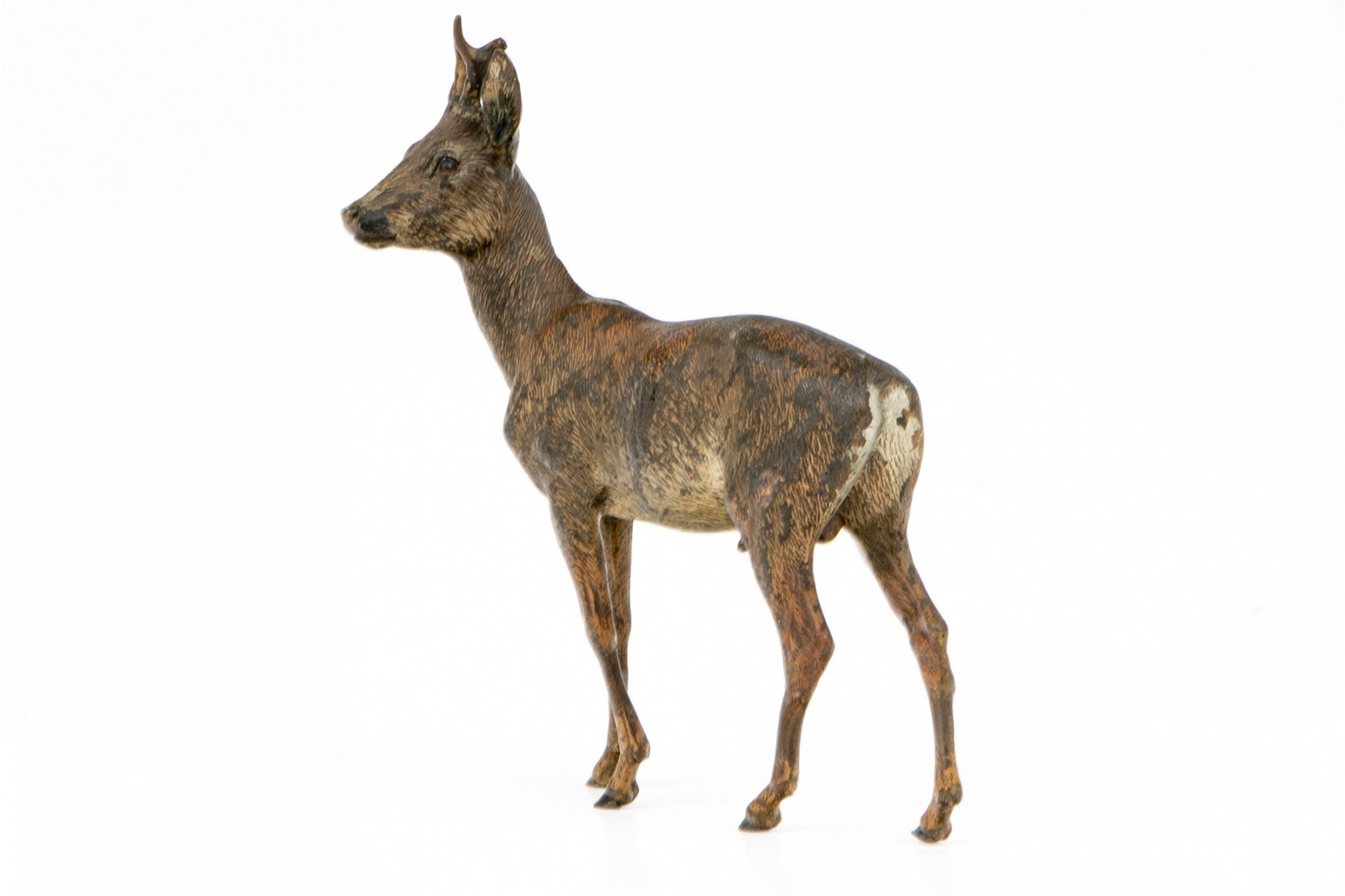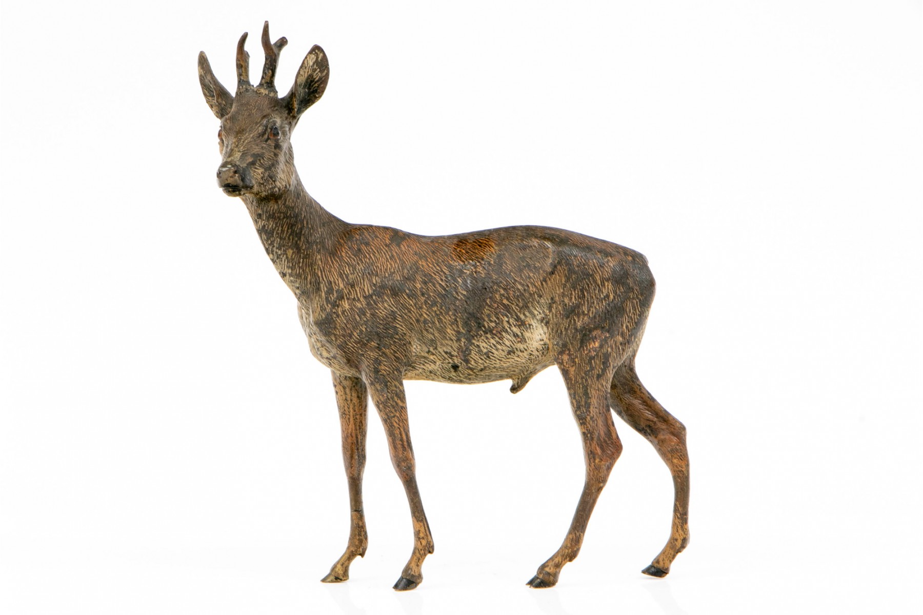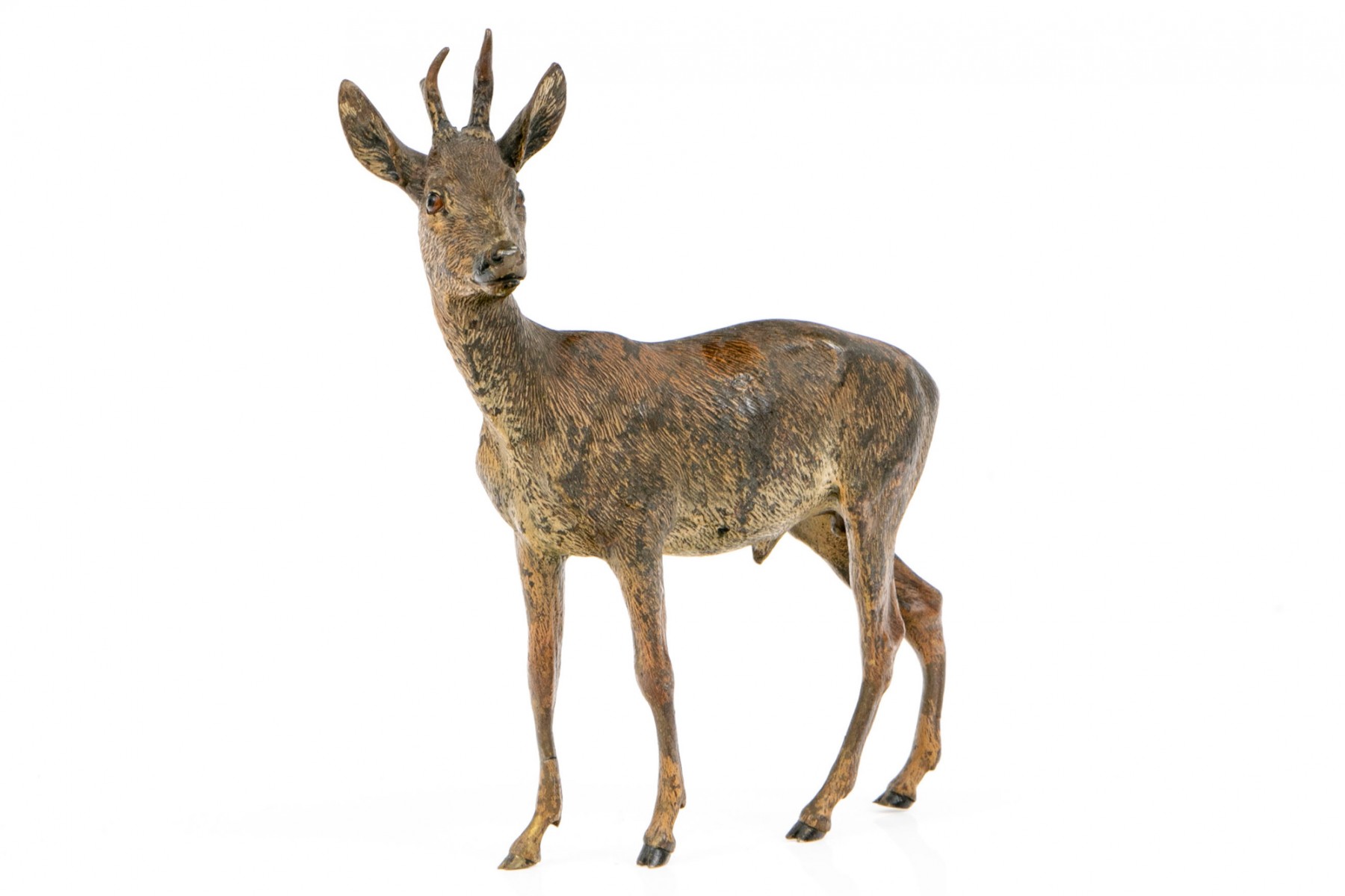 Cold painted Vienna bronze figure of a standing stag with antlers. Unmarked.