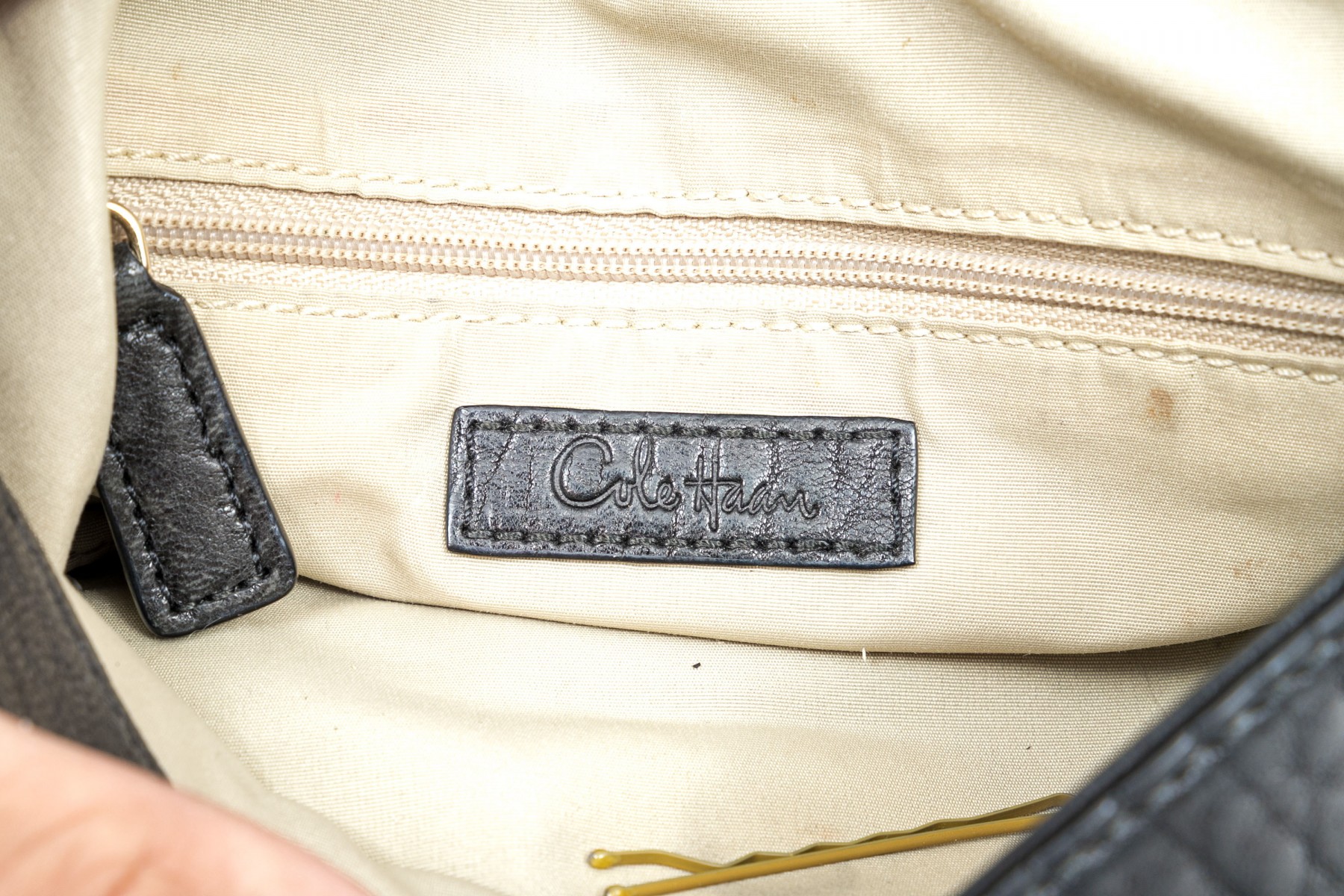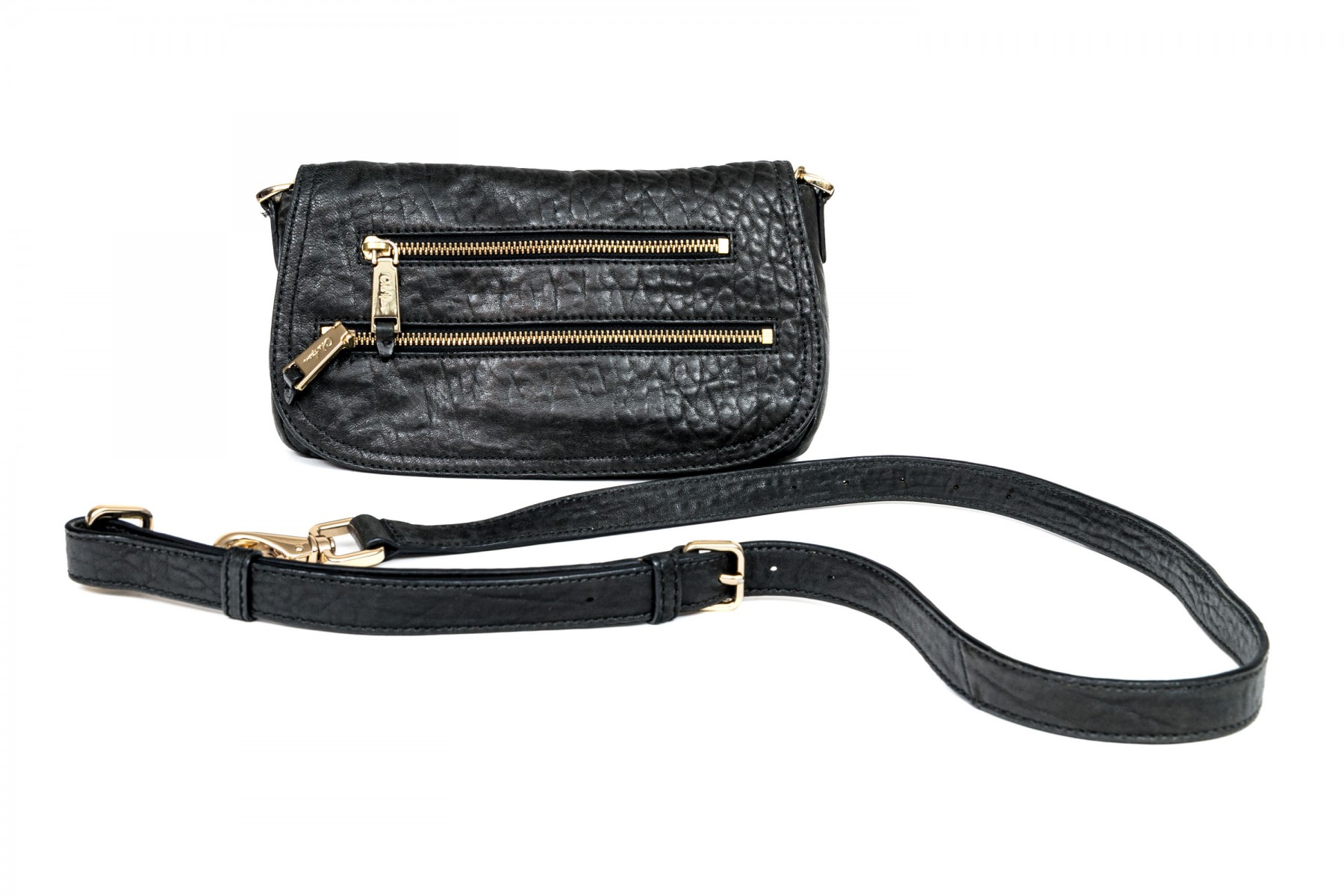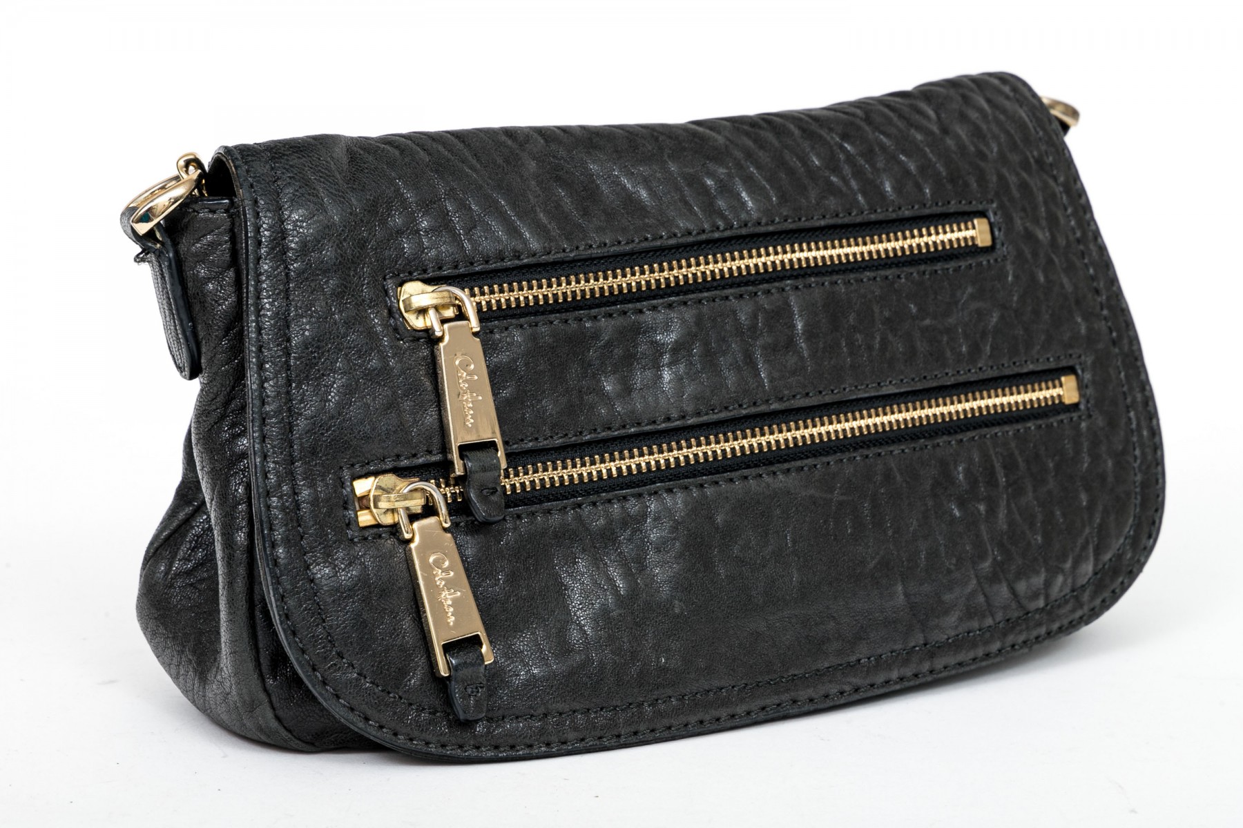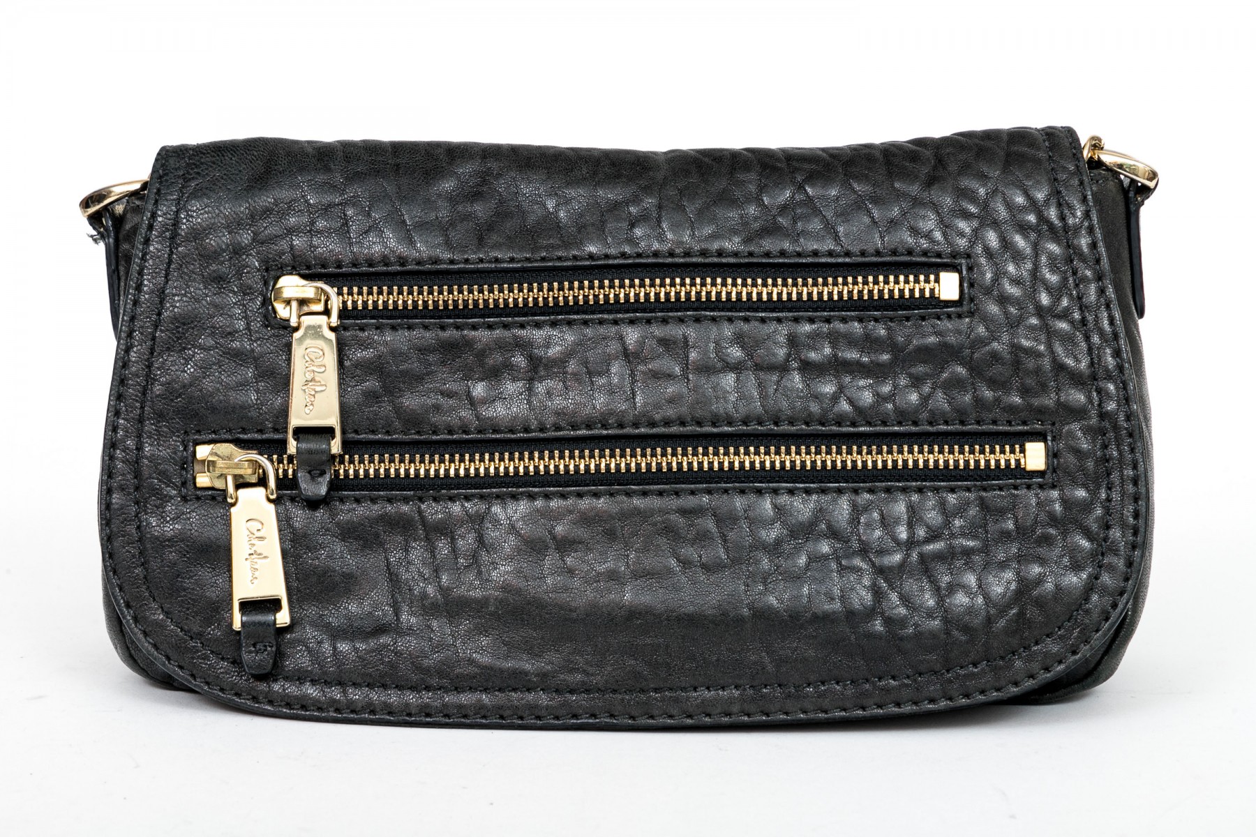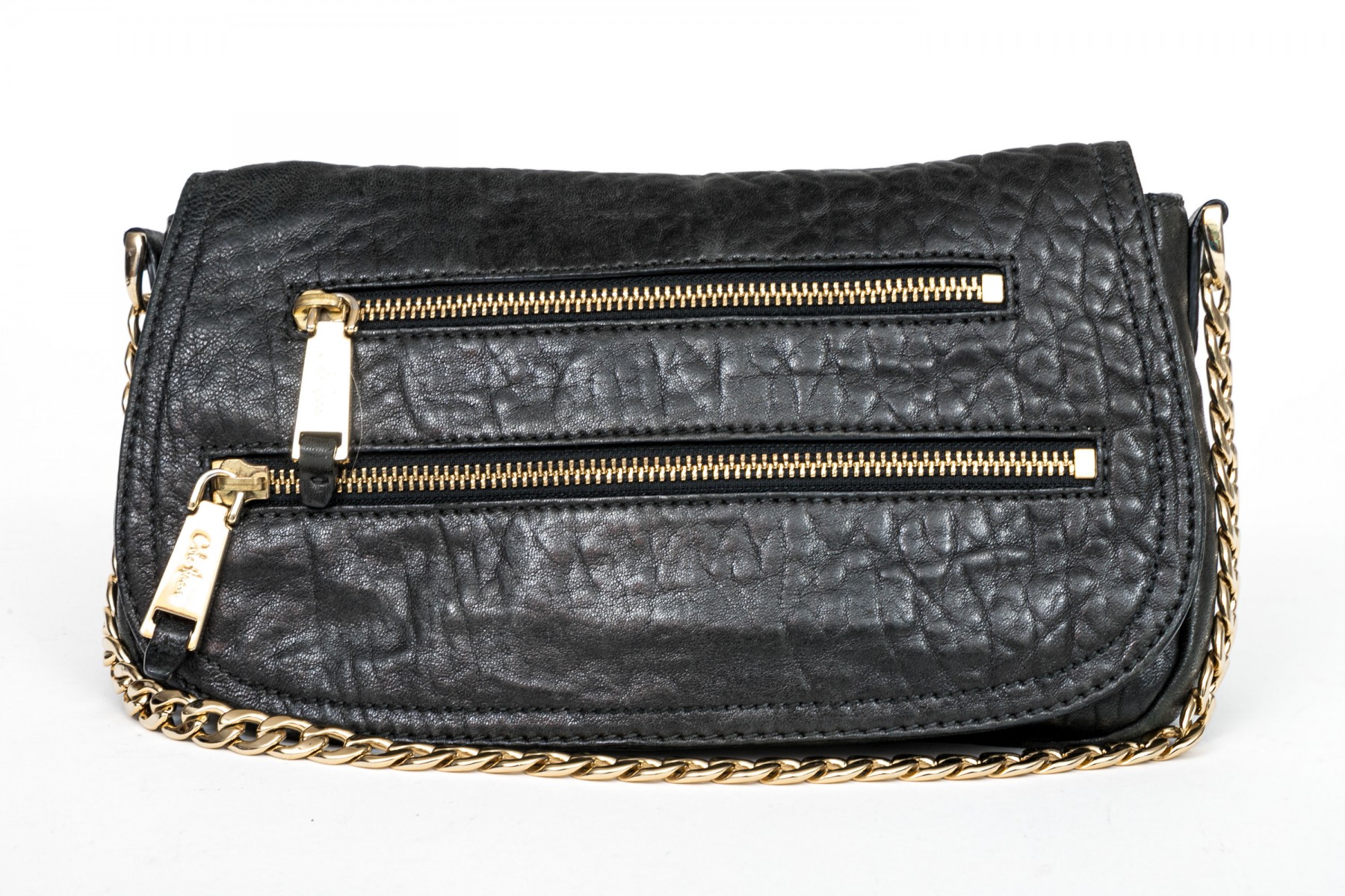 Cole Haan pebbled black leather flap bag, zip pockets