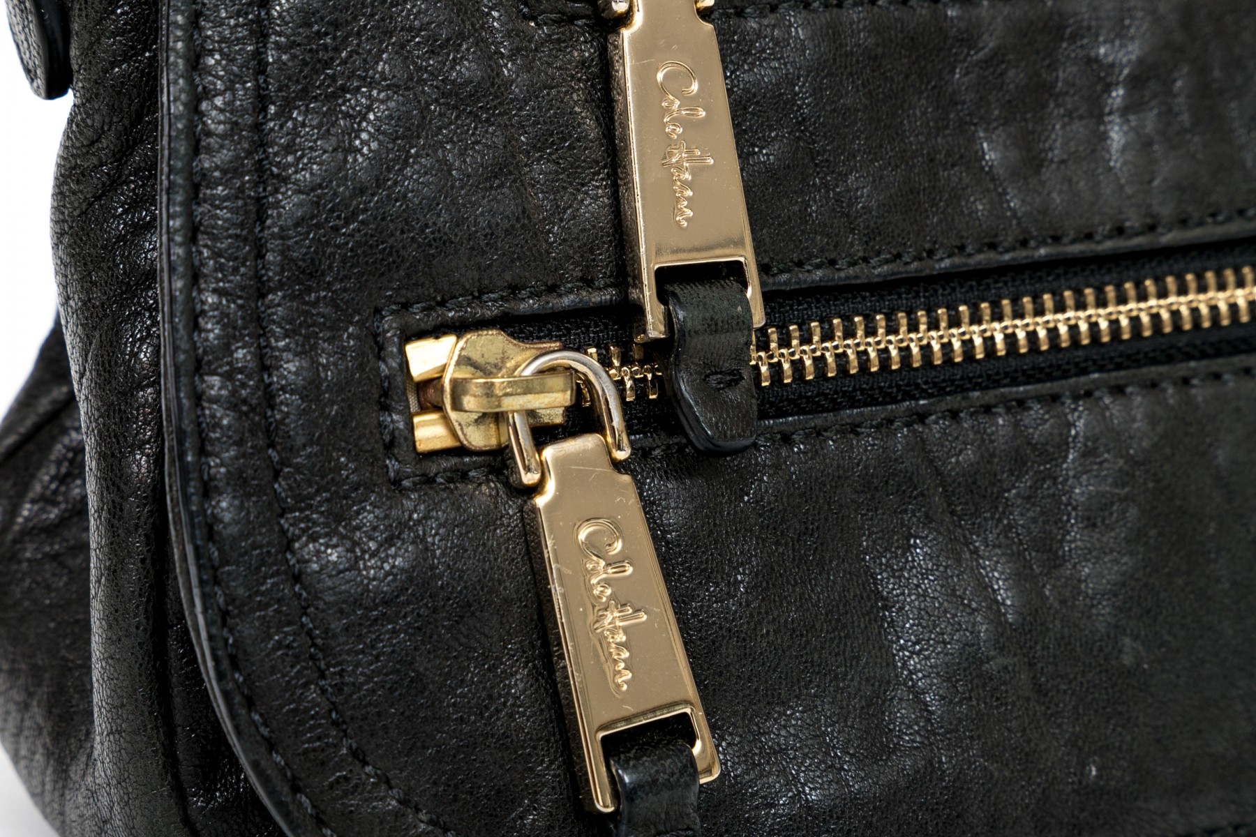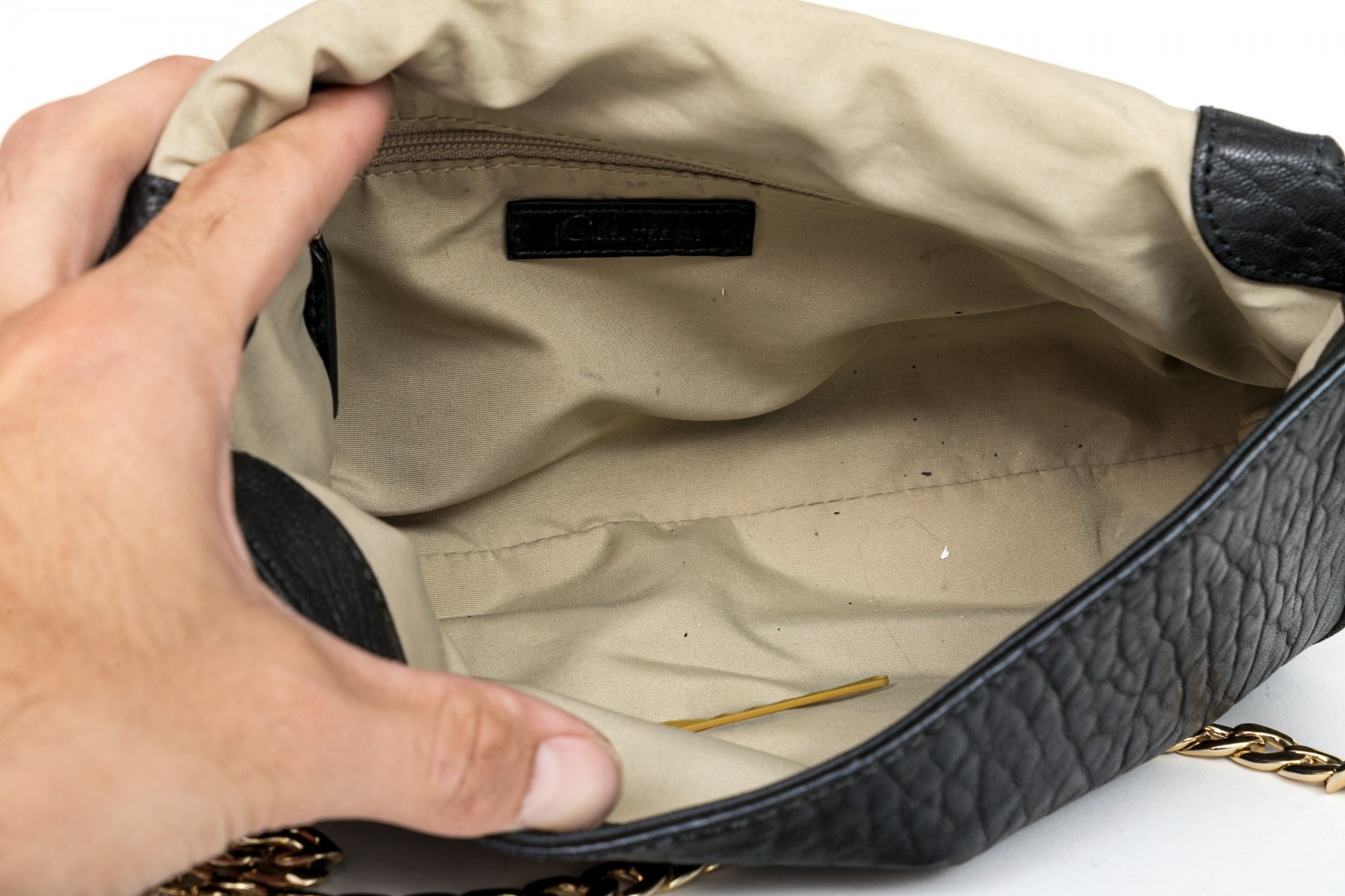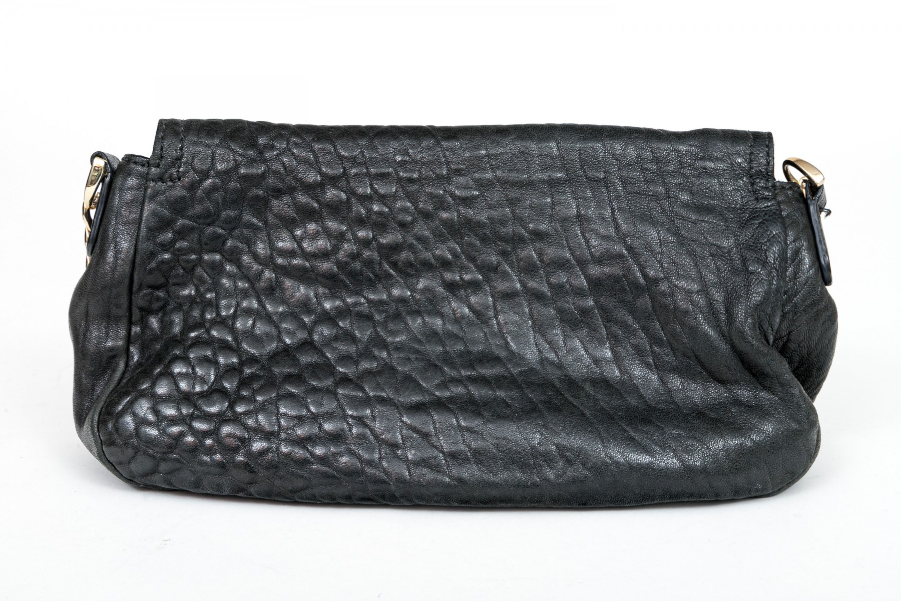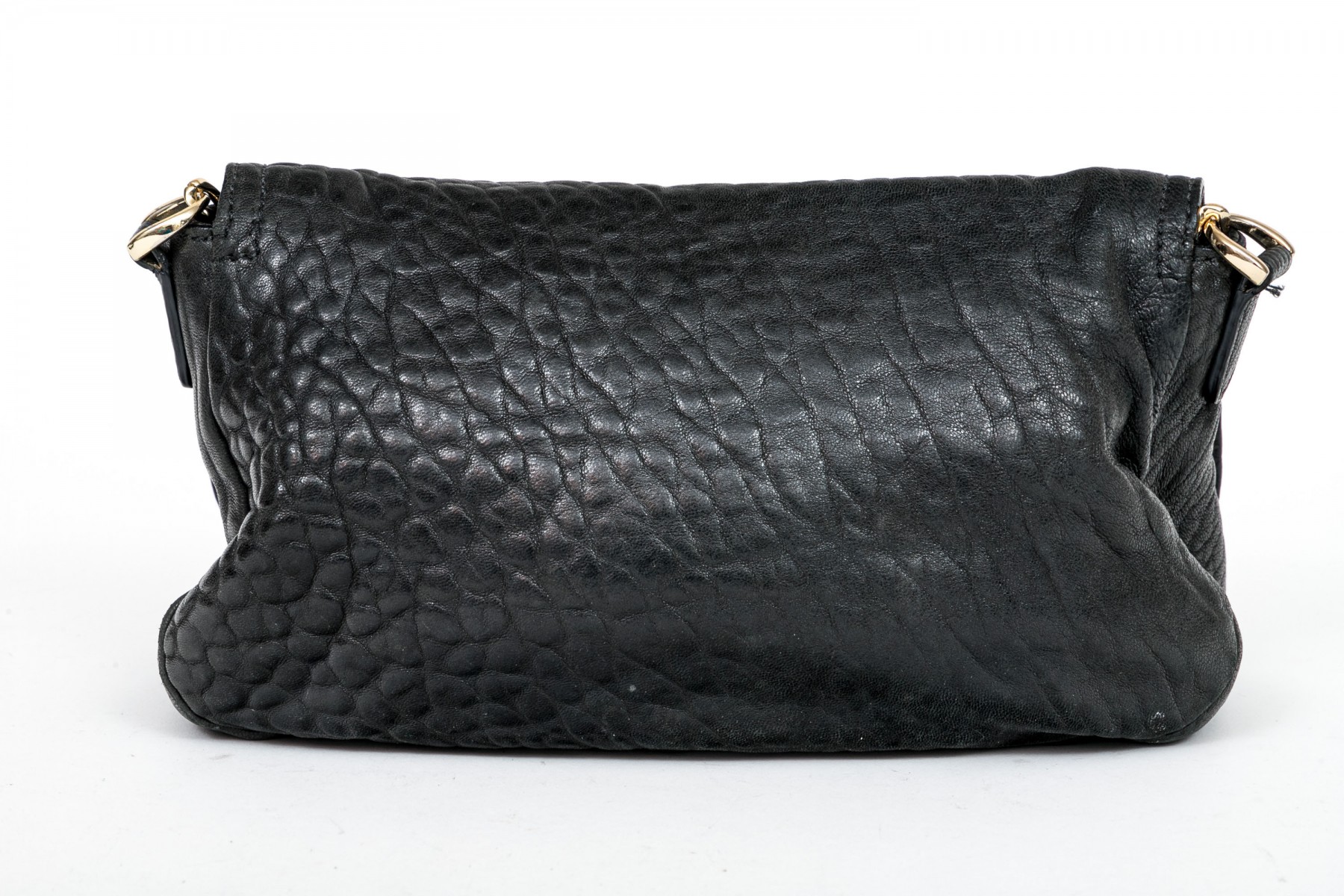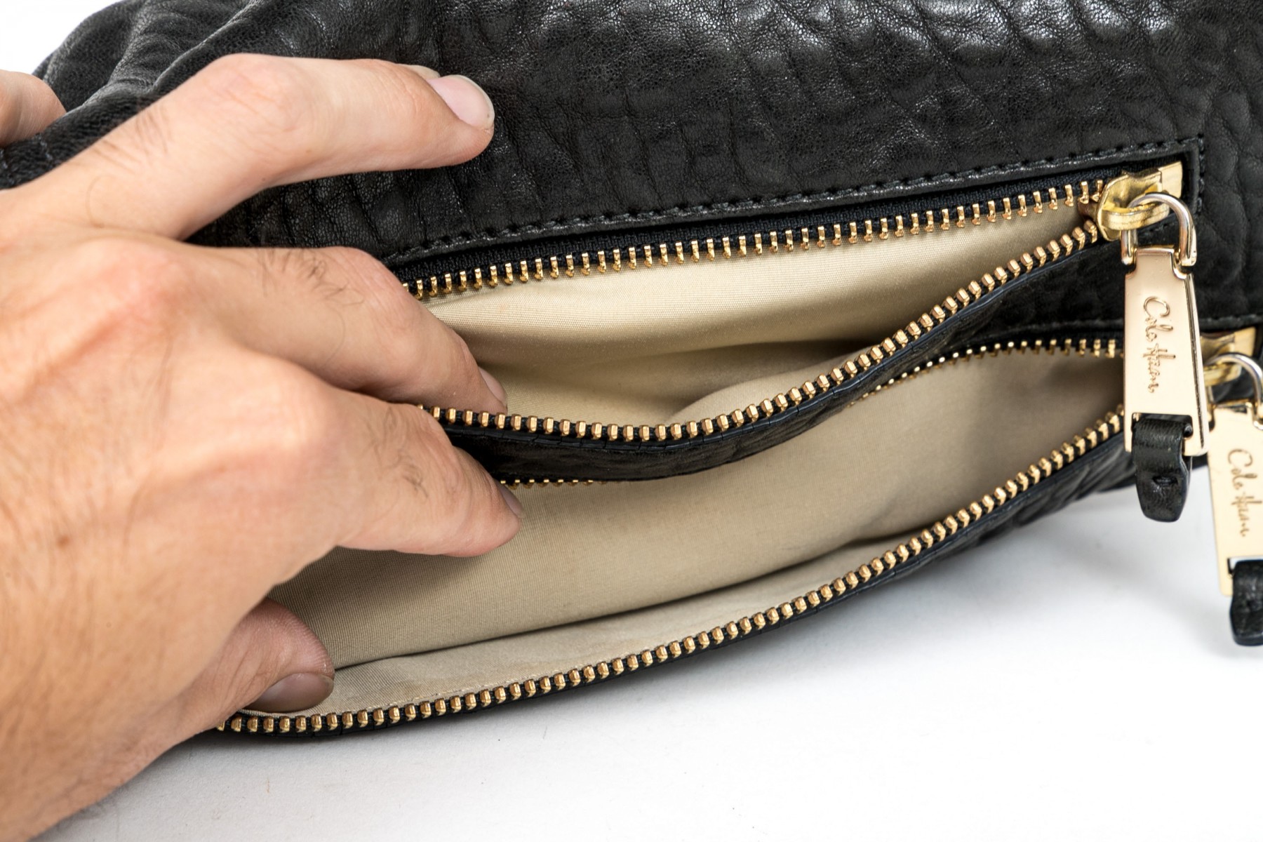 Cole Haan pebbled black leather flap bag, zip pockets