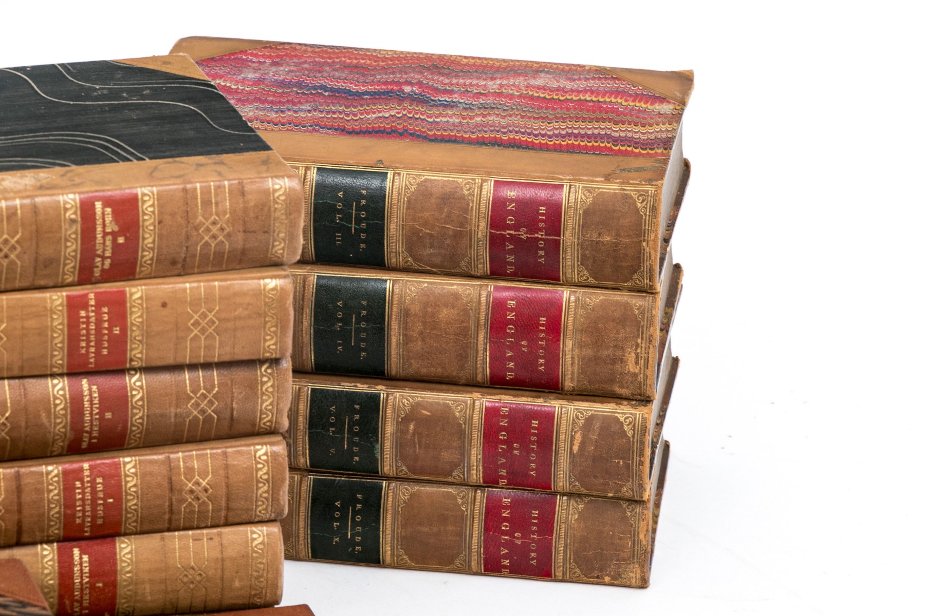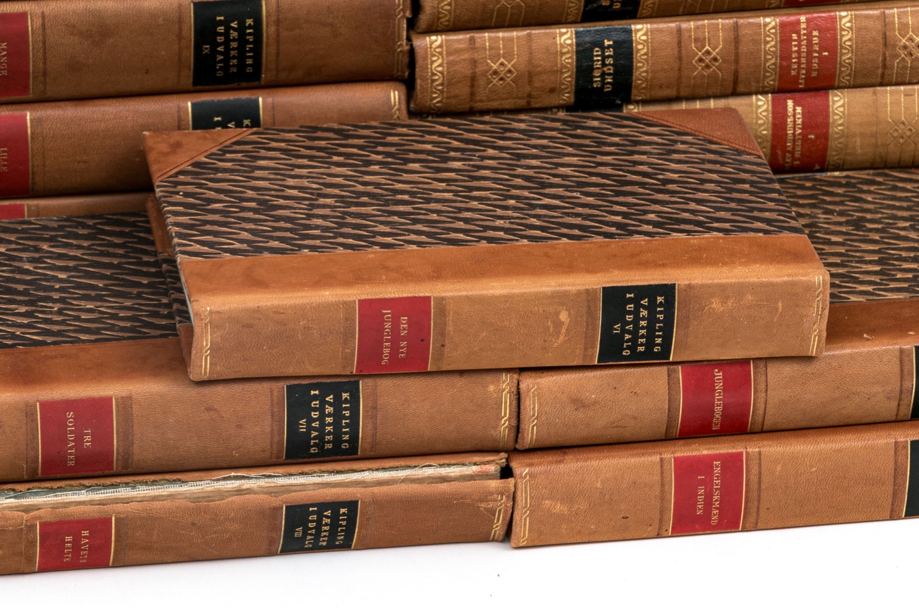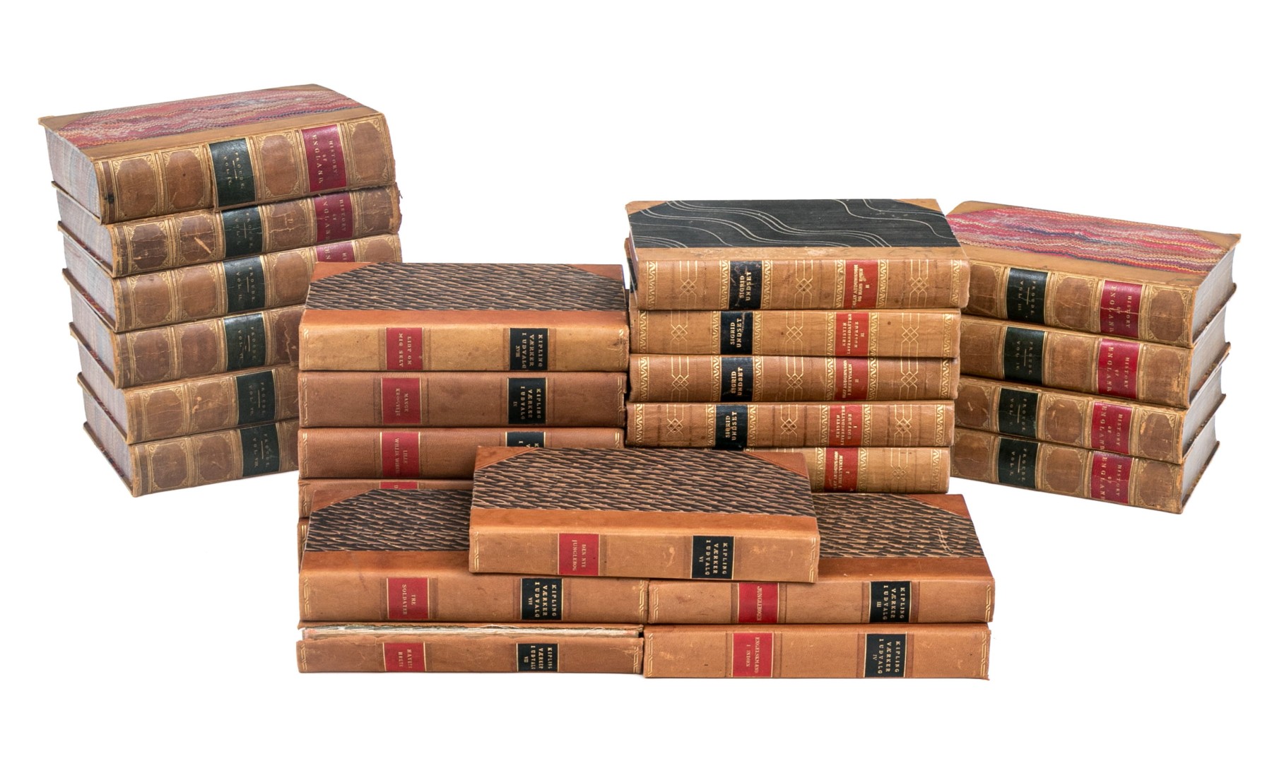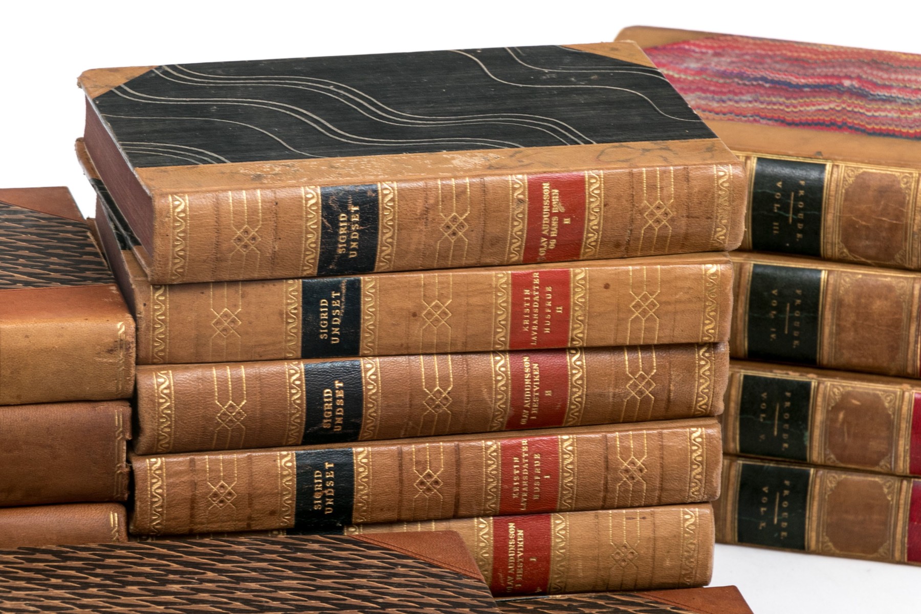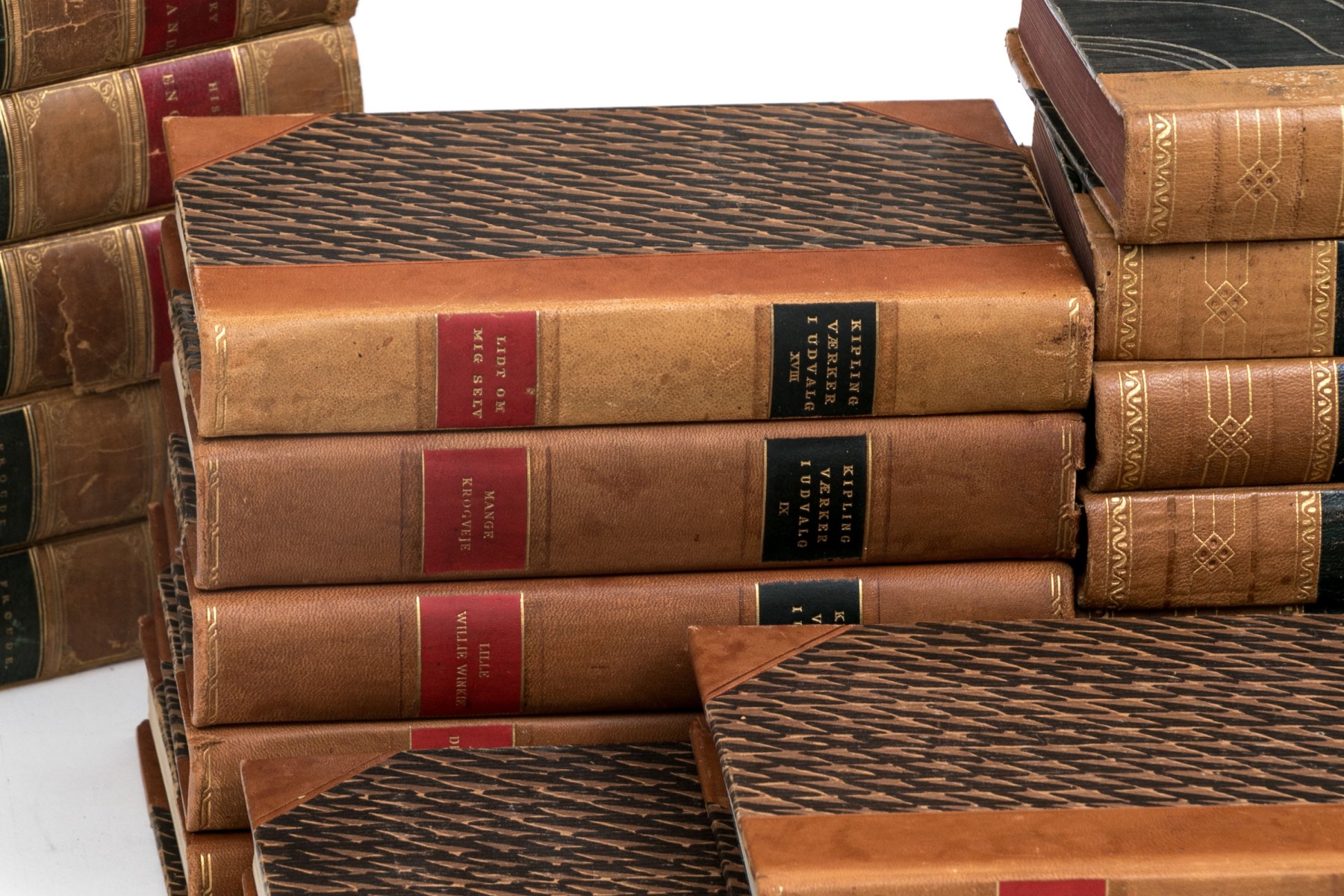 An eclectic collection of leather bound books from three series. Not all books in each series are present.