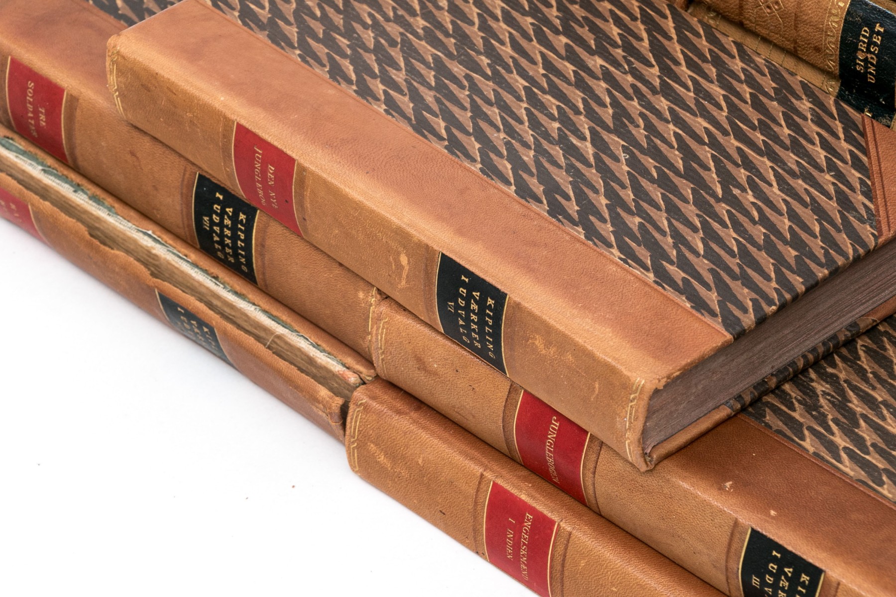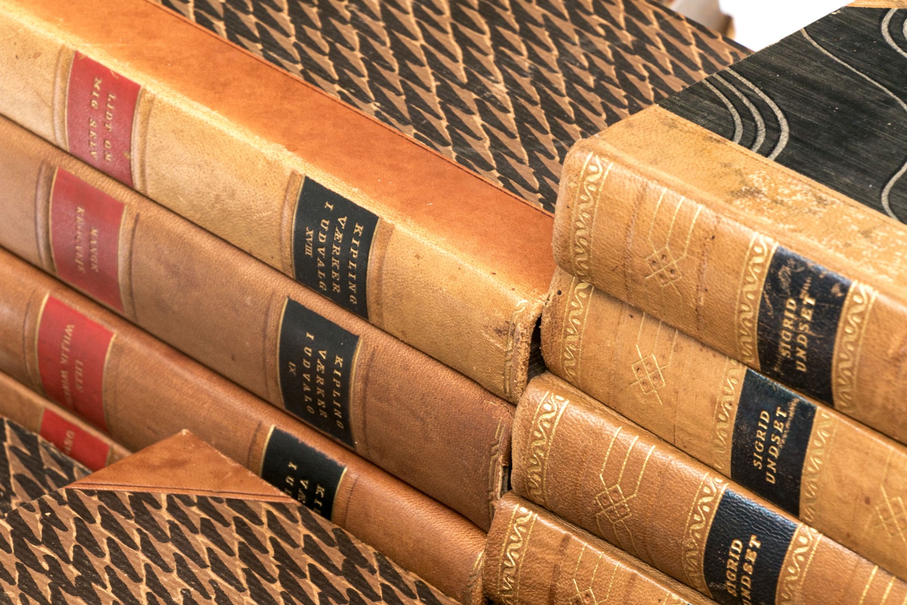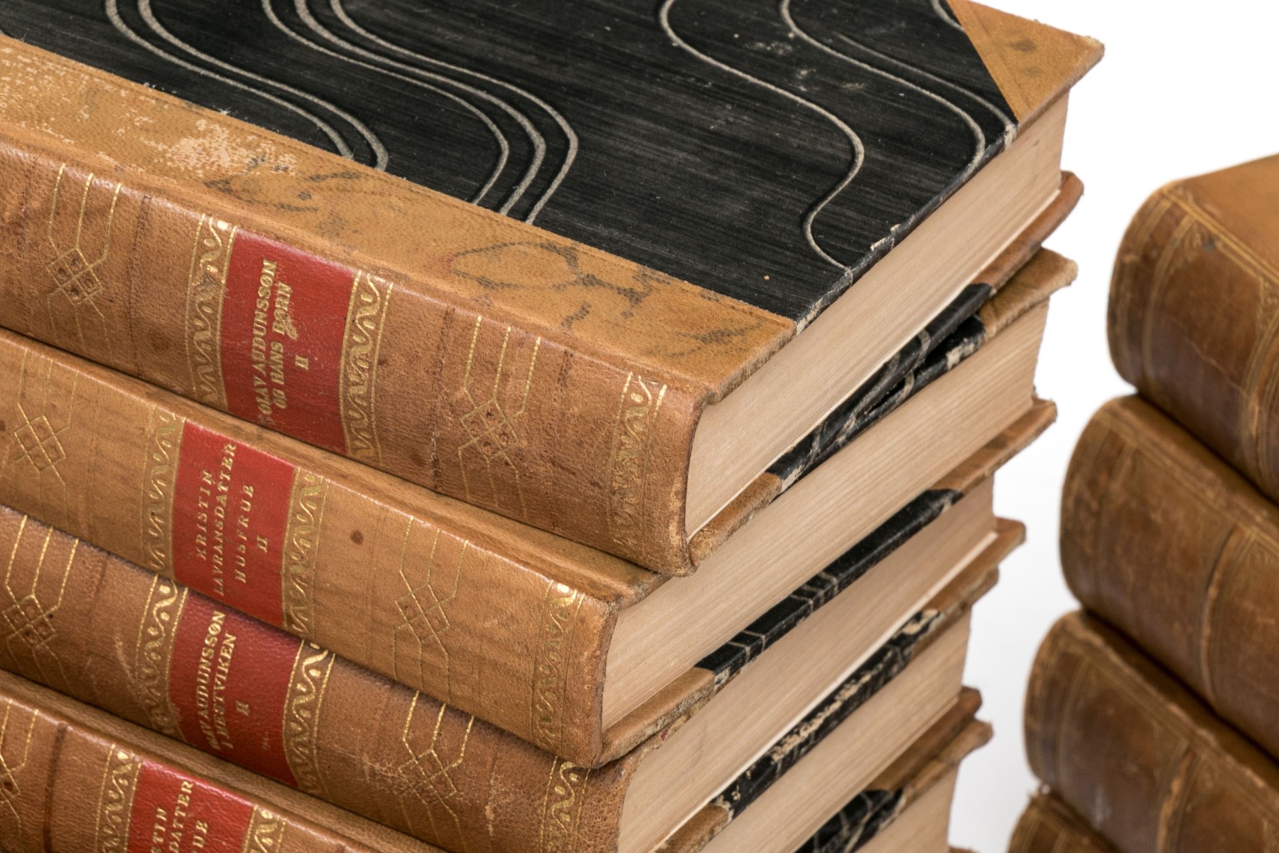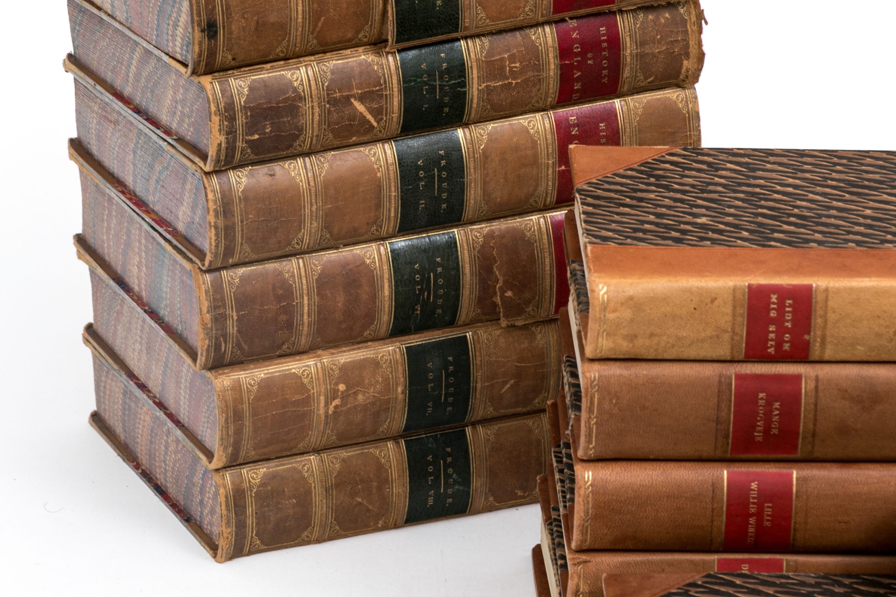 An eclectic collection of leather bound books from three series. Not all books in each series are present.