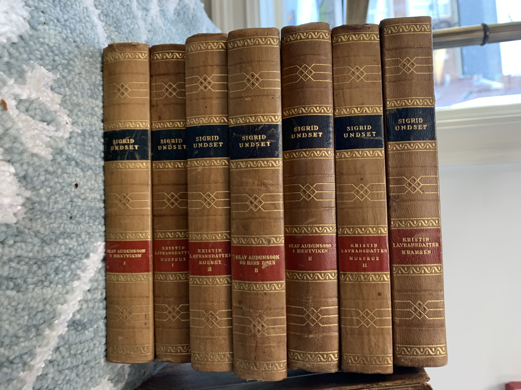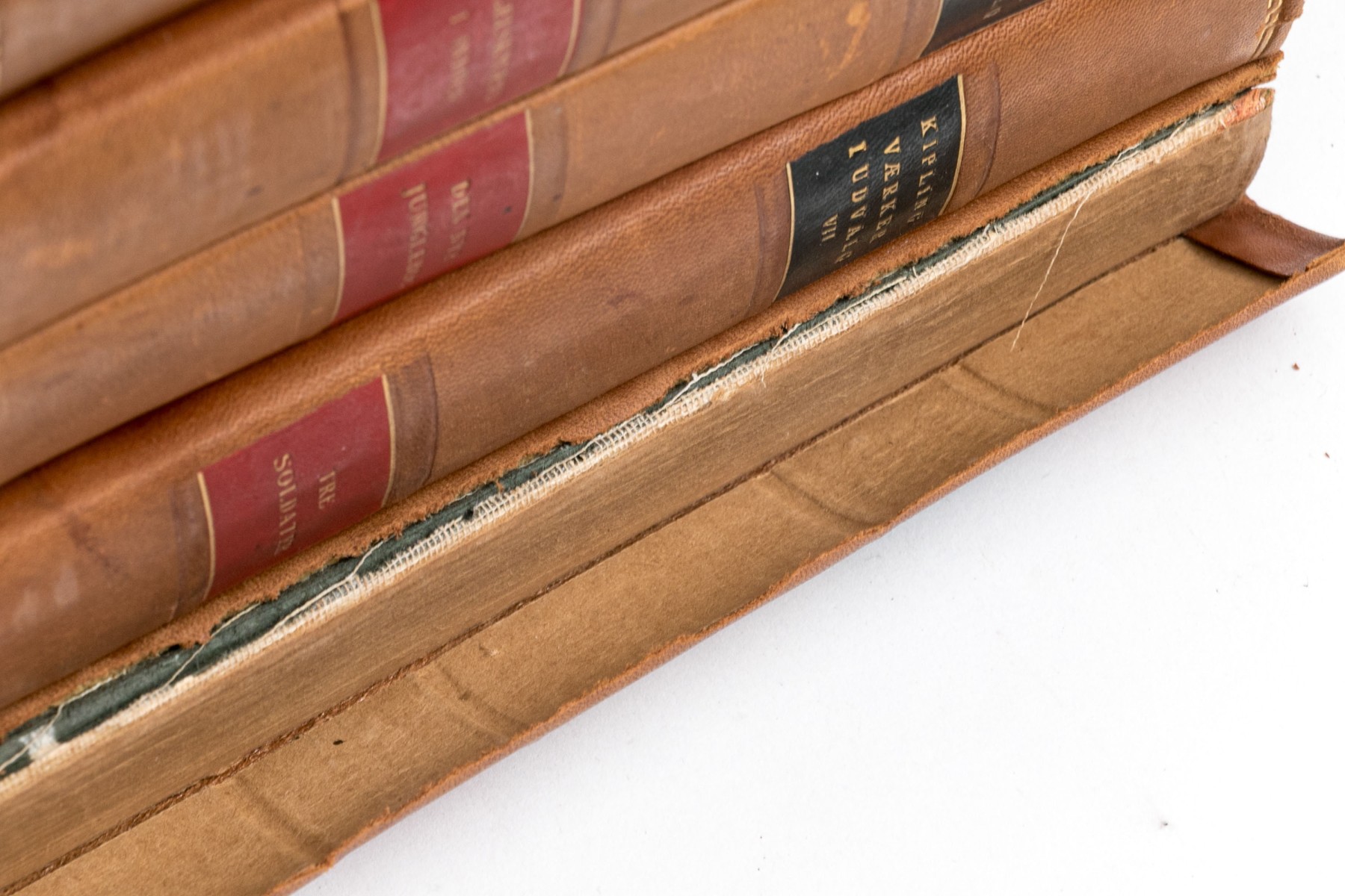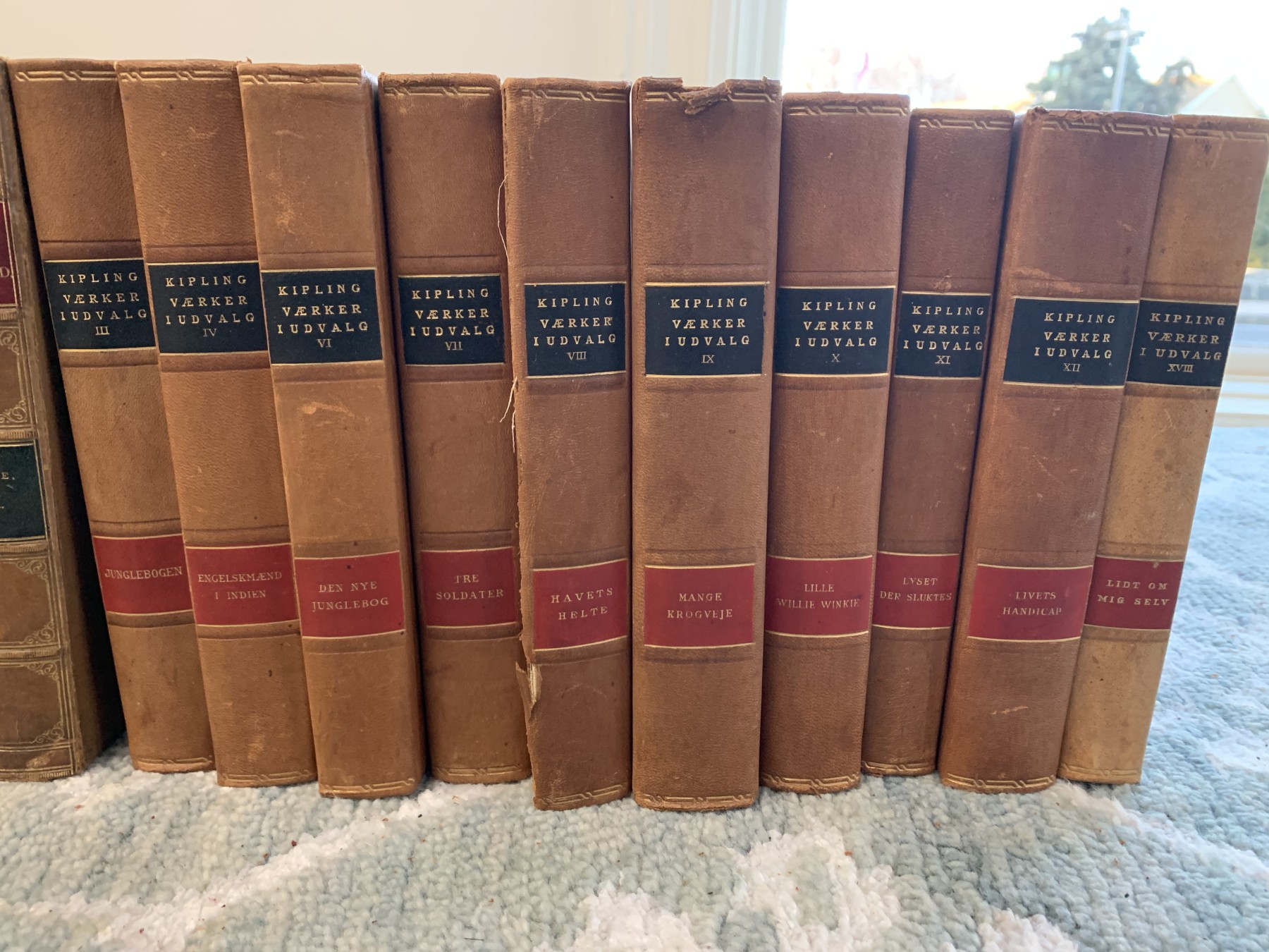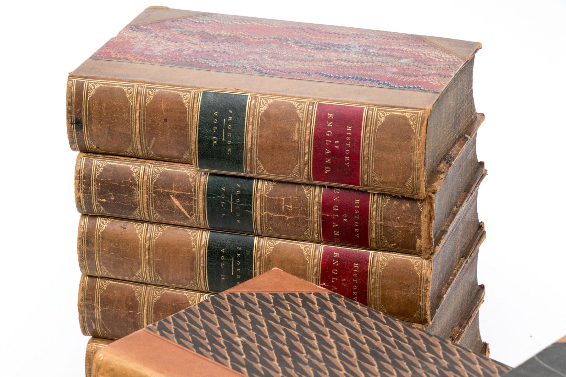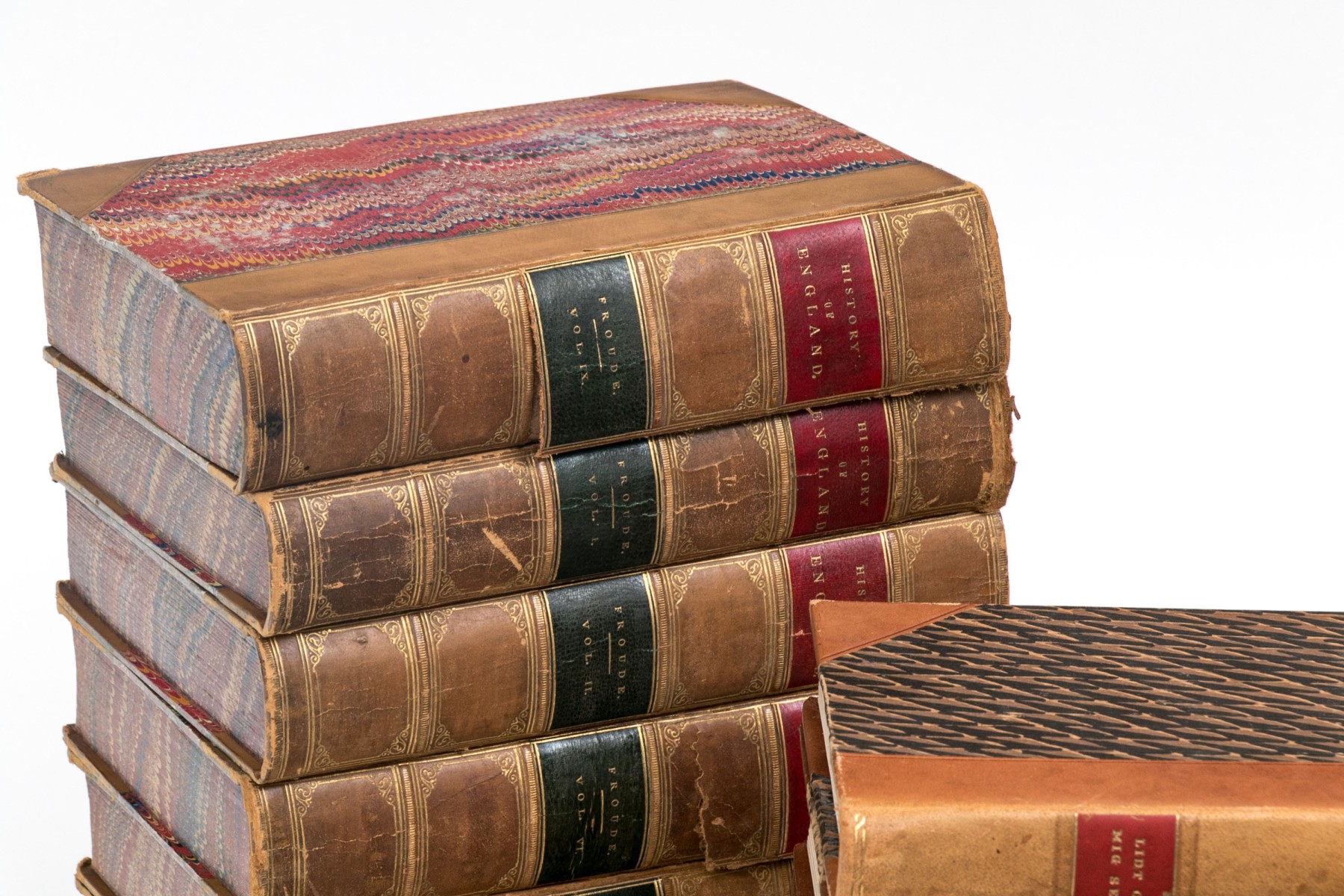 An eclectic collection of leather bound books from three series. Not all books in each series are present.