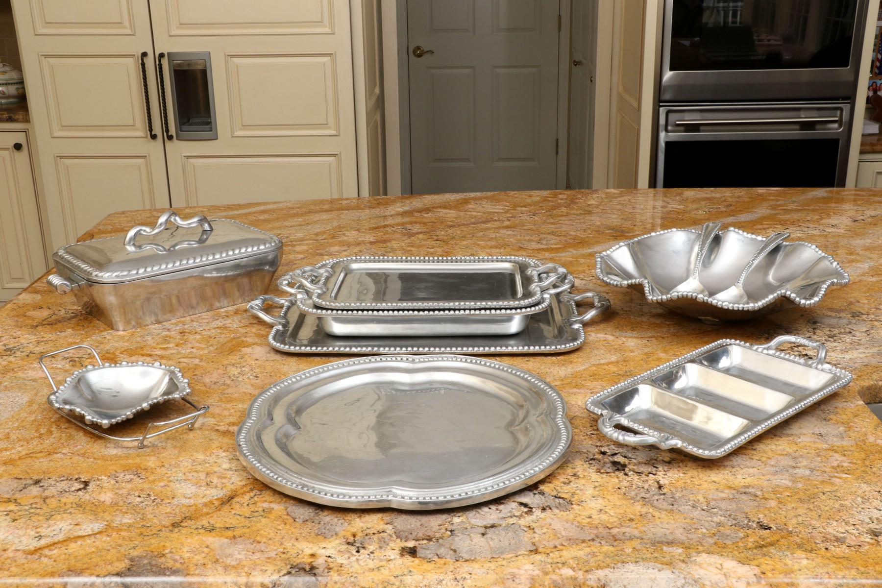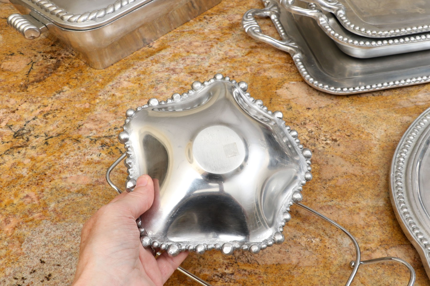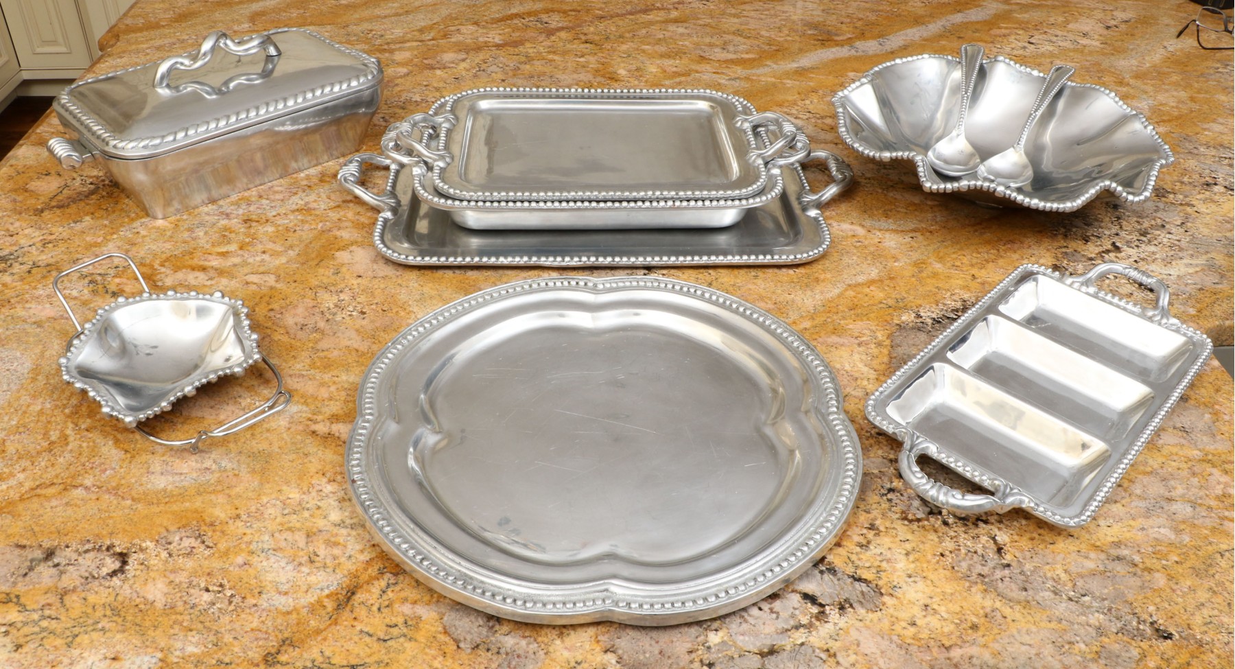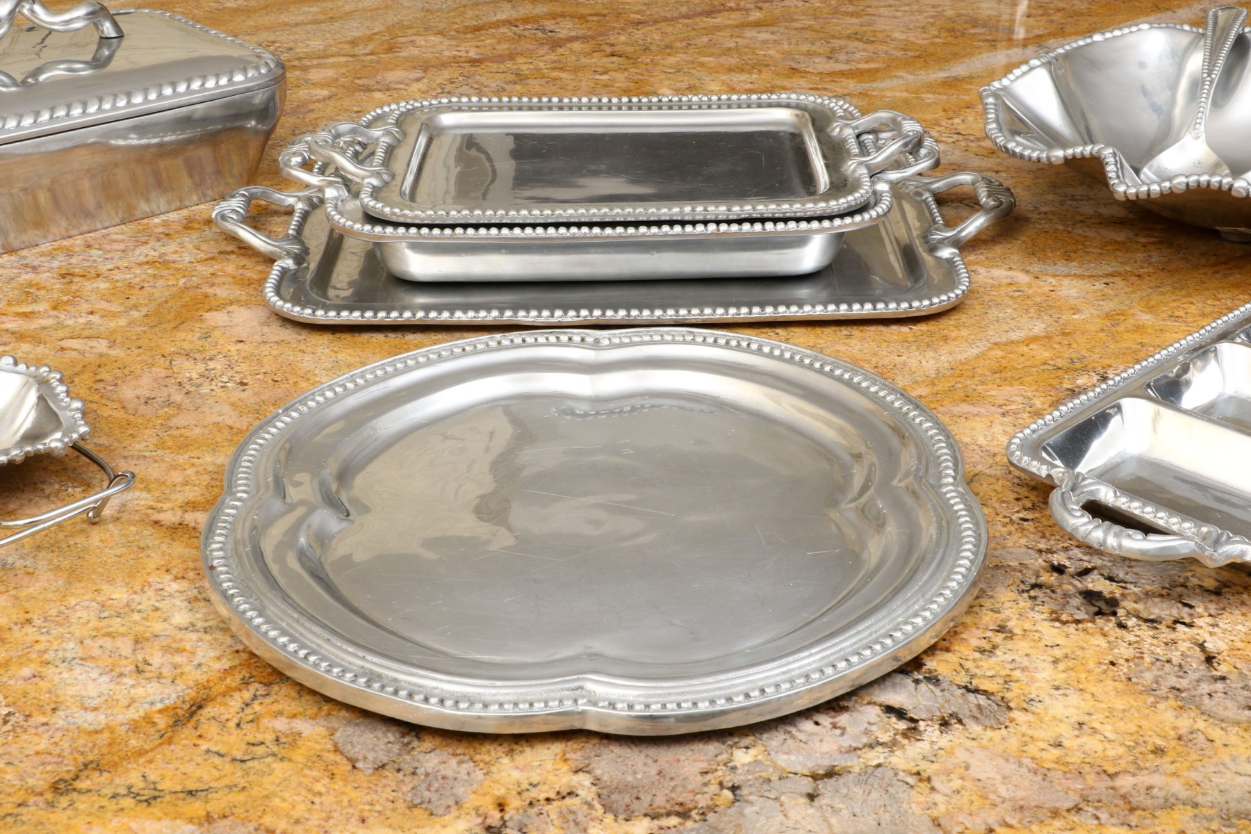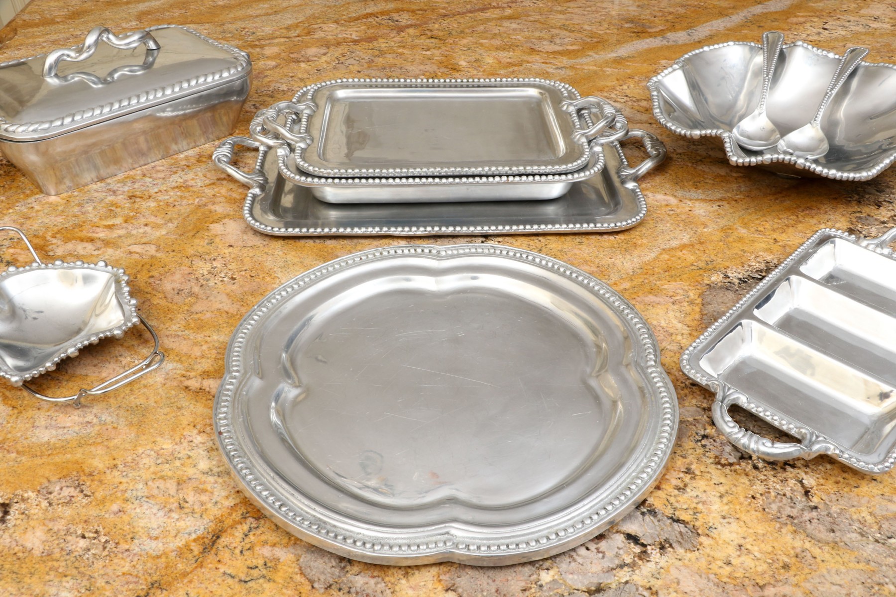 An assortment of ten Mexican aluminum serving pieces. Comprised of a two handled serving tray, a smaller two handled serving tray, a two handled serving bowl, a small asymmetrical serving bowl, a lidded two handled serving tureen, a two handled partitioned serving tray, a quatrefoil form serving tray, a fabulous asymmetrical salad bowl and salad servers including a spoon and fork. All with fabulous beaded trims. Some marked Mariposa Brillante, others with labels marked Perlado.