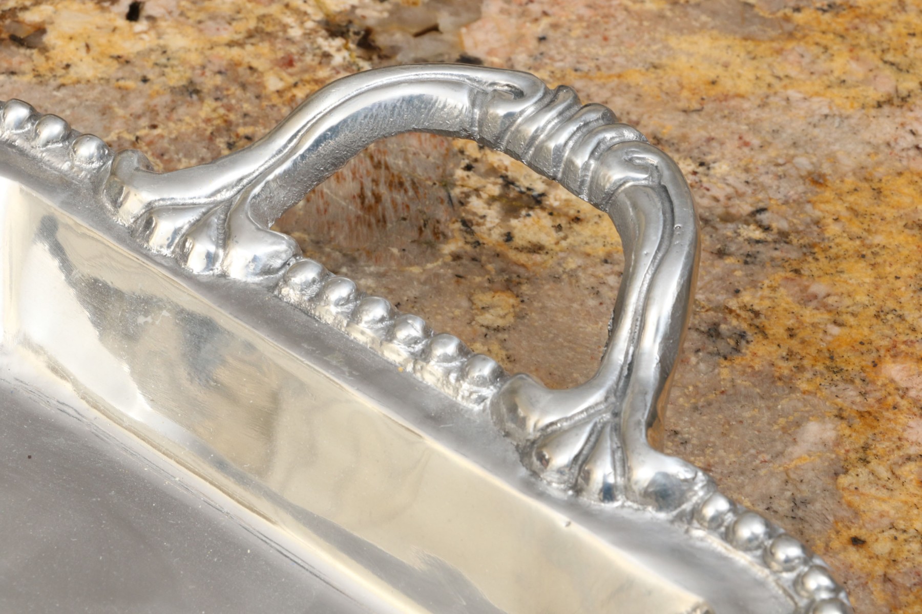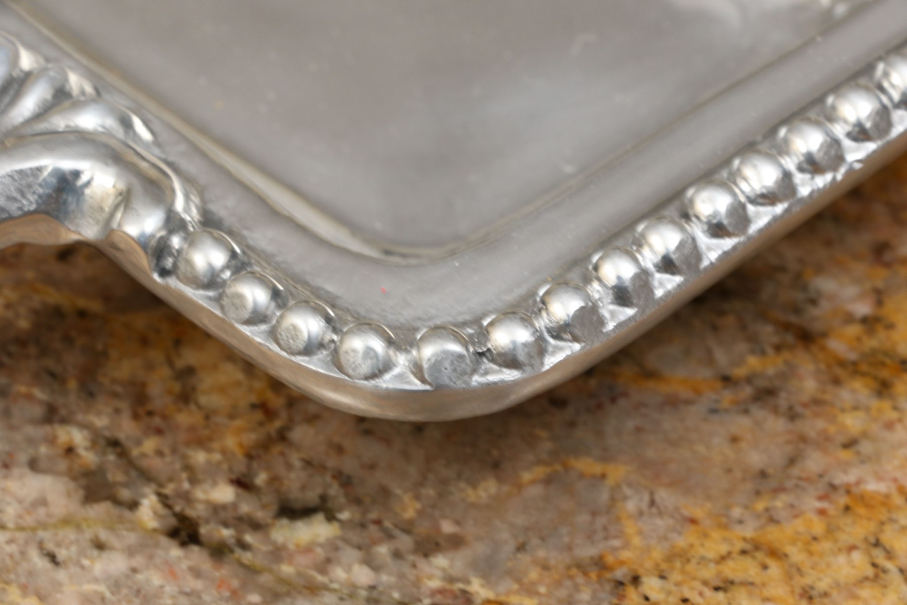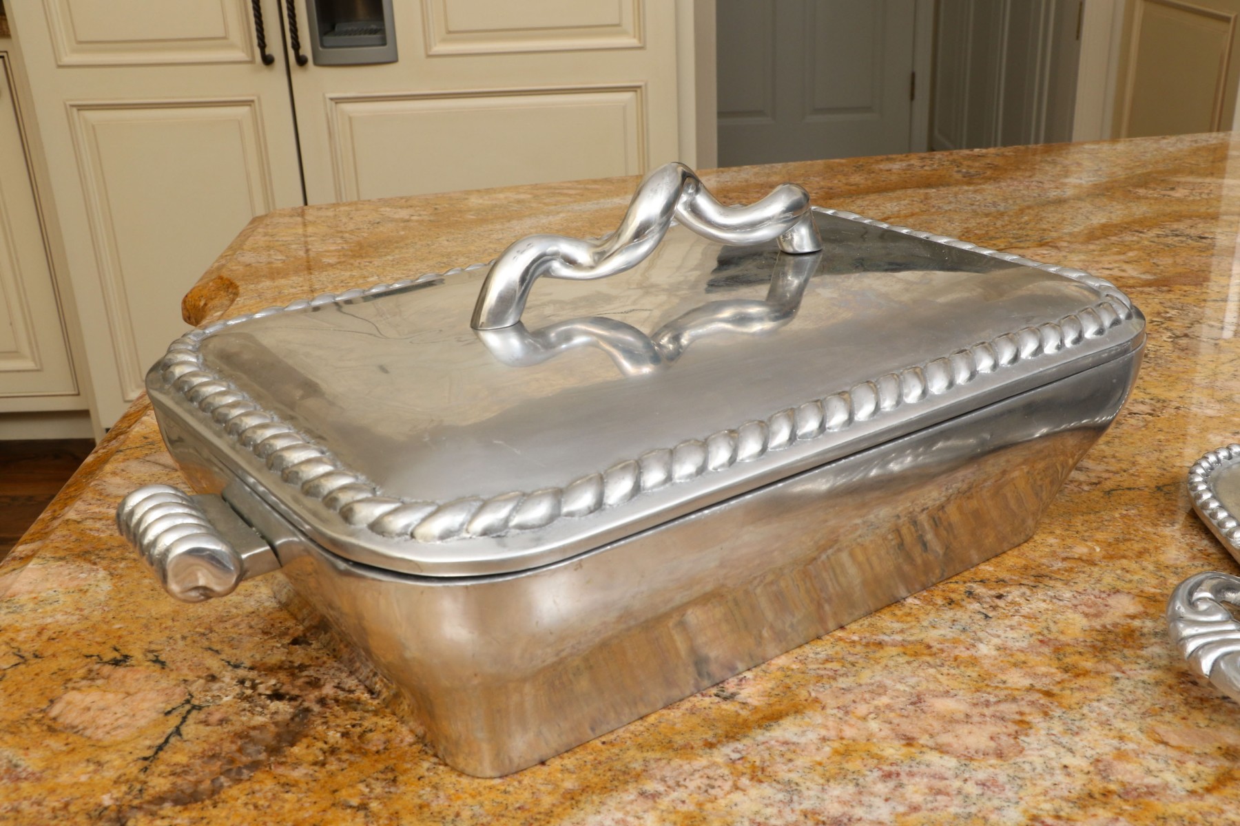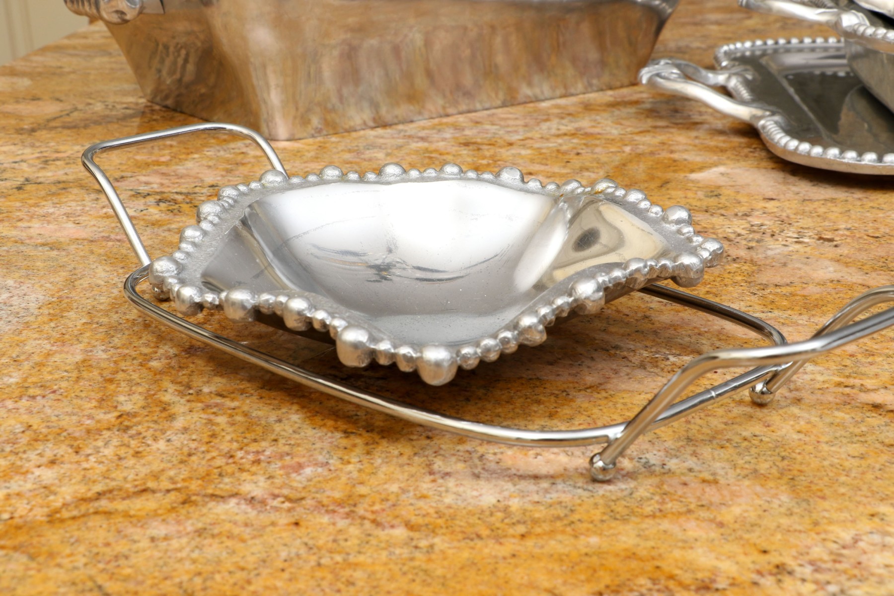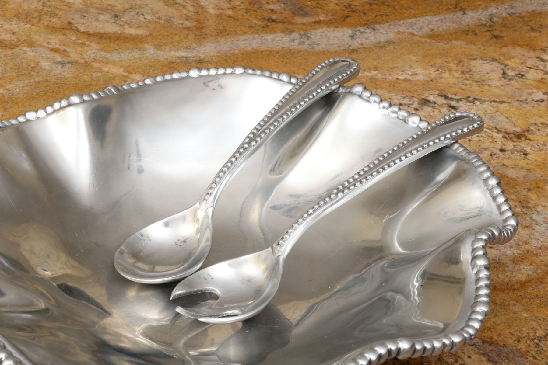 An assortment of ten Mexican aluminum serving pieces. Comprised of a two handled serving tray, a smaller two handled serving tray, a two handled serving bowl, a small asymmetrical serving bowl, a lidded two handled serving tureen, a two handled partitioned serving tray, a quatrefoil form serving tray, a fabulous asymmetrical salad bowl and salad servers including a spoon and fork. All with fabulous beaded trims. Some marked Mariposa Brillante, others with labels marked Perlado.
