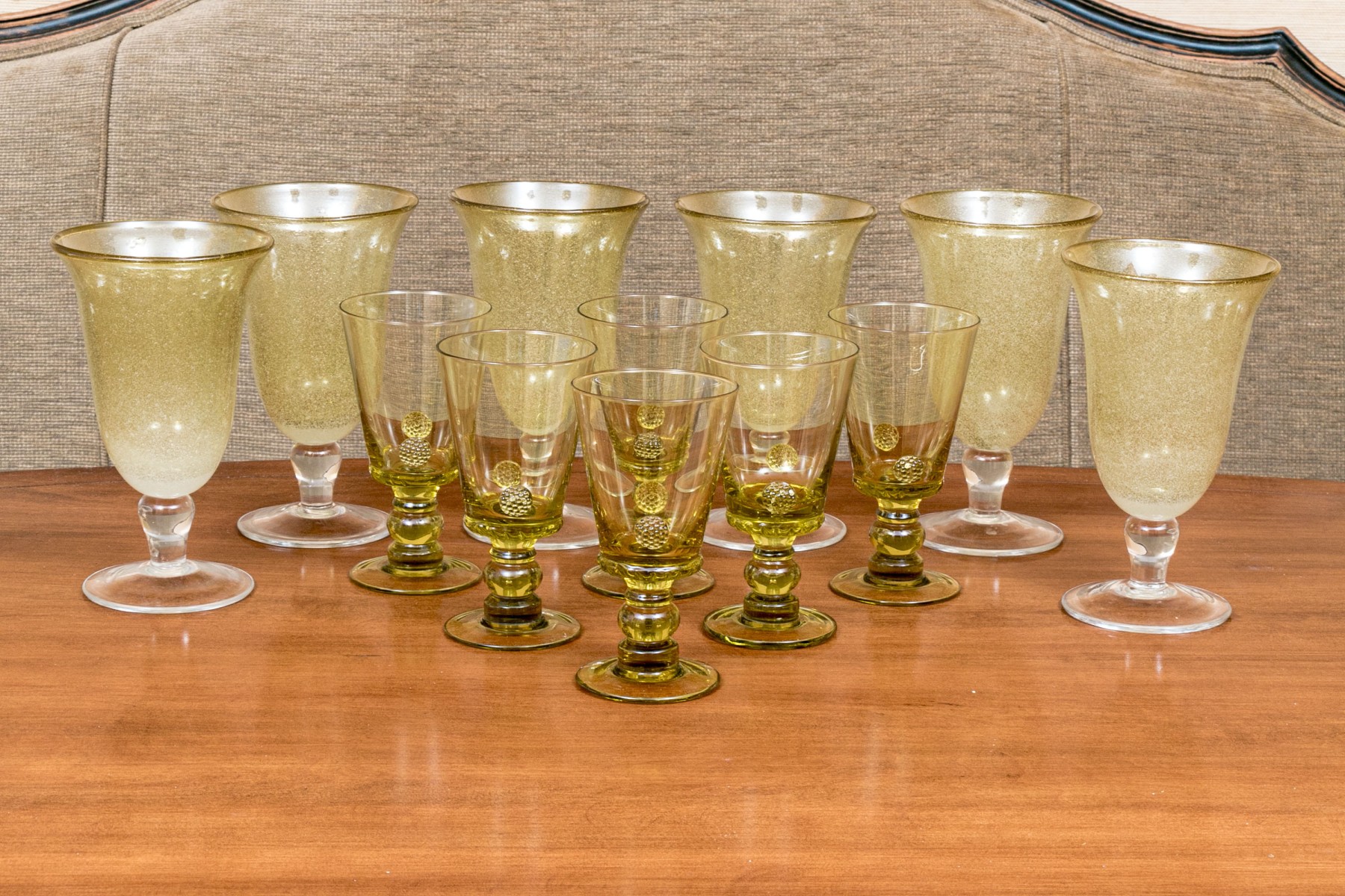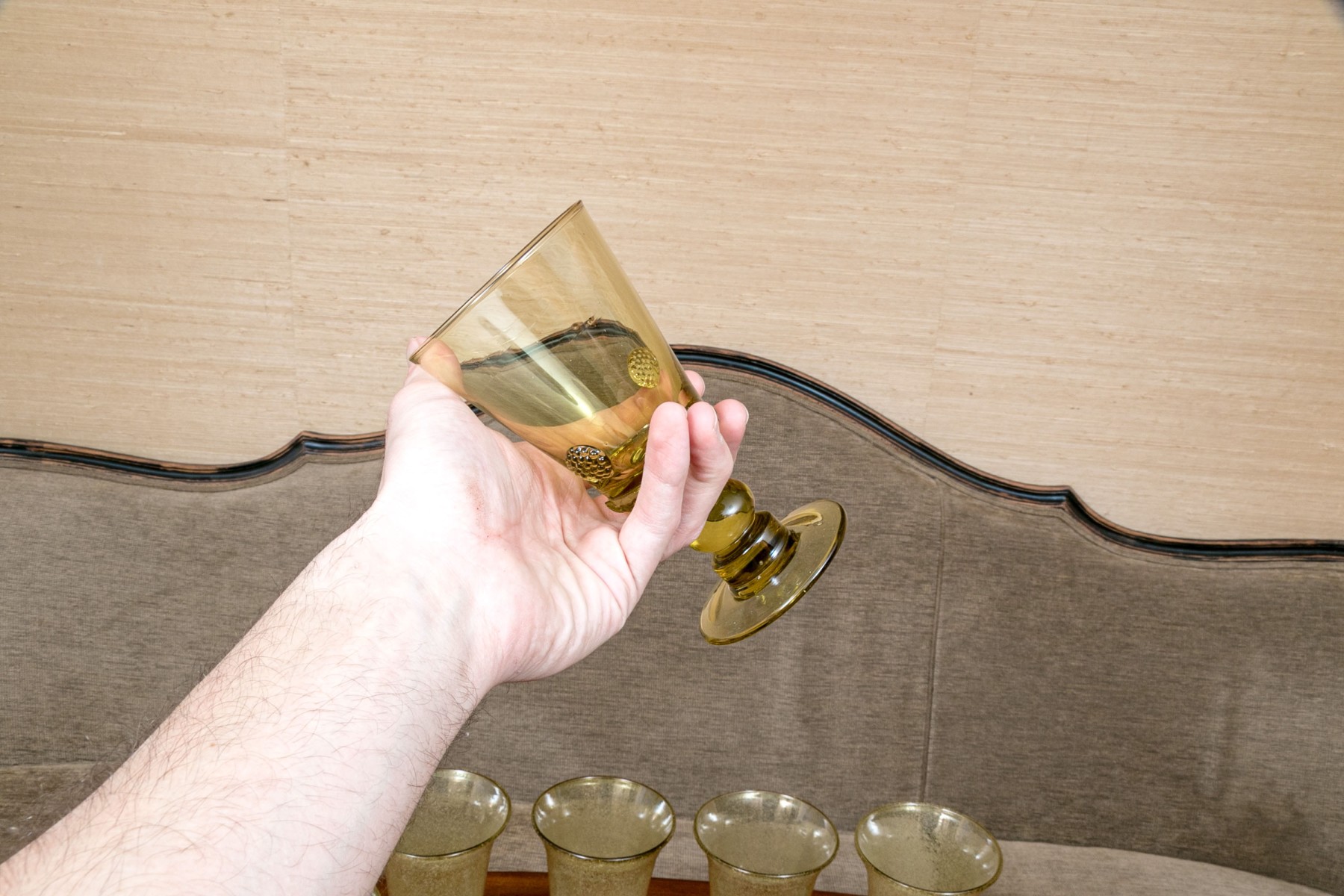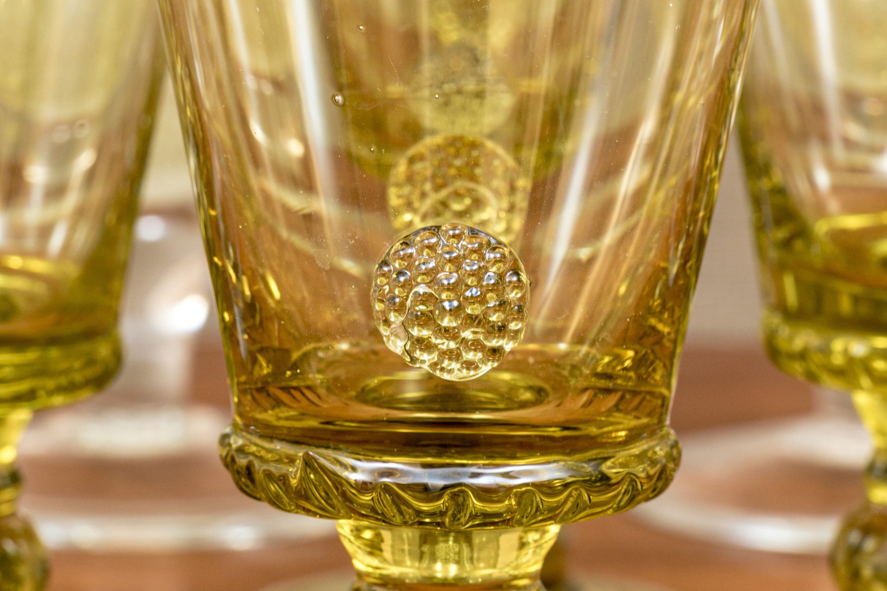 Comprised of 6 bubble suffused, taller goblets with 6 shorter goblets with moulded grape clusters in relief.