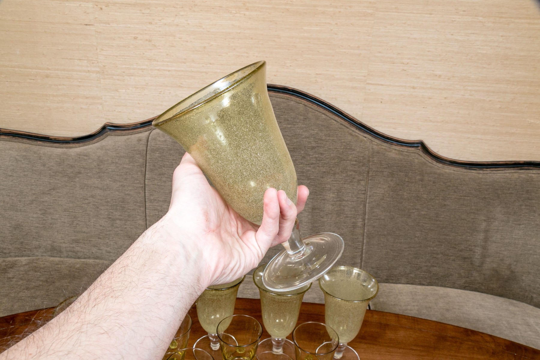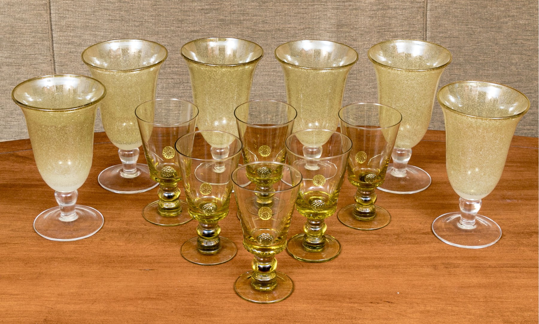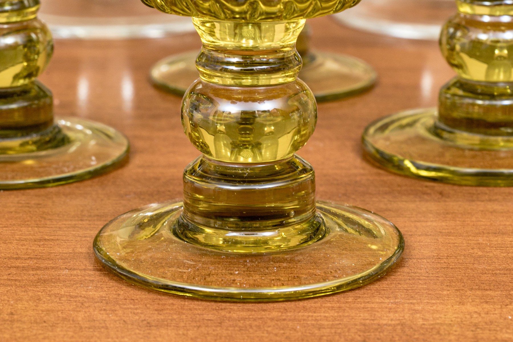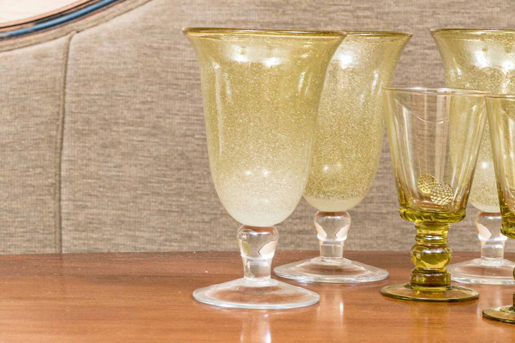Comprised of 6 bubble suffused, taller goblets with 6 shorter goblets with moulded grape clusters in relief.