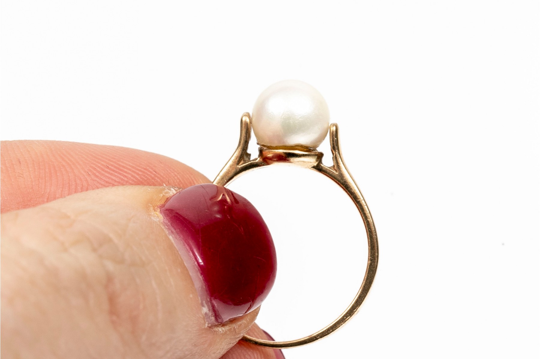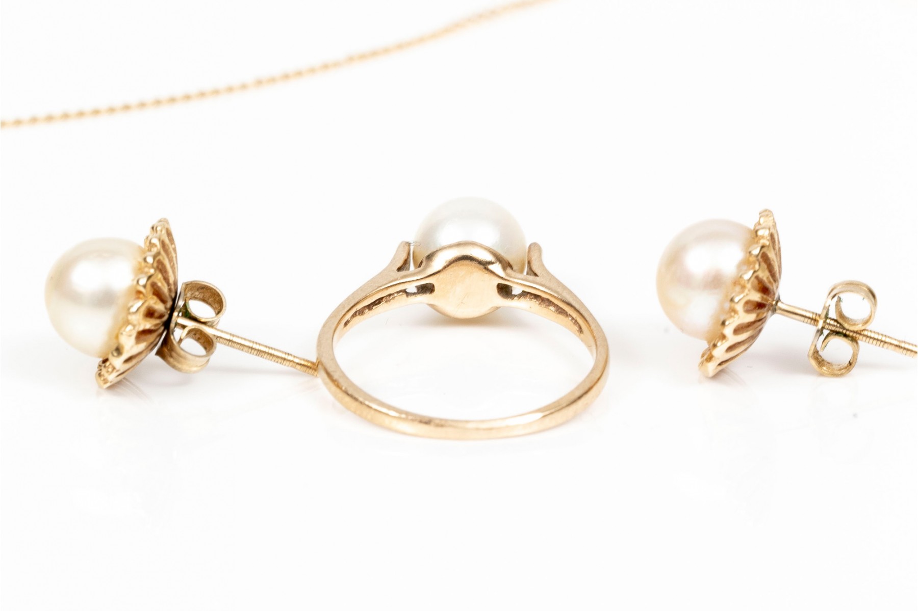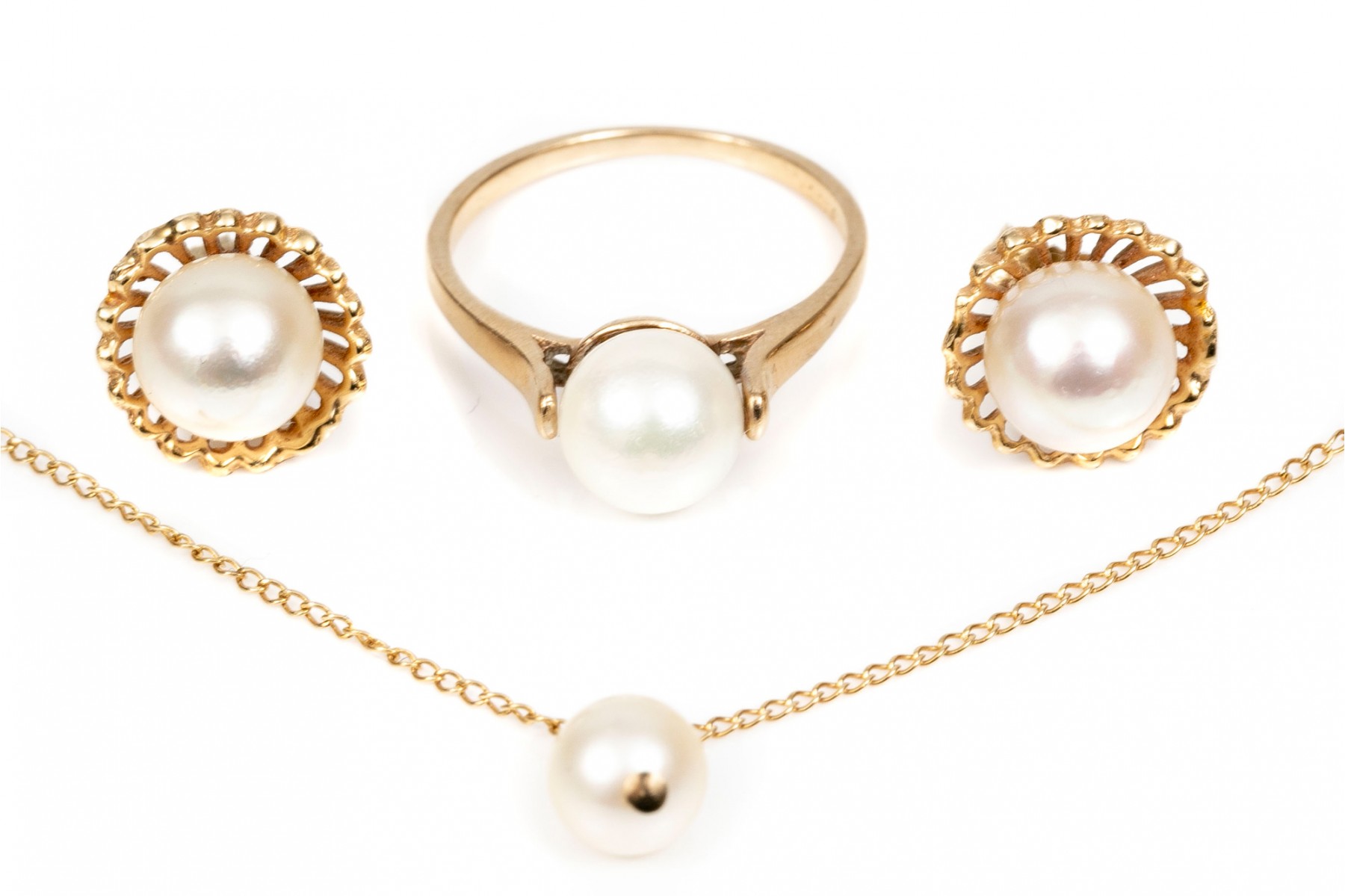 A collection of 14K and cultured freshwater pearl jewelry. Necklace with 6mm pearl pendant. Simple ring with pearl, 7.5mm, size 6. Stud earrings with 7.7mm pearls, post and clutch backings.