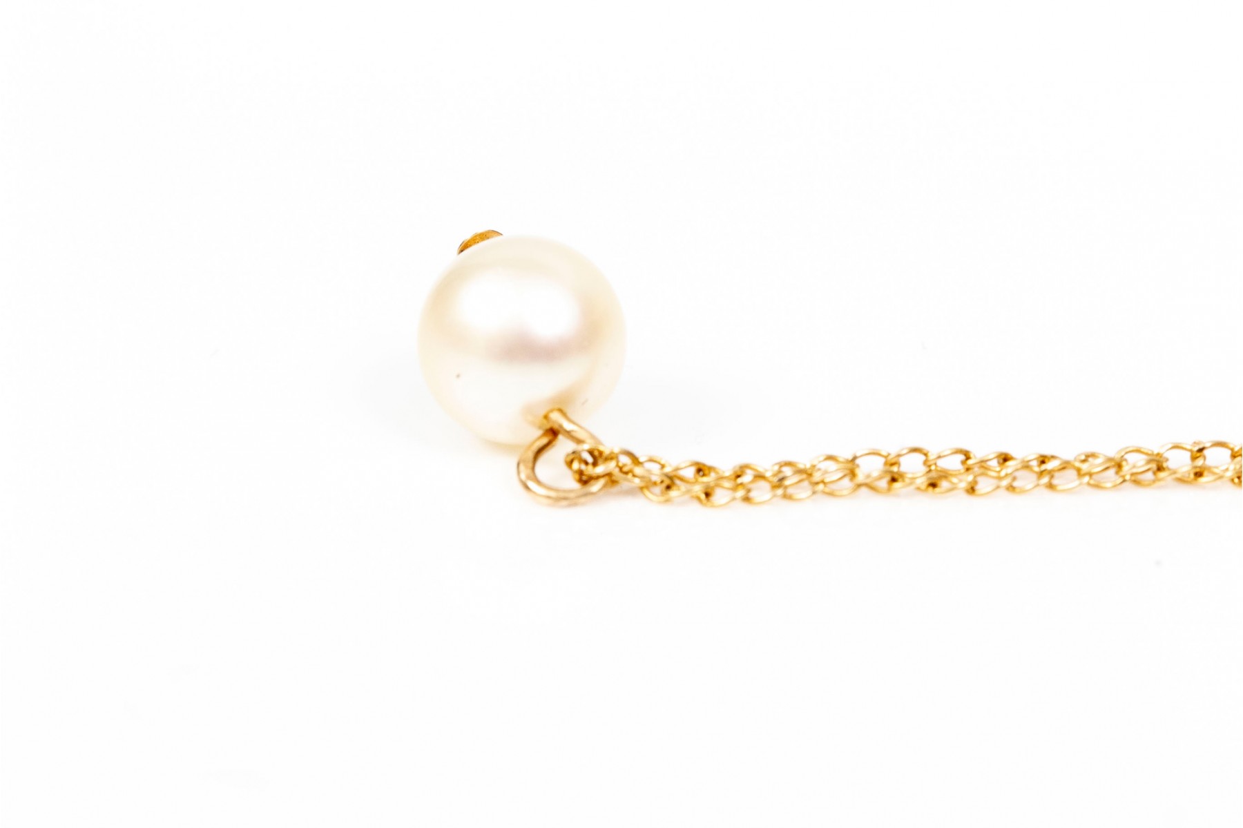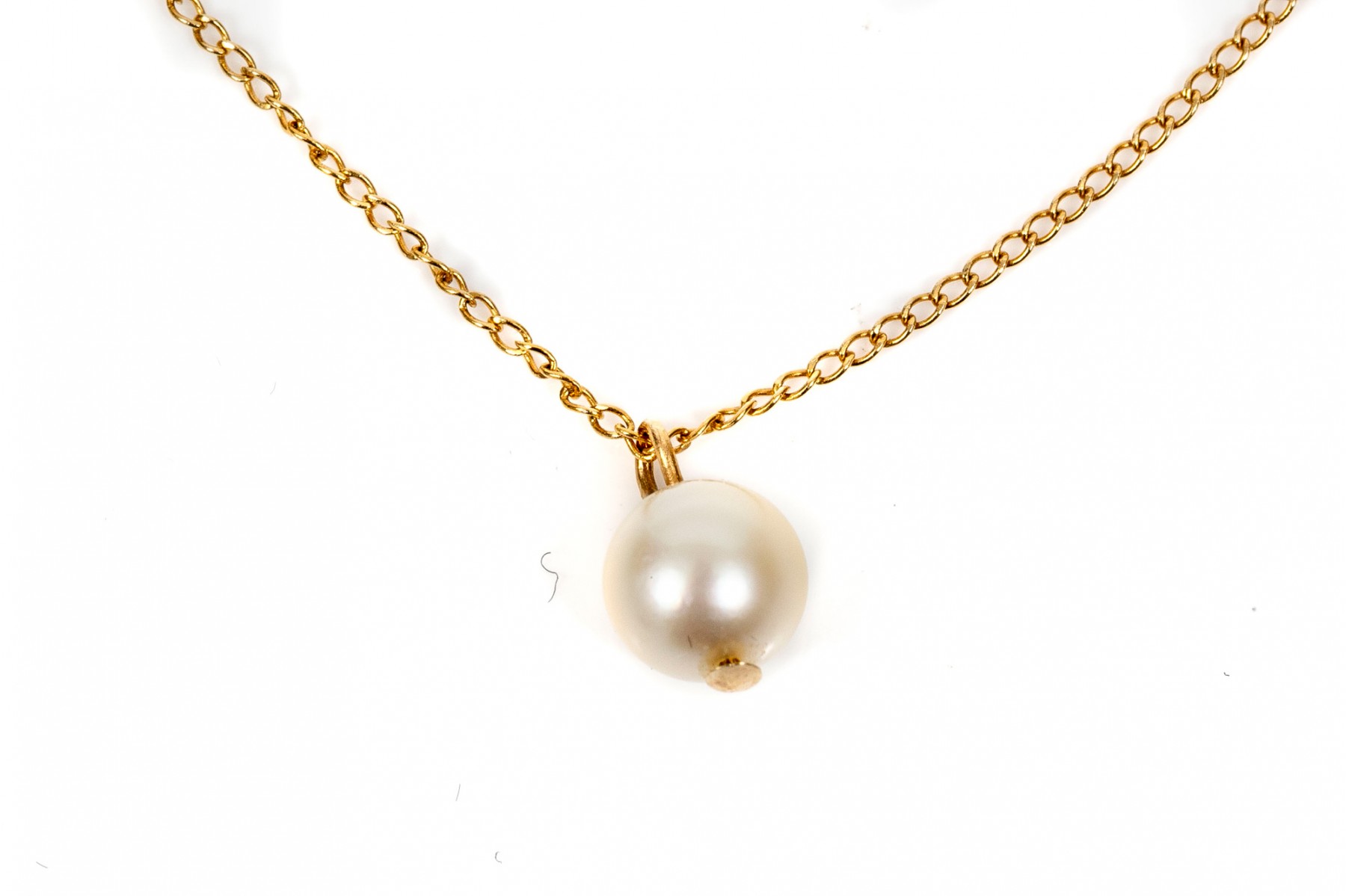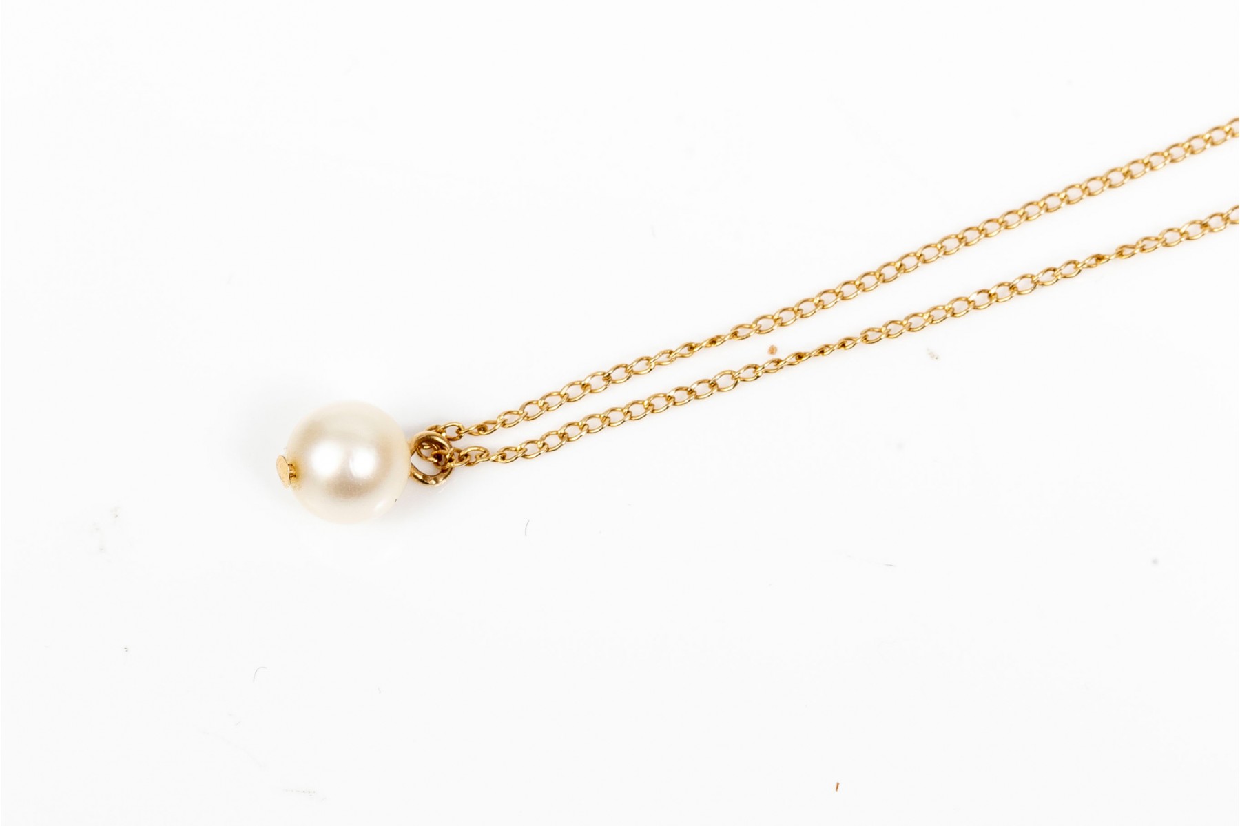 A collection of 14K and cultured freshwater pearl jewelry. Necklace with 6mm pearl pendant. Simple ring with pearl, 7.5mm, size 6. Stud earrings with 7.7mm pearls, post and clutch backings.