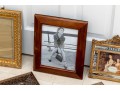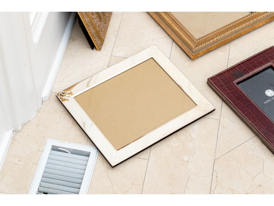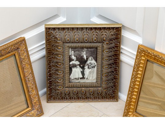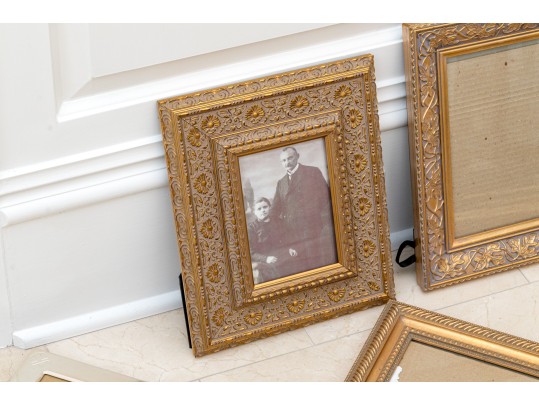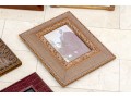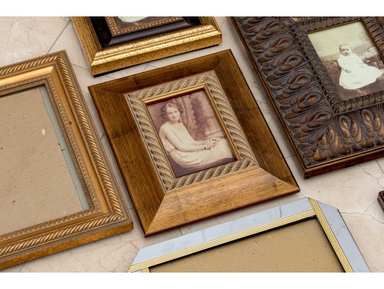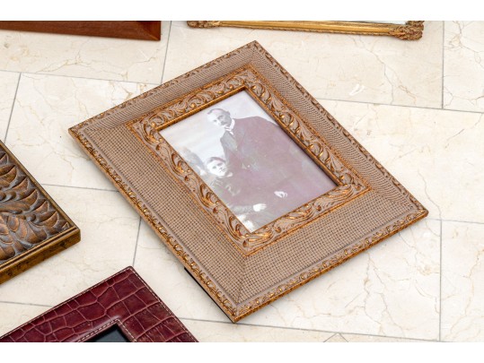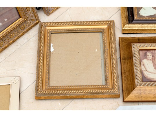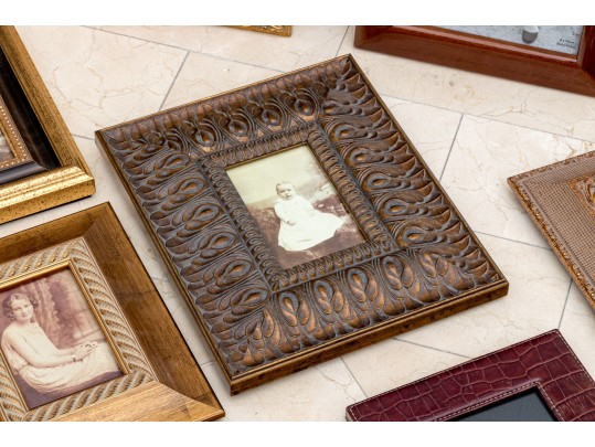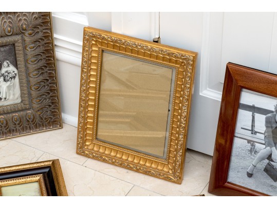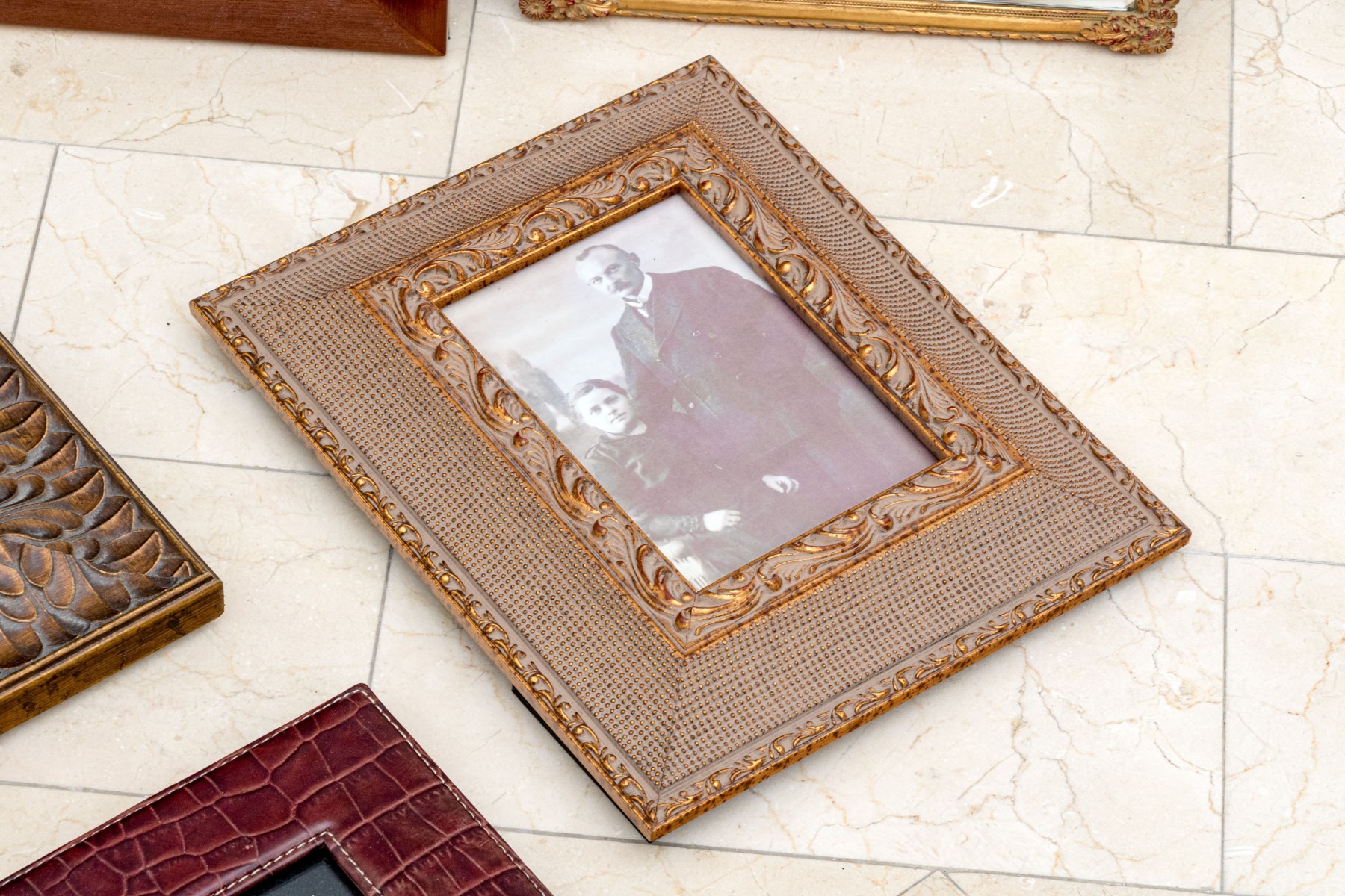 A lovely assortment of picture frames, including a mixture of gilt, metal, and leather finishes.