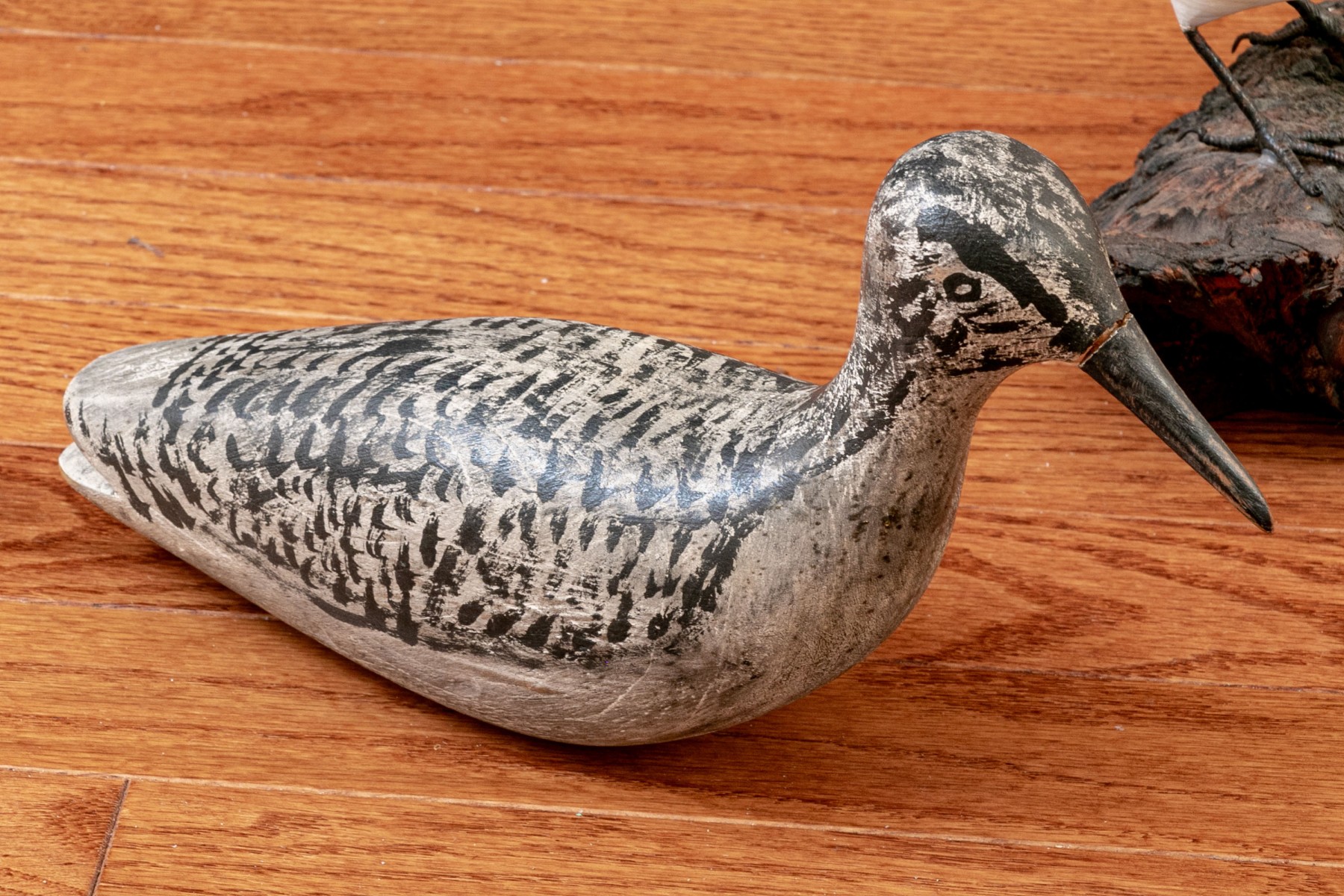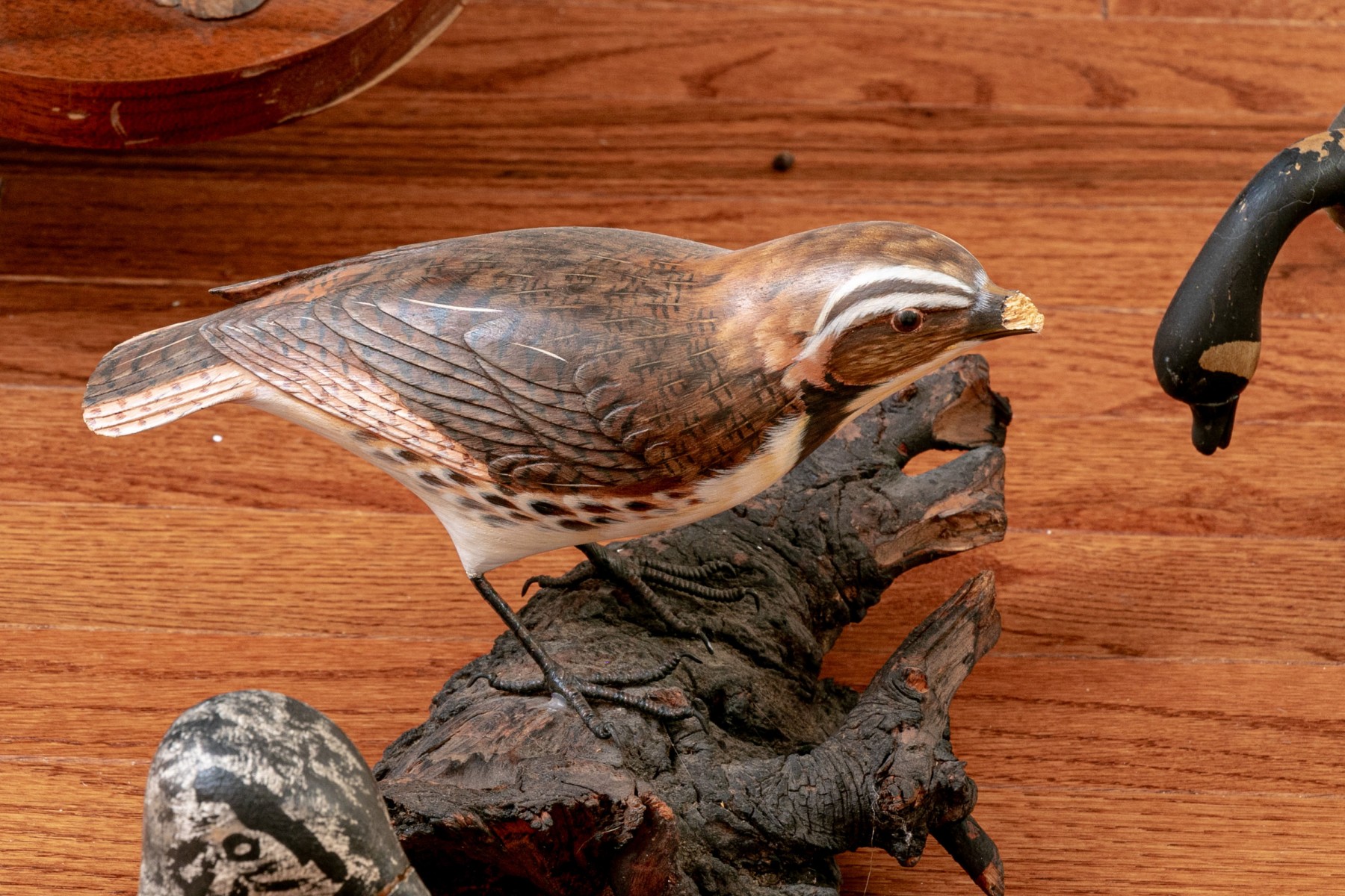 Eclectic collection of 5 assorted makers, hand carved and paint finished bird models and a decoy.