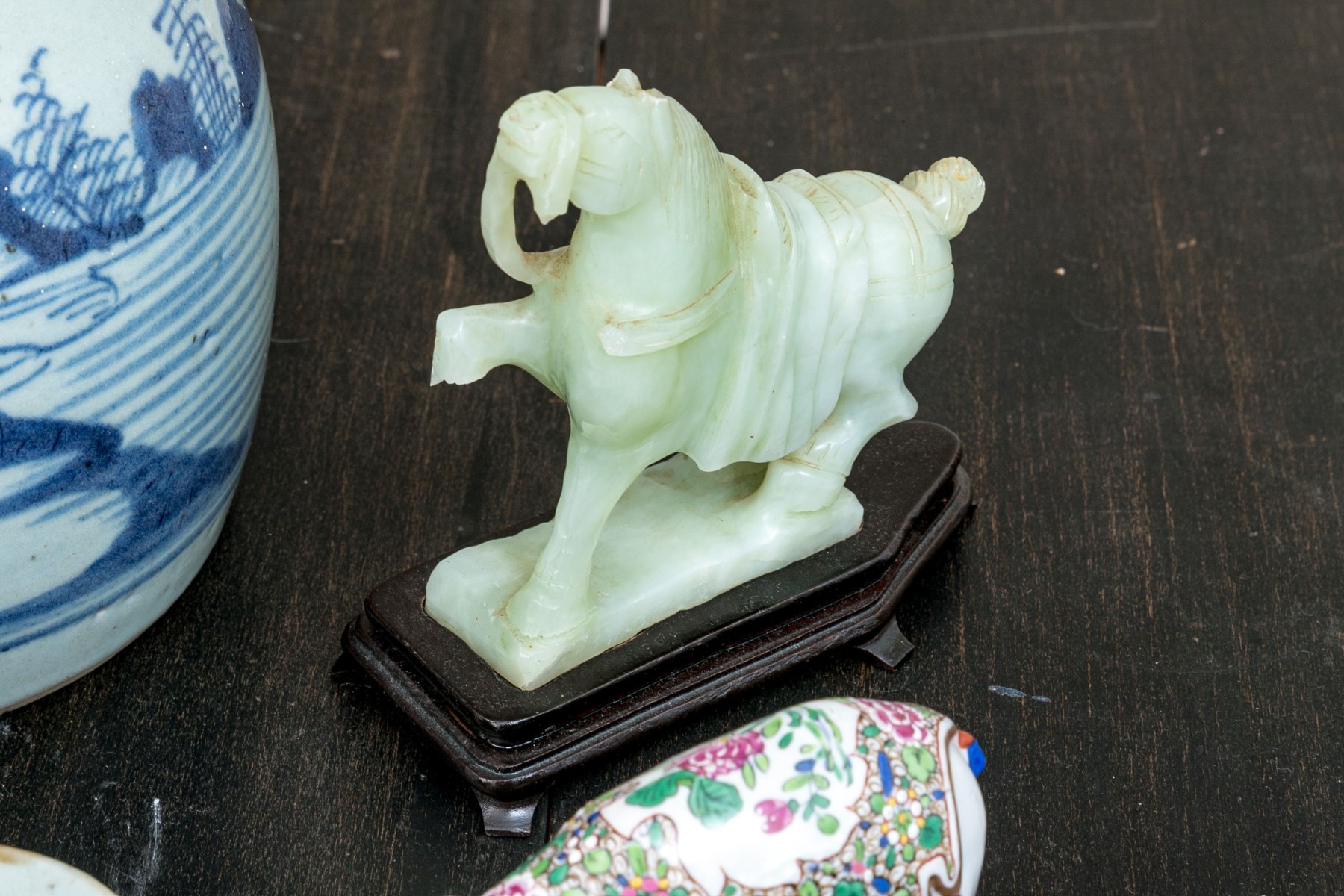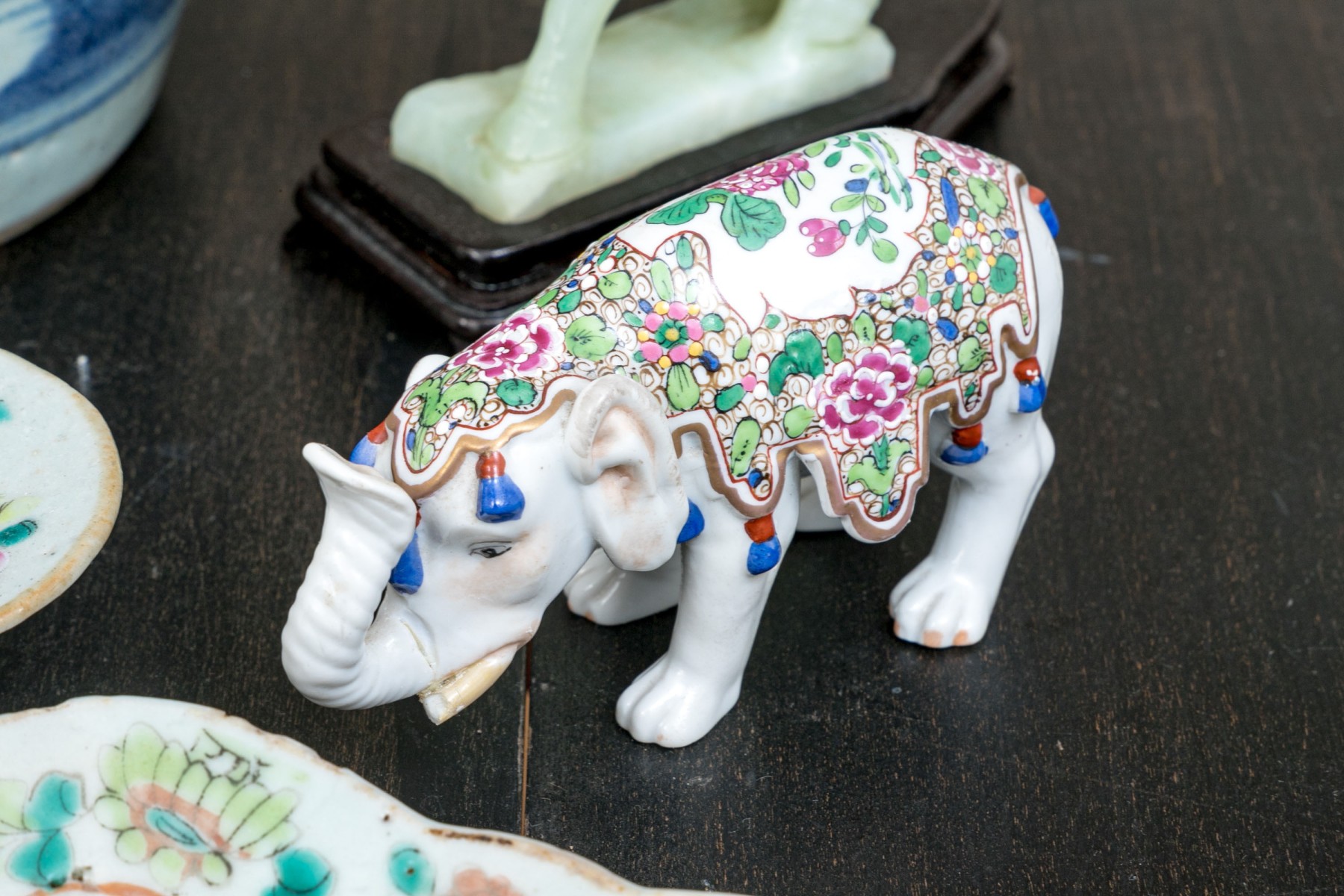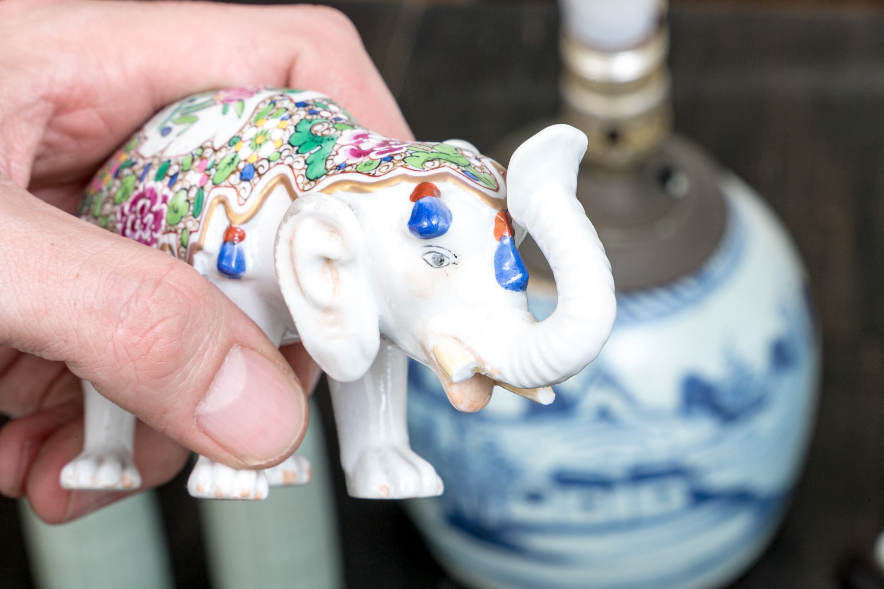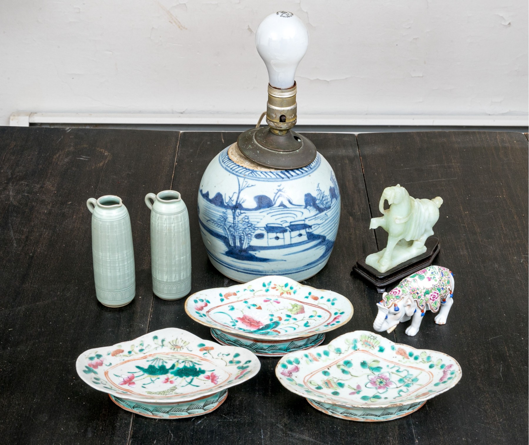 Condition: Chinese table lamp with nicks and wear to the finish with the light fixture not being centered with no harp or shade, fractures and wear to finish on the quatrefoil dishes, one of the hard stone horse's legs is broken and lost, tusks on porcelain elephant are both cracked and lost with a chip to the trunk, gentle wear to the ewers.