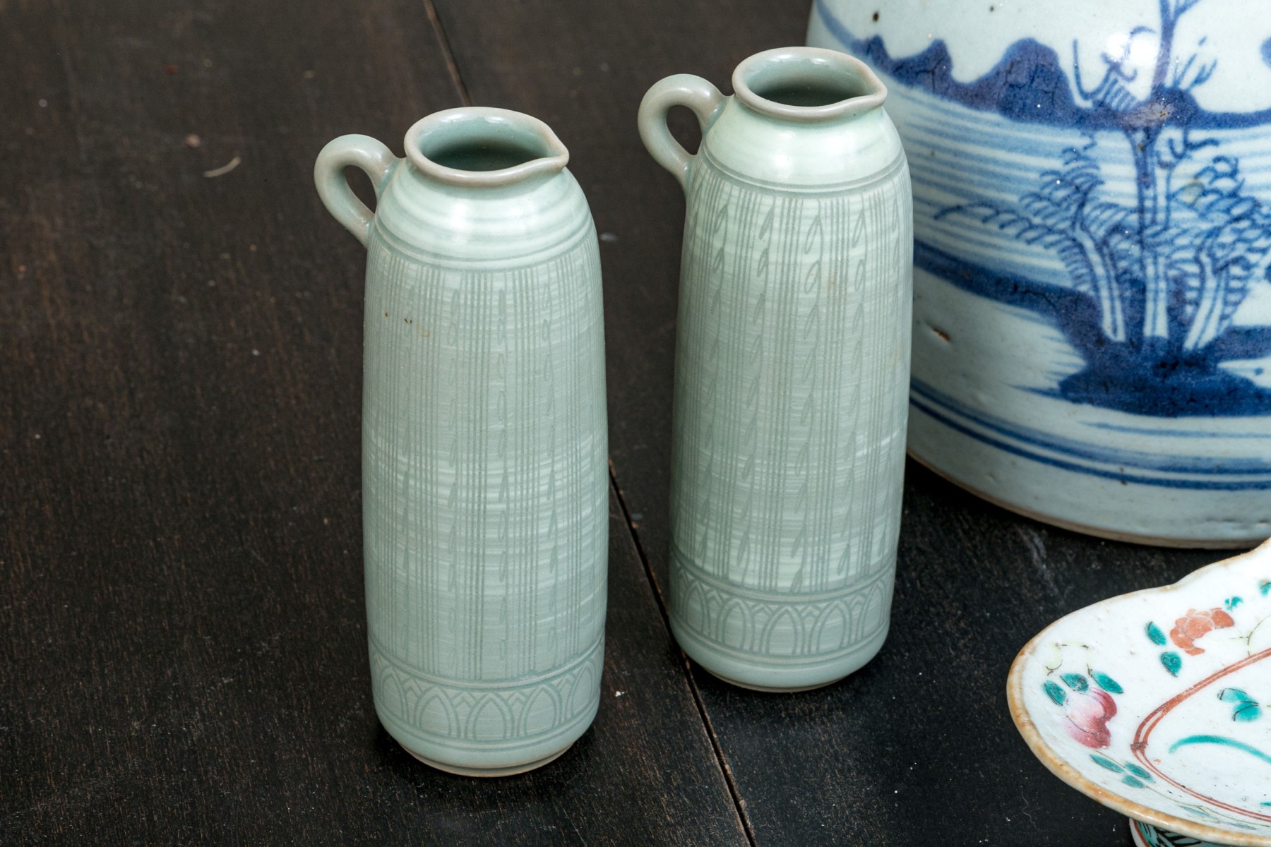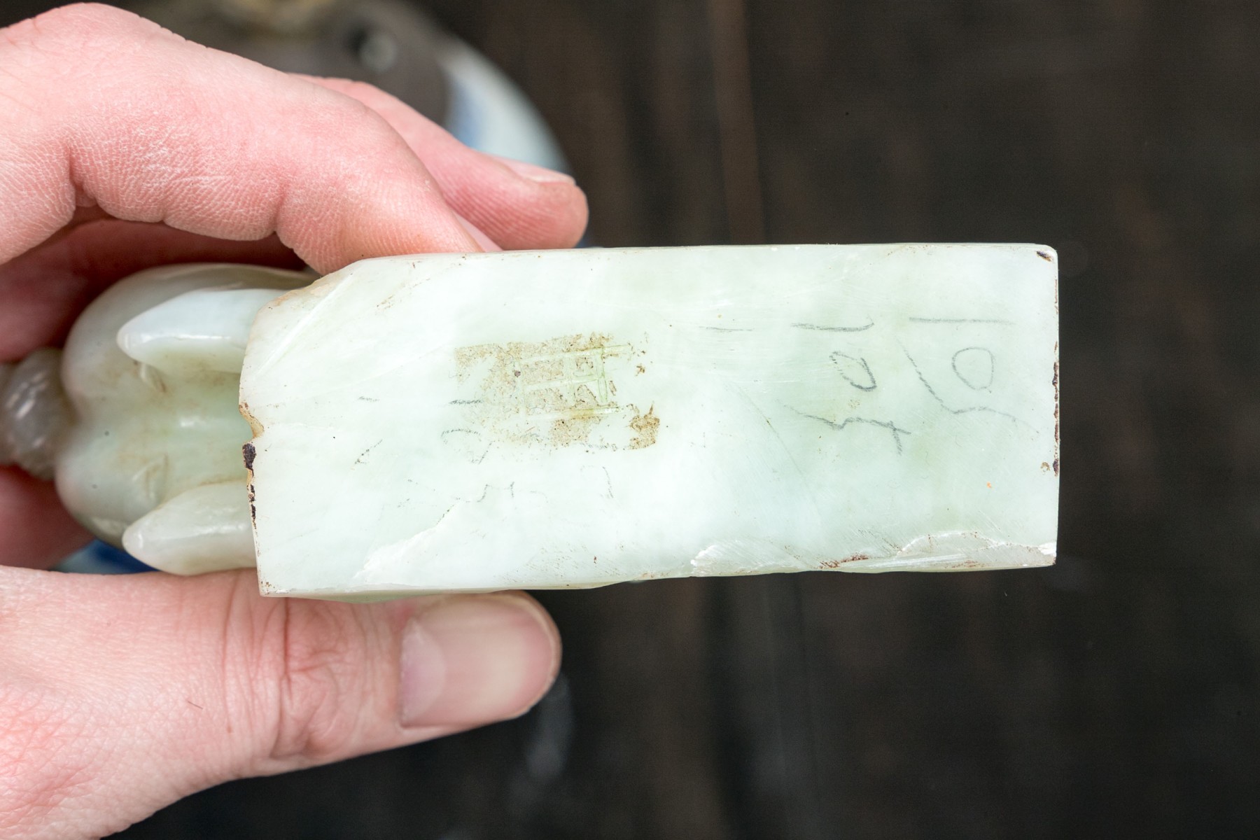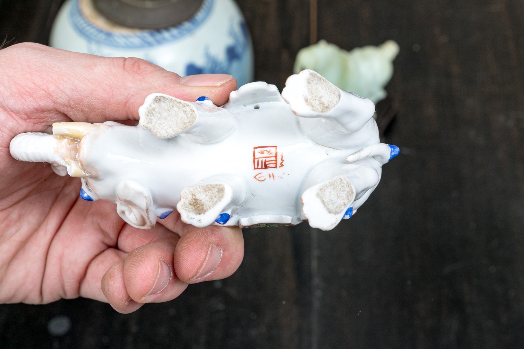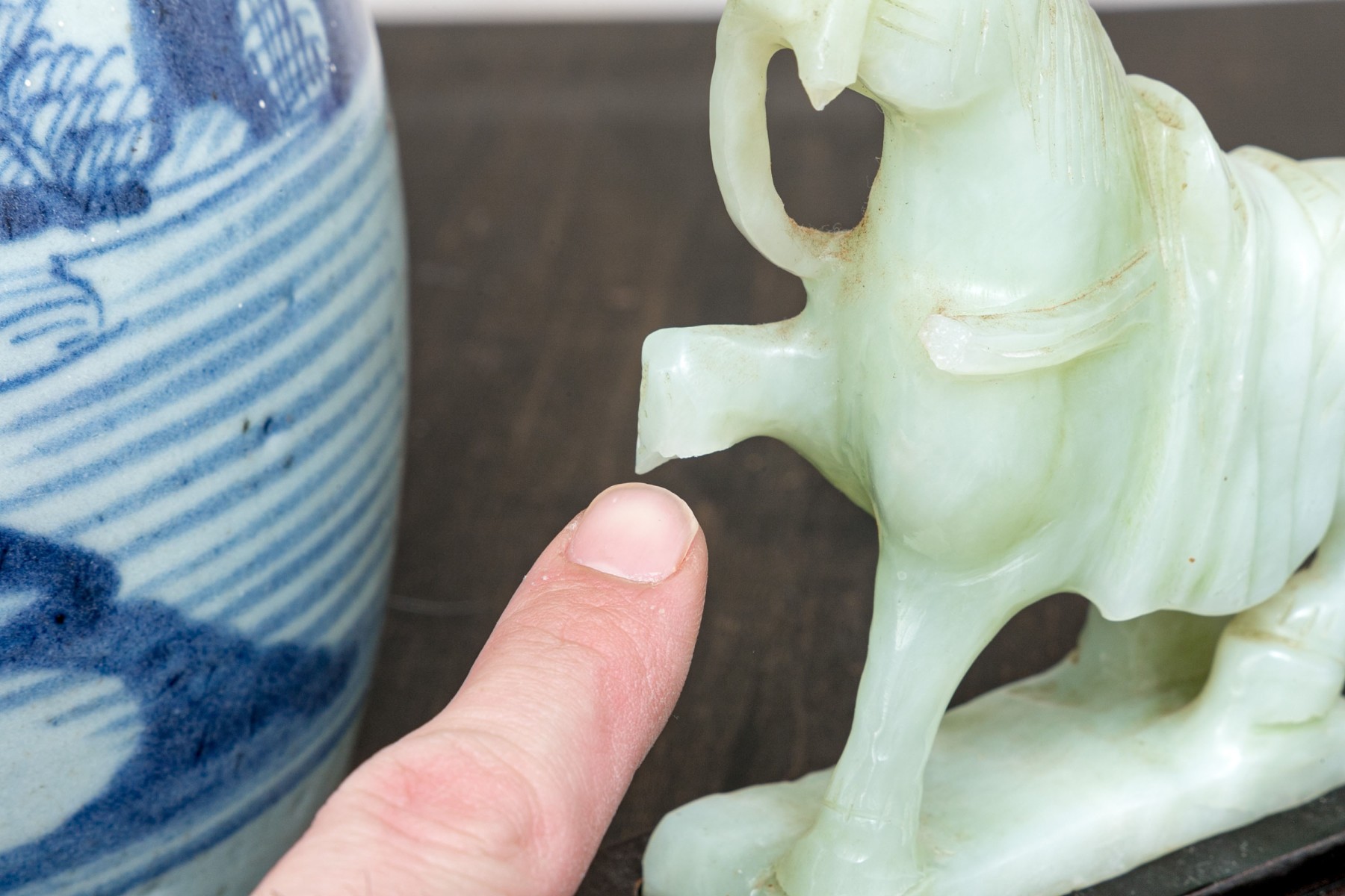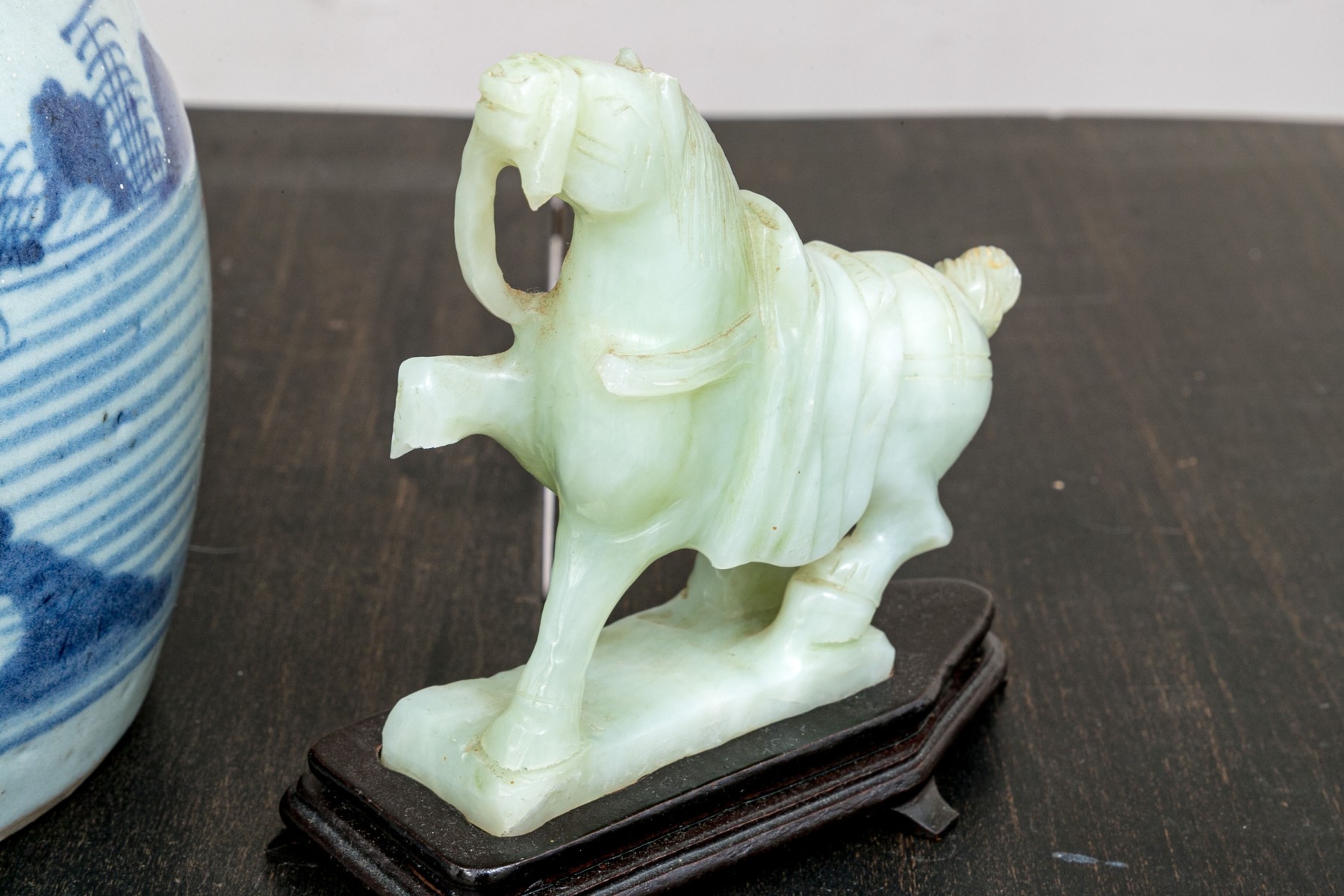 Condition: Chinese table lamp with nicks and wear to the finish with the light fixture not being centered with no harp or shade, fractures and wear to finish on the quatrefoil dishes, one of the hard stone horse's legs is broken and lost, tusks on porcelain elephant are both cracked and lost with a chip to the trunk, gentle wear to the ewers.
