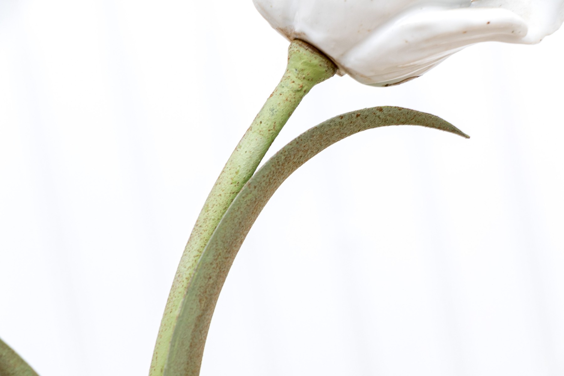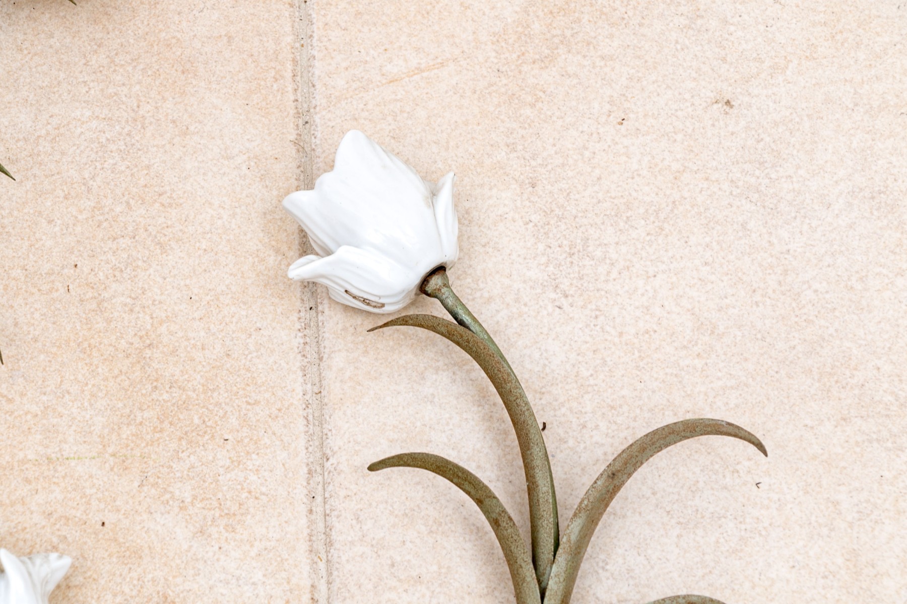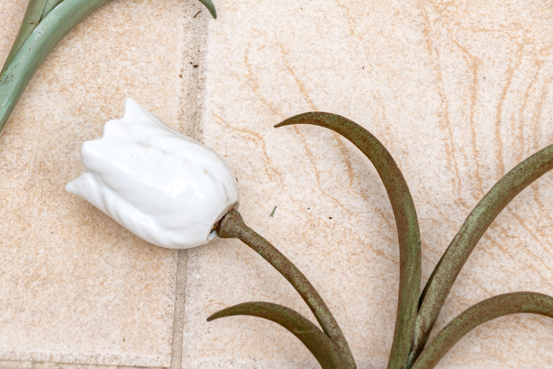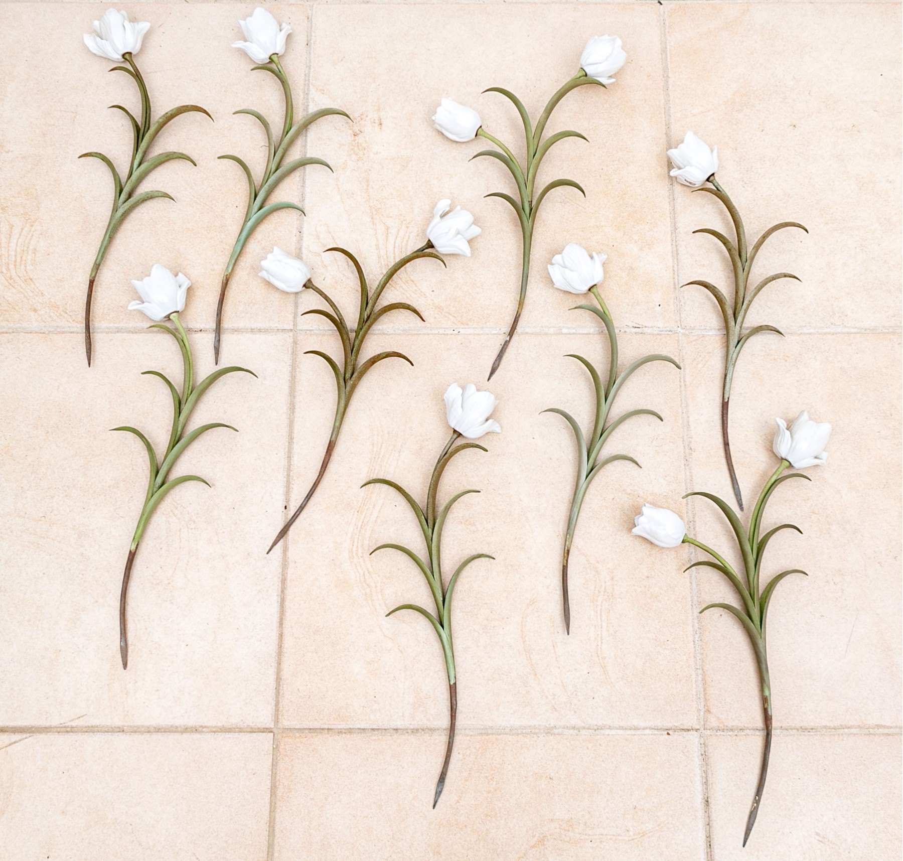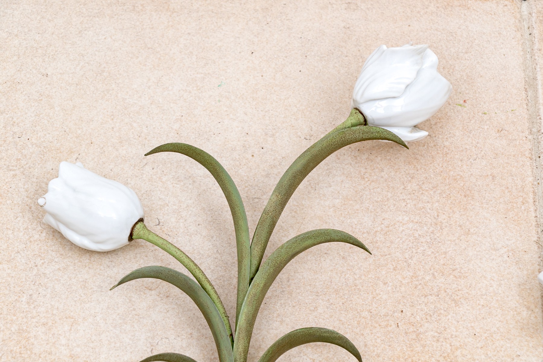 Delightful Collection of 9 porcelain and metal stemmed tulips, each intricately hand-painted to resemble white tulips.