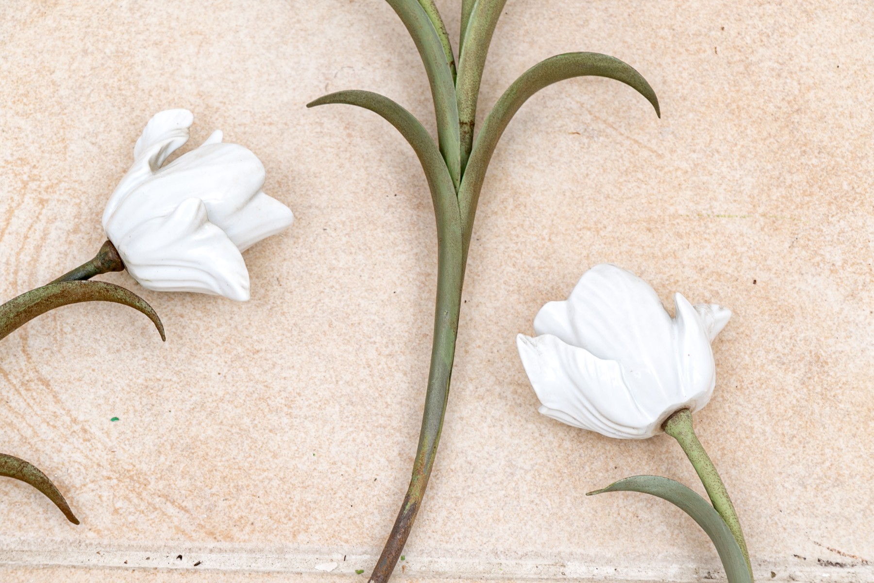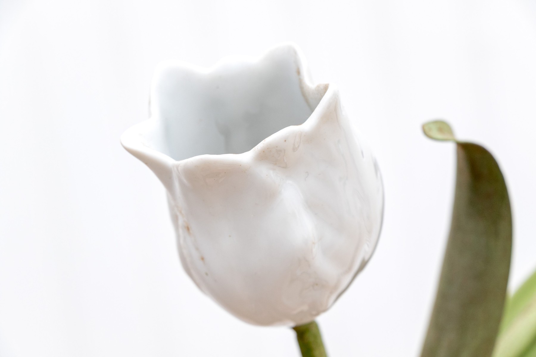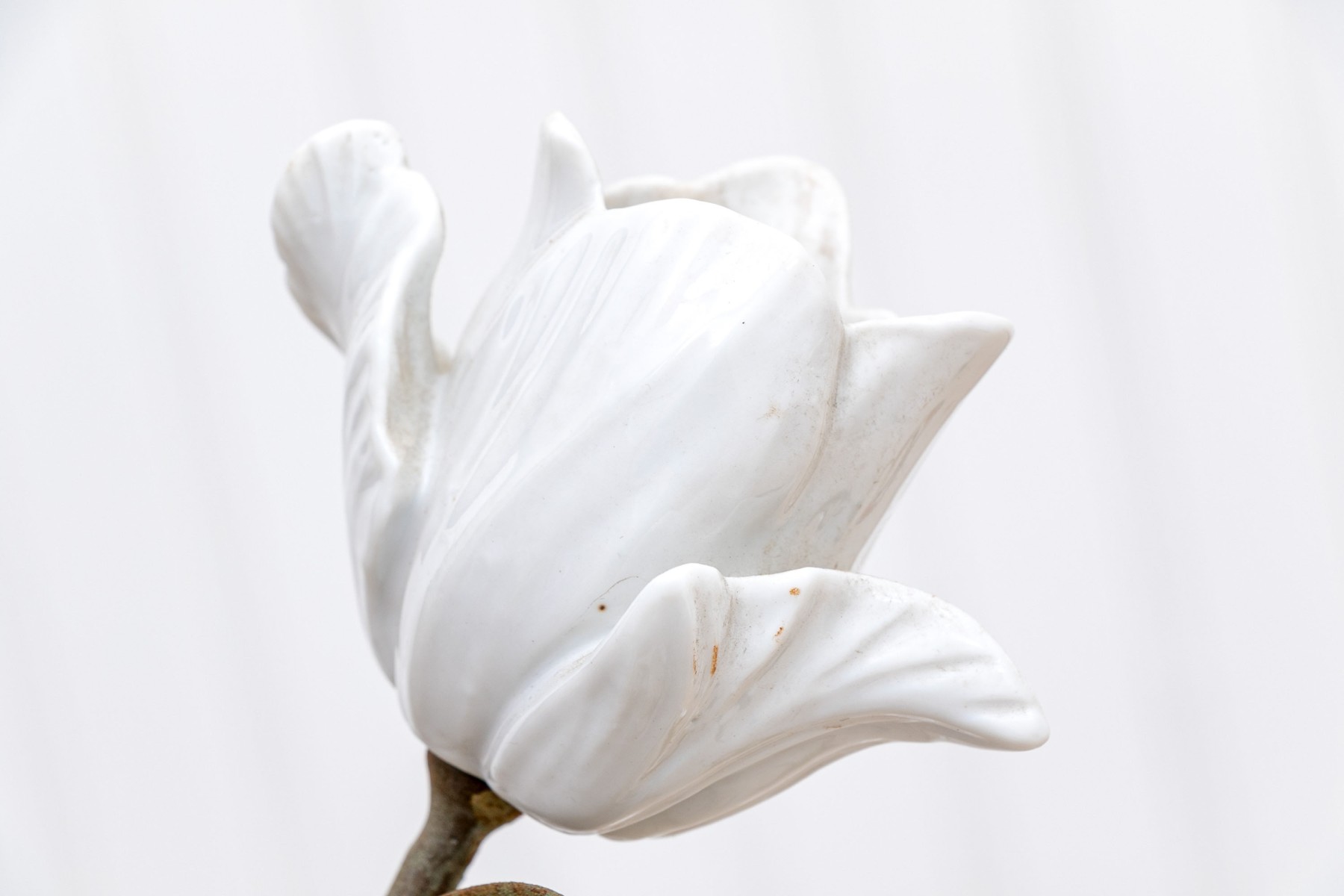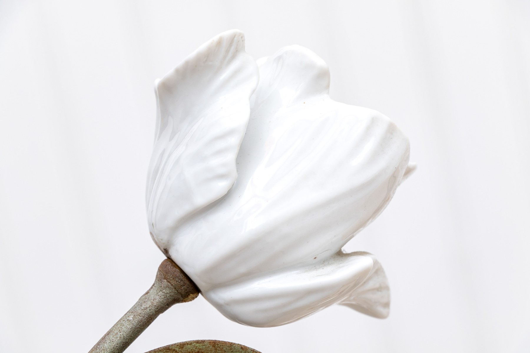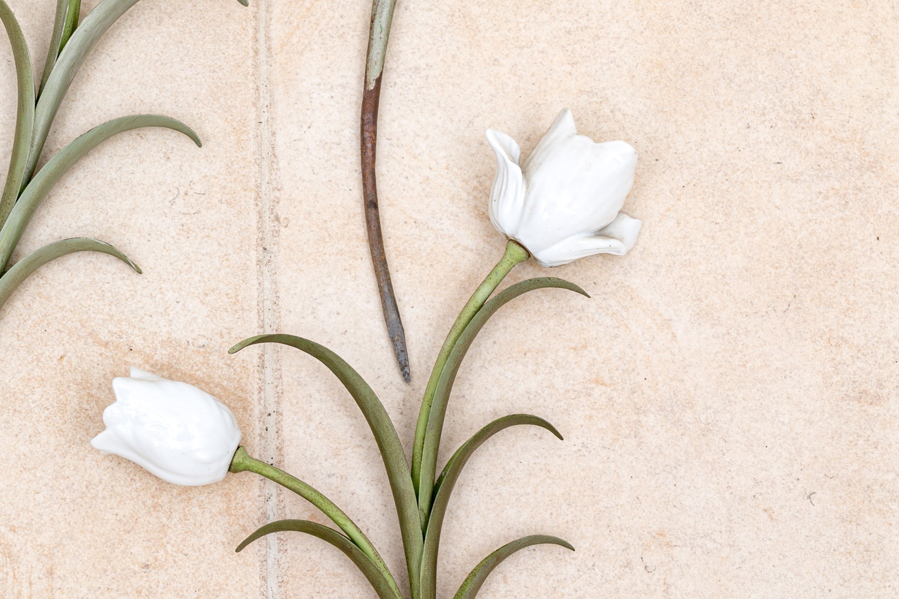 Delightful Collection of 9 porcelain and metal stemmed tulips, each intricately hand-painted to resemble white tulips.
