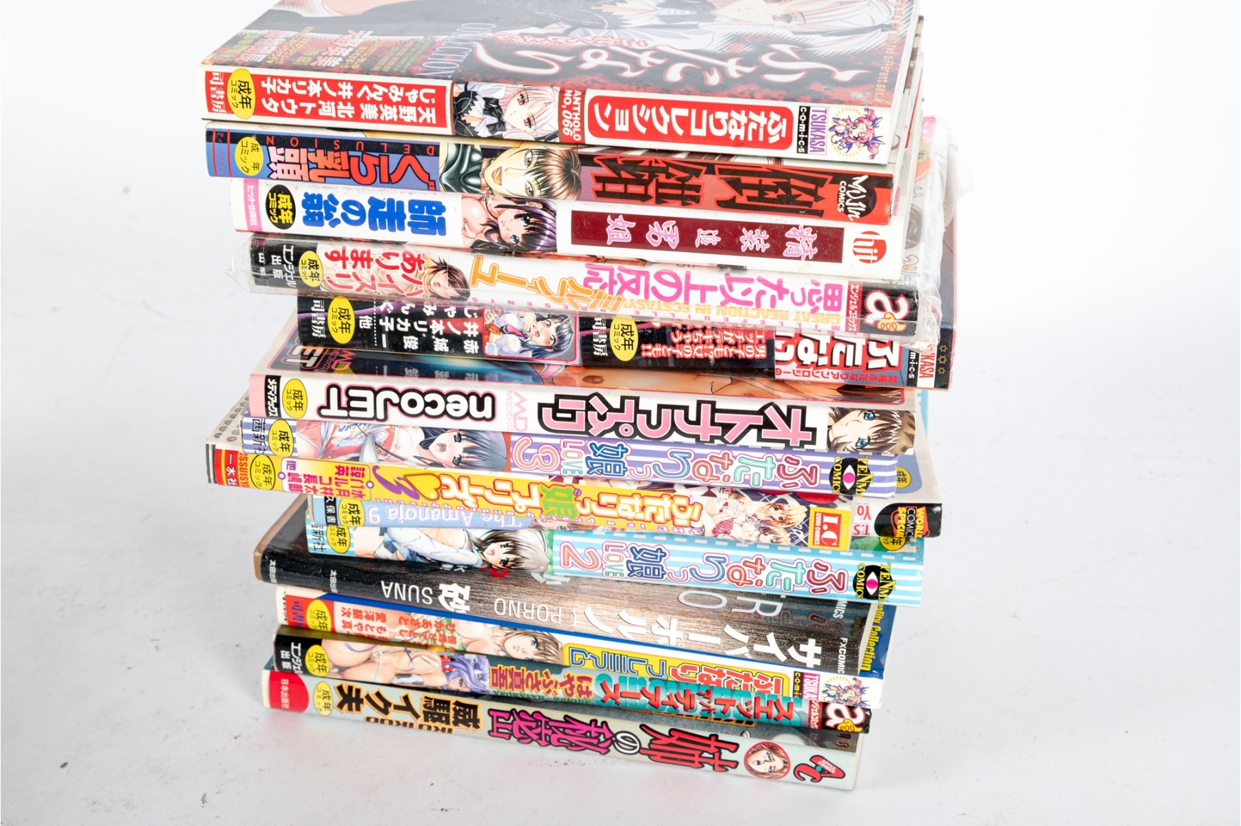 Extensive assortment of vintage and contemporary adult-themed Japanese comics and graphic novels, many in manga format. This collection includes a mix of softcover books and magazines, primarily printed in Japanese, with a few English-language titles included.