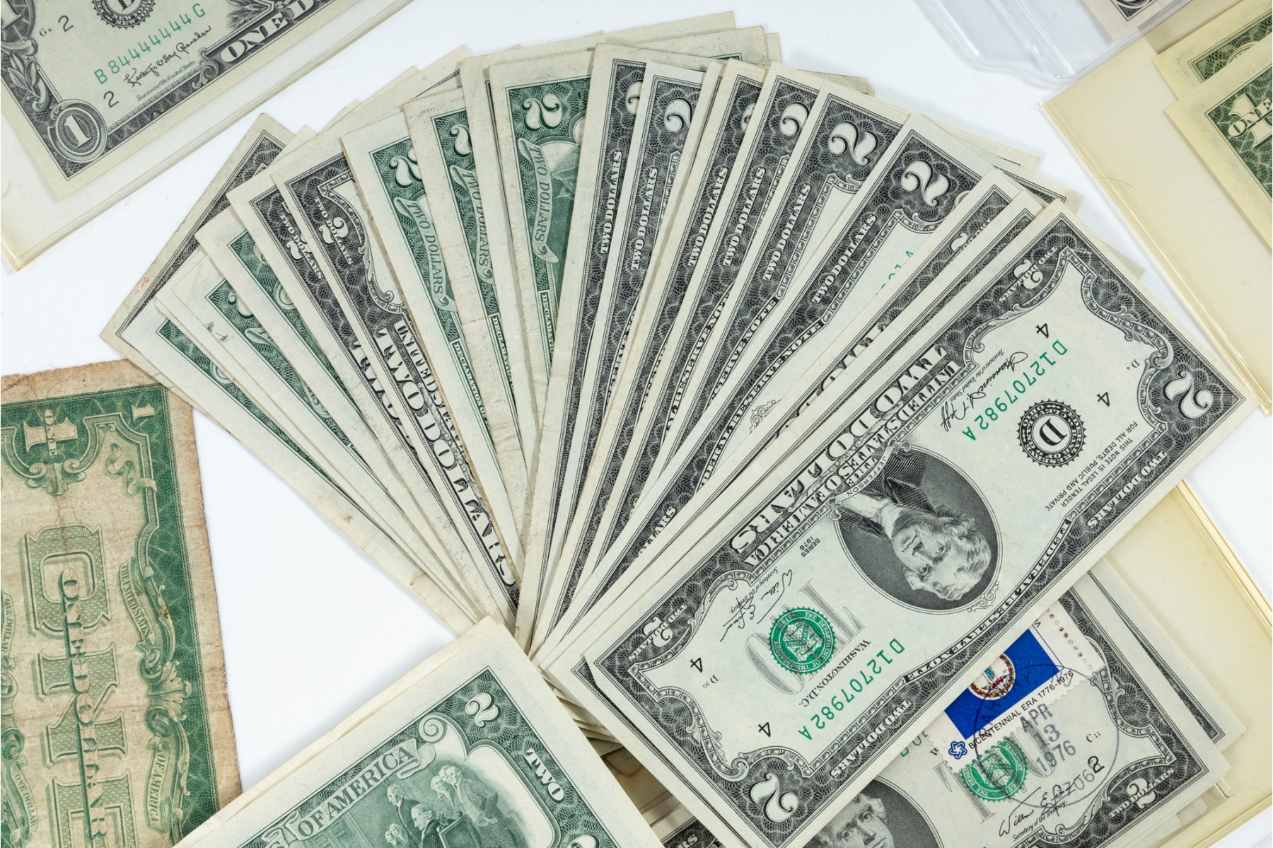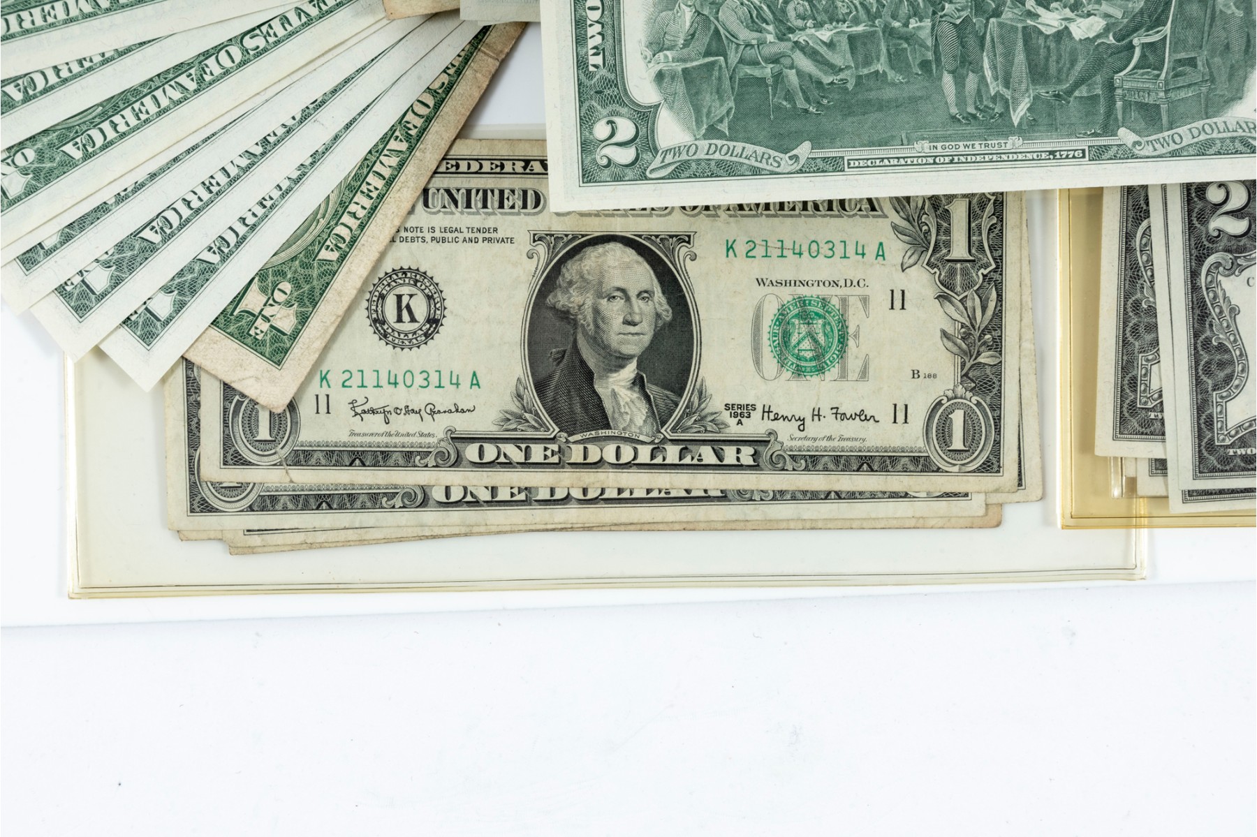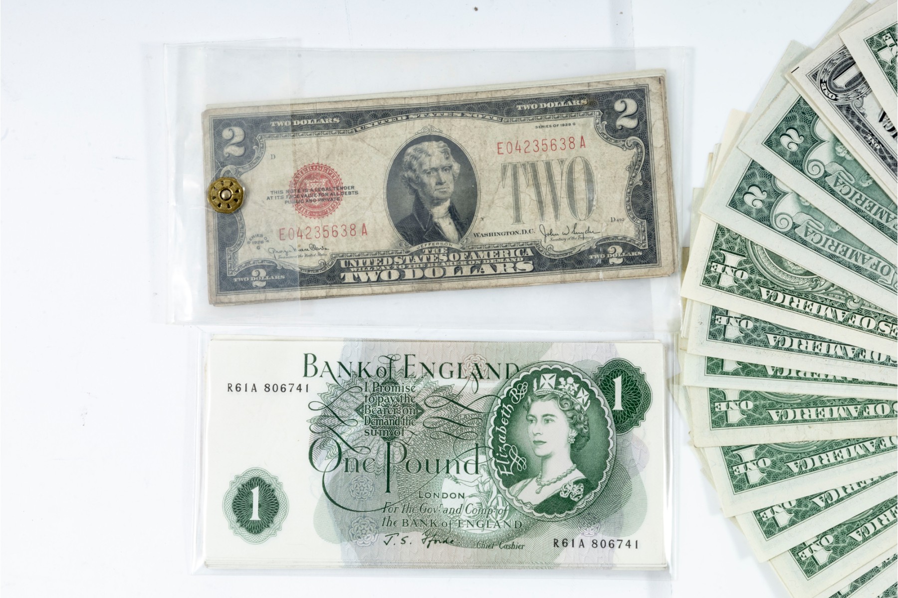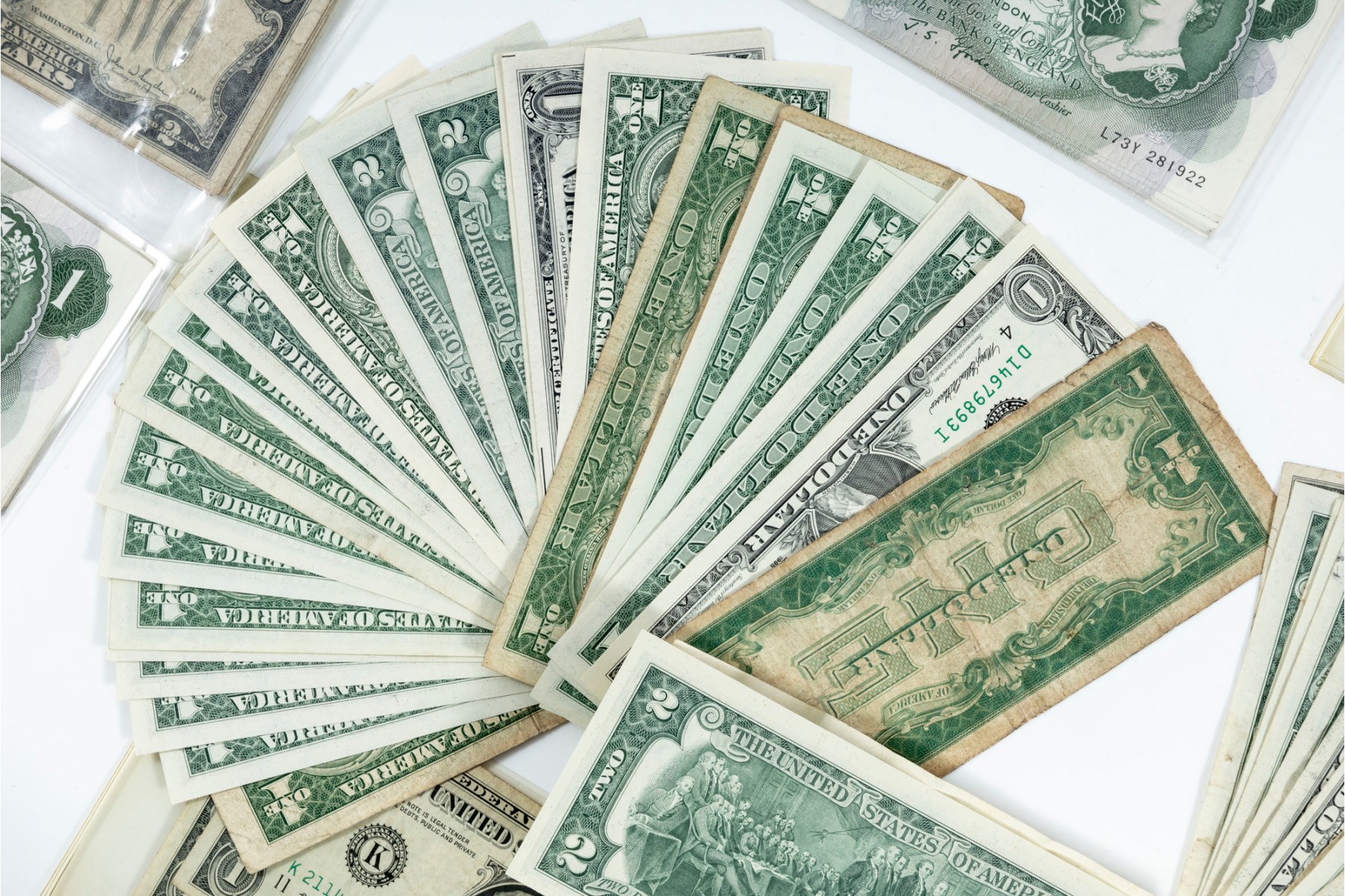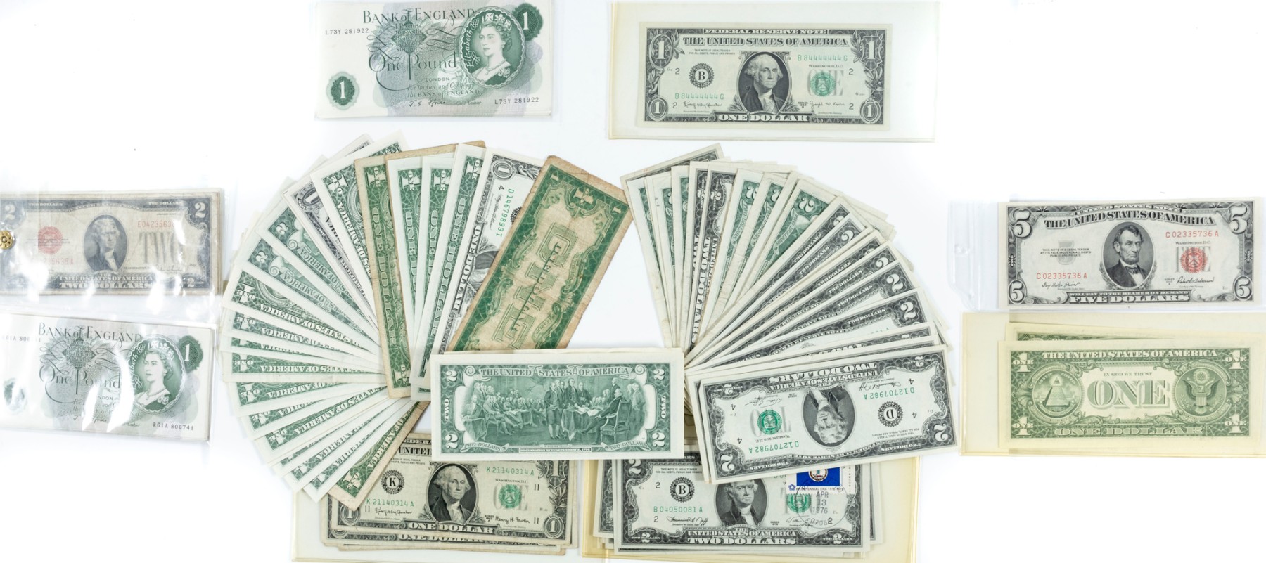 A nice assortment of currency including American $1, $2, and $5 dollar bills, along with a few English pounds.