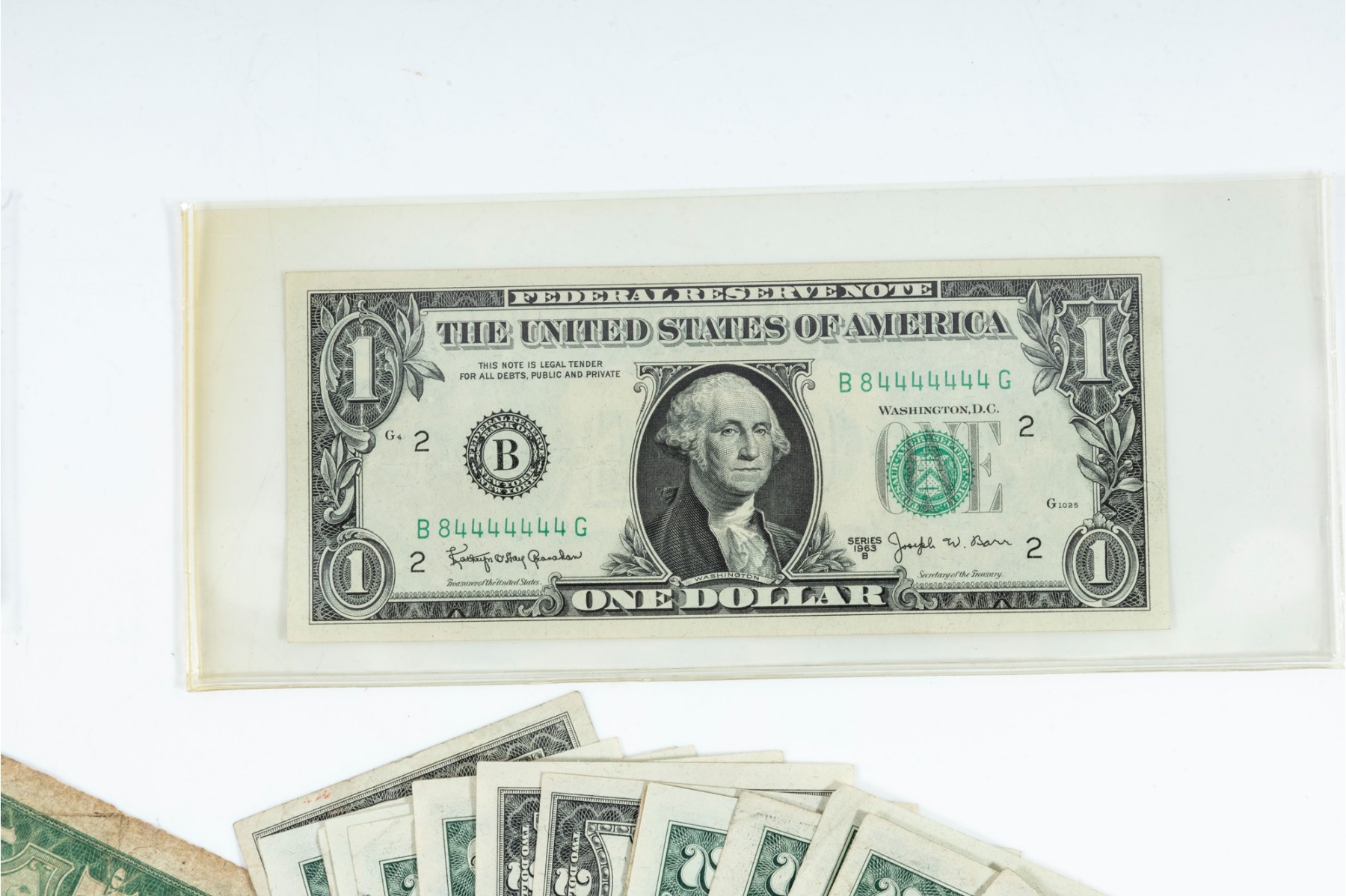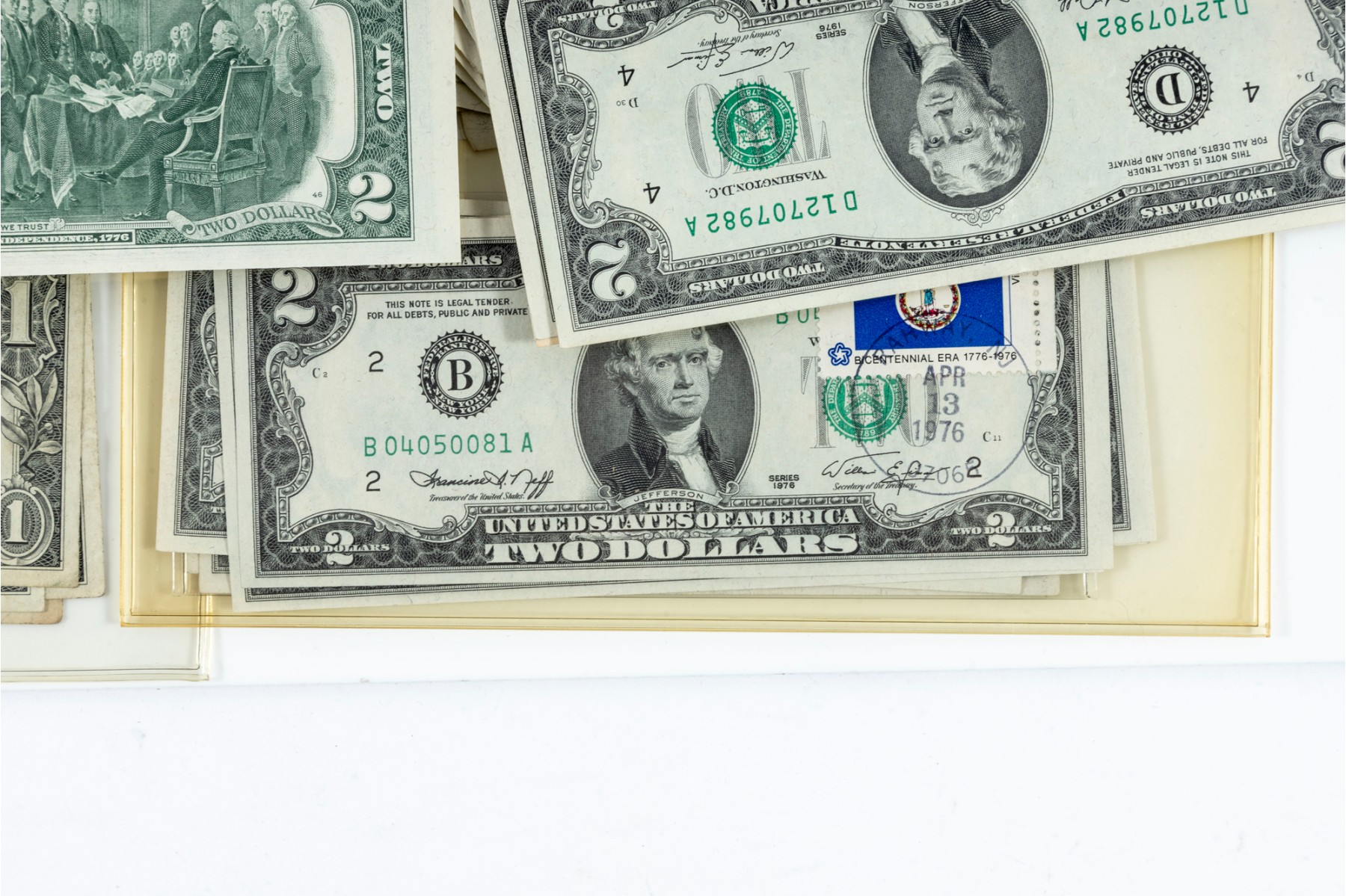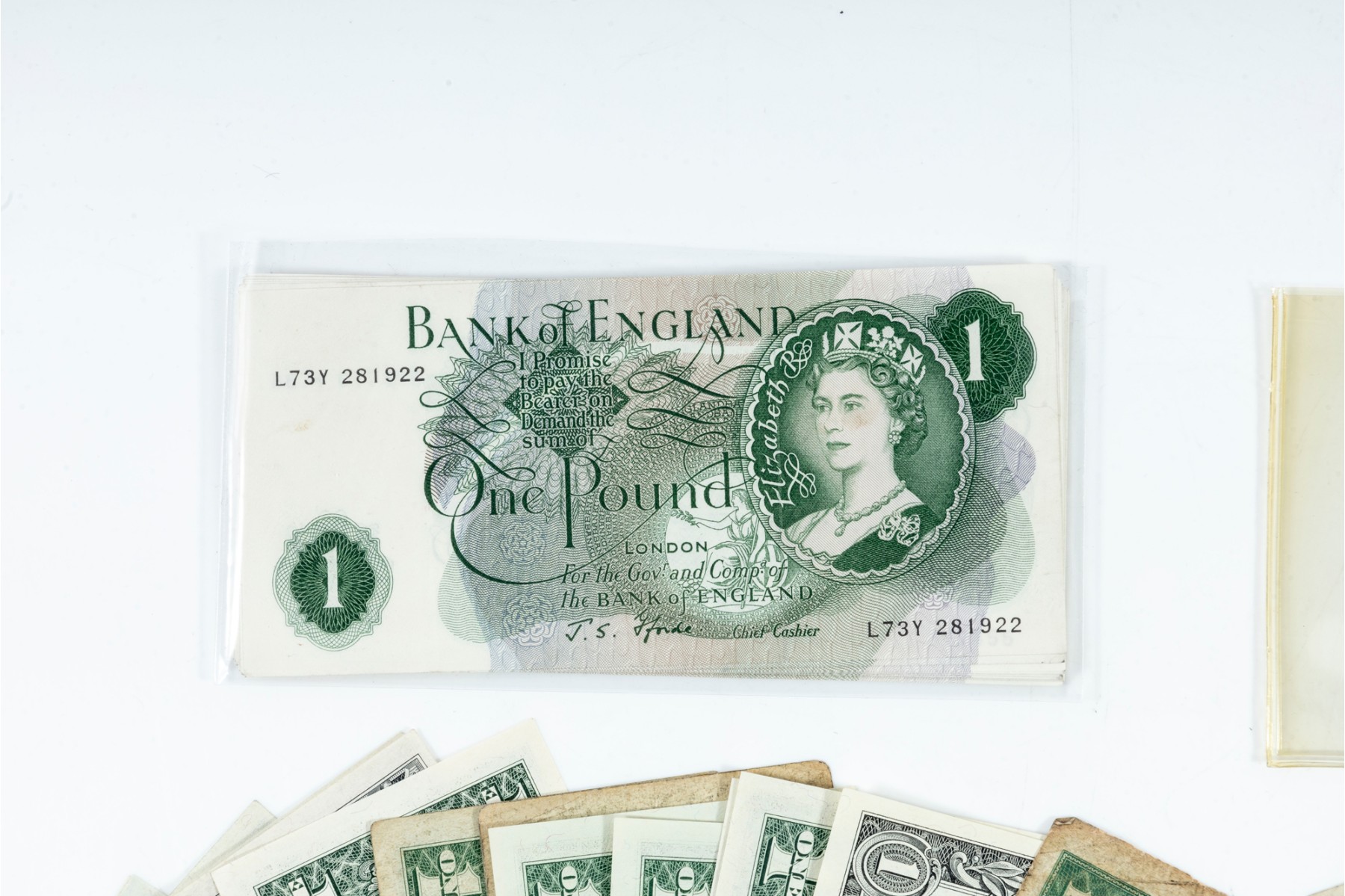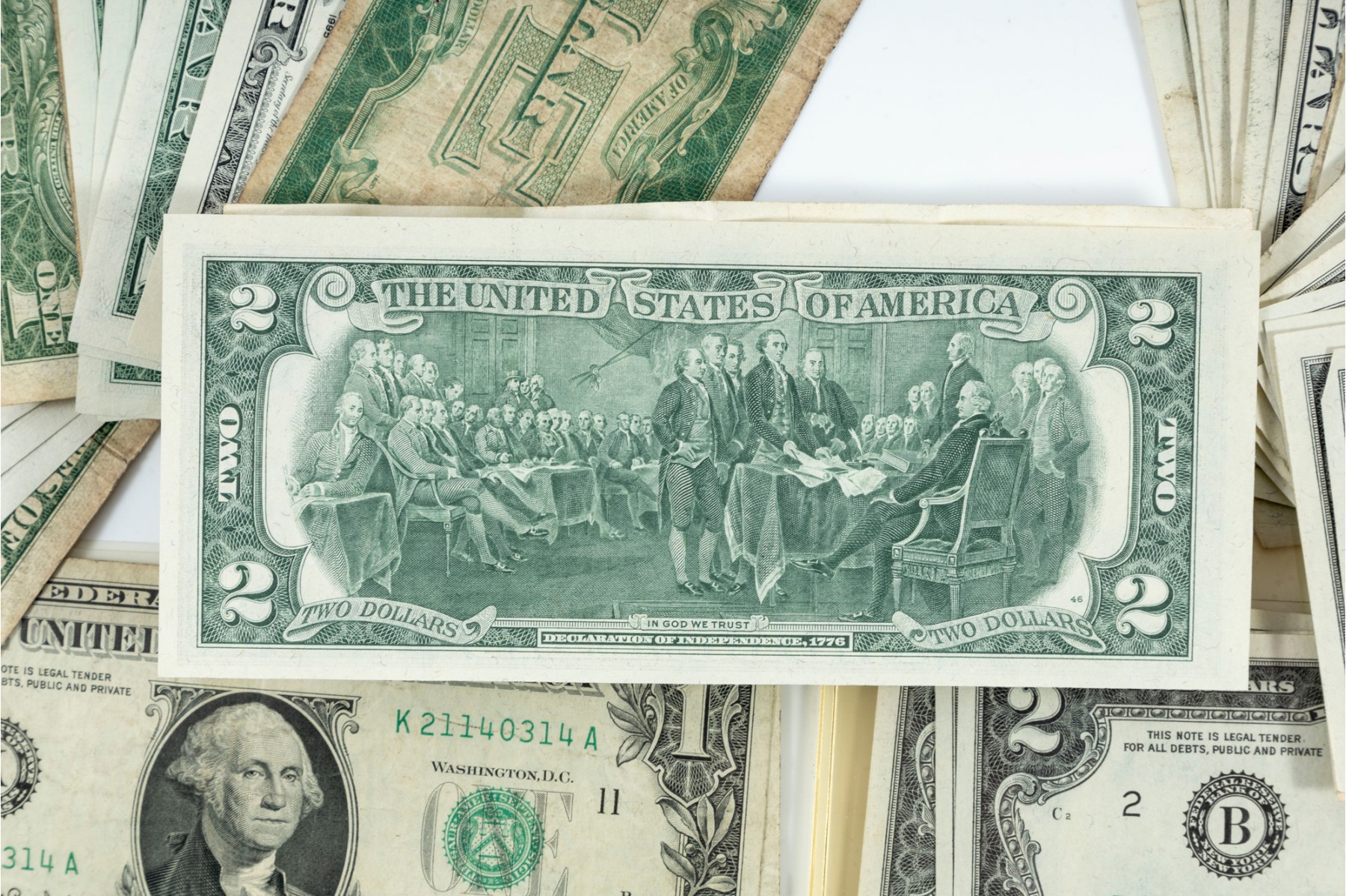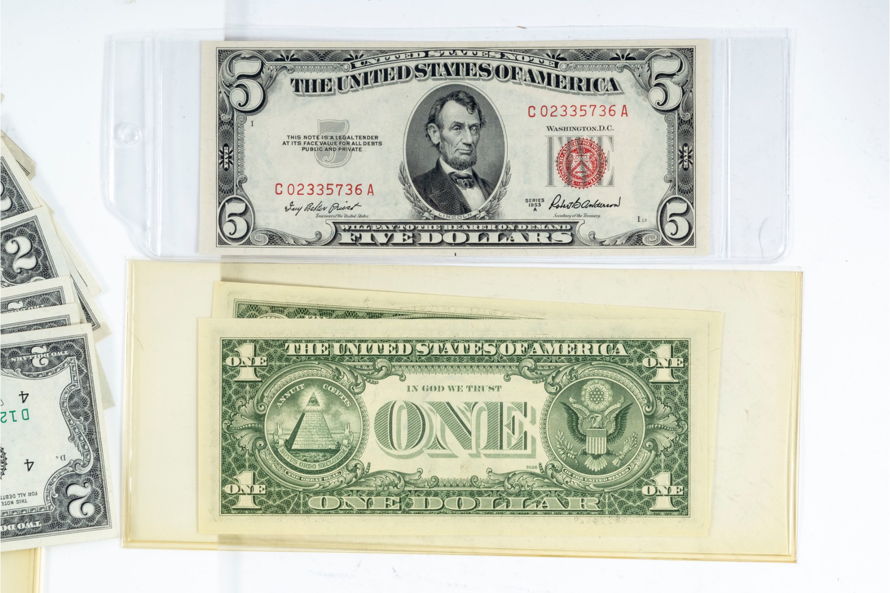 A nice assortment of currency including American $1, $2, and $5 dollar bills, along with a few English pounds.